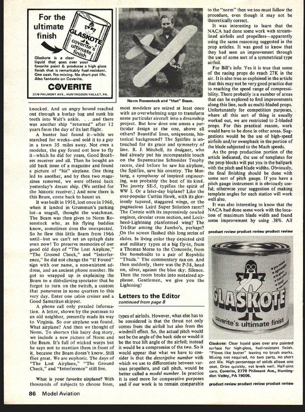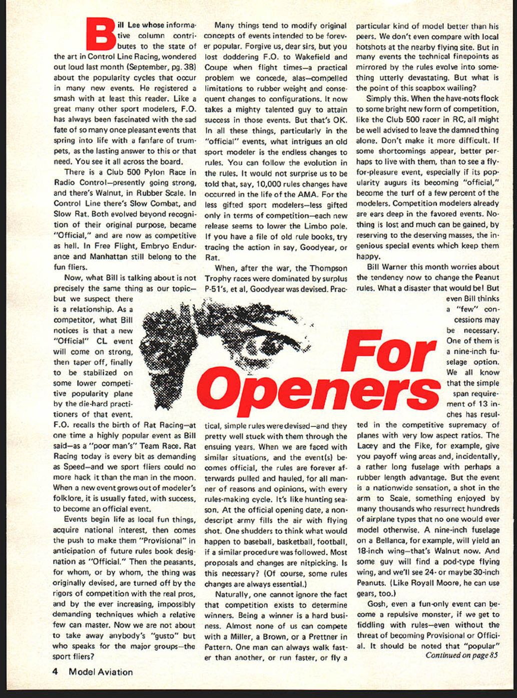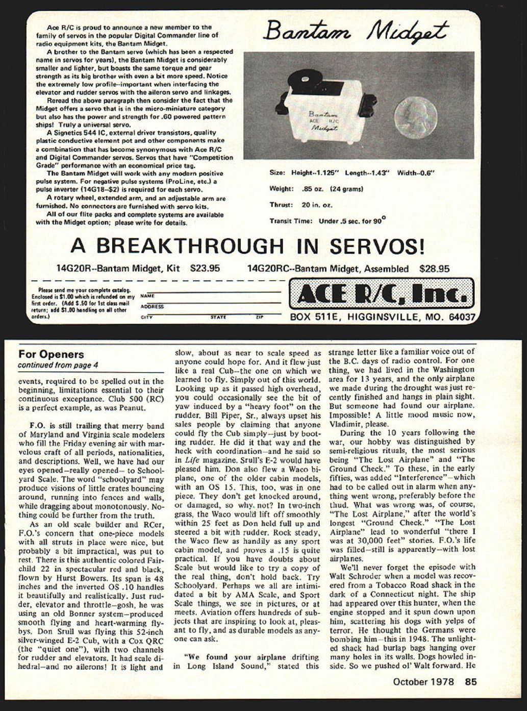Bill Lee informa tive column contri butes state art Control Line Racing wondered out loud last month September pg 38 about popularity cycles occur new events registered smash least reader Like great other sport modelers FO has always fascinated sad fate once pleasant events spring life fanfare trum pets lasting answer need see across board Club 500 Pylon Race Radio Controlpresently going strong theres Walnut Rubber Scale Control Line theres Slow Combat Slow Rat Both evolved beyond recogni tion original purpose became Official now competitive hell Free Flight Embryo Endur ance Manhattan still belong fun fliers Now what Bill talking about precisely same thing topic suspect relationship As competitor what Bill notices new Official CL event will come strong taper off finally stabilized some lower competi tive popularity plane die-hard practi tioners event FO recalls birth Rat Racingat time highly popular event Bill saidas poor mans Team Race Rat Racing today bit demanding Speedand sport fliers could no hack man moon new event grows out modelers folklore usually fated success become official event Events begin life local fun things acquire national interest comes push make Provisional anticipation future rules book desig nation Official peasants whom thing originally devised turned off rigors competition real pros ever increasing impossibly demanding techniques relative few can master Now about take away anybodys gusto speaks major groupsthe sport fliers things tend modify original concepts events intended forev er popular Forgive us dear sirs lost doddering FO Wakefield Coupe flight timesa practical problem concede alascompelled limitations rubber weight conse quent changes configurations now takes mighty talented guy attain success events thats OK things particularly official events what intrigues old sport modeler endless changes rules can follow evolution rules would surprise us told say 10000 rules changes have occurred life AMA less gifted sport modelersless gifted terms competitioneach new release seems lower Limbo pole have file old rule books try tracing action say Goodyear Rat after war Thompson Trophy races dominated surplus P-Sis et al Goodyear devised Prac particular kind model better peers dont compare local hotshots nearby flying site events technical finepoints mirrored rules evolve some thing utterly devastating what point soapbox wailing Simply have-nots flock some bright new form competition like Club 500 racer RC might well advised leave damned thing alone Dont make difficult some shortcomings appear better per haps live see flyfor-pleasure event especially its pop ularity augurs its becoming official become turf few percent modelers Competition modelers already ears deep favored events No thing lost much can gained reserving deserving masses genious special events keep happy Bill Warner month worries about tendency now change Peanut rules What disaster would Bill thinks a few con cessions may Openers tical simple rules devisedand pretty well stuck through ensuing years faced similar situations events comes official rules forever af terwards pulled hauled man ner reasons opinions rules-making cycle Its like hunting sea son official opening date non descript army fills air flying shot shudders think what would happen baseball basketball football similar procedure followed Most proposals changes nitpicking necessary course some rules changes always essential Naturally cannot ignore fact competition exists determine winners Being winner hard busi ness Almost us can compete Miller Brown Prettner Pattern man can always walk fast er another run faster fly necessary nine-inch fu selage option know simple span require ment 13 inches has resul ted competitive supremacy planes very low aspect ratios Lacey Fike example give payoff wing areas incidentally rather long fuselage perhaps rubber length advantage event nationwide sensation shot arm Scale something enjoyed thousands resurrect hundreds airplane types no would ever model otherwise nine-inch fuselage Bellanca example will yield 18-inch wingthats Walnut now some guy will find pod-type flying wing well see 24- maybe 30-inch Peanuts Like Royall Moore can use gears too Gosh fun-only event can come repulsive monster get fiddling ruleseven threat becoming Provisional Offici al should noted popular Continued page 85 4 Model Aviation Ace R/C proud announce new member family servos popular Digital Commander line radio equipment kits Bantam Midget brother Bantam servo has respected name servos years Bantam Midget considerably smaller lighter boasts same torque gear strength its big brother bit speed Notice extremely low profile--important interfacing elevator rudder servos aileron servo linkages Reread above paragraph consider fact Midget offers servo micro-miniature category also has power strength 60 powered pattern shipsl Truly universal servo Signetics 544 IC external driver transistors quality plastic conductive element pot other components make combination has become synonymous Ace R/C Digital Commander servos Servos have Competition Grade performance economical price tag Bantam Midget will work modern positive pulse system negative pulse systems ProLine etc pulse inverter 14G18--$2 required servo rotary wheel extended arm adjustable arm furnished No connectors furnished servo kits flite packs complete systems available Midget option please write details Bt Af4t Size Height--1125 Length--143 Width--O6 Weight 85 ox 24 grams Thrust 20 Ox Transit Time Under 5 sec 900 BREAKTHROUGH IN SERVOS 14G20R--Bantam Midget Kit $2395 14G2ORC--Bantam Midget Assembled $2895 Please send yeur complete catalogIAN 3 IU ~I Enclosed $100 ref undwh myNAME1~K 3I EEUuI first order Add $50 1st clam mailADDRESS____________________________________________________________[v32][b22001425131600]] return add Si 00 handling ether CITY Openers continued page 4 events required spelled out beginning limitations essential continuous exceptance Club 500 RC perfect exampl