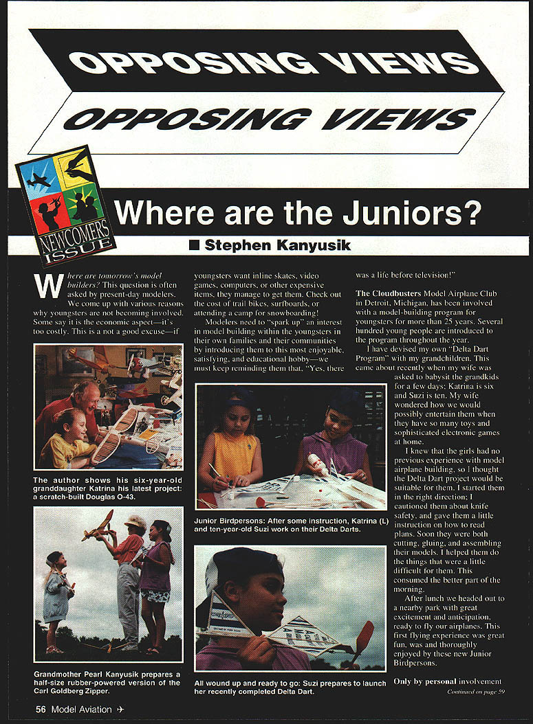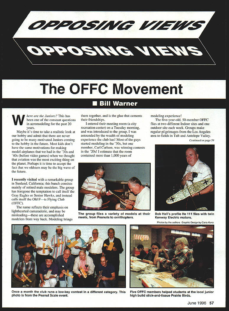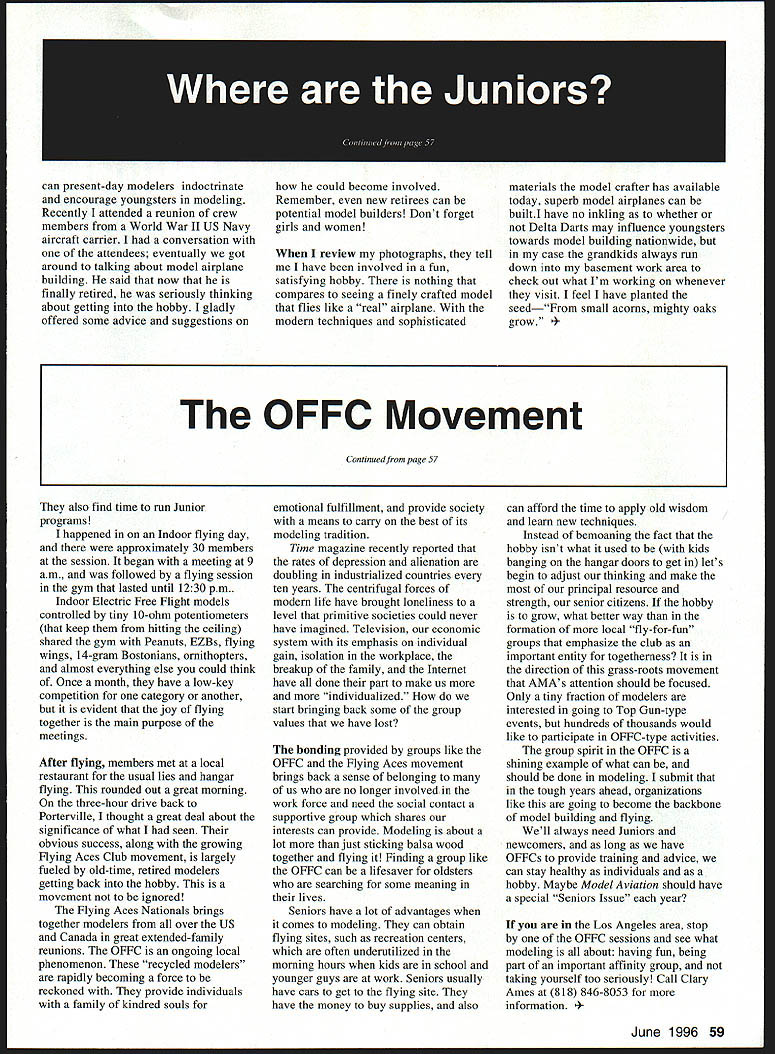 U i U Stephen Kanyusik ~VVe7 OFFC Movement Juniors has heen constant questions aeromodeling past 20 years Maybe its time take realistic look hobby admit never going motivated Juniors coming hobby future Most kids dont have same motivations making model airplanes 30s 40s before video games thought aviation exciting thing planet Perhaps time accept fact oldsters may big wave future recently visited remarkable group Sunland California bunch consists mainly retired male modelers group has foregone temptation call itself Gray Eagles Senior Hawks instead calls itself Old Fts Flying Club OFEC name reflects emphasis lighthearted camaraderie may misleadingthese accomplished modelers way back Modeling brings together glue cements friendships entered meeting room city recreation center Tuesday morning introduced group astounded wealth modeling experience club has Most guys started modeling 30s member Carl Carlson winning contests 20s estimate room contained 1000 years modeling experience five-year-old 50-member OFFC flies two different Indoor sites outdoor site week Groups make regular pilgrimages Los Angeles area fields Taft Antelope Valley Continued page 59 June 1996 57 group flies variety models theirBob Halls profile 111 flies twin meets Peanuts ornithoptersKenway Electric motors Phntns fri ths rithnr flrrnhin nninn fri flrI Kin Once month club runs low-key contest different category ThisFive OFFC members helped students local junior photo Peanut Scale eventhigh build stick-and-tissue Prairie Birds can present-day modelers indoctrinate encourage youngsters modeling Recently attended reunion crew members World War II US Navy aircraft carrier conversation attendees eventually got around talking about model airplane building said now finally retired seriously thinking about getting hobby gladly offered some advice suggestions also find time run Junior programs happened Indoor flying day approximately 30 members session began meeting 9 am followed flying session gym lasted until 1230 pm. Indoor Electric Free Flight models controlled tiny 10-ohm potentiometers keep hitting ceiling shared gym Peanuts EZBs flying wings 14-gram Bostonians ornithopters almost everything else could think Once month have low-key competition category another evident joy flying together main purpose meetings After flying members met local restaurant usual lies hangar flying rounded out great morning three-hour drive back Porterville thought great deal about significance what seen obvious success along growing Flying Aces Club movement largely fueled old-time retired modelers getting back hobby movement ignored Flying Aces Nationals brings together modelers over US Canada great extended-family reunions OFFC ongoing local phenomenon recycled modelers rapidly becoming force reckoned provide individuals family kindred souls review photographs tell have involved fun satisfying hobby nothing compares seeing finely crafted model flies like real airplane modern techniques sophisticated emotional fulfillment provide society means carry best its modeling tradition Time magazine recently reported rates depression alienation doubling industrialized countries ten years centrifugal forces modern life have brought loneliness level primitive societies could never have imagined Television economic system its emphasis individual gain isolation workplace breakup family Internet have done part make us more individualized start bringing back some group values have lost bonding provided groups like OFFC Flying Aces movement brings back sense belonging us no longer involved work force need social contact supportive group shares interests can provide Modeling about lot just sticking balsa wood together flying Finding group like OFFC can lifesaver oldsters searching some meaning lives Seniors have lot advantages comes modeling can obtain flying sites such recreation centers often underutilized morning hours kids school younger guys work Seniors usually have cars get flying site have money buy supplies also materials model crafter has available today superb model airplanes can builtI have no inkling whether Delta Darts may influence youngsters towards model building nationwide case grandkids always run down basement work area check out what Im working whenever visit feel have planted seedFrom small acorns mighty oaks grow afford time apply old wisdom learn new techniques Instead bemoaning fact hobby isnt what used kids banging hangar doors get lets begin adjust thinking make principal resource strength senior citizens hobby grow what better way formation local fly-for-fun groups emphasize club important entity togetherness direction grass-roots movement AMAs attention should focused Only tiny fraction modelers interested going Top Gun-type events hundreds thousands would like participate OFFC-type activities group spirit OFFC shining example what can should done modeling submit tough years ahead organizations like going become backbone model building flying Well always need Juniors newcomers long have OFFCs provide training advice can stay healthy individuals hobby Maybe Model Aviation should have special Seniors Issue year Los Angeles area stop OFFC sessions see what modeling about having fun being part important affinity group taking yourself too seriously Call Clary Ames 818 846-8053 information 1996 59 could become involved Remember new retirees can potential model builders Dont forget girls women OFFC Movement Continued page 57