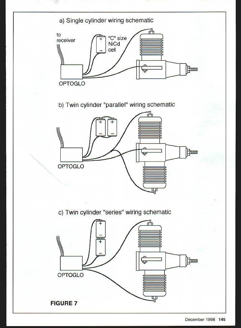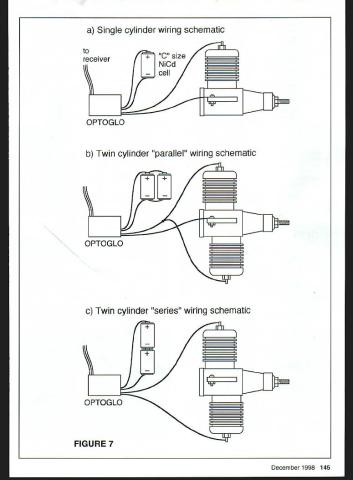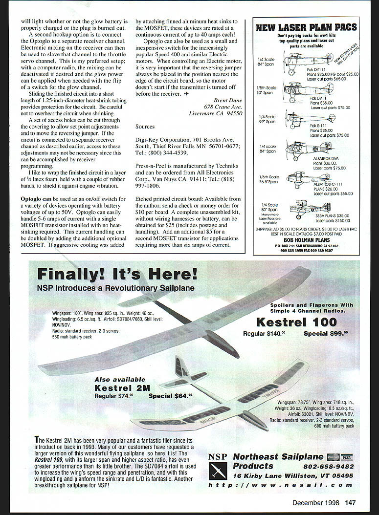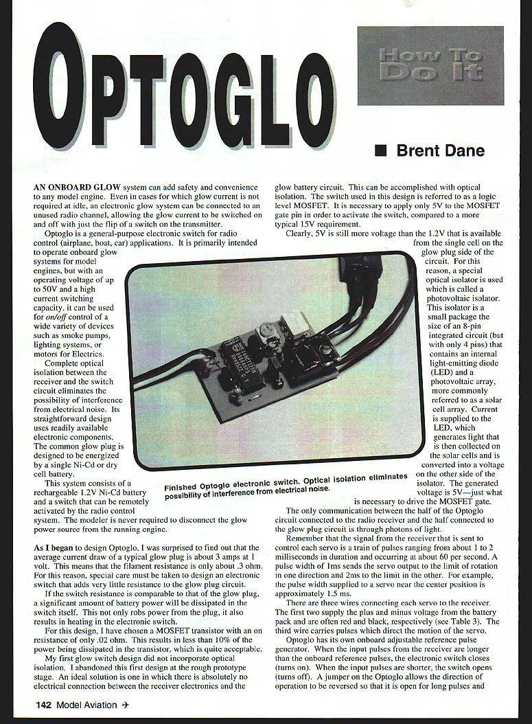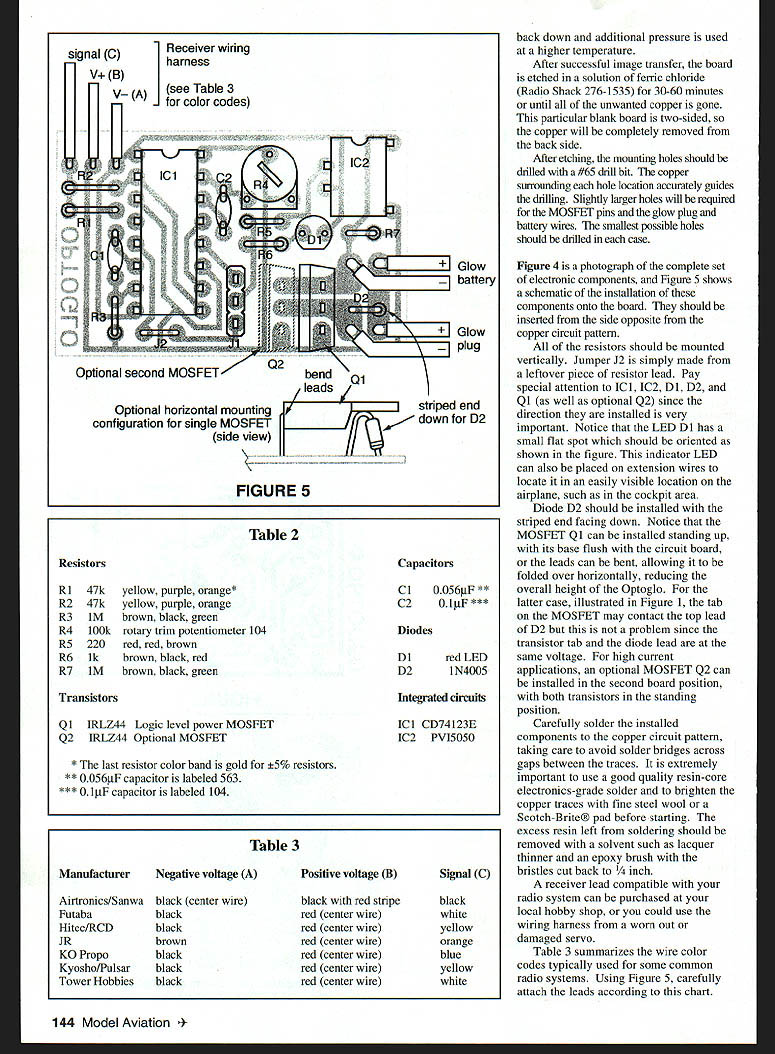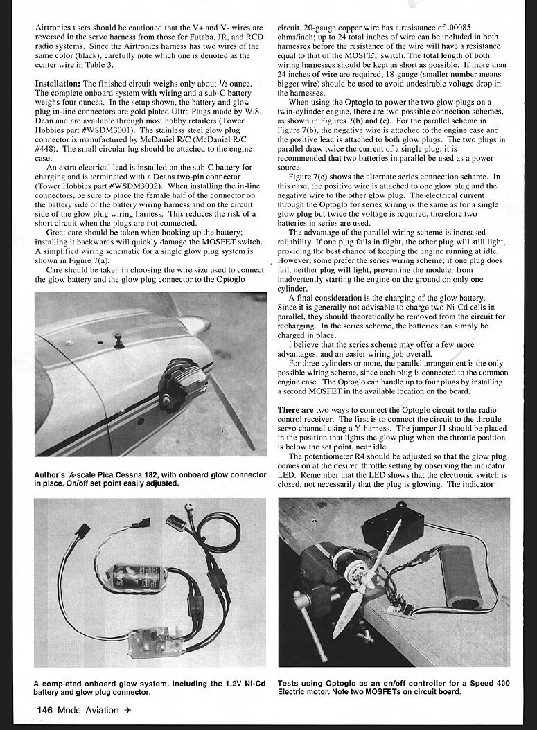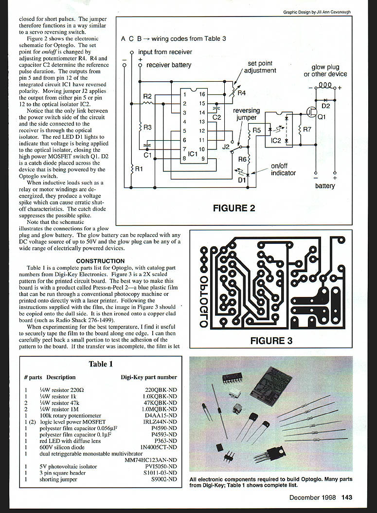 U Brent Dane ONBOARD GLOW system can add safety convenience model engine cases glow current required idle electronic glow system can connected unused radio channel allowing glow current switched off just flip switch transmitter Optoglo general-purpose electronic switch radio control airplane boat car applications primarily intended operate onboard glow systems model engines operating voltage up 50V high current switching capacity can used on/off control wide variety devices such smoke pumps lighting systems motors Electrics Complete optical isolation between receiver switch circuit eliminates possibility interference electrical noise Its straightforward design uses readily available electronic components common glow plug designed energized single Ni-Cd dry cell battery system consists rechargeable 1 2V Ni-Cd battery switch can remotely activated radio control system modeler never required disconnect glow power source running engine glow battery circuit can accomplished optical isolation switch used design referred logic level MOSFET necessary apply 5V MOSFET gate pin order activate switch compared typical iSV requirement Clearly 5V still voltage 12V available single cell glow plug side circuit reason special optical isolator used called photovoltaic isolator isolator small package size 8-pin integrated circuit 4 pins contains internal light-emitting diode LED photovoltaic array commonly referred solar cell array Current supplied LED generates light collected solar cells converted voltage Finishedon other side optoglo electronic switch Optical isolation elimisolator generated possibilitY interference electrical noisevoltage 5Vjust what necessary drive MOSFET gate communication between half Optoglo circuit connected radio receiver half connected glow plug circuit through photons light Remember signal receiver sent control servo train pulses ranging about 1 2 milliseconds duration occurring about 60 per second pulse width ims sends servo output limit rotation direction 2ms limit other example pulse width supplied servo near center position As began design Optoglo surprised find out average current draw typical glow plug about 3 amps 1 volt means filament resistance about 3 ohm reason special care must taken design electronic switch adds very little resistance glow plug circuit switch resistance comparable glow plug significant amount battery power will dissipated switch itself robs power plug also results heating electronic switch design have chosen MOSFET transistor resistance 02 ohm results less 10% power being dissipated transistor quite acceptable first glow switch design did incorporate optical isolation abandoned first design rough prototype stage An ideal solution absolutely no electrical connection between receiver electronics approximately 15 ins three wires connecting servo receiver first two supply plus minus voltage battery pack often red black respectively see Table 3 third wire carries pulses direct motion servo Optoglo has its own onboard adjustable reference pulse generator input pulses receiver longer onboard reference pulses electronic switch closes turns input pulses shorter switch opens turns off jumper Optoglo allows direction operation reversed open long pulses 142 Model Aviation * Graphic Design Jill Ann Cavanaugh closed short pulses jumper therefore functions way similar servo reversing switch Figure 2 shows electronic schematic Optoglo set point on/off changed adjusting potentiometer R4 R4 capacitor C2 determine reference pulse duration outputs pin 5 pin 12 _________ integrated circuit IC i have reversed polarity Moving jumper J2 applies _____ output either pin 5 pin 12 optical isolator IC2 Notice link between power switch side circuit side connected receiver through optical isolator red LED Dl lights indicate voltage being applied optical isolator closing high power MOSFET switch Ql D2 catch diode placed across device being powered Optoglo switch inductive loads such relay motor windings de energized produce voltage spike can cause erratic shut off characteristics catch diode suppresses possible spike Note schematic illustrates connections glow plug glow battery glow battery can replaced DC voltage source up 50V glow plug can wide range electrically powered devices CONSTRUCTION Table 1 complete parts list Optoglo catalog part numbers Digi-Key Electronics Figure 3 2X scaled pattern printed circuit board best way make board product called Press-n-Peel 2a blue plastic film can run through conventional photocopy machine printed onto directly laser printer Following instructions supplied film image Figure 3 should copied onto dull side ironed onto copper clad board such Radio Shack 276-1499 experimenting best temperature find useful securely tape film board along edge can carefully peel back small portion test adhesion pattern board transfer incomplete film let C B ng codes Table 3 0 input receiver ceiver battery R2 4 ---I215 314 413 512 611 7 10 Cl 8 9 R3 Cl R1 set point adjustment j/R4 ~2reversing 7indicator glow plug other device FIGURE 2 # parts Description Table 1 Digi-Key part number 1W resistor 220Q220QBK-ND 1W resistor 1k10KQBK-ND 2W resistor 47k47KQBK-ND 2W resistor lM1 0MQB K-ND 1100k rotary potentiometerD4AA 15-ND 1 2logic level power MOSFETIRLZ44N-ND 1polyester film capacitor 00561tFP4590-ND 1polyester film capacitor 0lgFP4593-ND 1red LED diffuse lensP363-ND 1600V silicon diode1N4005CT-ND 1dual retriggerable monostablemultivibrator MM74HC123AN-ND 15V photovoltaic isolatorPV15050-ND 13 pin square headerS 1011-03-ND 1shorting jumperS9002-ND December 1998 143 0 0 0 -I 0 FIGURE 3 electronic components required build Optoglo parts Digi-Key Table 1 shows complete list ] Receiver wiring harness see Table 3 color codes VB V 4 k 4 Optional second MOSFET~ 02 bend Glow battery Glow plug lea / dsy Optional horizontal mountingstriped end configuration single MOSFET JxdownforD2 side view FIGURE 5 Table 2 yellow purple orange* yellow purple orange brown black green rotary 