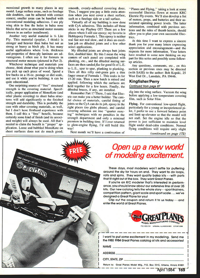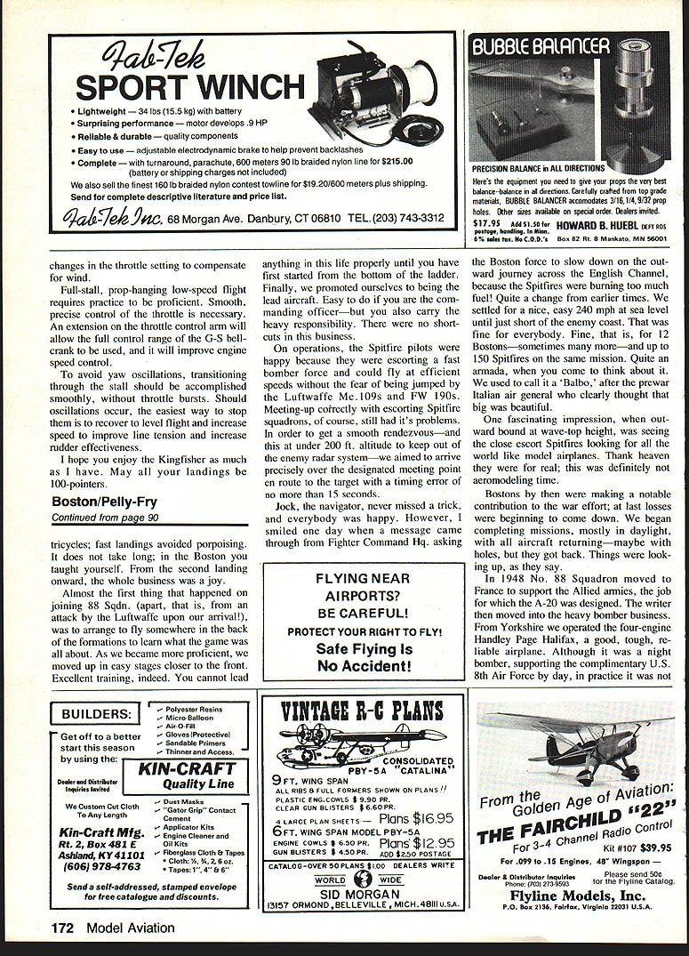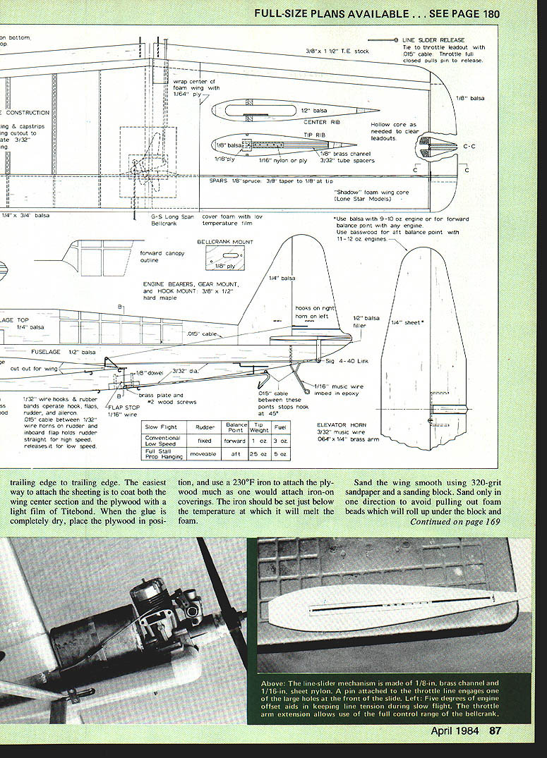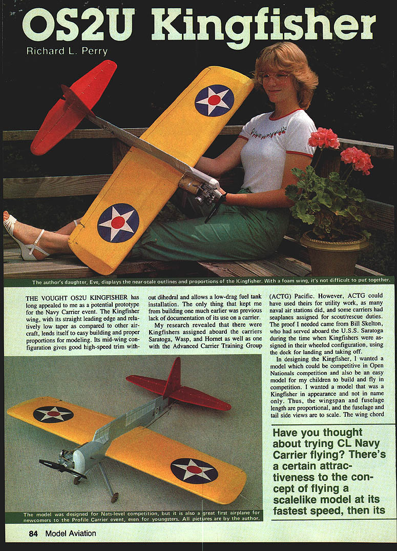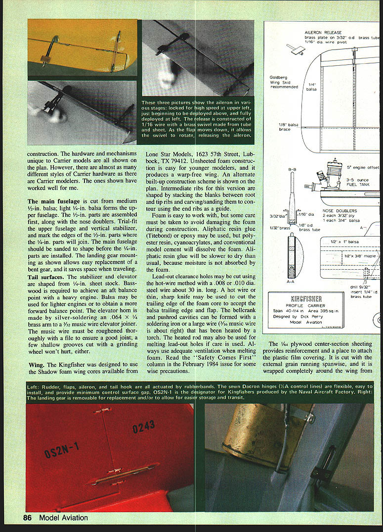 THE VOUGHT OS2U KINGFISHER has long appealed potential prototype Navy Carrier event Kingfisher wing its straight leading edge rela tively low taper compared other air craft lends itself easy building proper proportions modeling Its mid-wing con figuration gives good high-speed trim withp out dihedral allows low-drag fuel tank installation thing kept building much earlier previous lack documentation its use carrier research revealed Kingfishers assigned aboard carriers Saratoga Wasp Hornet well Advanced Carrier Training Group ACTG Pacific However ACTO could have used utility work naval air stations did some carriers seaplanes assigned scout/rescue duties proof needed came Bill Skelton served aboard USS Saratoga during time Kingfishers signed wheeled configuration using deck landing taking off designing Kingfisher wanted model could competitive Open Nationals competition also easy model children build fly competition wanted model Kingfisher appearance name Thus wingspan fuselage length proportional fuselage tail side views scale wing chord 84 Model Aviation Have thought about trying CL Navy Carrier flying Theres certain attrac tiveness con cept flying scalelike model its fastest speed its enlarged slightly tips allow good prop-hanging low speed tail en larged 20% wing area brought tail volume ratio up 040 Kingfisher designed big airplane primarily improve low-speed performance Flaps included same reason kept small reduce nose-down pitching moment deployed Kingfisher model will fly about 15 mph stall ing capable low speeds four minutes 75 mph 600 attitude Low-speed flight full stall requires rearward balance point large tail pro vides ample control stability model will sensitive large elevator movement long-span G-S bellcrank slowest making precision landing hooks pun intended guys try Profile Carrier class excellent starting point hanging results heavier model Kingfisher very straightforward design construction should pre sent no problem anyone experi ence building flying large models construction details follow will highlight parts construction different standard kit-model April 1984 85 long elevator horn reduce elevator travel produce very good flying qualities both high- low-speed flight Kingfisher lends itself very well either conventional low-speed flight prop hanging model should built particular style flight preferred de scribed plan Building prop ztion hardware m Carrier models However almos t styles Carrier hardwan rier modelers ones d well fuselage cut Dalsa light V4-in balsa elage 1/2-ifl parts nose fuselage edges parts will join sanded shape installed Ian snown allows easy ear saves space surfaces stabilizer shaped -in sheet id required achieve mt heavy engine Id lighter engines balance point e1 silver-soldering 3A2 musics wire must r file ensure ow grooves cut i wont hurt either Wing Kingfisher w Shadow foam wing core Models 1623 5 79412 Unsheete younger warp-free wi onstruction sche rmediate ribs stacking s carving/sand end ribs easy work taken avoid onstruction I or epoxy may b cyanoacrylates nent will dissc glue will ause moisture t clearance holes ii wire method uire about 30 harp knife may b edge foam iling edge od cavities iron large right ha e heated rod ad-out holes adequate ad ai February utions Goldberg Wing Skid1/4 recommendedbalsa 116 balsa _______ brace 8-9 3/32Oia1116 dia 1/Sod 32 AILERON RELEASE brass plate 3/32 ad brass tubE 1/16 dia wire pivot 5 engine of/sel 3-5 ounce FUEL TAN/I NOSE DOUBLERS 2 3/32 ply 1 3/4 balsa A7 1/2s 1 balsa 1/2 x 3/8 maple _____ Wr iii drill 9/32 insert 1/4 id brass tube PROFILE CARRIER Span 40-1/4 Area 395 sq Deagned Dick Perry Model Avation /64 plywood cern reinforceme stic film cove grain runn u completely -SIZE PLANS AVAILABLE . SE n bottomLINE SLIDER RELEASE PiiITie throttle leadout ii3/ax 1 1/2 T E stock cable Throttle full closed Dulls 9ih release ii i iiwrap center pfoam wing wits 1/64' ply iii I1/a balsa iiii iii iii TRUCTON Iiiii1/2 balsa II iii ng & capstripsCENTER RIBHollow core iiii TIPRIB g cutout ii~ ineeded clear ili te 3/32ii i i ileadouts C-c ii i i ii118' balsa / i i i1/6 brass channel l/16Ply1/16 nylon ply3/32 tube spacers I1ii = I____ iii_______SPARS 1/8 spruce 3/B taper f/B tip iii dow' foam wing core ii-iHTLone Star Models iiii -li _________ _________ -4i 114 x 3/4 balsao-s Long Spancover foam Bellcranstemperature film BELLCRANK MOUNT 1/B ply forward canopy outline 1/4 DaIs S 7flflG15cable ENGINE BEARERS GEAR MOUNT HOOK MOUNT 3/6 1/2 hard maple AGE TOP 1/4 balsa Use balsa 9-10 oP engine forward balance point engine Use basswood aft balance point 1112 oz engines 1/4 sheet hooks right Porn left1/2 balsa fiiler FUSELAGE1/2 balsalii e cut Out wing1/6 dowel3/32 Ga 1/16 music wire brass plate and015 cableimbed epoxy 2 wood screwsbetween FLAP STOPpoints stops hook DO1/16 wireat 4b 1/32 wire hooks & rubber bands operate hook flaps rudder aileron 015 cable between 1/32 wire horns rudder inboard flap holds rudder straignt high speed releases low speed Slow FlightRudderBalance TipFuel PointWeight Conventional dforward1 oz3 oz Low Speed Full Stall Prop Hangingmoveable 5 oz5 oz -d 4-40 Link arm ELEVATOR HORN 3/32 music wire 064 x 1/4 brass F mensional growth places model Large surface areas such fuselage side doublers can adhered contact cement smaller areas can handled conventional modeling adhesives use ply wing skin line holes balsa nose blocks serve structural motor mounts shown earlier installment Another very useful material /8 Lite Ply material poplar think stronger heavier balsa strong heavy birch ply has useful applications A-in thickness properties three-ply laminate ad vantageous often use formers structural motor mounts pictured Part 2 Whichever technique materials choose think about what youre doing pick up piece wood Spend few bucks 16-oz postage diet scale use youre building can quite educational surprising source free structural strength covering material Specif ically proper application MonoKote other plastic