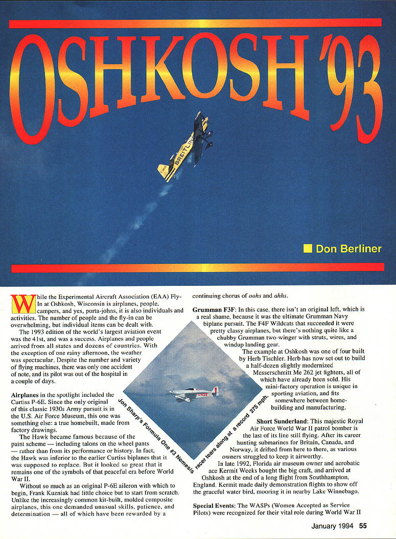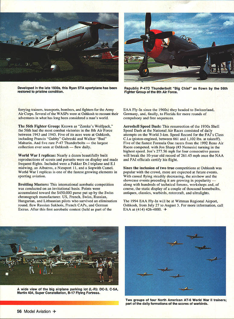 W bile Experimental Aircraft Association EAA Fly Oshkosh Wisconsin airplanes people campers yes porta-johns also individuals activities number people fly-in can overwhelming individual items can dealt 1993 edition worlds largest aviation event 41st success Airplanes people arrived states dozens countries exception rainy afternoon weather spectacular Despite number variety flying machines accident note its pilot out hospital couple days continuing chorus oohs ahhs Grumman F3F case isnt original left real shame because ultimate Grumman Navy biplane pursuit F4F Wildcats succeeded pretty classy airplanes theres nothing quite like chubby Grumman two-winger struts wires windup landing gear example Oshkosh four built Herb Tischler Herb has now set out build half-dozen slightly modernized Messerschmitt 262 jet fighters have already sold mini-factory operation unique sporting aviation fits somewhere between home y building manufacturing Airplanes spotlight included Curtiss P-6E Since original classic 193 Os Army pursuit US Air Force Museum something else true homebuilt made from-* oO Short Sunderland majestic Royal 40 factory drawings Air Force World War II patrol bomber Hawk became famous because thethe last its line still flying After its career paint scheme uding talons wheel pants%ohunting submarines Britain Canada rather its performance history fact*Norway drifted various Hawk inferior earlier Curtiss biplanes itSowners struggled keep airworthy supposed replace looked great it 0 $ late 1992 Florida air museum owner aerobatic remains symbols peaceful era before World4 ace Kermit Weeks bought big craft arrived War II kosh end long flight Southhampton Without much original P-6E aileron England Kermit made daily demonstration flights show off begin Frank Kuzniak little choice start scratch graceful water bird mooring nearby Lake Winnebago Unlike increasingly common kit-built molded composite airplanes demanded unusual skills patience determination have rewarded Special Events WASPs Women Accepted Service Pilots recognized vital role during World War II January1994 55 Developed late 1930s Ryan STA sportplane has restored pristine condition ferrying trainers transports bombers fighters Army Air Corps Several WASPs Oshkosh recount adventures what has long considered mans world 56th Fighter Group Known Zemke s Wolfpack 56th combat victories 8th Air Force between 1943 1945 Five its aces Oshkosh including Francis Gabby Gabreski Walker Bud Mahurin five rare P-47 Thunderbolts est collection ever seen Oshkosh daily World War replicas Nearly dozen beautifully built reproductions scouts pursuits display made frequent flights Included Fokker DrI triplane El midwing Albatros Nieuport 11 Sopwith Camel World War replicas fastest growing elements sporting aviation Breitling Masters international aerobatic competition conducted invitational basis Points accumulated toward $450000 purse put up Swiss chronograph manufacturer US French Swiss Russian Hungarian Lithuanian pilots survived elimination round flew Russian Sukhois French CAPs German Extras After first aerobatic contest held part Republic P-47D Thunderbolt Big Chief flown 56th Fighter Group 8th Air Force EAA Fly-In since 1960s headed Switzerland Germany finally Florida rounds compulsory free sequences Aeroshell Speed Dash resurrection 1930s Shell Speed Dash National Air Races consisted daily attempts World 3-km Speed Record FAIs Class Cia piston-engined between 661 1102 lbs takeoff Five fastest Formula racers 1992 Reno Air Races competed Jon Sharp #3 Nemesis turning highest speed Jons 27756 mph four consecutive passes will break 10-year old record 26145 mph once NAA FAI officials certify flight Since inclusion two true competitions Oshkosh popular crowd expected future events casual flying steadily decreasing airshow showcase events preceding growing popularity along hundreds technical forums workshops course static display couple thousand homebuilts antiques classics warbirds rotorcraft ultralights 1994 EAA Fly-In will Wittman Regional Airport Oshkosh July 27 August 3 information call EAA 414 426-4800 odel Aviation view big airplane parking lot L-R DC-3 C-5A Martin 404 Super Constellation 8-17 Flying Fortress Two groups four North American AT-6 World War II trainers part daily formations scores warbirds Boeing F4B-2lTanzer Continued paqe 44 mounts -20 bolts Mount lower wing Turn plane over using Robart incidence meter lower wing block fuselage reading 00 Now check top wing does read 00 use plywood washers bring point Glue washers bottom top wing make permanent wings still mounted cut fit interplane struts Slit ends 032 aluminum backets glue pin place Drill tap mounting plates wing Make Vs music wire landing gear mount fuselage landing gear straps spreader bar rubber bands work very well used balsa fair landing gear cabane wire scale appearance Mount engine two degrees right thrust two degrees downthrust fiberglass cowl being made T & D Fiberglass Specialties 3624 Kisco Drive Sterling Heights Michigan 48310 FINISH covered F4B plastic film using top hat red tail cowl aircraft carrier Yorktown top upper wing yellow rest white Other carrier colors Enterprise blue tail Wasp black tail Ranger green tail Lexington yellow tail Saratoga white taila lot color combinations pick lf want finish yours P-12 Army has some good combinations too $4999 US stars Major Decals water transfers applied plastic film works Hobbypoxy H65 red matches MonoKote EconoKote red painted parts cowl struts landing gear US Navy large letters bottom lower wing cut Presto Trim sheet red band around fuselage EconoKote put low heat numbers top hat cut Trim Sheet small letters numbers pressuresensitive typeavailable art store glued tail after fuselage covered white tail red Makes neat job Install tail wire braces tail wheel windshield 5/4-inch Williams Brothers smooth contour wheels Use favorite control system should FLYING going like Add powerit will come up mainsa little right ruddera little up