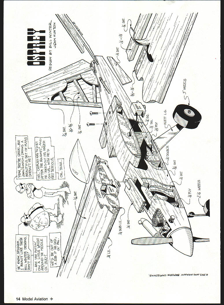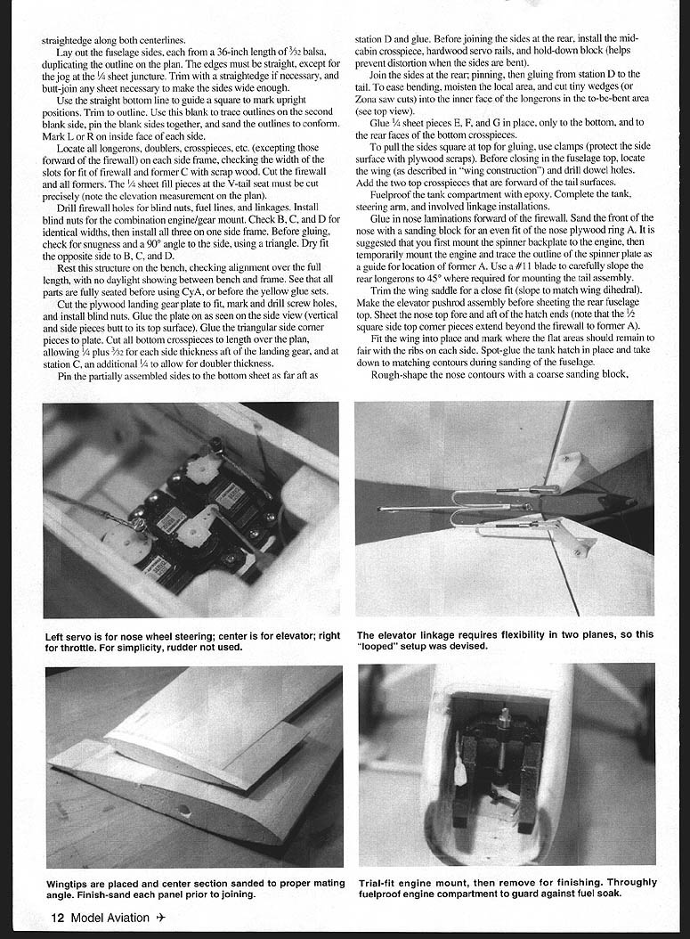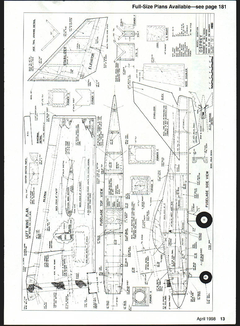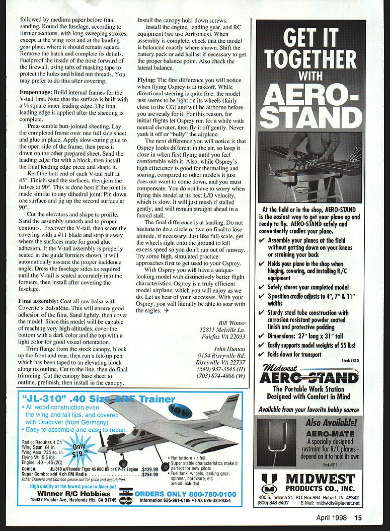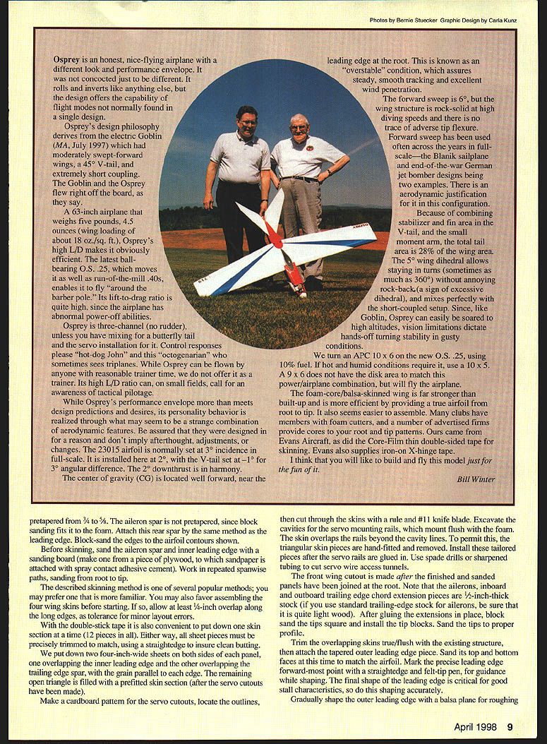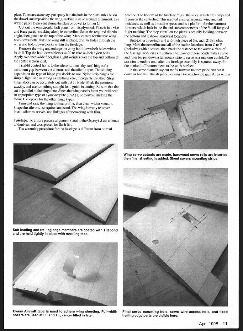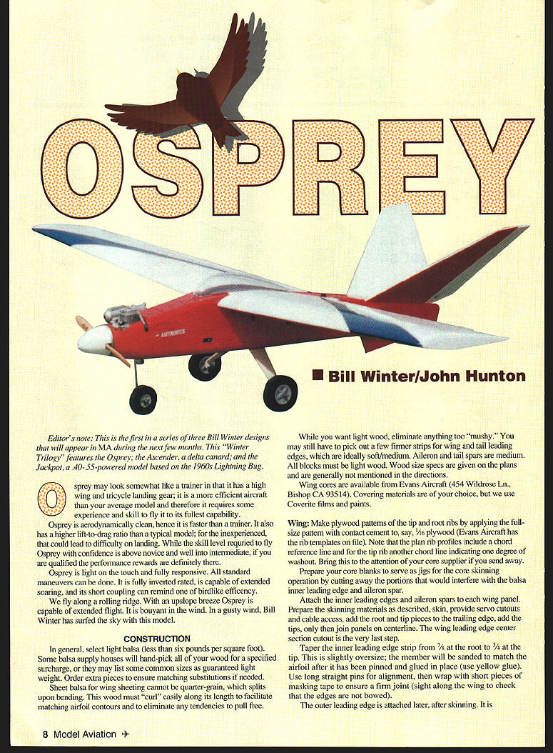 lb \v7 Li Editors note first series three Bill Winter designs will appear MA during next few months Winter Trilogy features Osprey Ascender delta canard Jackpot 40-35-powered model based ]960s Lightning Bug sprey may look somewhat like trainer has high Owingand tricycle landing gear efficient aircraft average model therefore requires some experience skill fly its fullest capability Osprey aerodynamically clean hence faster trainer also has higher lift-to-drag ratio typical model inexperienced could lead difficulty landing skill level requried fly Osprey confidence above novice well intermediate qualified performance rewards definitely Osprey light touch fully responsive standard maneuvers can done fully inverted rated capable extended soaring its short coupling can remind birdlike efficency fly along rolling ridge upslope breeze Osprey capable extended flight bouyant wind gusty wind Bill Winter has sm-fed sky model CONSTRUCTION general select light balsa less six pounds per square foot Some balsa supply houses will hand-pick wood specified surcharge may list some common sizes guaranteed light weight Order extra pieces ensure matching substitutions needed Sheet balsa wing sheeting cannot quarter-grain splits upon bending wood must curl easily along its length facilitate matching airfoil contours eliminate tendencies pull free want light wood eliminate anything too mushy may still have pick out few firmer strips wing tail leading edges ideally soft/medium Aileron tail spars medium blocks must light wood Wood size specs given plans generally mentioned directions Wing cores available Evans Aircraft 454 Wildrose Ln Bishop CA 93514 Covering materials choice use Coverite films paints Wing Make plywood pattems tip root ribs applying fullsize pattem contact cement say 1/i6 plywood Evans Aircraft has rib templates file Note plan rib profiles include chord reference line tip rib another chord line indicating degree washout Bring attention core supplier send away Prepare core blanks serve jigs core skinning operation cutting away portions would interfere balsa inner leading edge aileron spar Attach inner leading edges aileron spars wing panel Prepare skinning materials described skin provide servo cutouts cable access add root tip pieces trailing edge add tips join panels centerline wing leading edge center section cutout very last step Taper inner leading edge strip slightly oversize member will sanded match airfoil after has pinned glued place use yellow glue Use long straight pins alignment wrap short pieces masking tape ensure firm joint sight along wing check edges bowed outer leading edge attached later after skinning 8 Model Aviation ll WinterlJohn Hunton Photos Bernie Stuecker Graphic Design Carla Kunz pretapered eron spar pretapered since block sanding fits foam Attach rear spar same method leading edge Block-sand edges airfoil contours shown Before skinning sand aileron spar inner leading edge sanding board make piece plywood sandpaper attached spray contact adhesive cement Work repeated spanwise paths sanding root tip described skinning method several popular methods may prefer familiar may also favor assembling four wing skins before starting allow least -inch overlap along long edges tolerance minor layout errors double-stick tape also convenient put down skin section time 12 pieces Either way sheet pieces must precisely trimmed match using straightedge insure clean butting put down two four-inch-wide sheets both sides panel overlapping inner leading edge other overlapping trailing edge spar grain parallel edge remaining open triangle filled prefitted skin section after servo cutouts have made Make cardboard pattern servo cutouts locate outlines cut through skins rule #11 knife blade Excavate cavities servo mounting rails mount flush foam skin overlaps rails beyond cavity lines permit triangular skin pieces hand-fitted removed Install tailored pieces after servo rails glued Use spade drills sharpened tubing cut servo wire access tunnels front wing cutout made after finished sanded panels have joined root Note ailerons inboard outboard trailing edge chord extension pieces 1/2-inch-thick stock use standard trailing-edge stock ailerons sure quite light wood After gluing extensions place block sand tips square install tip blocks Sand tips proper profile Trim overlapping skins true/flush existing structure attach tapered outer leading edge piece Sand its top bottom faces time match airfoil Mark precise leading edge forward-most point straightedge felt-tip pen guidance shaping final shape leading edge critical good stall characteristics shaping accurately Gradually shape outer leading edge balsa plane roughing April 1998 9 sanding board sculpting desired profile Work paths root tip removing material progressively Finish fine sandpaper pad Cut wing roots proper angles horizontal vertical planes using table saw just shaping sanding boani over edge workbench use blocks jig up panel tips Spot-glue pin blocks bench wingtip Use long pins fine wire nails root leading trailing edges prevent movement plenty wood harmful sanding board held flush bench face used long-stroke milling action Check mating cores flush fit epoxy roots together blocking up panels required dihedral angle Use long straight pins masking tape help hold position crevices remain joint after epoxy has cured fill mixture epoxy microbalboons Outline cut front wing cutout Install facing plywood pieces spanwise plywood dowel plate glued first Note sides cutout slanted fit against fuselage sides Trial-fit wing fuselage checking two side cutout pieces fit snugly will butt against dowel plate Fill gaps sheet-balsa shims fit wing hold-down dowel put wing place holding true strips masking tape drill through hole former C has dowel hole predrilled Epoxy prepared dowel peg face 10 Model Aviation clean airframe capable extended flights low power soared typical thermals using trim control Ospreys bottom dark top white orientation high altitudes O