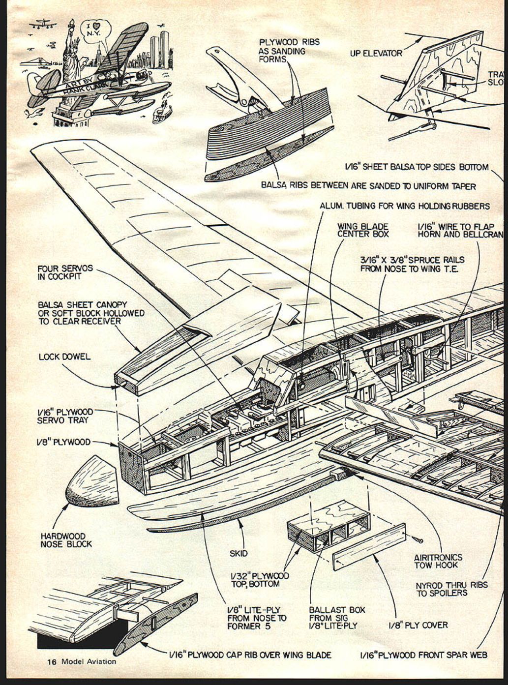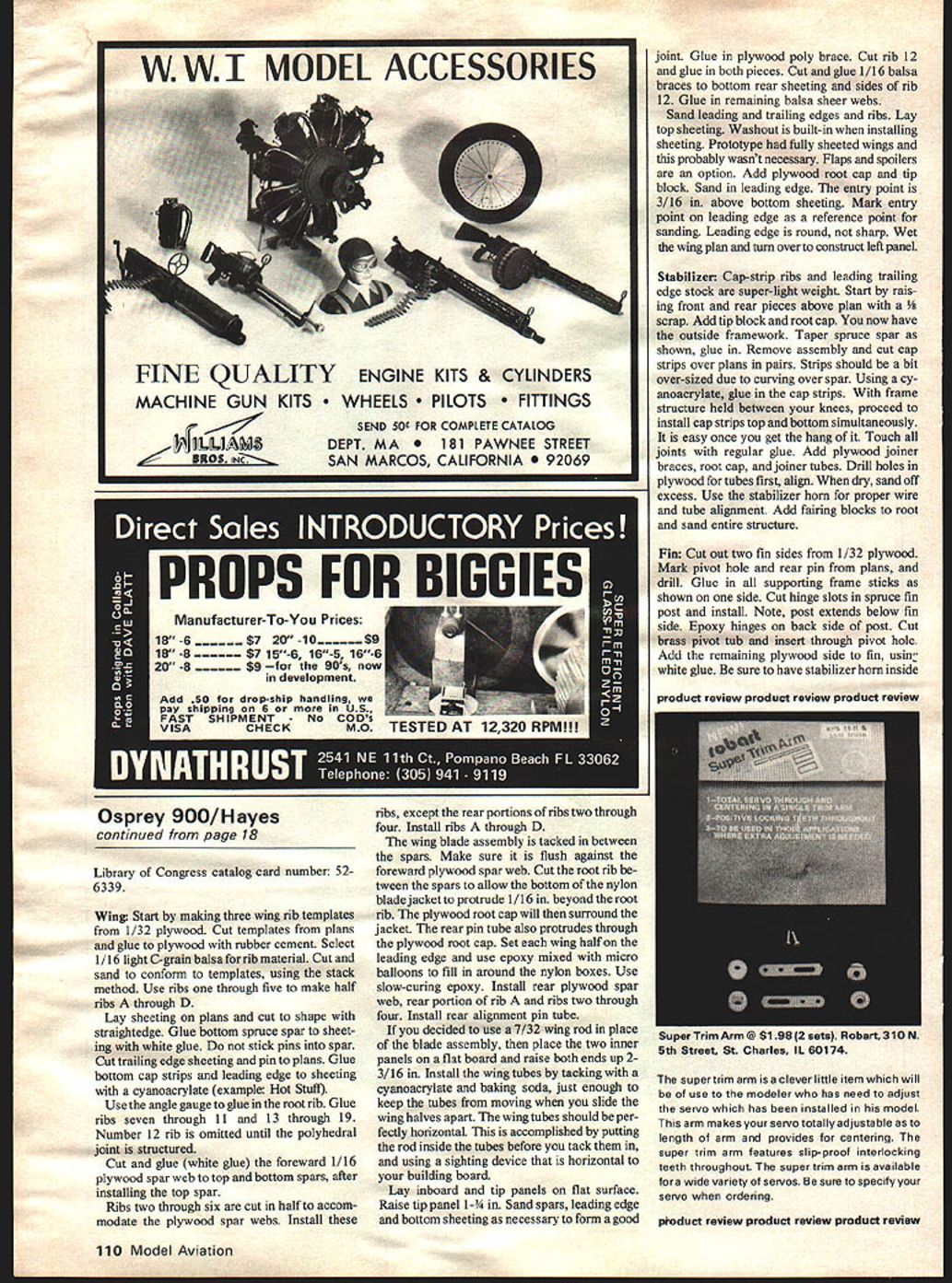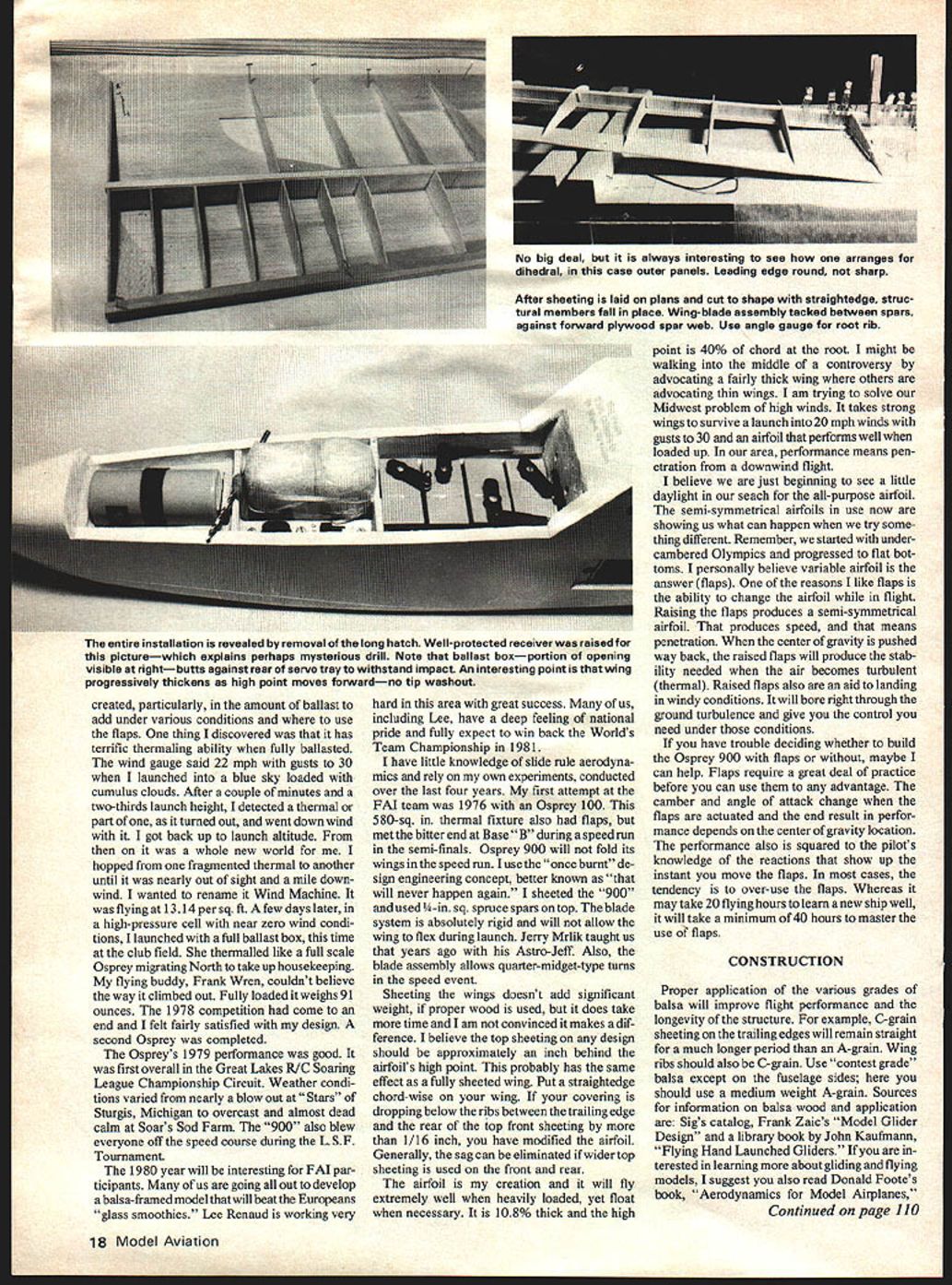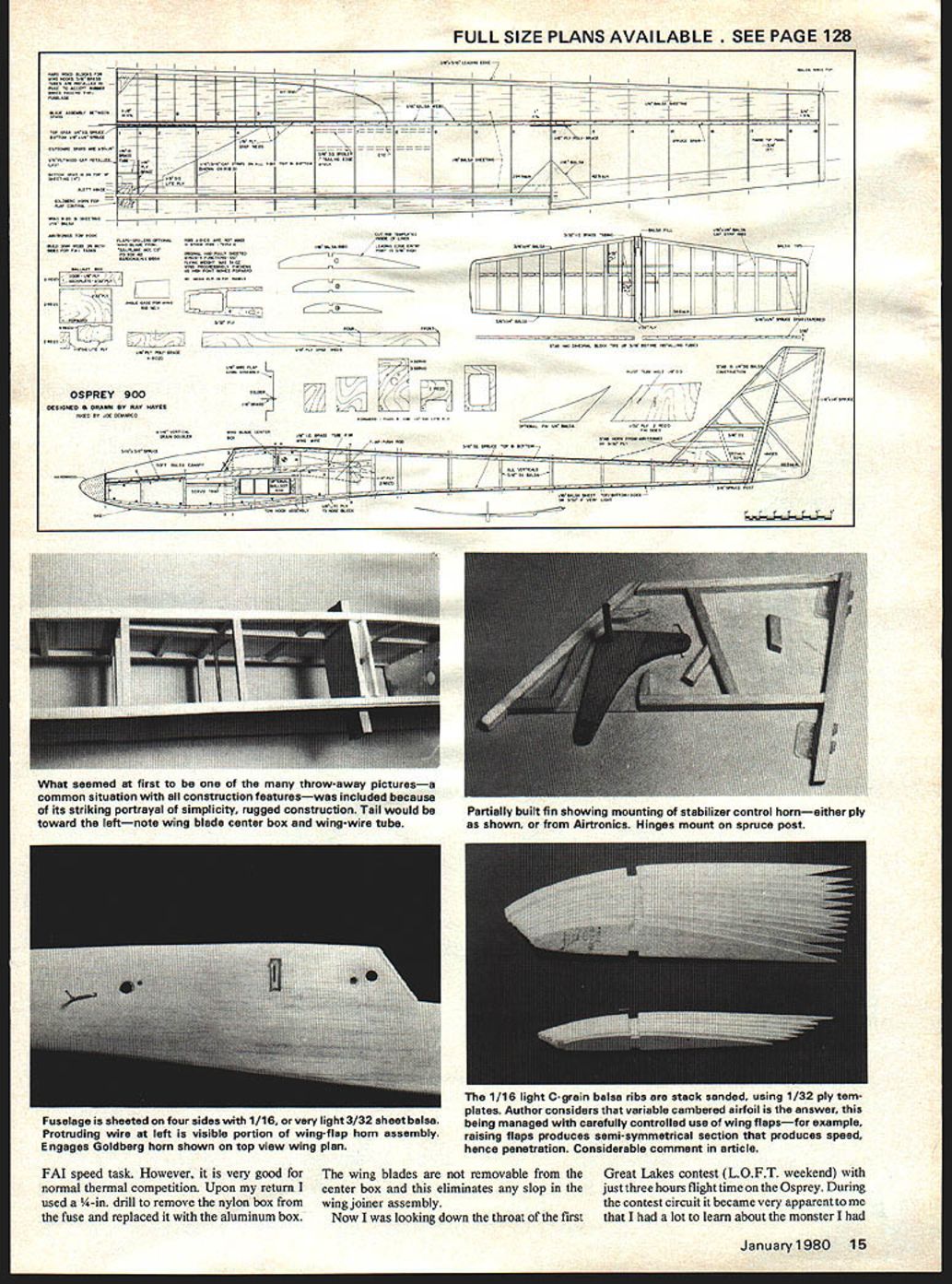 Can new American balsa-framed FAI models beat European glass smoothies sensatior scratch-built has blowing everyone off courses major meets U Ray H designer 900 unpracticed eye sailpianes look fairly standardized mix hidden things tooled attain some very specific flight-performance goals evident will note both pictures sheen very smooth wing IT IS thing build sailplane manu factured kit quite another design build scratch Scratch building can defined ominous words boss What working hard peers calculator writing pad filled strange him numbers planfonn scribblings asks dividing everything 144 Scratch building also cutting own wing ribs learning mistakes ig noring negative comments about dream ship Needless say scratch building successful can satisfying aspect modeling recommend anyone looking way release creative moods Osprey 900 designed win FAI team selection program 100 inches wing span likely happen consistency effort questionable start As matter fact three Standard Class airplanes finished top twenty 900 did have fastest total time speed event turned 136 -140 144 order claim fame accomplished Pensacola wing loading 865 ounces empty flew speed task 1314 ounces Interestingly during second third day competition ship became subject tip stall flying slower required rudder trim As result kept adding nose weight Dropping first place end round three twelfth overall six-round contest gave lot think about during long drive home sus picions developed may have lost washout right maybe cool too wings built washout fully sheeted managed warp structure washout during Augnst must confess trouble keeping washout didnt remem ber check during contest Sure enough left wing flat right panel off just bit Thats living learning maiden flight occurred during January 1978 Ana Maria Island Florida its first speed run late April back home Indiana ship base B midway through turn nylon center box exploded allow ing wings conform average V anyones alphabet heard crash fortun ately didnt see may have width daughters eyelash between Mono Kote turf narrowly qualified Brandon Florida May quarter-final used Aquila hanging out garage since 1976 could have flown Detroit quarter-final Florida during January can understand family wanted return May During second trip Florida Osprey hospital recuperating new center boxes being milled aluminum nylon center box strong enough 14 Model Aviation FULL SIZE PLANS AVAILABLE SEE PAGE 128 What seemed first throw-away picturesa common situation construction featureswas included because its striking portrayal simplicity rugged construction Tail would toward leftnote wing blade center box wing-wire tube Fuselage sheeted four sides 1/16 very light 3/32 sheet balsa Protruding wire left visible portion wing-flap hom assembly Engages Goldberg horn shown top view wing plan Partially built fin showing mounting stabilizer control horneither ply shown Airtronics Hinges mount spruce post FAI speed task However very good normal thermal competition Upon return used 14in drill remove nylon box fuse replaced aluminum box wing blades removable center box eliminates slop wing joiner assembly Now looking down throat first Great Lakes contest LOFT weekend just three hours flight time Osprey During contest circuit became very apparent lot learn about monster January1980 15 ---~tI-1--_-if II 0 OSPREY 900 SESIGNED S GRASS SY RAY HAYES 1/16 light C-grain balsa ribs stack sanded using 1/32 ply tem plates Author considers variable cambered airfoil answer being managed carefully controlled use wing flapsfor example raising flaps produces semi-symmetrical section produces speed hence penetration Considerable comment article PLYWOOD RIBS AS SANDINGUP ELEVATORLI SLO nfl1 1A6 SHEET BALSA TOP SIDES BOTTOM A RIBS BETWEEN ARE SANDED 10 UNIFORM TAPER ALUM TUBING FOR WING HOLDING RUBBERS WING BLADE1/16 WiRE TO FLAP CENTER BOXHORN AND BELLCRAN ____________3/16 X 3/BSPRUCE RAILS FOUR SERVOSFRCtvI NOSE TO WING TE IN COCKPIT BALSA SHEET CANOPY OR SOFT BLOCK HOLLOWED TO CLEAR RECEIVER [v32][b-2-10-1-10]] 2][b-1-10-1-10]] LOCK DOWEL V16 PLYWOOD SERVO TRAY yB1 PLYWOOD 4l HARDWOOD NOSE BLOCK AIRITRONFCS NYROD THRU RIBS TO SPOILERS 1/8 LITE-PLY BALLAST BOX FROM NOSE 10 FROM SIG FORMER 5I/B LFrE PLYI/B PLY COVER 1/16 PLYWOOD CAP RIB @JER WING BLADE 1/16 PLYWOOD FRONT SPAR WEB 16 Model Aviation 1/4 SQ BALSA ALL RUDDER FRAMINGDOUBLED AV TIP AND TRAILING EDGE AIRITRONICS ELEVAlOR HORN 1/16 X 1/4 SPRUCE ON RODS OUT PLYWOOD WEBS POST STIFFENER V32PLYWOOD BUTT RIBI/32PLYW300 AND RIB WEBFIN SKIN3/16 SQ SPRUCE POST 1/4" BALSA BLOCKS 3/16 X 1/4 T E t4YOD r0 ELEVAlOR1/16 X V4CAP STRPS AS RIBS TOPAND BOTTOM OFSPAR 1A6ID TUBE FOR WING WIRE3A6 4 SPRUCE SPAR TAPERED 3A6 SQ SPRUCE ALL LONGERONS SAILPLANE ACC CO NYLON______ WING BLADE BEiWEEN SPARS 1/16 SHEET COVERS TE 1/16 PLYIAOD REARTOP AND BOlTOM SPAR WEB1/4 X 1/2 TAPERED BALSA REAR SPAR1A6X 1/4 CAPSTRIPS ON RIB TOPSAND BOTTOM V16 SHEET FLAP TOP TE SlOCK FORAND BOTTOM1/16 BALSA WEBS ON SPAR SPOILERFRONTS ONLY BALSA BLOCK TIPS I/16SHEET WEBS , / 1/4 SQ SPRUCE TOP SPARS 1/8 X 1/4 SPRUCE BOlTOM SPARS 1/8 X 1/4 SPARSV 16 BALSA SHEET POLY BRACETOP AND BOTTOM3/8 X 16 HARD 1/16 BALSA ALL RIBSFRONTAND B2KlOP & BOTTOMOF LEADING EDGEBALSA LETAPERED January1980 17 No big deal always interesting see arranges dihedral case outer panels Leading edge round sharp After sheeting laid plans cut shape straightedge struc tural members fall place Wing-blade assembly tacked between spars against forward plywood spar web Use angle gauge root rib created particularly amount ballast add under various conditions use flaps thing discovered has terrific thermaling ability fully ballasted wind gauge said 22 mph gusts 30 launched blue sky loaded cumulus clouds After couple minutes two-thirds launch height detected thermal part turned out went down wind got back up launch altitude whole new world hopped fragmented thermal another until nearly out sight mile down wind wanted rename Wind Machine flying 1314 per sq ft few days