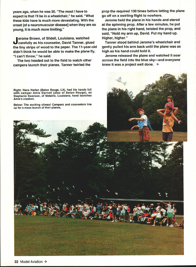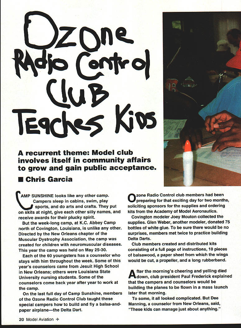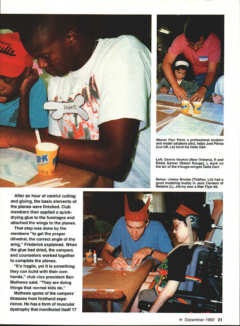z 4 recurrent theme Model club involves itself community affairs grow gain public acceptance U Chris Garcia AMP SUNSHINE looks like other camp Campers sleep cabins swim play sports arts crafts put skits night give other silly names receive awards plucky spirit week-long camp KC Abbey Camp north Covington Louisiana unlike other Directed New Orleans chapter Muscular Dystrophy Association camp created children neuromuscular diseases year camp held May 25-30 60 youngsters has counselor stays him throughout week Some years counselors came Jesuit High School New Orleans others Louisiana State University nursing students Some counselors come back year after year work camp last full day Camp Sunshine members Ozone Radio Control Club taught special campers build fly balsa-andpaper airplanethe Delta Dart Ozone Radio Control club members preparing exciting day two months soliciting sponsors supplies ordering kits Academy Model Aeronautics Covington modeler Joey Mouton collected supplies Glen Weber another modeler donated 75 bottles white glue sure would no surprises members met twice practice building Delta Darts Club members created distributed kits consisting full page instructions 10 pieces balsawood paper sheet wings would cut propeller long rubberband After mornings cheering yelling died down club president Paul Frederick explained campers counselors would building planes flown mass launch later morning some looked complicated Dee Manning counselor New Orleans said kids can manage just about anything 20 Model Aviation w Jimmy Bristee Tickfaw LA good modeling buddy Jack Clement Metairie L Jimmy won Star Flyer kit Above Paul Peret professional sculptor model sailplane pilot helps Joni Pierce Cut Off LA build Delta Dart Left Dennis Newton New Orleans R Eddie Garner Baton Rouge L work tail triangle-winged Delta Dart After hour careful cutting gluing basic elements planes finished Club members applied quickdrying glue fuselages attached wings planes step done members get proper dihedral correct angle wing Frederick explained glue dried campers counselors worked together complete planes Its fragile yet something can build own hands club vice president Ben Mathews said doing things normal kids Mathews spoke campers illnesses firsthand expe rience has form muscular dystrophy manifested itself 17 mber 1992 21 years ago 30 have expect Ill wheelchair said What kids have much devastating onset [of neuromuscular disease] young much limiting Jerome Brown Slidell Louisiana watched carefully counselor David Tanner glued tiny strips wood paper 11-year-old didnt think would able make plane fly cant throw said two headed out field watch other campers launch planes Tanner twirled Right Hans Harlan Baton Rouge LA hands full camper Arnie Darnell also Baton Rouge Stephanie Swanson Metairie Louisiana hand launches Arnies creation Below The exciting climax Campers counselors line up mass launch planes prop required 100 times before letting plane go oft swirling flight nowhere Jerome held plane hands stared spinning prop After few minutes put plane right hand twisted prop said Hold arm up David Put hand up Higher higher Tanner stood behind Jeromes wheelchair gently pulled arm back until plane high hand could hold Jerome released plane watched soar across field blue skyand everyone knew project well done odel Aviation