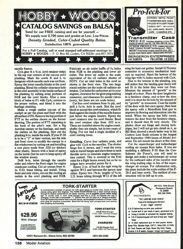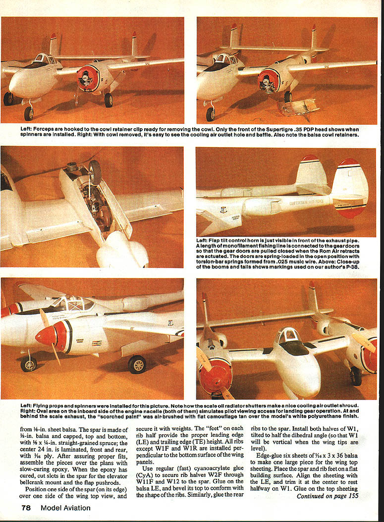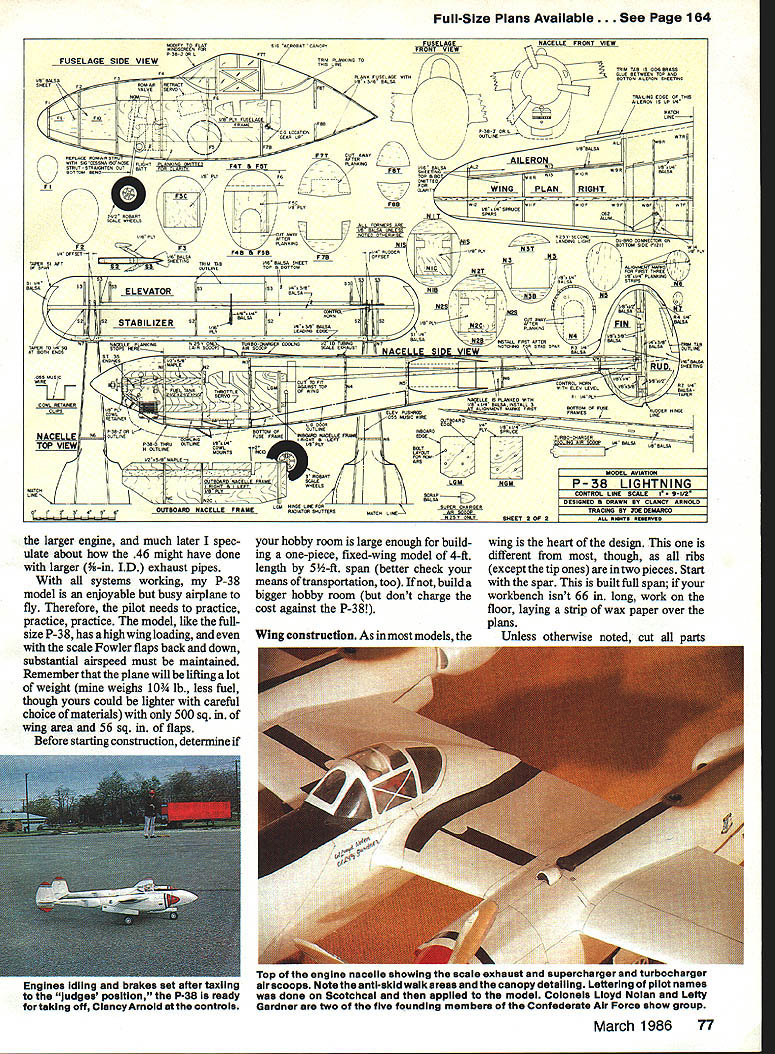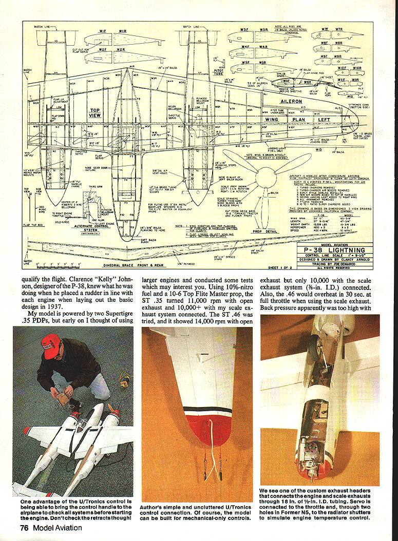 IN THE OPINION Lock heed P-38 Lightning best fighter aircraft World War II might willing concede P-5 1 best second half war P-38 operational much earlier still much thick end Just good P-38 After long over-water flight intercepted aircraft carrying Admiral Yamamoto planner Pearl Harbor attack shot down returned Richard Dick Bong still Americas top ace 40 victories primarily flying P-38s Thomas B McGuire Jr Americas No 2 ace 38 victories also flew P-38s Vividly showing its toughness no other fighter know could Lt Thomas W Smith have rammed 109 head deep over Germany still returned home base England four 50-cal machine guns plus 20mm cannon concentrated nose P-38 earned German nickname Gavel-Schwanz Teufel Fork-Tailed Dev il Oberleutnant Franz Stiegler 28victory ace Germany once stated cardinal rule never forgot avoid fighting P-38 head suicide armament heavy firepower murderous no ever tried type attack once course model isnt tough way fly times ought order survive specffic aircraft have modeled Confederate Air Forces P-38 civilian designation ofN25Y devoid armament Consequently could con sidered being either military civilian category think modeling expensive hobby Lefty Gardnerspon sor pilot N25Ybudgets $20000 per year just maintenance burns $150 P38 Control Line Scale model twin 35s de tailed after Confederate Air Forces N25Y can use either mechanical U/Tronics controls EClancy C Arnold rnoos Dy IUflCY L rnoa anD g. en.. fuel per hour Functions have incorporated model independent throttles propor tional Fowler flaps retracts landing lights wheel brakes landing lights controlled microswitch retract servo brakes standard Du-Bro No 157 nose wheel brake units mounted main gear single servo mounted fuselage activate have entered model several major contests generally receives high static score havent yet acquired piloting skills show models full potential tried flying 1983 contests engines werent broken insomething no should top 1983 Nats may have seen what happens flier forgets plane has independent throttles firewalls outboard engine takeoff guessed ita ground loop model like full-size P-38canbe flown engine once plane air accidentally experienced during 1983 FAI Team Trials inboard engine quit third lap no trouble completing necessary 10 laps March 1986 75 Top Picture TflS moasi ouuiuea wnn ITS sTaTic display props spinners Note simple UiTronlcs connection plugged under wing tip Above see Fowler flaps full extension operation faslnatlng aspects authors P-38 model MATCH TE ALL RIBS ATCH LISE~RiftlB WUSA UNLESS MOTtO 4 CUT OUT Gyms CVDWINo BALSA T WARMARSPARSOAF SHEET RORWARMENTUBESPRUREFLAP RINSE ROA ERRMSHOR lBL E BALSAC IDOWN CA 1-IIREMOVE TARAA IIWEFORE WREETISAoEIUMPLAP PBROHAMIIEVENwit UN PLY NW IMAUVOTMEMSIIAILERON RAILONIIAUTREECS CANtO IIALABATHOS SIAWI BEILARMADIIMONWBRHTARE IIRSR URRIEHWRINWIORUIIR VIEWHOROTHIA-__----I--___ II ____________________ _____________________ _ I_ ___ ____________ I______ _______ WING11 PLANILEEI l\ -WEFSOPIBEF 0TH WNF -A BALSA BLOCSH-SB NOET ERVOSARWA M FLAME MO LEFTY GARDNER 10 010 RHOOS TURINI-NUALE PREP OVOWNI TURBO- VOAWOEBS NEBAAEA SCOOPSFRIACH- CATOTATIOSBALSAN EMELT STYLE CONBAMA IBROALLED TUREED FREM AGRDB ALL ARMAMEET RENRAUBE AREA RLOCOS AlTO0 POLOSS REMOAWO FAR FLOISA VON V AlA METALH BLOADA PROPSB RI RE EAHW SAFER CHAHMEHS ADARA MANICo000TOT FLITE BANTER OW EREBDOLESTTRIS ARMWIMG IS MAMMA AIWESSIANEW EW DRAWINA CUT PHOW ANISA BRARPROOIOEW RH LOCEREED CALIFORNIA VOMFANT TLiAABELIAWAMESYSTEMFLASNINA RE REREOFMP~EPJRESABAS DETAILBPEEO WIRE 100 TOHNODOTRACTOR USA HURTER PHAFT L WING SPANEM ABE-SUM LEENTE30 EIEUM40-SM FLAPTILT ROD ALTERNATE ESAWE ANEI ORT EMPTY IE5B LOS SM LME COiTROL FM ROW BALSA NACELIMS_OMITTED_____NORSPOWERMOO B MODEL AVIATN _-AHWALSAP-38 LIGHTNING IM IUO SHE CELINE SCALEI 2 SPARSDESISBIED B DRAWN BY CLASMCY ARNOLD MATCH ANACS NDIHEDRAL BRACE T B REARAM PLHWOAATRACING BY 30E DEIMR SHEET OF S SNBTh REMBEBS qualify flight Clarence MAKellyRN John- larger engines conducted same tests SOn designer ofthe P-38 knew what may interest Using 10%-nitro doing placed rudder line fuel 10-6 Top Flite Master prop engine laying out basic ST 35 turned 11000 rpm open design 1937 exhaust 10000 scale ex model powered two Supertigre haust system connected ST 46 35 PDPs early thought using tried showed 14000rpm open exhaust 10000 scale exhaust system h-in ID connected Also 46 would overheat 30 sec full throttle using scale exhaust Back pressure apparently tco high 76 Model Aviation advantage U/Tronics control being able bring control handle Authors simple uncluttered U/Tronics alrplanetocheckalisystemsbeforestartlng control connection course model theengin.Dontchecktheretractsthoughi can built mechanical-only controls see 0 custom exnaust neaaers connects engine scale exhausts through 18 1/s-ln iD tubing Servo connected throttle through two holes Former N5 radiator shutters simulate engine temperature control Full-Size Plans Available. See Page 164 SAOWY NO FLAYSIN ACBOBAY FUSELAGENACELLE T VIEW WOWNAWBES FABCANOPYFRONT VIEW PSOANEL FUSELAGE SIDE VIEW / NBANINA NV SNEEr FAS:7II~iAWB YUlE BALSA US BALSAFBAY-OW BAYNACYRANK FUSELPAK WIYYBOYYOU VALANON NABEYYNAA VALVEBABVV\-/ NUSANBYAVLINA CAGE OF 7KW FlU1 --BAYWY Ct FLY FUSELAGE FSFlOL0-- LINE FBVWE CA LOCAYBYSFSAO ABC C B-IICEAB p LISE WON ALl vOBALSA FTCAY AWAY NEFLAWY NONAIB SYBA __________________AFYEBVINY AG CESSNA INONABEFITIIC SYNUN SAIAAYES VANFLIONYF4T RASKINA LSAWICN%OV BGYYBSOBALSA NAN NOVWIlYBINAbS 4FAN ----U---WINGPLANRIGHT FSCFIN*12WIIFWIVYWAFNSFBYF I/B FLYUS BIUV SFNVCE SCVLF VUPEELSSKABSABA ~ABAWB C* FLY COY AWAY1ABIE0ATRAI2LN ANY SECONO IAFYCKLASAISA LIANY NO CANNECYON AS P2FLANVISA VII NSTIVOVYFOBO SlOE 1211wi CV OFFSEt1 —WABSAF45FDAIUV 500000ONLYAS FLY FEWKNIB YAMA/C BALSA BAKEY VAYLINEYVF OVYNABND BALSANtIs 0/STALL FlYNN PAYERBALSAGAAS/S FLASNA/PSANA ANY VNO.YYANOA-OAAAAEN OVALOBAC IAFAANY SOYAPEAG FStAB SPANOs ACBALSANIB NAB U D NINA ELBA LEAEL US /A Y AL ANMENY NA/SAN FISSYBA