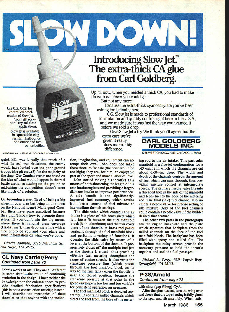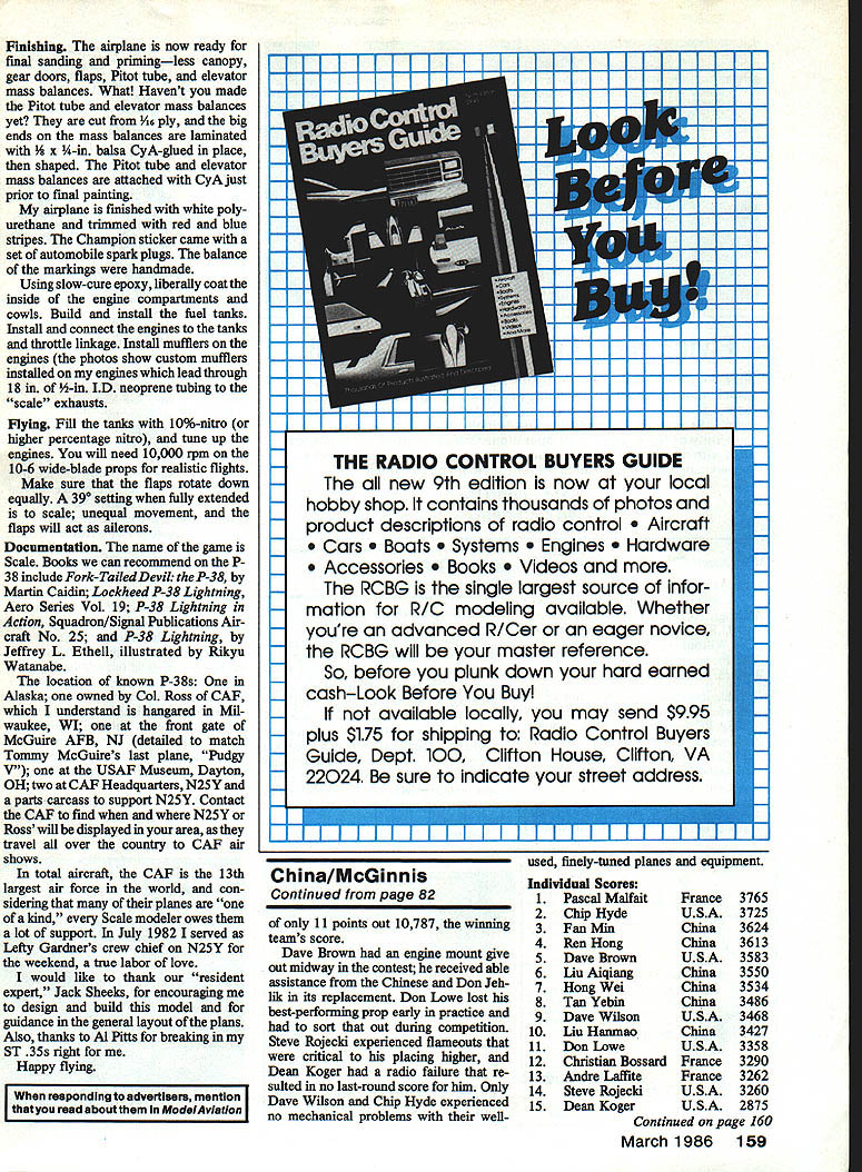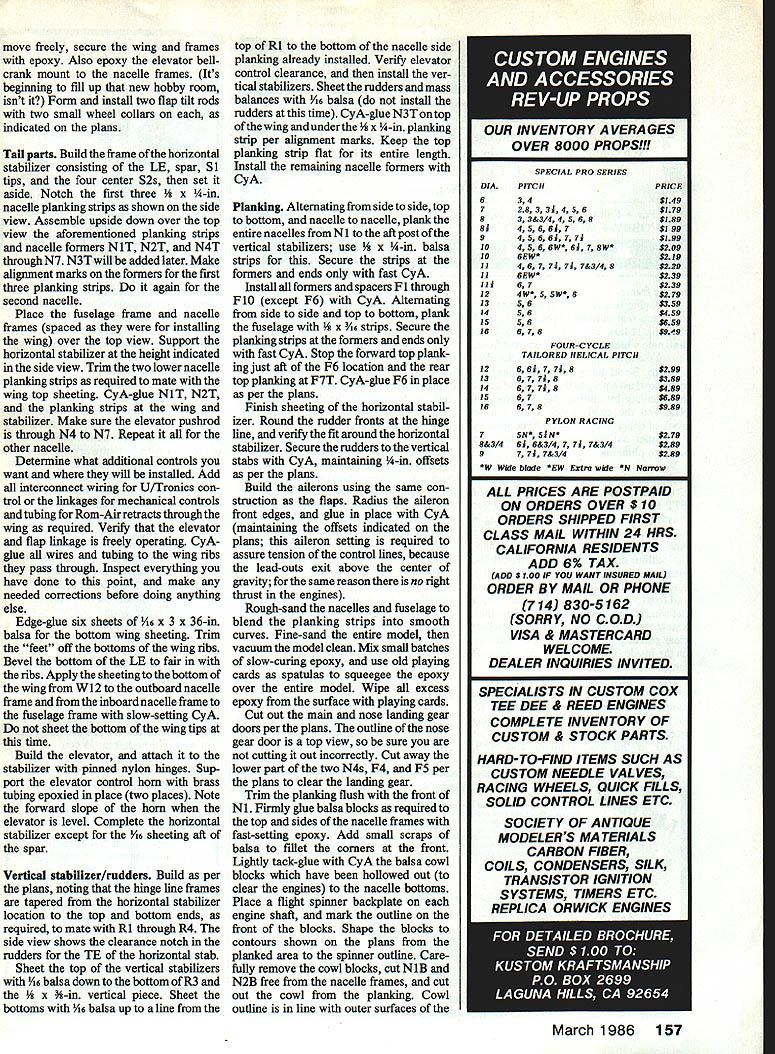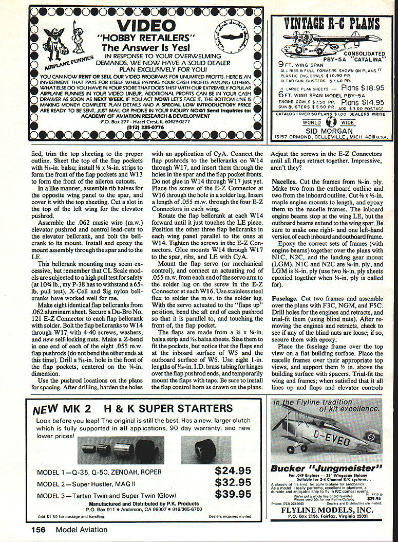 IN THE OPINION Lock heed P-38 Lightning best fighter aircraft World War II might willing concede P-5 1 best second half war P-38 operational much earlier still much thick end Just good P-38 After long over-water flight intercepted aircraft carrying Admiral Yamamoto planner Pearl Harbor attack shot down returned Richard Dick Bong still Americas top ace 40 victories primarily flying P-38s Thomas B McGuire Jr Americas No 2 ace 38 victories also flew P-38s Vividly showing its toughness no other fighter know could Lt Thomas W Smith have rammed 109 head deep over Germany still returned home base England four 50-cal machine guns plus 20mm cannon concentrated nose P-38 earned German nickname Gavel-Schwanz Teufel Fork-Tailed Dev il Oberleutnant Franz Stiegler 28victory ace Germany once stated cardinal rule never forgot avoid fighting P-38 head suicide armament heavy firepower murderous no ever tried type attack once course model isnt tough way fly times ought order survive specffic aircraft have modeled Confederate Air Forces P-38 civilian designation ofN25Y devoid armament Consequently could con sidered being either military civilian category think modeling expensive hobby Lefty Gardnerspon sor pilot N25Ybudgets $20000 per year just maintenance burns $150 P38 Control Line Scale model twin 35s de tailed after Confederate Air Forces N25Y can use either mechanical U/Tronics controls EClancy C Arnold rnoos Dy IUflCY L rnoa anD g. en.. fuel per hour Functions have incorporated model independent throttles propor tional Fowler flaps retracts landing lights wheel brakes landing lights controlled microswitch retract servo brakes standard Du-Bro No 157 nose wheel brake units mounted main gear single servo mounted fuselage activate have entered model several major contests generally receives high static score havent yet acquired piloting skills show models full potential tried flying 1983 contests engines werent broken insomething no should top 1983 Nats may have seen what happens flier forgets plane has independent throttles firewalls outboard engine takeoff guessed ita ground loop model like full-size P-38canbe flown engine once plane air accidentally experienced during 1983 FAI Team Trials inboard engine quit third lap no trouble completing necessary 10 laps March 1986 75 Top Picture TflS moasi ouuiuea wnn ITS sTaTic display props spinners Note simple UiTronlcs connection plugged under wing tip Above see Fowler flaps full extension operation faslnatlng aspects authors P-38 model MATCH TE ALL RIBS ATCH LISE~RiftlB WUSA UNLESS MOTtO 4 CUT OUT Gyms CVDWINo BALSA T WARMARSPARSOAF SHEET RORWARMENTUBESPRUREFLAP RINSE ROA ERRMSHOR lBL E BALSAC IDOWN CA 1-IIREMOVE TARAA IIWEFORE WREETISAoEIUMPLAP PBROHAMIIEVENwit UN PLY NW IMAUVOTMEMSIIAILERON RAILONIIAUTREECS CANtO IIALABATHOS SIAWI BEILARMADIIMONWBRHTARE IIRSR URRIEHWRINWIORUIIR VIEWHOROTHIA-__----I--___ II ____________________ _____________________ _ I_ ___ ____________ I______ _______ WING11 PLANILEEI l\ -WEFSOPIBEF 0TH WNF -A BALSA BLOCSH-SB NOET ERVOSARWA M FLAME MO LEFTY GARDNER 10 010 RHOOS TURINI-NUALE PREP OVOWNI TURBO- VOAWOEBS NEBAAEA SCOOPSFRIACH- CATOTATIOSBALSAN EMELT STYLE CONBAMA IBROALLED TUREED FREM AGRDB ALL ARMAMEET RENRAUBE AREA RLOCOS AlTO0 POLOSS REMOAWO FAR FLOISA VON V AlA METALH BLOADA PROPSB RI RE EAHW SAFER CHAHMEHS ADARA MANICo000TOT FLITE BANTER OW EREBDOLESTTRIS ARMWIMG IS MAMMA AIWESSIANEW EW DRAWINA CUT PHOW ANISA BRARPROOIOEW RH LOCEREED CALIFORNIA VOMFANT TLiAABELIAWAMESYSTEMFLASNINA RE REREOFMP~EPJRESABAS DETAILBPEEO WIRE 100 TOHNODOTRACTOR USA HURTER PHAFT L WING SPANEM ABE-SUM LEENTE30 EIEUM40-SM FLAPTILT ROD ALTERNATE ESAWE ANEI ORT EMPTY IE5B LOS SM LME COiTROL FM ROW BALSA NACELIMS_OMITTED_____NORSPOWERMOO B MODEL AVIATN _-AHWALSAP-38 LIGHTNING IM IUO SHE CELINE SCALEI 2 SPARSDESISBIED B DRAWN BY CLASMCY ARNOLD MATCH ANACS NDIHEDRAL BRACE T B REARAM PLHWOAATRACING BY 30E DEIMR SHEET OF S SNBTh REMBEBS qualify flight Clarence MAKellyRN John- larger engines conducted same tests SOn designer ofthe P-38 knew what may interest Using 10%-nitro doing placed rudder line fuel 10-6 Top Flite Master prop engine laying out basic ST 35 turned 11000 rpm open design 1937 exhaust 10000 scale ex model powered two Supertigre haust system connected ST 46 35 PDPs early thought using tried showed 14000rpm open exhaust 10000 scale exhaust system h-in ID connected Also 46 would overheat 30 sec full throttle using scale exhaust Back pressure apparently tco high 76 Model Aviation advantage U/Tronics control being able bring control handle Authors simple uncluttered U/Tronics alrplanetocheckalisystemsbeforestartlng control connection course model theengin.Dontchecktheretractsthoughi can built mechanical-only controls see 0 custom exnaust neaaers connects engine scale exhausts through 18 1/s-ln iD tubing Servo connected throttle through two holes Former N5 radiator shutters simulate engine temperature control Full-Size Plans Available. See Page 164 SAOWY NO FLAYSIN ACBOBAY FUSELAGENACELLE T VIEW WOWNAWBES FABCANOPYFRONT VIEW PSOANEL FUSELAGE SIDE VIEW / NBANINA NV SNEEr FAS:7II~iAWB YUlE BALSA US BALSAFBAY-OW BAYNACYRANK FUSELPAK WIYYBOYYOU VALANON NABEYYNAA VALVEBABVV\-/ NUSANBYAVLINA CAGE OF 7KW FlU1 --BAYWY Ct FLY FUSELAGE FSFlOL0-- LINE FBVWE CA LOCAYBYSFSAO ABC C B-IICEAB p LISE WON ALl vOBALSA FTCAY AWAY NEFLAWY NONAIB SYBA __________________AFYEBVINY AG CESSNA INONABEFITIIC SYNUN SAIAAYES VANFLIONYF4T RASKINA LSAWICN%OV BGYYBSOBALSA NAN NOVWIlYBINAbS 4FAN ----U---WINGPLANRIGHT FSCFIN*12WIIFWIVYWAFNSFBYF I/B FLYUS BIUV SFNVCE SCVLF VUPEELSSKABSABA ~ABAWB C* FLY COY AWAY1ABIE0ATRAI2LN ANY SECONO IAFYCKLASAISA LIANY NO CANNECYON AS P2FLANVISA VII NSTIVOVYFOBO SlOE 1211wi CV OFFSEt1 —WABSAF45FDAIUV 500000ONLYAS FLY FEWKNIB YAMA/C BALSA BAKEY VAYLINEYVF OVYNABND BALSANtIs 0/STALL FlYNN PAYERBALSAGAAS/S FLASNA/PSANA ANY VNO.YYANOA-OAAAAEN OVALOBAC IAFAANY SOYAPEAG FStAB SPANOs ACBALSANIB NAB U D NINA ELBA LEAEL US /A Y AL ANMENY NA/SAN FISSYBA