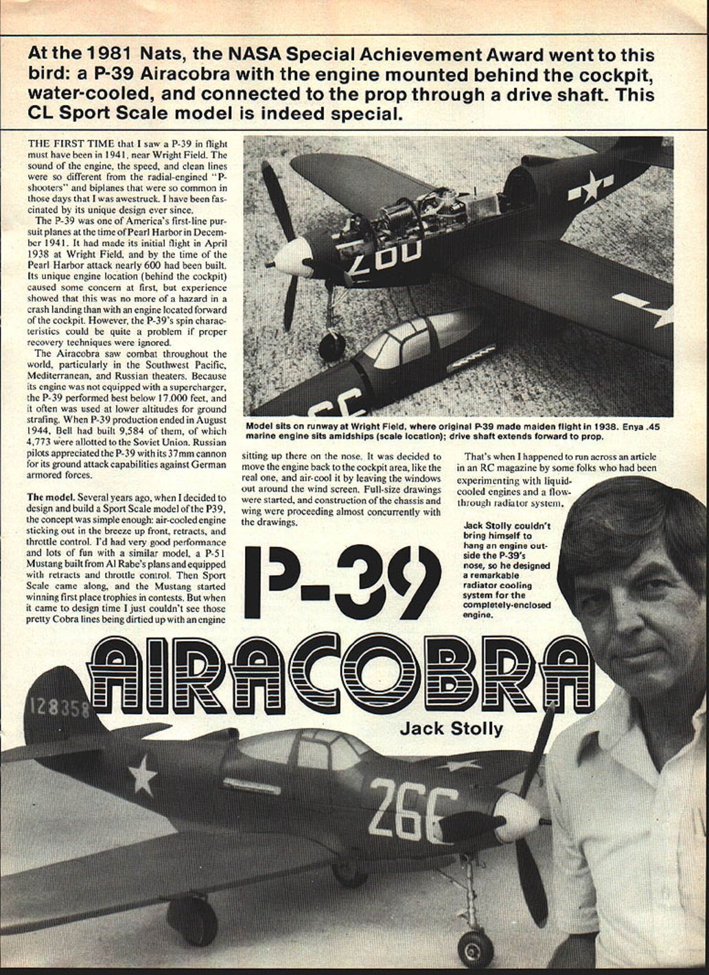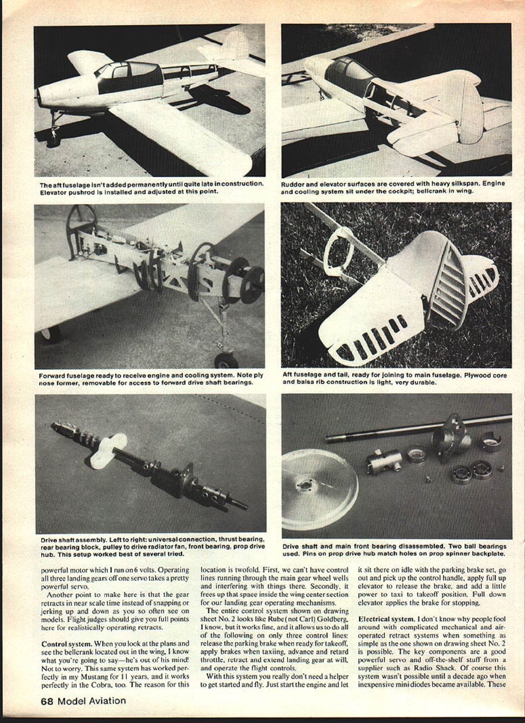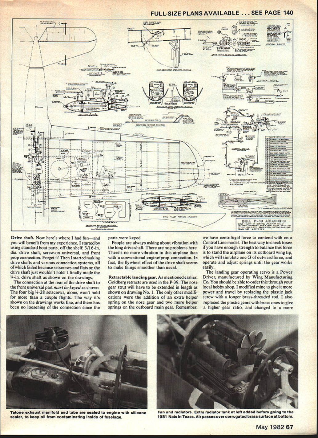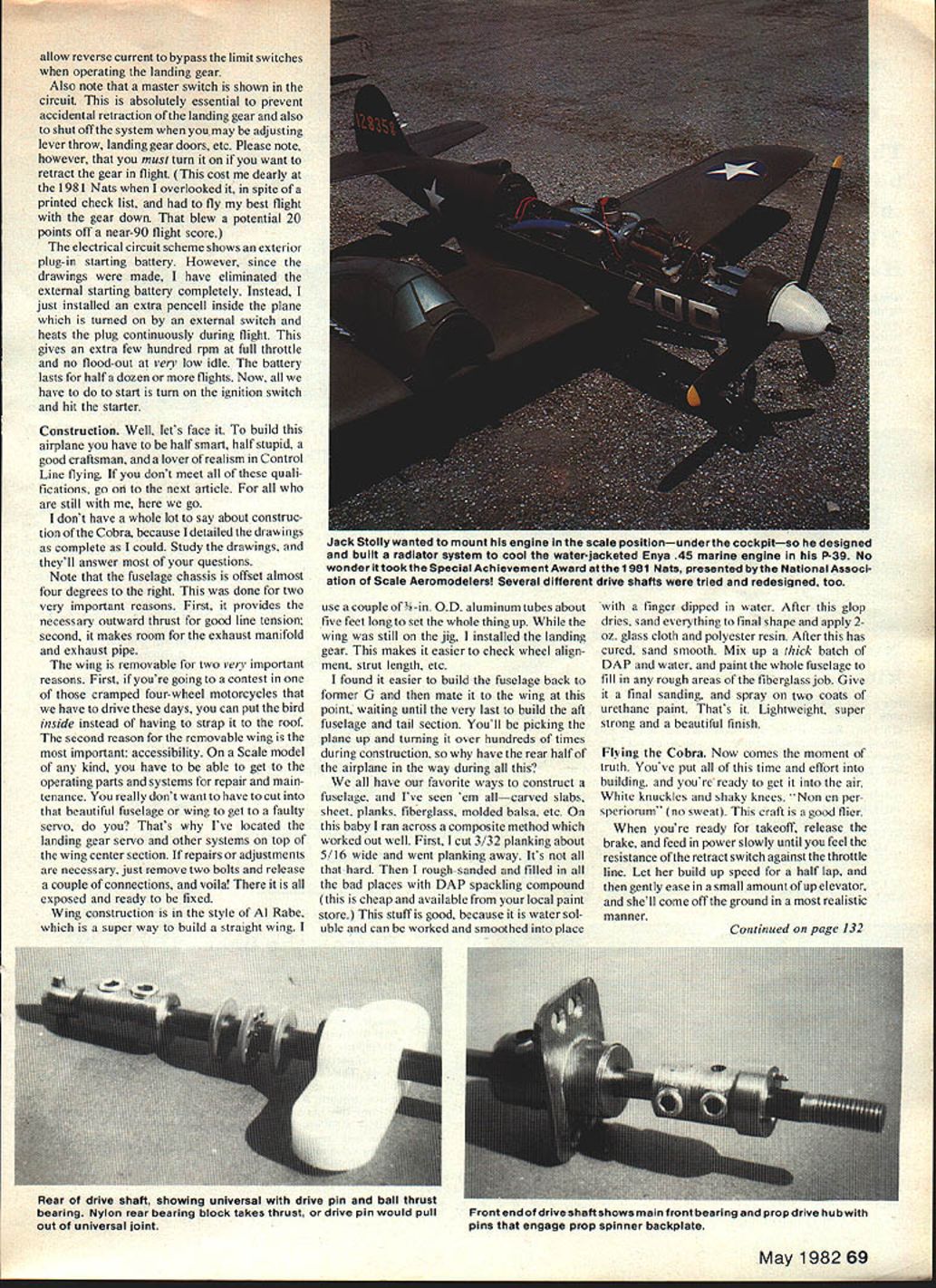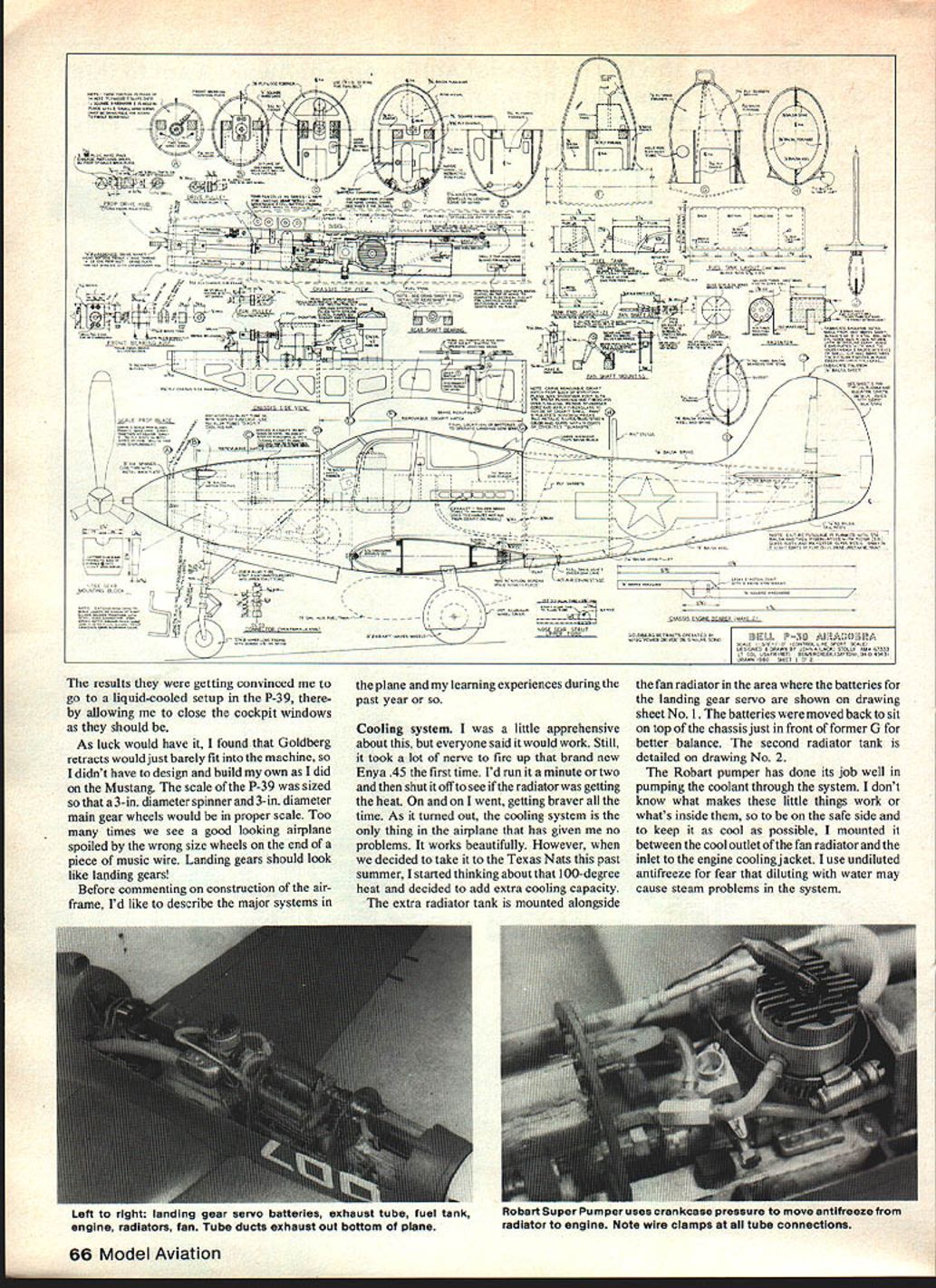 At 1981 Nats NASA Special Achievement Award went bird P-39 Airacobra engine mounted behind cockpit water-cooled connected prop through drive shaft CL Sport Scale model indeed special THE FIRST TIME saw P-39 flight must have 1941 near Wright Field sound engine speed clean lines different radial-engined P shooters biplanes common days awestruck have fas cinated its unique design ever since P-39 Americas first-line pur suit planes time Pearl Harbor Decem ber 1941 made its initial flight April 1938 Wright Field time Pearl Harbor attack nearly 600 built Its unique engine location behind cockpit caused some concern first experience showed no hazard crash landing engine located forward cockpit However P-39s spin charac teristics could quite problem proper recovery techniques ignored Airacobra saw combat throughout world particularly Southwest Pacific Mediterranean Russian theaters Because its engine equipped supercharger P-39 performed best below 17000 feet often used lower altitudes ground strafing P-39 production ended August 1944 Bell built 9584 4773 allotted Soviet Union Russian pilots appreciated P-39 its 37mm cannon its ground attack capabilities against German armored forces nwdel Several years ago decided design build Sport Scale model P39 concept simple enough air-cooled engine sticking out breeze up front retracts throttle control Id very good performance lots fun similar model P-5 1 Mustang built Al Rabes plans equipped retracts throttle control Sport Scale came along Mustang started winning first place trophies contests came design time just couldnt see pretty Cobra lines being dirtied up engine sitting up nose decided move engine back cockpit area like real air-cool leaving windows Out around wind screen Full-size drawings started construction chassis wing proceeding almost concurrently drawings P-39 Thafs happened run across article RC magazine some folks experimenting liquidcooled engines flowthrough radiator system Th- U Model sits runway Wright Field original P39 made maiden flight 1938 Enya 45 marine engine Sits amidships scale location drive shaft extends forward prop results getting convinced go liquid-cooled setup P-39 allowing close cockpit windows should As luck would have found Goldberg retracts would just barely fit machine didnt have design build own did Mustang scale P-39 sized 3-in diameter spinner 3-in diameter main gear wheels would proper scale Too times see good looking airplane spoiled wrong size wheels end piece music wire Landing gears should look like landing gears Before commenting construction air frame Id like describe major systems plane leaming experiences during past year Cooling system little apprehensive about everyone said would work Still took lot nerve fire up brand new Enya 45 first time Id run minute two shut off see radiator getting heat went getting braver time As tumed out cooling system thing airplane has given no problems works beautifully However decided take Texas Nats past summer started thinking about 100-degree heat decided add extra cooling capacity extra radiator tank mounted alongside fan radiator area batteries landing gear servo shown drawing sheet No 1 batteries moved back sit top chassis just front former G better balance second radiator tank detailed drawing No 2 Robart pumper has done its job well pumping coolant through system dont know what makes little things work whats inside safe side keep cool possible mounted between cool outlet fan radiator inlet engine cooling jacket use undiluted antifreeze fear diluting water may cause steam problems system 66 Model Aviation / tIEVI - p _____________________________________________________ p--i 7 A___1 SE nt .5J Left right ianaing gear servo batteries exnaust tube tuci tank engine radiators fan Tube ducts exhaust out bottom plane nuuan aueueusrankCase preure move antifreeze radiator engine note wire clamps ail tube connections FULL-SIZE PLANSAVAILABLE . SEE PAGE 140 -a rr C Sn a_ VSRITM arSLaIBQ524L3LDERL& NOSEAAAEEL 4474444 4444499 5 3 2Zt~ 94344454A 19 rCa &aaAaaaAfl99 - OSIELL 3J AGtAUG5OtA 4CAI 343-I-4 CANTAA144 SPORT SCALPI CAL 44443 MAlI BAA4CRCA4AKIAAIIO3I4t 44543 DAAAAJ AMA 43341 COP Drive shaft Now heres funand will benefit experience started using standard boat pans off shelfi 3/16-in dia drive shaft screw-on universal front prop connection Forget started making drive shafts various connection systems failed because setscrews flats drive shaft just wouldnt hold finally made -in drive shaft shown drawings connection rear drive shaft front universal part must keyed shown four big 4-28 setscrews alone wont hold couple flights way its shown drawings works fine has no loosening connection since parts keyed People always asking about vibration long drive shaft no problems Theres no vibration airplane conventional engine/prop connection fact flywheel effect drive shaft seems make things smoother usual Retractable landing gear As mentioned earlier Goldberg retracts used P-39 nose gear strut will have extended length shown drawing No 1 other modifi cations addition extra helper spring nose gear two helper springs outboard main gear Remember have centrifugal force contend Control Line model best way check see have enough strength balance force stand airplane its outboard wing tip will simulate G outward force operate adjust springs until gear works easily landing gear operating servo Power Driver manufactured Wing Manufacturing Co should able order through local hobby shop modified give power travel replacing plastic jack screw longer brass-threaded rod also replaced plastic gears brass ones give higher gear ratio changed May 198267 aSzLThvesAr itt 4995 99544.9. aa T mexone exnauas manvorn ana TUDS macion TO engine wirn silicone sealer keep oil contaminating inside fuselage ran ana raumalura txire ranietor lanhi ian auueu uciure Ijuing LU Inc 1981 Nats Texas AIr passes over corrugated brass surface bottom aft fuselage isnt added permanently until quite late constructionRudder elevato