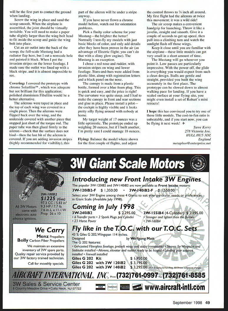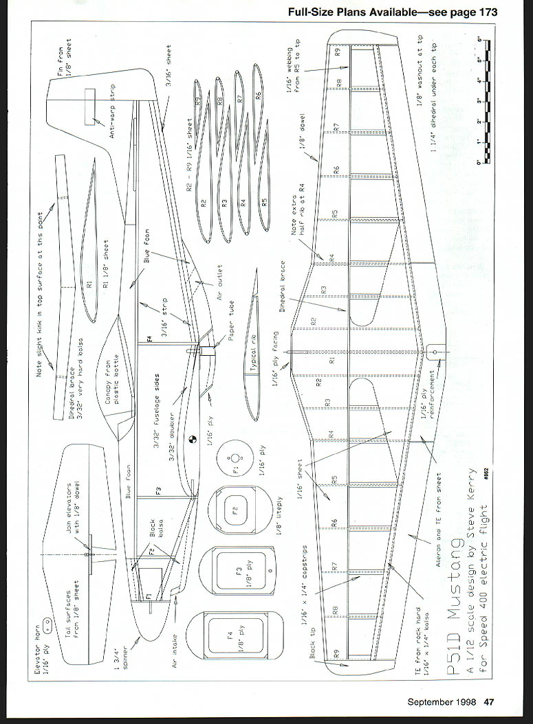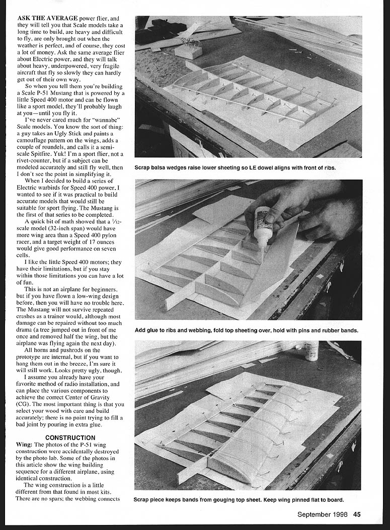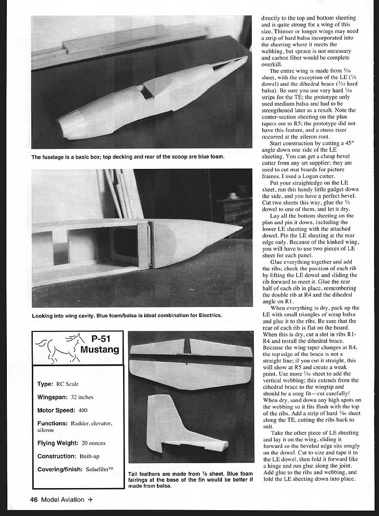 NO OCR TEXT ASK THE AVERAGE power flier will tell Scale models take long time build heavy difficult fly brought out weather perfect course cost lot money Ask same average flier about Electric power wilt talk about heavy underpowered very fragile aircraft fly slowly can hardly get out own way So tell youre building Scale P-5 Mustang powered little Speed 400 motor can flown like sport model theyll probably laugh youuntil fly Ive never cared much wannabe Scale models know sort thing guy takes Ugly Stick paints camouflage pattern wings adds couple roundels calls semiscale Spitfire Yuk Im sport flier rivet-counter subject can modeled accurately still fly well dont see point simplifying decided build series Electric warbirds Speed 400 power wanted see practical build accurate models would still suitable sport flying Mustang first series completed quick bit math showed /12scale model 32-inch span would have wing area Speed 400 pylon racer target weight 17 ounces would give good performance seven cells like little Speed 400 motors have limitations stay within limitations can have lot fun airplane beginners have flown low-wing design before will have no trouble Mustang will survive repeated crashes trainer would although damage can repaired too much drama tree jumped out front once removed half wing airplane flying again next day horns pushrods prototype internal want hang out breeze Im sure will still work Looks pretty ugly though assume already have favorite method radio installation can place various components achieve correct Center Gravity CG important thing select wood care build accurately no point trying fill bad joint pouring extra glue CONSTRUCTION Wing photos P-5 wing construction accidentally destroyed photo lab Some photos article show wing building sequence different airplane using identical construction wing construction little different found kits no spars webbing connects September 1998 45 Scrap balsa wedges raise lower sheeting LE dowel aligns front ribs Add glue ribs webbing fold top sheeting over hold pins rubber bands Scrap piece keeps bands gouging top sheet Keep wing pinned flat board directly top bottom sheeting quite strong wing size Thinner longer wings may need strip hard balsa incorporated sheeting meets webbing spruce necessary carbon fiber would complete overkill entire wing made /16 sheet exception LE /s dowel dihedral brace /32 hard balsa sure use very hard /16 strips TB prototype used medium balsa strengthened later result Note center-section sheeting plan tapers out R5 prototype did have feature stress riser occurred aileron root Start construction cutting 450 angle down side LB sheeting can get cheap bevel cutter art supplier used cut mat boards picture frames used Logan cutter Put straightedge LE sheet run handy little gadget down side have perfect bevel Cut two sheets way glue /s dowel let dry Lay bottom sheeting plan pin down including lower LB sheeting attached dowel Pin LB sheeting rear edge Because kinked wing will have use two pieces LE sheet panel Glue everything together add ribs check position rib lifting LB dowel sliding rib forward meet Glue rear half rib place remembering double rib R4 dihedral angle Rl everything dry pack up LB small triangles scrap balsa glue ribs sure rear rib flat board dry cut slot ribs Rl R4 install dihedral brace Because wing taper changes R4 top edge brace straight line cut straight will show R5 create weak point Use /16 sheet add vertical webbing extends dihedral brace wingtip should snug fitcut carefully dry sand down high spots webbing fits flush top ribs Add strip hard /16 sheet along TB cutting ribs back suit Take other piece LB sheeting lay wing sliding forward beveled edge sits snugly dowel Cut size tape LB dowel fold forward like hinge run glue along joint Add glue ribs webbing fold LB sheeting down place 46 Model Aviation lage basic box top decking rear scoop blue foam Looking wing cavity Blue foamlbalsa ideal combination Electrics K P-51 Mustang V Type RC Scale Wingspan 32 inches Motor Speed 400 Functions Rudder elevator aileron Flying Weight 20 ounces Construction Built-up Covering/finish SolarfilmTM Tail feathers made 1/8 sheet Blue foam fairings base fin would better made balsa Elevator horn 1/16 ply Tail srFaces 1/8 sheet 3/4 witn 1/8 dawe Join elevators Note si nt kinl n top surface point 3/32 very hard anlsa Antiwarp trip ep nner 1/16_________________________________________________ Ar outlet R4Paper tuoe 1/8 ply calr IYH \\/I 1/16 ply Loll ~ /8 Itep y 1/16 ply foang Diheoral omace 3/16 sheet 1/16 x 1/4 capstrps 1/16 sneet RS888785 1/16 wedhing 85 tip Note extra haf nh 841/8 dowe 8282 02 p85187 R889 K ieet6P e een e a d TE Fr TE roc hard 1/16 x 1/4 halsa R1L Hustoji 1/12 scoW oesign oy Steve Kercy 4cr Speed 400 eLectrc fugot #862 1/8 washout tip 1 1/4 dihedral under tip 0123456 I I I Cj vi Cl CD V CD 0 CD 0 0 -J 1 Fr CD Cn CD CD -o CO CD -L -4 C Hold rubber bands tape until dry add top capstrips TB piece everything dry remove board will find wing surprisingly light strong did remember add /x washout didnt can added covering Build second wing onto first lifting tip dihedral brace sits flat may find easier fit wing dowel RI before sheeting top second wing offcut LE dowel fine traditional /2-inch bandage epoxy around center section important will also need piece R4 LB back dihedral brace prefer use torque rods ailerons have far less slop control snakes Cut length /is wire suit Cut narrow strip ordinary paper rub glue stick down side wrap around wire spiral pattern glue outside dry trim ends have thin light sleeve fits perfectly over wire permits smooth rotation Bend end wire solder brass tube flattened drilled take clevis Slide paper tube place bend other end wire cut fit aileron paper tube can also formed around torque rod after making bends forget fit first like did course could just use commercial torque rod linkage started out way homemade version smaller lighter entire TB wing including aileron made single 