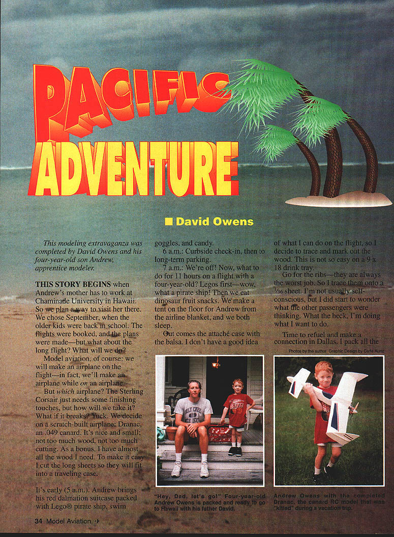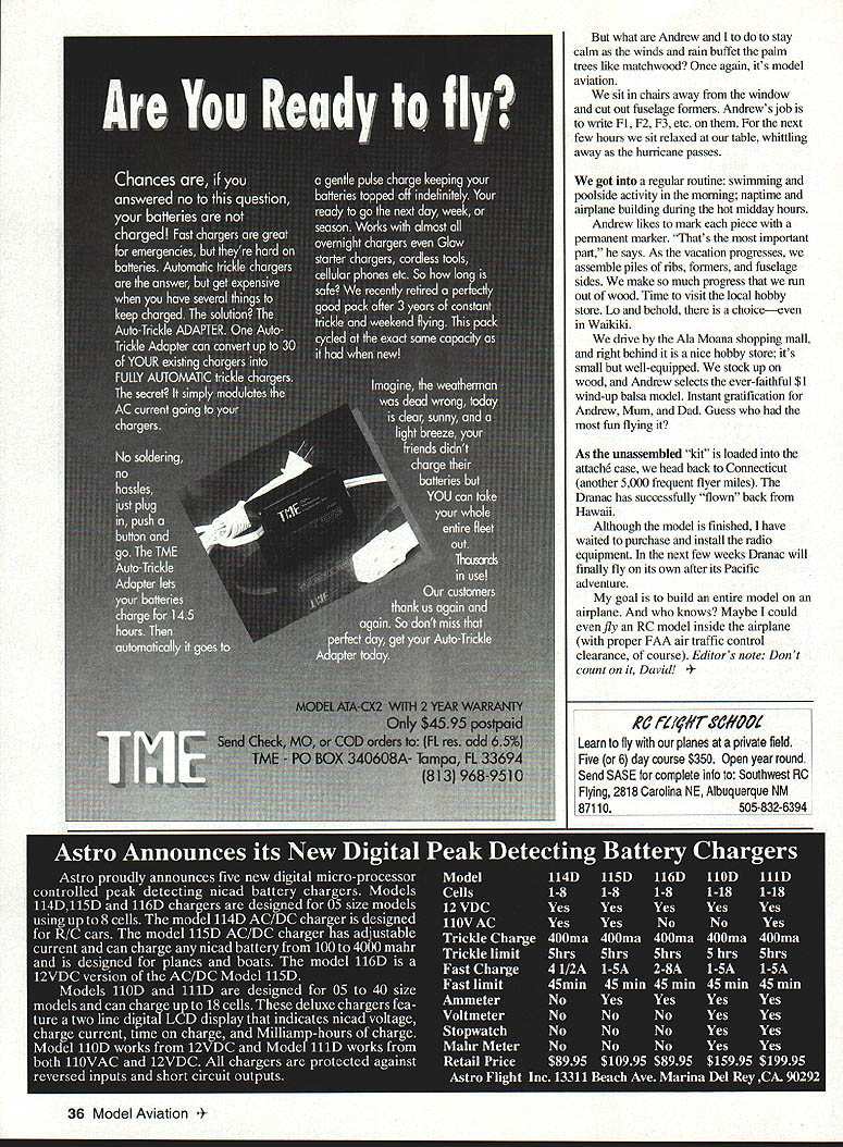 NO OCR TEXT balsa attacbe change airplanes main attractions gone eaten pirate ship dinosaur fruit snacks now have occupy Andrew few hours Tracing balsa just will Time plan B whip out two old T shirtsone black white trace skulland-crossbones white shirt have scissors handy always use cut crossgrain thin balsa skillfully cut apart T-shirt black shirt cut flag shape Now challenge sew skull-andcrossbones other shirt Aha used glueno sewing required drape flag across seat back front Strange things happen airplanes time made tent cut out balsa parts airplane made huge pirate flagand no said word captain speaking . fasten seat belts look out sea sign Oahu see some militaiy airplanes touch down join exit scuffle get off airplane Still no says word both put pirate eye patches Look Dad palm trees Andrew notices decoration airport Look Dad Empire State Building taxi passes through Honolulu Look Dad volcano approach Diamond Head check hotel few blocks back Waikiki Beach As awaken early next morning explore beachfront uncomfortable calm stores closed some have tape across windows must some reason As return room idle chatter weathennan confirmed sirens sound Hurticane Jnikki heading way decide evacuate hotel others walk down block beach crowds standing hotels waiting hurncane hit take last run down beach dip feet water run back fast can guards order us off beach 3 pm storm hitting its hardest air pressure humidity cloud cover have changed rapidly like being Twilight Zone Andrews mother sleeps -1 RED MAX FUEL RED MAX I-UL Easy beginners powerful experts Available synthetic castor blends RED MAX 0130795493488281722388 RED MAX 514451055103397590329104 REDMAX1O158311561132106998935821 RED MAX 121838119611711106102438507 RED MAX 151737126812421173108643315 RED MAX RACING FUEL Trophy winners planes boats cars loads documented records RED MAX 201865136113331259116549507 RED MAX 252003146214321352125256224 REDMAX3O2141156315311445133862940 RED MAX 402417176517281632151176373t RED MAX 50 2694 1966 1926 1818 1684 89806 RED MAX 60 2970 2168 2124 2005 1856 103239 RED MAX 65 3108 2269 2222 2098 1943 109956 4-CYCLE FUEL Eliminates detonation & kickbsck 4-cy engines specially good older models 10-4CYCLE 1538 1123 1100 1038 961 33629 15-4CYCLE 1676 1224 1198 1131 1048 40346IZiiiiiiiI SUPER TIGER 3000 FUEL Best fuel Super Tiger 2000 4000 engines ST 3000 1583 1156 1132 1069 989 35821 ......-j RED MAX DIESEL FUEL Superior diesel back list popular demand customers GAL1911 1329 1301 1229 1092 *** HELICOPTER FUEL *** Estremely smooth & cool running extre defoamer & new SUPERIOR oil helicopters 10 Helicopter158811591136107299336074 _____ 15 Helicopter1798131312861214112446275 25 Helicopter2338170716721578146172534 30 Helicopter2477180817711672154879250 RED MAX PERFORMANCE FUEL High flash point heavy oil use tuned pipes ducted fan & other hesvy duty app 5 Performance 159311631139107699636327 10 Performancel732126412381169108243043 15 Performancel870136513371262116949760 REDMAXPATTERNFUEL Proven best fuel pattern engines using pumps tuned pipes 5 Pattern159311631139107699636327 10 Pattern1732126412381169108243043 15 Pattern1870136513371262116949760 Power easy starting power smooth take offs power intricate maneuvers Red Max makes engine come alive power performance never expected can have power Its phone call away Power today next week next year Red Maxs secret ingredients keep engine lasting longer running powerfully other 100% money back ____ guarantee completely satisfied reason Red Max has power CUSTOM BLENDED FUEL INGREDIENTSGrand Total better idle will mix custom fuel formula specialand better engine minimum gallon Fuel ingredients available inwear minimum quantities gallon Call prices itemscharacteristics Also special 2-cycle oil big engines such SAX etc Cleaner cooler running oil other marketthan ES MAY CHANGE WITHOUT NOTICE.other fuel November 1995 35 Super Fuel Engines CALL OR USE THIS HANDY ORDER FORM TO SPEED YOUR ORDER FILL IN OTY ON THE LEFT THE TOTAL ON RIGHT Freight free qts gals Drums shipped treight collect may prepay freight wish Mix qty Total qty determines price SC orders add 5% sales tax Dealer club prices avail Accept credit cards checks COD COD add $475 per carton UPS shipments add $800 per carton hazardous materials fee No hazard fee orders 24 gals shipped motorfreight Also available RED MAX TSHIRTS $600 RED MAX HATS $400 OTY FUELONE 4 GAL 24 GAL 60 GAL 1126 GAL 54 GALTOTAL ORDERED MIXTUREGAL CASE PER GALPERGALJPERGAL DRUM$AMT Di5ii HEN____ PLEASE PRINT NAME BOX STREET CITY STATE ZIP CARD TYPE AND NO EXPIRATION DATE what Andrew Ito stay calm winds rain buffet palm trees like matchwood Once again its model aviation sit chairs away window cut out fuselage formers Andrews job write Fl F2 F3 etc next few hours sit relaxed table whittling away hurricane passes got regular routine swimming poolside activity morning naptime airplane building during hot midday hours Andrew likes mark piece permanent marker Thats important part says As vacation progresses assemble piles ribs formers fuselage sides make much progress run out wood Time visit local hobby store Lo behold choiceeven Waikiki drive Ala Moana shopping mall right behind nice hobby store its small well-equipped stock up wood Andrew selects ever-faithful $1 wind-up balsa model Instant gratification Andrew Mum Dad Guess fun flying As unassembled kit loaded attach6 case head back Connecticut another 5000 frequent flyer miles Dranac has successfully flown back Hawaii Although model finished have waited purchase install radio equipment next few weeks Dranac will finally fly its own after its Pacific adventure goal build entire model airplane knows Maybe could evenfly RC model inside airplane proper FAA air traffic control clearance course Editors note Dont count David n fly planes private field Five 6 day course $350 Open year round Send SASE complete info Southwest RC Flying 2818 Carolina NE Albuquerque NM 87110___505-832-6394 36 Model Aviation