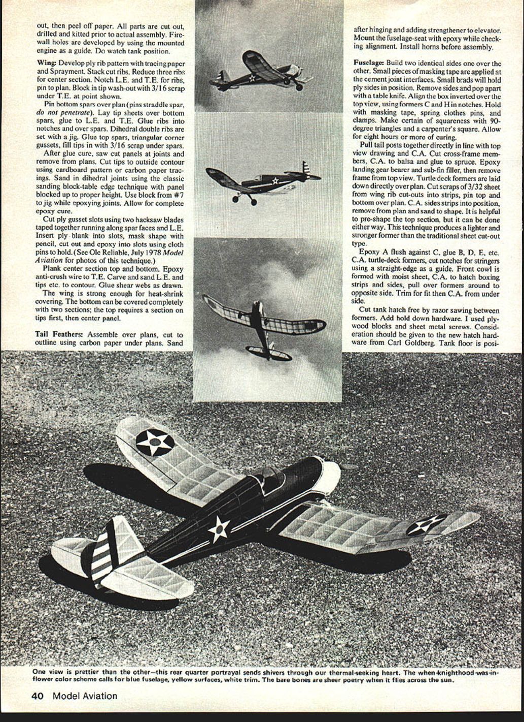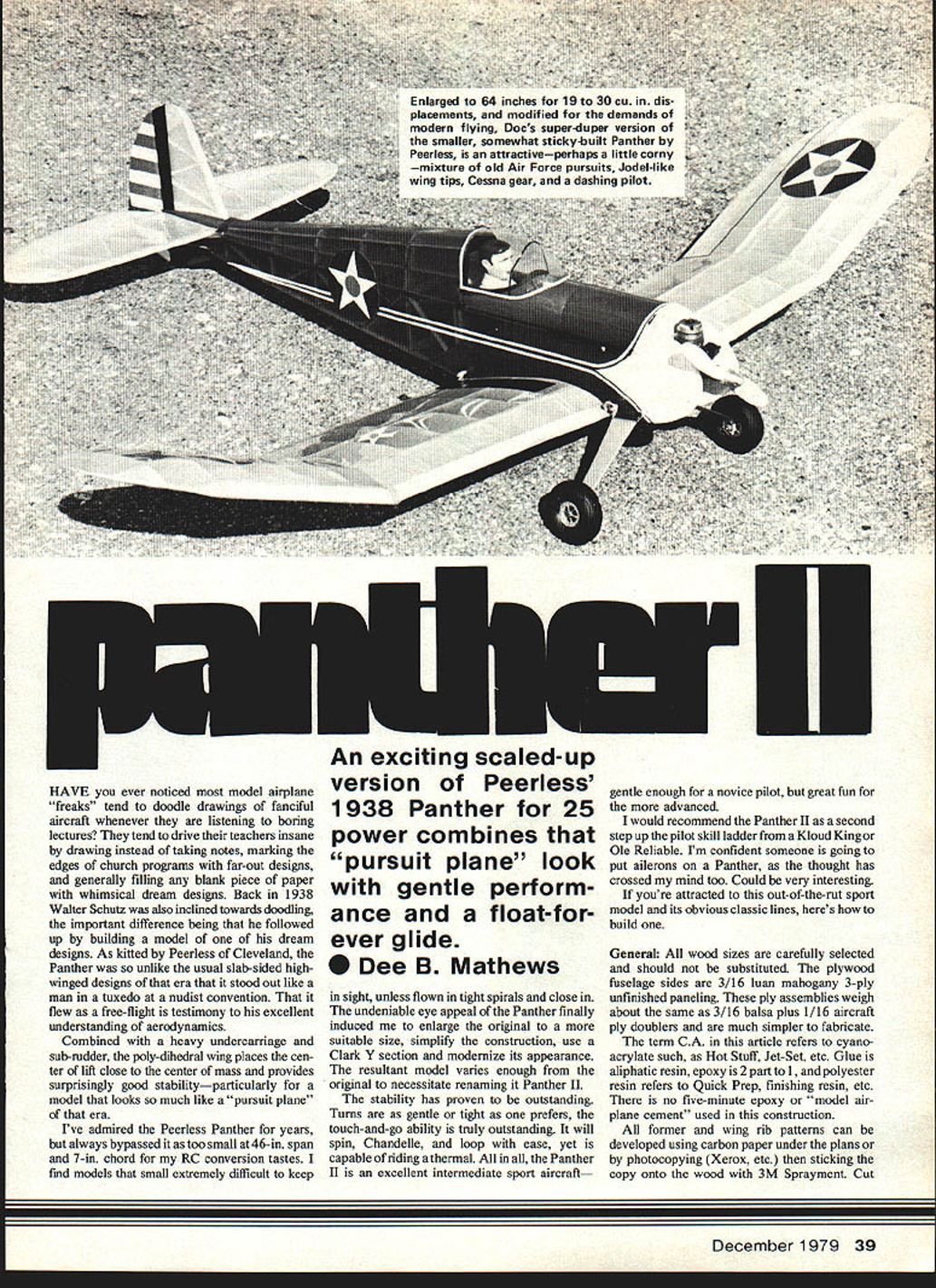 HAVE ever noticed model airplane freaks tend doodle drawings fanciful aircraft whenever listening boring lectures tend drive teachers insane drawing instead taking notes marking edges church programs far-out designs generally filling blank piece paper whimsical dream designs Back 1938 Walter Schutz also inclined towards doodling important difference being followed up building model dream designs As kitted Peerless Cleveland Panther unlike usual slab-sided highwinged designs era stood out like man tuxedo nudist convention flew free-flight testimony excellent understanding aerodynamics Combined heavy undercarriage sub-rudder poly-dihedral wing places cen ter lift close center mass provides surprisingly good stabilityparticularly model looks much like pursuit plane era Ive admired Peerless Panther years always bypassed too small 46-in span 7-in chord RC conversion tastes find models small extremely difficult keep An exciting scaled-up version Peerless 1938 Panther 25 power combines 'pursuit plane' look gentle perform ance float-for ever glide Dee B Mathews m sight unless flown tight spirals close undeniable eye appeal Panther finally induced enlarge original suitable size simplify construction use Clark Y section modernize its appearance resultant model varies enough original necessitate renaming Panther II stability has proven outstanding Turns gentle tight prefers touch-and-go ability truly outstanding will spin Chandelle loop ease yet capable riding thermal Panther II excellent intermediate sport aircraft gentle enough novice pilot great fun advanced would recommend Panther II second step up pilot skill ladder Kloud King Ole Reliable Im confident someone going put ailerons Panther thought has crossed mind too Could very interesting youre attracted out-of-the-rut sport model its obvious classic lines heres build General wood sizes carefully selected should substituted plywood fuselage sides 3/16 luan mahogany 3-ply unfinished paneling ply assemblies weigh about same 3/16 balsa pIus 1/16 aircraft ply doublers much simpler fabricate term CA article refers cyano acrylate such Hot Stuff Jet-Set etc Glue aliphatic resin epoxy 2 part 1 polyester resin refers Quick Prep finishing resin etc no five-minute epoxy model air plane cement used construction former wing rib patterns can developed using carbon paper under plans photocopying Xerox etc sticking copy Onto wood 3M Sprayment Cut December 1 979 39 out peel off paper parts Cut oUt drilled kitted prior actual assembly Firewall holes developed using mounted engine guide watch tank position Wing Develop ply rib pattern tracing paper Sprayment Stack cut ribs Reduce three ribs center section Notch LE TE ribs pin plan Block tip wash-out 3/16 scrap under IE point shown Pin bottom spars over plan pins straddle spar penetrate Lay tip sheets over bottom spars glue LE TE Glue ribs notches over spars Dihedral double ribs set jig Glue top spars triangular corner gussets fill tips 3/16 scrap under spars After glue cure saw cut panels joints remove plans Cut tips outside contour using cardboard pattern carbon paper trac ings Sand dihedral joints using classic sanding block-table edge technique panel blocked up proper height Use block #7 jig epoxying joints Allow complete epoxy cure Cut ply gusset slots using two hacksaw blades taped together running along spar faces LE Insert ply blank slots mask shape pencil cut out epoxy slots using cloth pins hold See Ole Reliable July 1978 Model Aviation photos technique Plank center section top bottom Epoxy anti-crush wire TE Carve sand LE tips etc contour Glue shear webs drawn wing strong enough heat-shrink covering bottom can covered completely two sections top requires section tips first center panel Tail Feathers Assemble over plans cut outline using carbon paper under plans Sand after hinging adding strengthener elevator Mount fuselage-seat epoxy check ing alignment Install horns before assembly Fuselage Build two identical sides over other Small pieces masking tape applied cement joint interfaces Small brads will hold ply sides position Remove sides pop apart table knife Align box inverted over top view using formers C H notches Hold masking tape spring clothes pins clamps Make certain squareness 90degree triangles carpenters square Allow eight hours curing Pull tail posts together directly line top view drawing CA Cut cross-frame mem bers CA balsa glue spruce Epoxy landing gear bearer sub-fin filler remove frame top view Turtle deck formers laid down directly over plan Cut scraps 3/32 sheet wing rib cut-outs strips pin top bottom over plan CA sides strips position remove plan sand shape helpful pre-shape top section can done either way technique produces lighter stronger former traditional sheet cut-out type Epoxy flush against C glue B D E etc CA turtle-deck formers cut notches stringers using straight-edge guide Front cowl formed moist sheet CA hatch boxing strips sides pull over formers around opposite side Trim fit CA under side Cut tank hatch free razor sawing between formers Add hold down hardware used ply wood blocks sheet metal screws Consid eration should given new hatch hard ware Carl Goldberg Tank floor posi ew prettier iuuu utrcrLIuu reer quarter portrayal senus sniVers tnrougn tnermal-seeklng neart ne Wnefl4nIghtnOod-w85-lflcolor scheme calls blue fuselage yellow surfaces white trim bare bones sheer poetry flies across sun 40 Model Aviation __ LL --s--_ I Ii - -t 7 _____ -5 Pav~LT FULL SIZE PLANS AVAILABLE SEE PAGE 128 tioned suit engine glued Mount engine metal mount position against mark drill holes 4 X 40 T-nuts throttle pushrods tank Cut tailpost spruce epoxy fuse lage rear Add sub-rudder assembly car ries tail-end loads securely wrapped glass tape epoxy Cut nose block rough outline t cross-grained lamination 3/16 sheet Epoxy firewall sand contour Coat tank compartment nose polyester resin warmed epoxy Temporarily install Nyrods radio throttle link used 045 music wire running inside outer Nyrod en