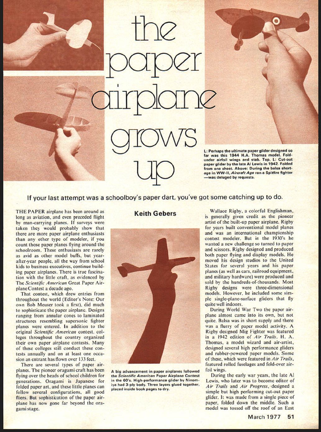 The sophistication of paper airplanes has now gone far beyond the origami stage. Keith Gebers and Wallace Rigby, a colorful Englishman generally given credit as a pioneer artist, built paper airplanes. Rigby, who had built conventional model planes for international championship contests as a modeler in the 1930s, wanted a new challenge. He turned to paper and scissors. Rigby designed and produced both paper flying display models and moved design studios to the United States for several years. Paper planes, as well as cars, railroad equipment, and military hardware, were produced and sold by hundreds of thousands.