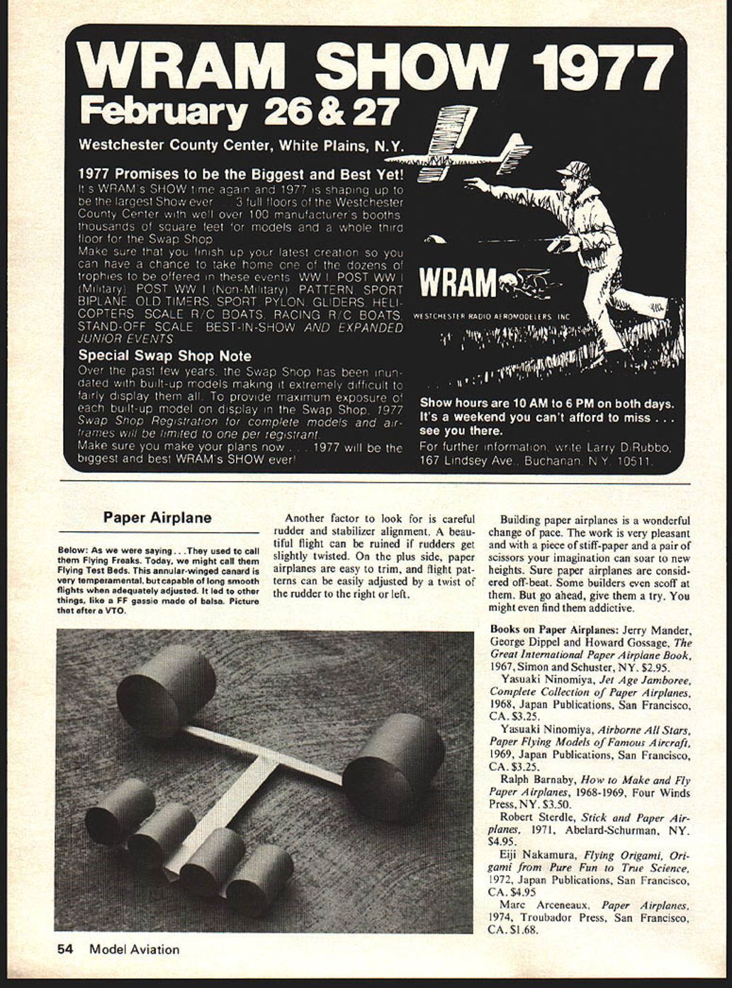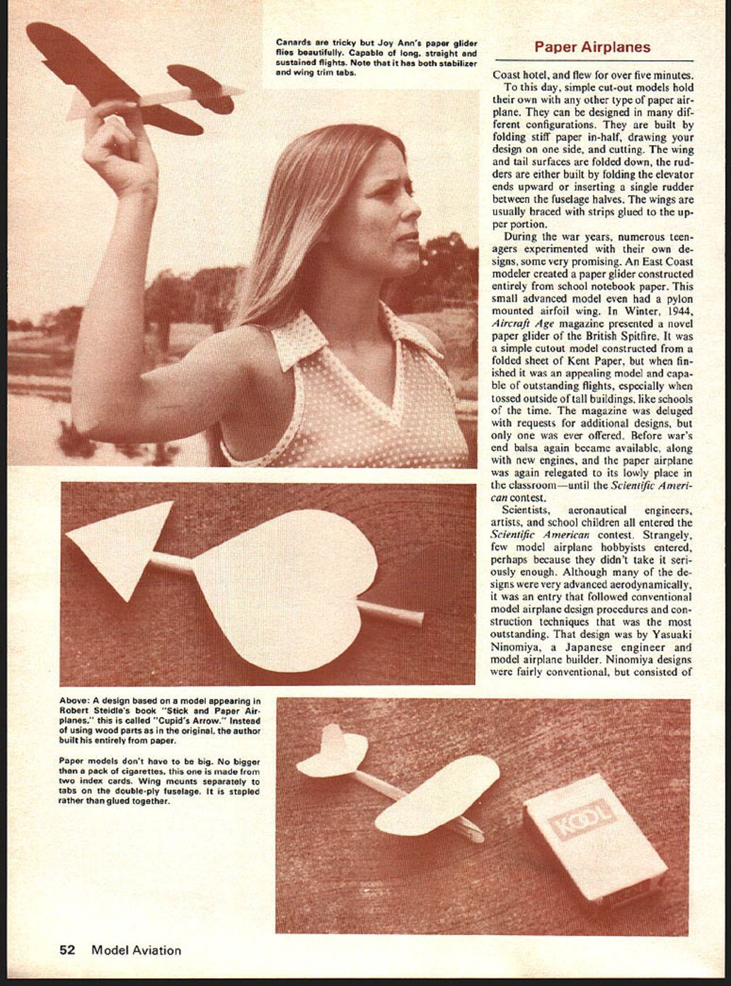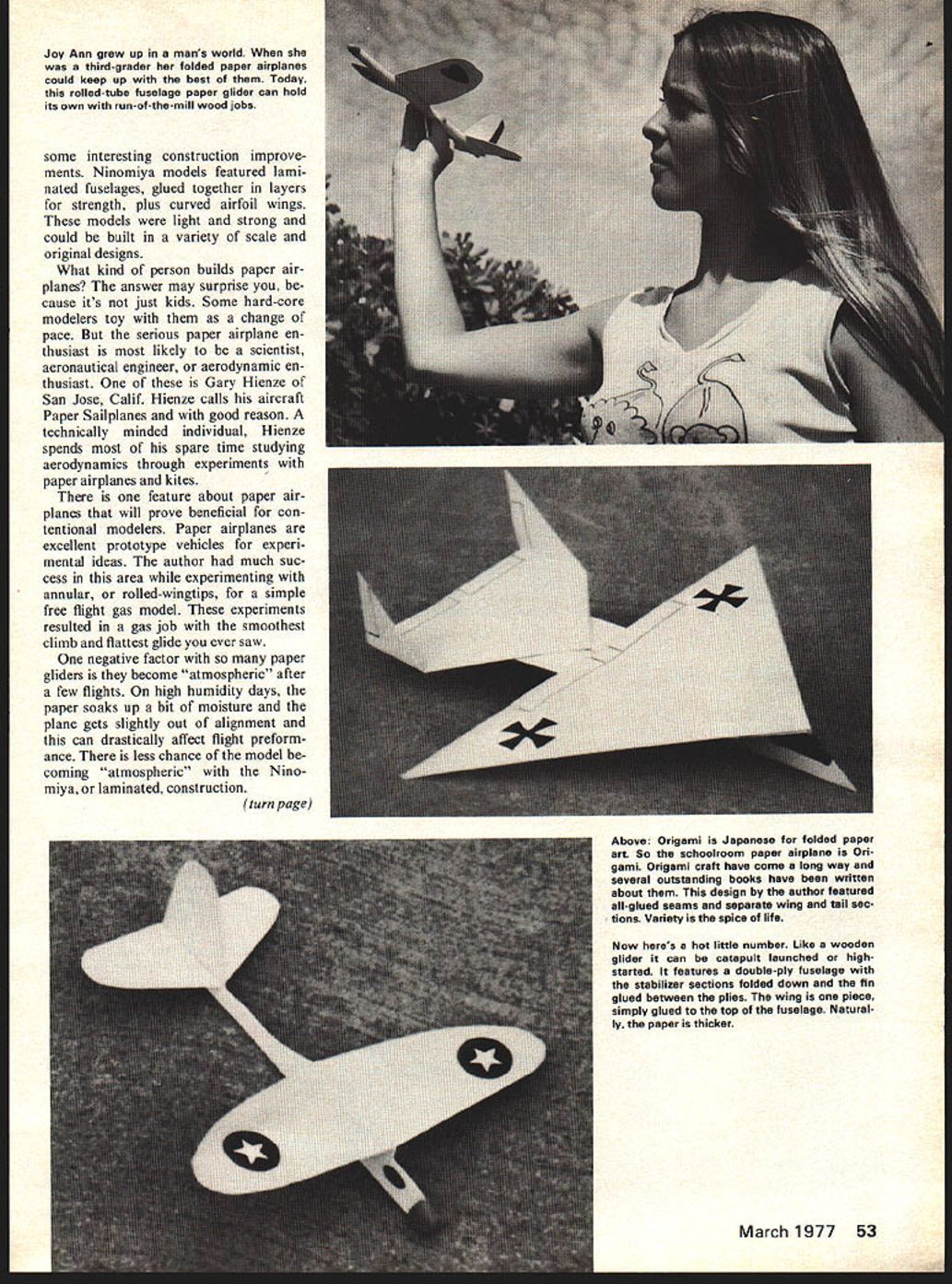 Joy Ann grew up in a man's world, as a third-grader who folded paper airplanes could keep up with the best. Today, rolled-tube fuselage paper gliders can hold their own against run-of-the-mill wooden jobs, featuring some interesting construction improvements. Ninomiya's models featured laminated fuselages glued together in layers for strength, plus curved airfoil wings; these models are light and strong and can be built from a variety of scale original designs.