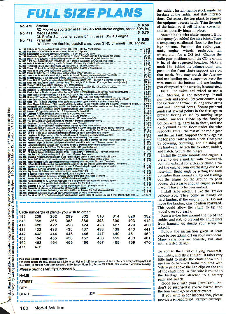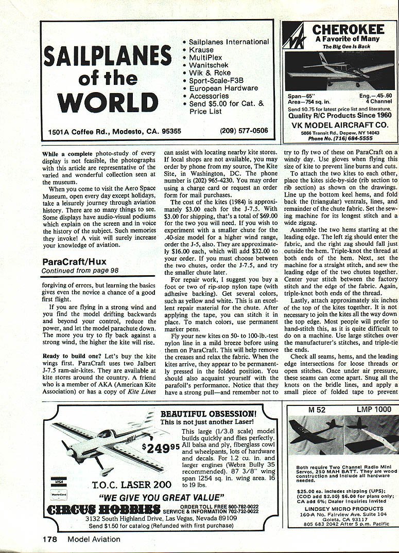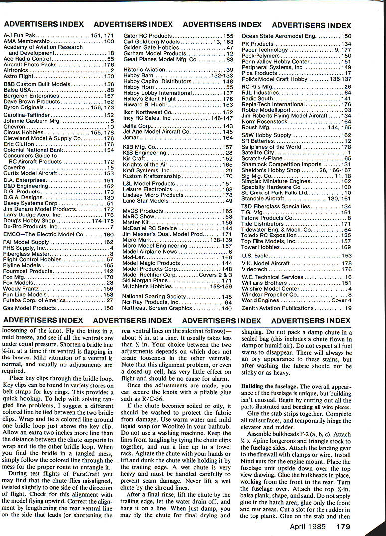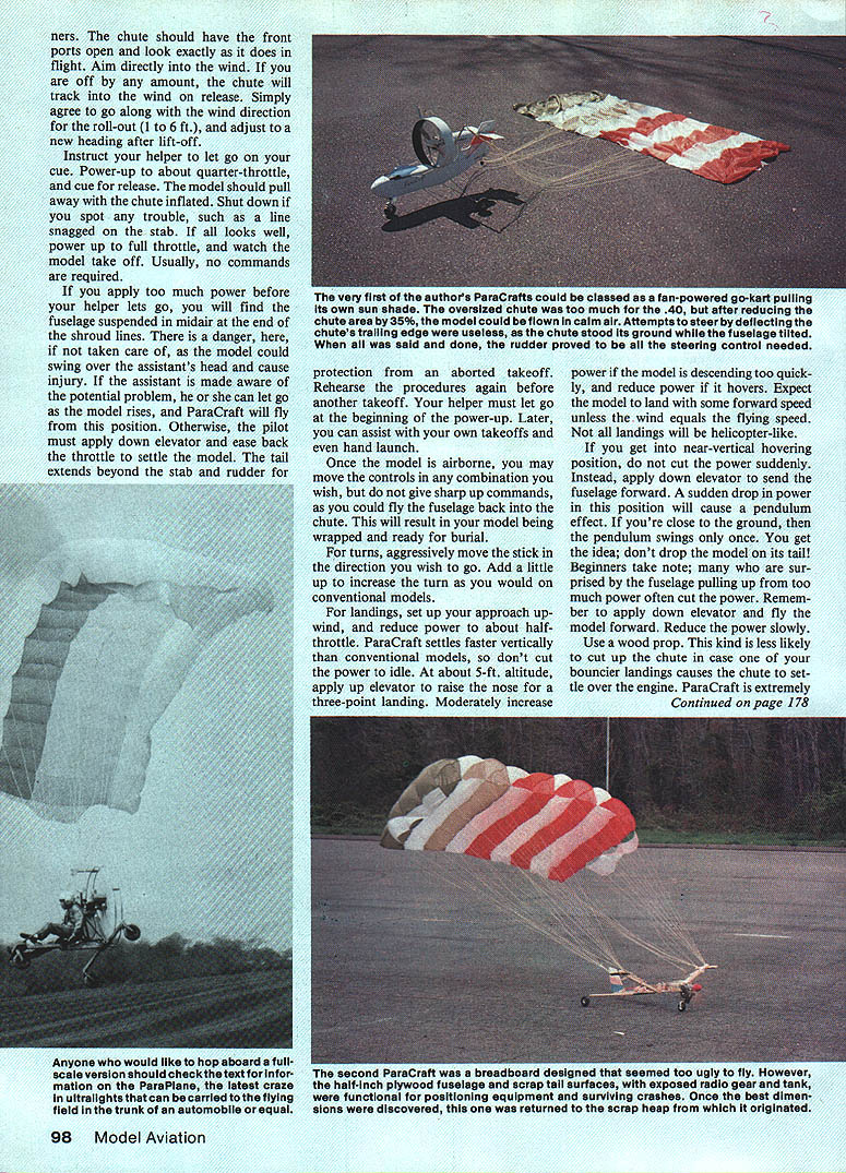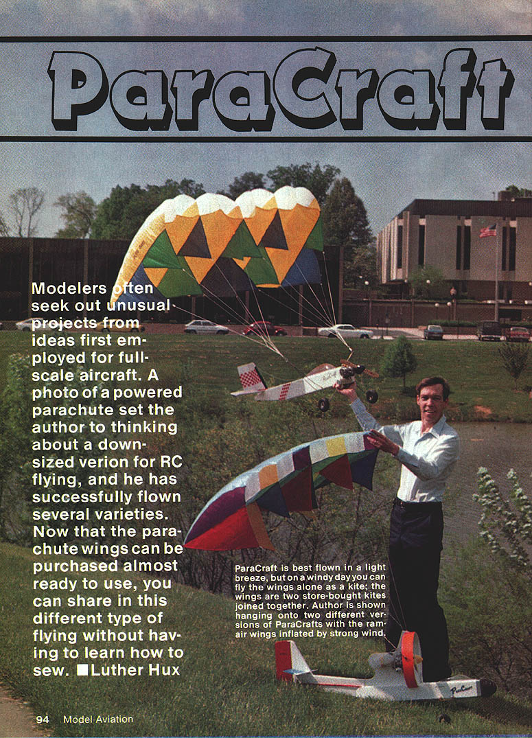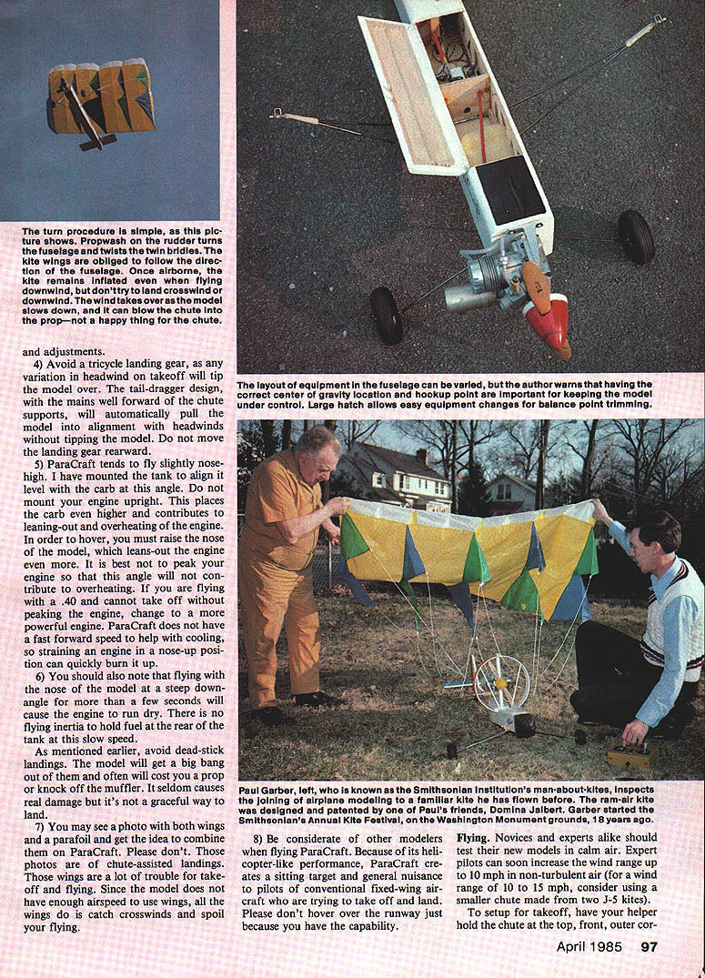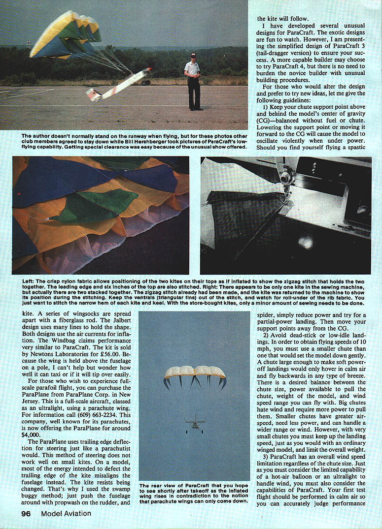 NO OCR TEXT DEVELOPING NEW ACTS model show team purposes requires eye interesting unexpected items fly different view things has led designers create models such fly ing lawn mower flying hamburger photo full-scale powered parachute presented Mechanix Illust rated saw opportunity something unusual fly shows aerodynamically feasible Its certain ly difficult getting hamburg er fly background sewing found could produce fabric wings lot challenge certainly something could recom mend everyone try after found way use store-bought parafoil kites project became feasible builders expertise wood metal As novice kites endured trial-and-error flights September 1980 Model Aviation story Para Craft closed story saying much experimentation left time article readers hands sure chute over size too much strain engine After cutting off 30% chute model flew graceful 10mph much easier control larg er chute caused model just hover Responses article showed individuals corpora tions involved both RPV full-scale development powered parachutes As learned about parafoils found original parafoil kite designed Domina Jalbert 1967 design later adapted ram-air para chutes sky divers Since powered full-scale designs used parachute made sense models use smaller kites problem readymade kites design ratio chord greater span Also kite three rows ventrals sub-fins difficult rig two sup port points solution came simple attach two chutes sideby-side created wing-like ratio span chord also provided two chute attachment points ready hookup ParaCraft After describing idea owner Kite Site provided two kites try out 10 minutes sim ple sewing join chutes new wing ready check out ParaCraft 3 flew right off drawing board model suitable sharing others Another development fabric-wing models has come attention British-sold Windbag RC model based kite called Flexifoil appears similar Jalbert kite use except two lines Left authors wife Dawn demonstrates perfect launch procedure Luther behind chute commands radio waits fabric wings rise older version wing proved too large 80 engine pull efficiency Right few seconds after release assistant fabric wing moves ahead begins lift models fuselage tail surfaces Above smaller kite wings easier launch pilot alone holding kite transmitter Increasing throttle challenge helper holding kite top outer corners throttle up easiest way sure helper knows let go fuselage could takeoff loop over wing him Right store-bought kite wings small enough allow slow forward speed instead just hovering test models often did light breeze ground speed drops can walk alongside model set up landing Its different kind flying kite will follow have developed several unusual designs ParaCraft exotic designs fun watch However am present ing simplified design ParaCraft 3 tail-dragger version ensure suc cess capable builder may choose try ParaCraft 4 no need burden novice builder unusual building procedures would alter design prefer try new ideas let give following guidelines 1 Keep chute support point above behind models center gravity CGbalanced fuel chute Lowering support point moving forward CG will cause model oscillate violently under power Should find yourself flying spastic Left crisp nylon fabric allows positioning two kites tops Inflated show zigzag stitch holds two together leading edge six inches top also stitched Right appears kite sewing machine actually two stacked together zigzag stitch already made kite returned machine show its position during stitching Keep ventrals trianguiar fins out stitch watch roil-under rib fabric lust want stitch narrow hem kite keel store-bought kites minor amount sewing needs done kite series wingsocks spread apart fiberglass rod Jalbert design uses lines hold shape Both designs use air currents infla tion Windbag claims performance very similar ParaCraft kit sold Newtons Laboratories 5600 cause wing held above fuselage pole cant help wonder well can taxi will tip over easily wish experience fullscale parafoil flight can purchase ParaPlane ParaPlane Corp New Jersey full-scale aircraft classed ultralight using parachute wing information call 609 663-2234 company well known its parachutes now offering ParaPlane around $4000 ParaPlane uses trailing edge deflec tion steering just like parachutist would method steering does work well small kites model energy intended defect trailing edge kite misaligus fuselage instead kite resists being changed Thats used swamp buggy method just push fuselage around propwash rudder spider simply reduce power try partial-power landing move support points away CG 2 Avoid dead-stick low-idle land ings order obtain flying speeds 10 mph must use smaller chute would set model down gently chute large enough make soft poweroff landings would hover calm air fly backwards type breeze desired balance between chute size power available pull chute weight model wind speed range can fly Big chutes hate wind require power pull Smaller chutes have greater air speed need less power can handle wider range wind However very small chutes must keep up landing speed just would ordinary winged model limit overall weight 3 ParaCraft has overall wind speed limitation regardless chute size Just must consider limited capability hot-air balloon ultralight handle wind must also consider capabilities ParaCraft first test flight should performed calm air can accurately judge performance 96 Model Aviation author doesnt normally stand runway flying photos other club members agreed stay down Bill Hershberger took pictures ParsCrafts lowflyIng capability GettIng speclsi ciesrance easy because unusual show offered rear view PareCraft hope see shortly after takeoff inflated wing rises contradiction notion parachute wings can come down adjustments 4 Avoid tricycle landing gear variation headwind takeoff will tip model over tail-dragger design mains well forward chute supports will automatically pull model alignment headwinds tipping model move landing gear rearward 5 ParaCraft tends fly slightly