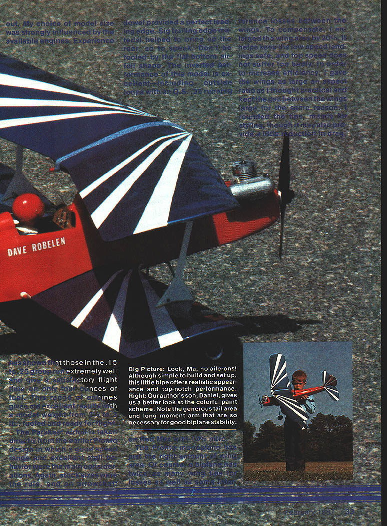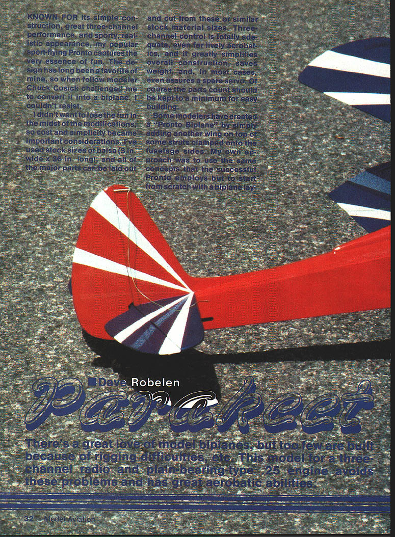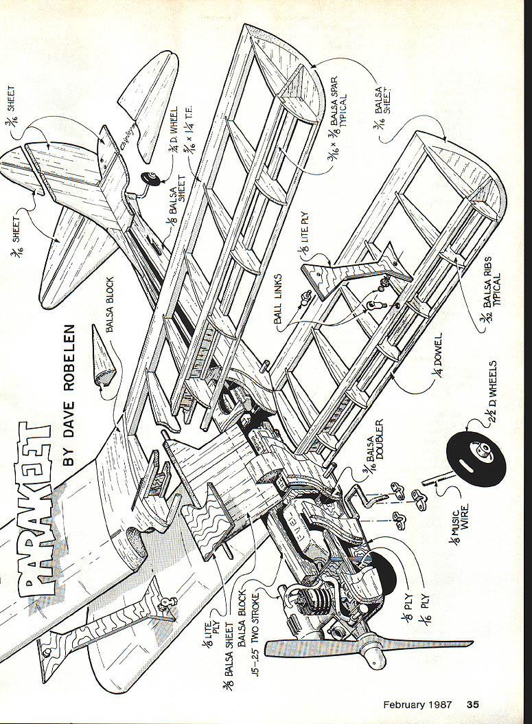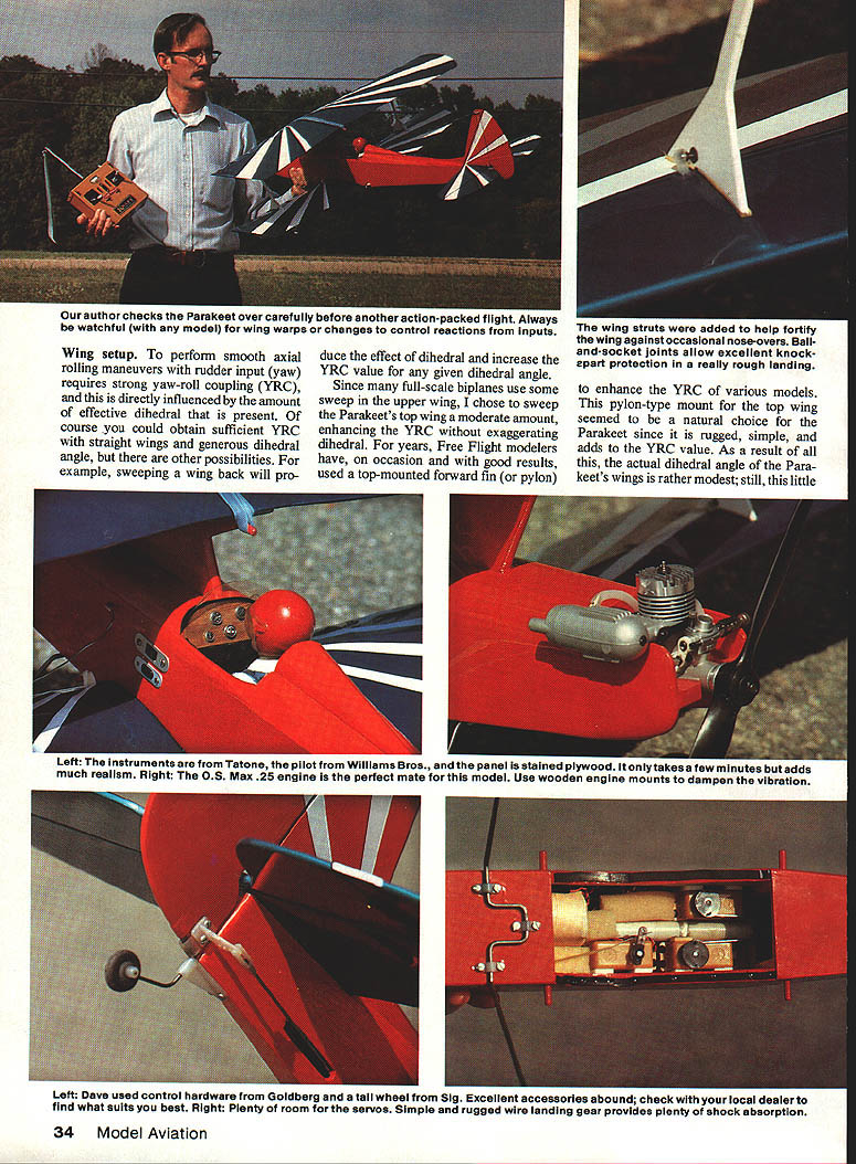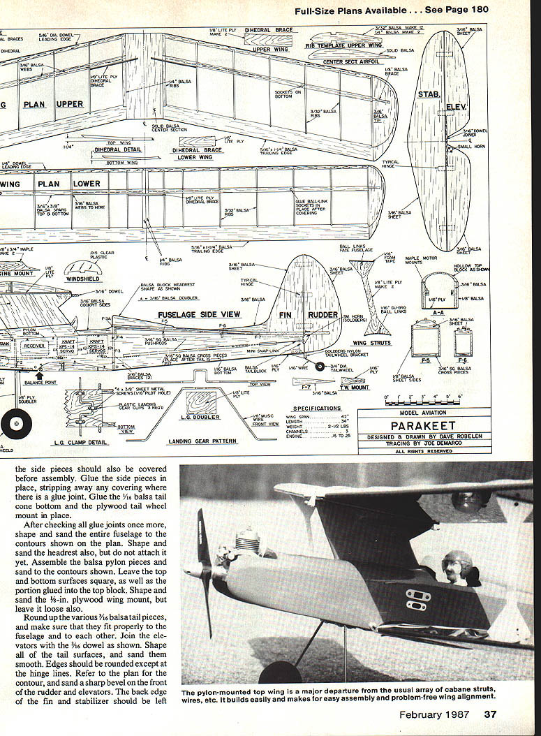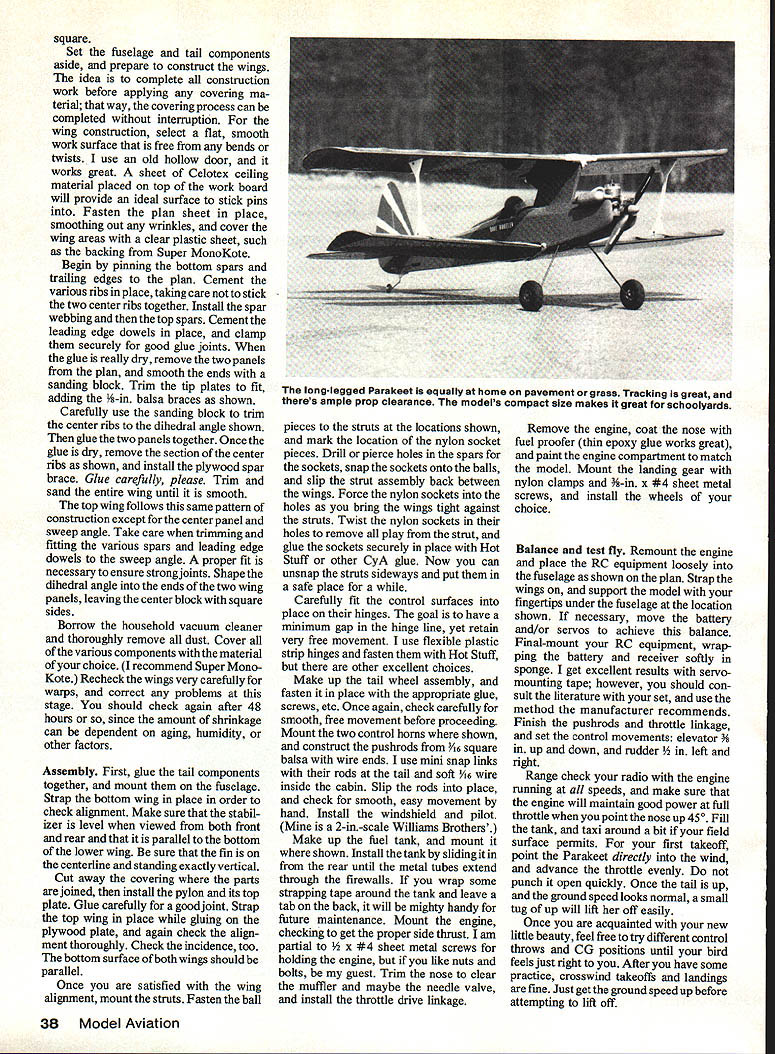 NO OCR TEXT NO OCR TEXT author checks Parakeet over carefully before another action-packed flight Always watchful model wing warps changes control reactions inputs Wing setup perform smooth axial rolling maneuvers rudder input yaw requires strong yaw-roll coupling YRC directly influenced amount effective dihedral present course could obtain sufficient YRC straight wings generous dihedral angle other possibilities example sweeping wing back will produce effect dihedral increase YRC value given dihedral angle Since full-scale biplanes use some sweep upper wing chose sweep Parakeets top wing moderate amount enhancing YRC exaggerating dihedral years Free Flight modelers have occasion good results used top-mounted forward fin pylon wing struts added help fortify wing against occasional nose-overs Balland-socket joints allow excellent knockapart protection really rough landing enhance YRC various models pylon-type mount top wing seemed natural choice Parakeet since rugged simple adds YRC value As result actual dihedral angle Para keets wings rather modest still little Left The instruments Tatone pilot Williams Bros pane sranea piywooa takes few minutes adds much realism Right 08 Max 25 engine perfect mate model Use wooden engine mounts dampen vibration Left Dave used control hardware Goldberg tail wheel sig Excellent accessories abound check local dealer find what suits best Right Plenty room servos Simple rugged wire landing gear provides plenty shock absorption 34 Model Aviation E ROBELEN jYDA BALSA 4 yLITE PLY 9 5ALSASHEEJ BALSA BLOCK 15-25 TWO STROKE K -PLY 4gPLY 7 \ A DOUbLER AL5AXDWHEEL 77 7 BALL LINKS7 [ITEPLYC 46x A SPAR TYPICAL DOWEL BALSA RIBS 4DWHEELS JYPICAL MUSIc WIRE C bird has tremendous roll response just rudder control no interplane struts early models after seasons flying began notice some chronic problems biggest nuisance keeping top wing tightly clamped place during roll maneuvers wanted tilt roll too occasional top wing spar would crack violent nose-over landing order minimize drag hadnt used struts first place drag penalty turned out small comparatively added struts Refer plan novel hassle-free method mounting Having settled wing system decided use fuselage tail design patterned generally after home-built single-seat EAA-type biplanes addition followed design concept earlier Pronto model whenever suitable stuck stock 3-in-wide woodless expen sive readily available selected tail-dragger landing gear setup since nose wheel biplane would look just plain ridiculous Equally important tail-dragger model can op erate out small bumpy fields problems nose wheel drags grass gets knocked out alignment adds needless weight Thats right Im prejudiced rate Vs-in wire landing gear has proven have excellent tracking takeoff no ground loops reasonably low weight superior re sistance damage wheel position shown plans good average both smooth grass paved runways fly off really bumpy strips thick grass just bend wheels forward about inch get the Parakeet need consider own flying pref erences before choosing engine example strong 15 Enya 15 IV completely adequate normal flying moderate maneuvering pilot wants really strong aerobatics capability 25-size engine good choice recommend FSR-type engines Parakeet engines get best results Master Airscrew 9-4 Whatever flying style pref erence start modest control move ments rudder right elevator own Use balance location shown plans good starting point Most hotdog pilots will want use control movement youll probably move balance point rearward enhance snap roll ma neuvers changes should made tried out time using ample altitude about two mistakes high during check flights Construction notes approach building Parakeet round up necessary materials make kit prepared parts before beginning assem builders have excellent results using thick cyanoacrylate CyA glues exclusively have concerns about strength would recommend Sig Epoxy something similar engine mounts wing center joints Sig Contact Cement good choice fuselage doublers prefer use thick CyA following construction sequence has established facilitate rapid assem bly Parakeet kit Starting fuselage laminate /I6 doublers sides making sure end up left right assembly Lightly score inside sides just aft doublers will help bend later Place right fuselage side over plan side view mark location cross braces engine mounts formers F-i through F-6 Carefully transfer marks inside left fuselage side right fuselage side flat work surface cement F-i F-2 F-3 place checking square alignment before continuing Add left side again carefully check alignment before pro ceeding Cement engine mounts place suitable glue doubt use epoxy Bend fuselage sides together 5 RISNTMAPLK ThRUSTMOTOR MOJTS II II III III ir III/ J us fi II DOWEL 3/I6II4 II Ii II iiII Ii II II I/I6 BALSA COCKPIT FLOOR 3/I6 DOWEL I/B BALSA SHEET SIDES 3/16 BALSA STRINGERS DSRSAL-. 7 TOP VIEW 44 WING ASSEMBI ASSAMALE WNG IWNELS 2 SAND DIHEDRAL ANGLE 3 ALOE ANNELS TOSETHE 4 REMOVE SECTION OF IA DRACES JAOUNT EBARLE BETh 4I/2 SHEET METAL SEDEWS -1/16 PILOT HOCKS OW LITE PLY /wING PLAT FORM SANG TO ThIS LINE SAND EDGE AS SEH3WN I/B BALSA BRACE~ GB BALSA____ BRACE 3/16 BALSA TIP SANS TO THIS LINE DR F-A RIB TEMPtATE LC WING 3/32 BALSA MAKE 12 I/4 BALSA 2 3/I6 DOWEL ENTA I93/BBA ENGINESHEET AWLITE PLY3/B 55 BALSA PAIRING -4PRDR F-K PUSI-IROOS3 SOWNTHRLISTIS SAG SO STR NGERS BALSA BALSS DES tail lightly glue Check alignment placing assembly over top view satisfied order add tapered tail block F-7 horizontal former /s6 square cross braces Install triangular braces behind F-3 thoroughly cement scored areas restore strength Glue tail cone formers add top stringers shown plan Glue F-3A bulk head place add 46 balsa cockpit floor Glue landing gear doubler place also VIE plywood nose bot tom Add extra glue fillets around landing gear doubler engine mounts needed Shape outside top block confirm t balsa pylon will fit correctly Hollow out inside top block fuel tank clearance l