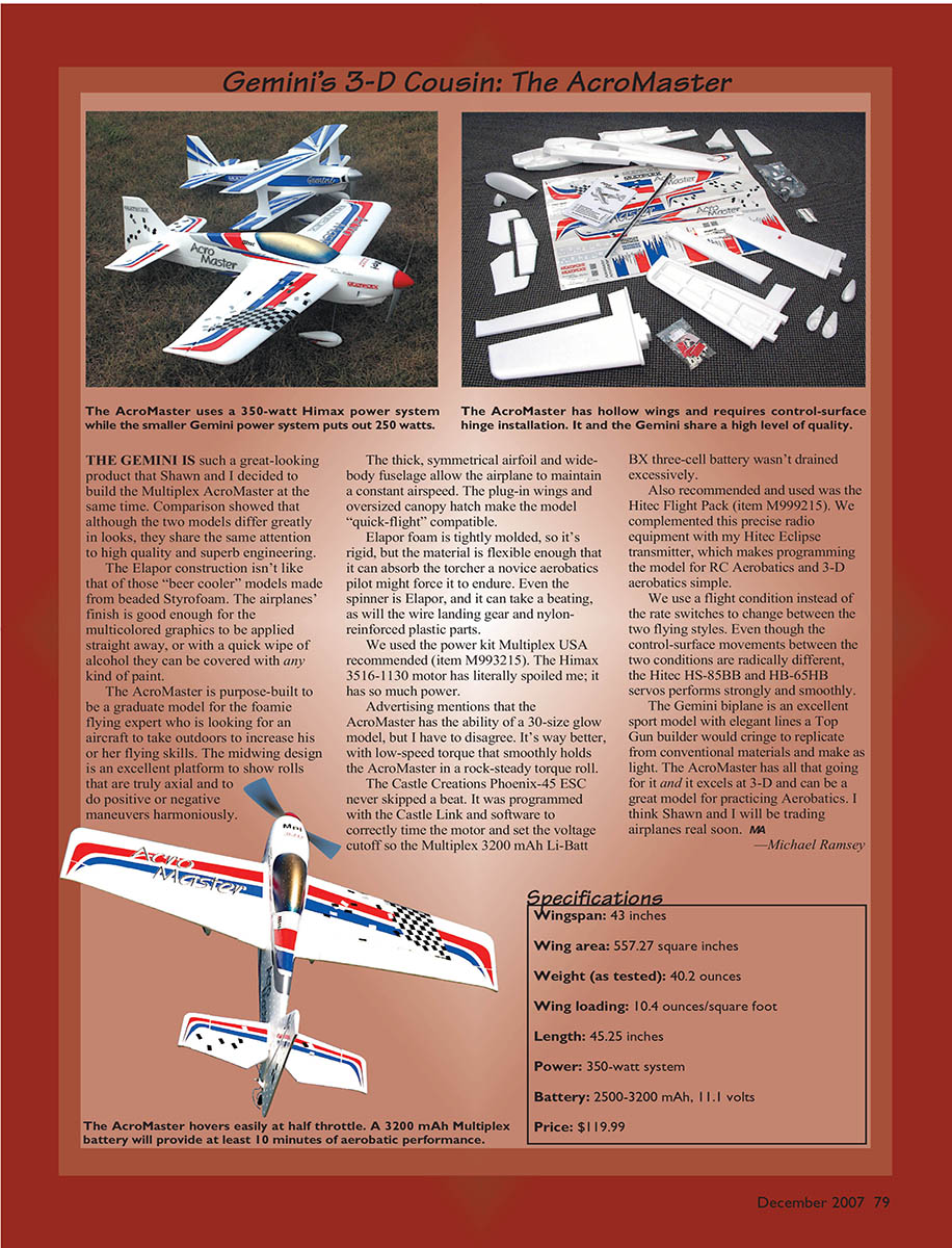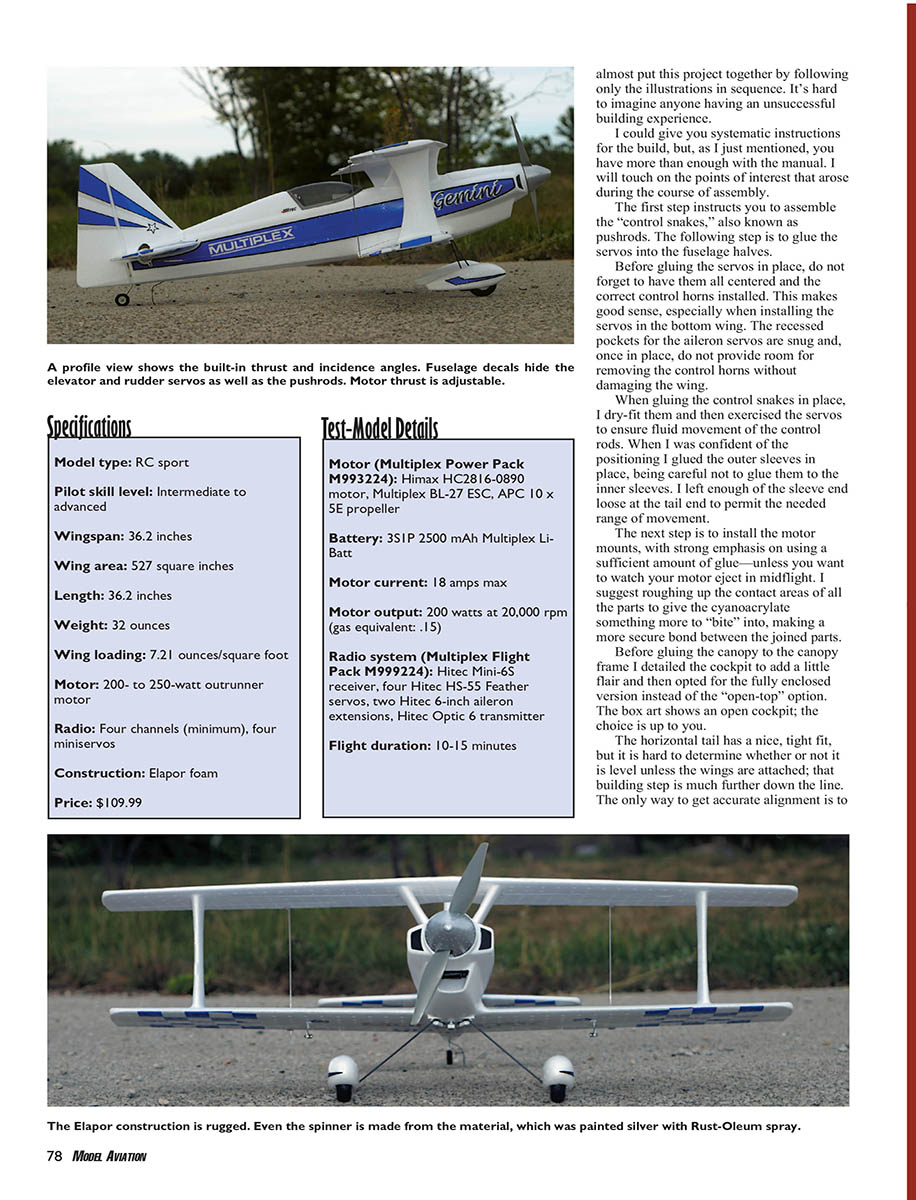 The Gemini is capable of sport and precision aerobatics with the recommended Himax