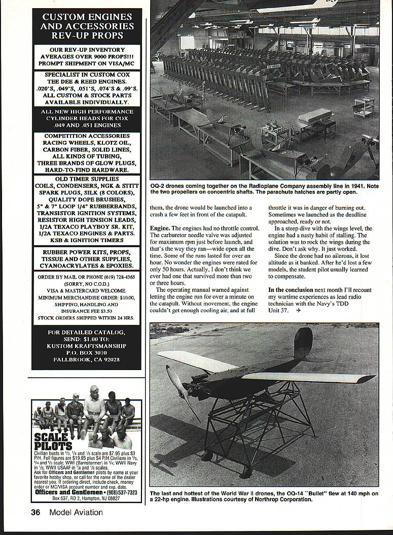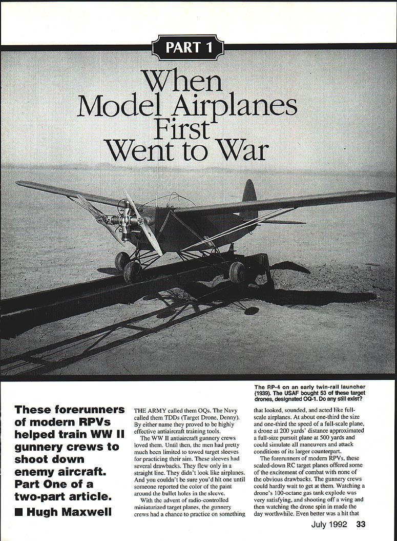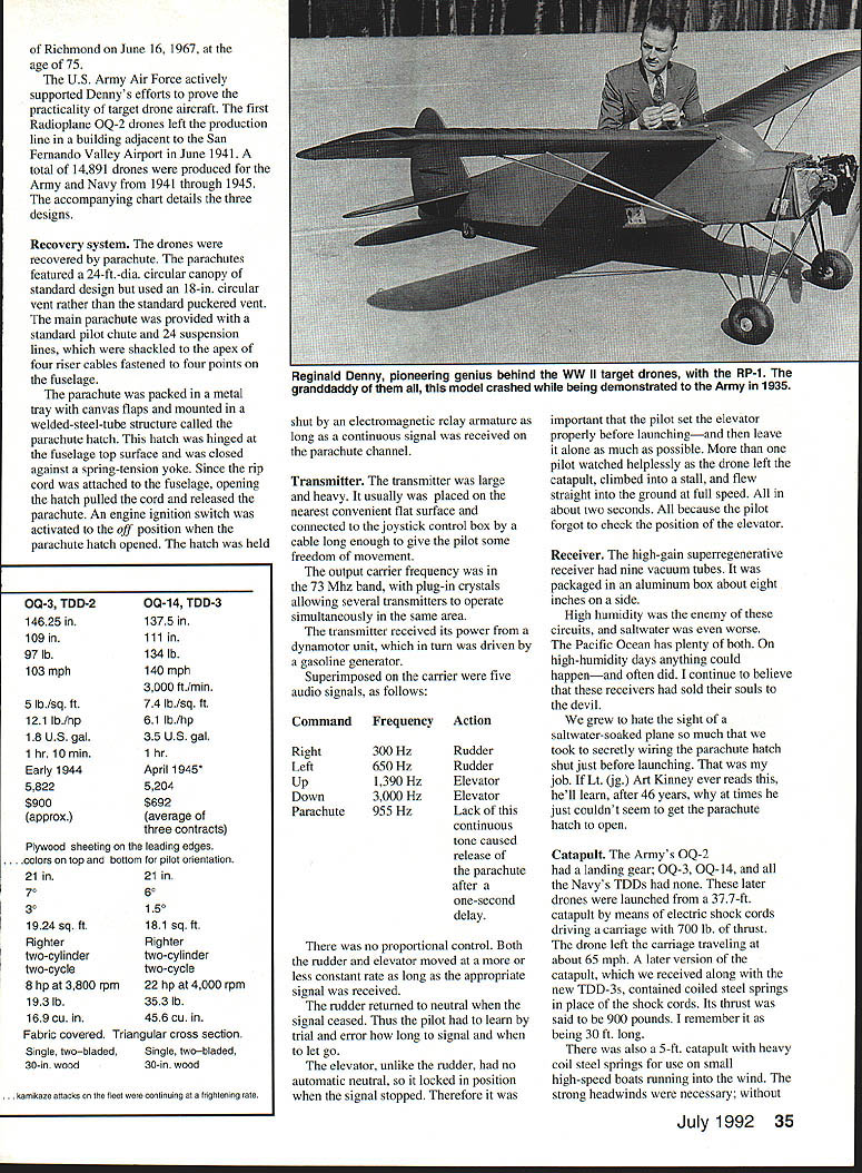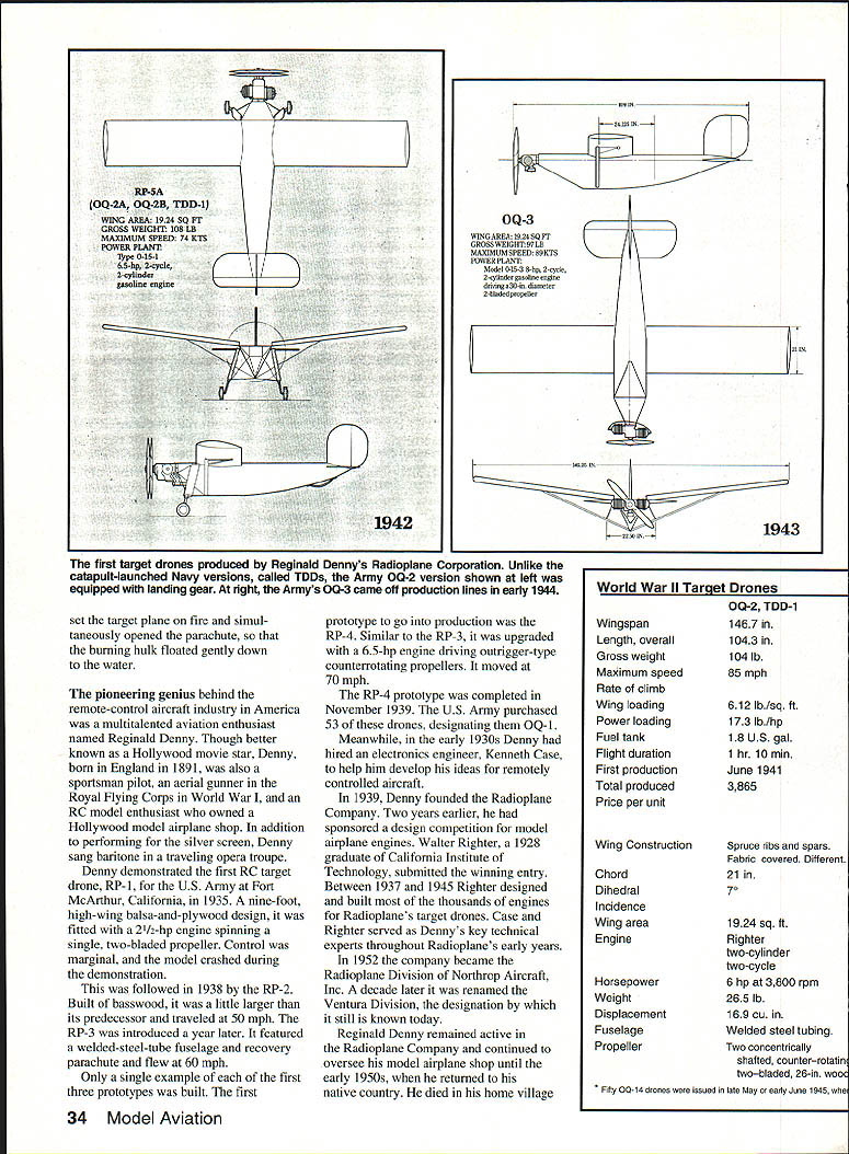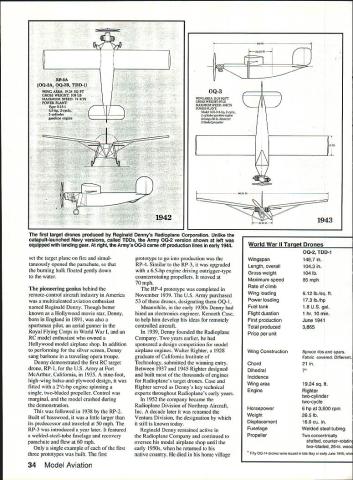 These forerunners modern RPVs helped train WW II gunnery crews shoot down enemy aircraft Part twopart article U Hugh Maxwell THE ARMY called OQs Navy called TDDs Target Drone Denny either name proved highly effective antiaircraft training tools WW II antiaircraft gunnery crews loved Until men pretty much limited towed target sleeves practicing aim sleeves several drawbacks flew straight line didnt look like airplanes couldnt sure youd hit until someone reported color paint around bullet holes sleeve advent radio-controlled miniaturized target planes gunnery crews chance practice something RP-4 early twin-rail launcher 1939 USAF bought 53 target drones designated 00-1 still exist looked sounded acted like fullscale airplanes about one-third size one-third speed full-scale plane drone 200 yards distance approximated full-size pursuit plane 500 yards could simulate maneuvers attack conditions its larger counterpart forerunners modem RPVs scaled-down RC target planes offered some excitement combat obvious drawbacks gunnery crews could hardly wait get Watching drones 100-octane gas tank explode very satisfying shooting off wing watching drone spin made day worthwhile better hit July 1992 33 U RP-5A OQ-ZA OQ-ZB TDD-1 WING AREA 1924 SQ FT GROSS WEIGHT 108 LB MAXIMUM SPEED 74 ETS POWER PLANT Tppe 0-151 65-hp 2-cycle 2-cylinder gasoline engine 1942 first target drones produced Reginald Dennys Radioplane Corporation Unlike catapult-launched Navy versions called TDDs Army 00-2 version shown left equipped landing gear right Armys 00-3 came off production lines early 1944 Set target plane fire simul taneously opened parachute burning hulk floated gently down water pioneering genius behind remote-control aircraft industry America multitalented aviation enthusiast named Reginald Denny Though better known Hollywood movie star Denny born England 1891 also sportsman pilot aerial gunner Royal Flying Corps World War RC model enthusiast owned Hollywood model airplane shop addition performing silver screen Denny sang baritone traveling opera troupe Denny demonstrated first RC target drone RP-l US Army Fort McArthur California 1935 nine-foot high-wing balsa-and-plywood design fitted 2/2-hp engine spinning single two-bladed propeller Control marginal model crashed during demonstration followed 1938 RP-2 Built basswood little larger its predecessor traveled 50 mph RP-3 introduced year later featured welded-steel-tube fuselage recovery parachute flew 60 mph Only single example of first three prototypes built first prototype go production RP-4 Similar RP-3 upgraded 65-hp engine driving outrigger-type counterrotating propellers moved 70 mph RP-4 prototype completed November 1939 US Army purchased 53 drones designating OQ- 1 Meanwhile early 1930s Denny hired electronics engineer Kenneth Case help him develop ideas remotely controlled aircraft 1939 Denny founded Radioplane Company Two years earlier sponsored design competition model airplane engines Walter Righter 1928 graduate California Institute Technology submitted winning entry Between 1937 1945 Righter designed built thousands engines Radioplanes target drones Case Righter served Dennys key technical experts throughout Radioplanes early years 1952 company became Radioplane Division Northrop Aircraft Inc decade later renamed Ventura Division designation still known today Reginald Denny remained active Radioplane Company continued oversee model airplane shop until early 1950s returned native country died home village 34 Model Aviation OQ-3 WING AEEA 1924 SQIT GROSS WEIGHT 97L5 MAXIMUM SPEED 89KTh POWER PLANT Model 0-15-3 S-hp 2-cycle 2-cylinder gasoline engine deivinga 30-in doneter 2-bladed propeller oc5 22501541943 World War II T Wingspan Length overall Gross weight Maximum speed Rate climb Wing loading Power loading Fuel tank Flight duration First production Total produced Price per unit Wing Construction Chord Dihedral Incidence Wing area Engine Horsepower Weight Displacement Fuselage Propeller araet Drones 00-2 TDD-1 1467 1043 104 lb 85 mph 612 lb/sq ft 173 lb/hp 18 US gal 1 hr 10 mm June 1941 3865 Spruce ribs spars Fabric covered Ditferen 21 70 1924 sq ft Righter two-cylinder two-cycle 6 hp 3800 rpm 265 lb 169 cu Welded steel tubing Two concentrically shafted counterrotati twobladed 26-in wol Fifty 00-14 dronno osned io late May early J009 1945 wI Richmond June 16 1967 age of75 US Army Air Force actively supported Dennys efforts prove practicality target drone aircraft first Radioplane OQ-2 drones left production line building adjacent San Fernando Valley Airport June 1941 total 14891 drones produced Army Navy 1941 through 1945 accompanying chart details three designs Recovery system drones recovered parachute parachutes featured 24-ft-dia circular canopy standard design used 18-in circular vent rater standard puckered vent main parachute provided standard pilot chute 24 suspension lines shackled apex four riser cables fastened four points fuselage parachute packed metal tray canvas flaps mounted welded-steel-tube structure called parachute hatch hatch hinged fuselage top surface closed against spring-tension yoke Since rip cord attached fuselage opening hatch pulled cord released parachute An engine ignition switch activated off position parachute hatch opened hatch held 00-3 TDD-2 14625 109 97 lb 103 mph 5 lb/sq ft 121 lbihp 18 US gal 1 hr 10 mm Early 1944 5822 $900 approx 00-14 TDD-3 1375 111 134 lb 140 mph 3000 It/mm 74 lb/sq ft 61 lb/hp 35 US gal 1 hr April 1945* 5204 $692 average three contracts Plywood sheeting leading edges . colors top bottom pilot orientation 21 in21 60 150 181 sq ft Righter two-cylinder two-cycle 22 hp 4000 rpm 1924 sq ft Righter two-cylinder two-cycle 8 hp 3800 rpm 193 lb353 lb 169 cu in456 cu Fabric covered Triangular cross section Single twobladed 30-in wood Single twobladed 30-in wood . kamikaze attacks fleet continuing frightening rate shut electromagnetic relay armature long continuous signal received parachute channel Tran
