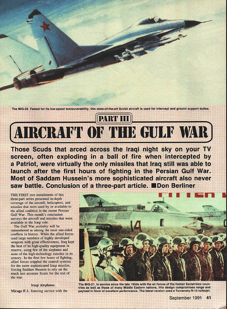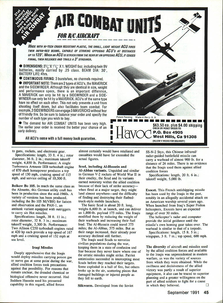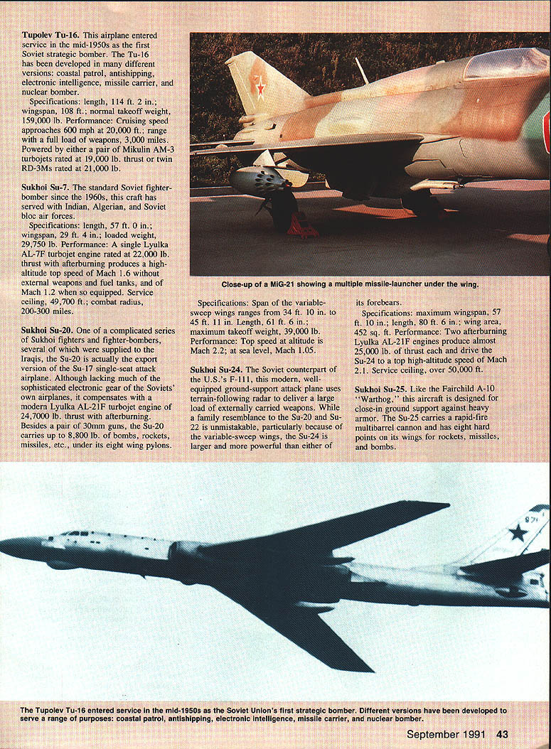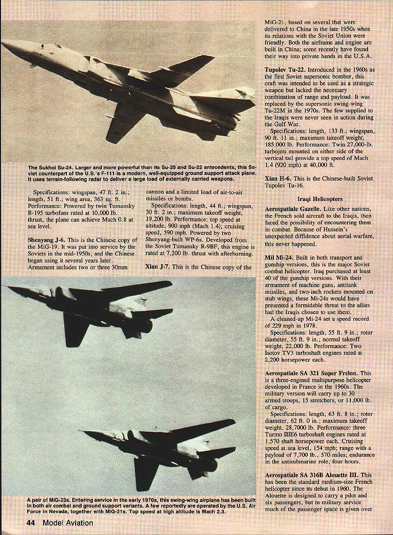 Mirage F ed Its lo oft wei enteo m aft heli d ie recci S CO missues will mo r rnghly ue effectivenes5 -quality equip aimlan logy hours control Iraqi of-the-mr e ce sir ian ground suppc lie 41 re cost range includes twin-barrel 23mm underwing pylons el tanks ns length 44 ft 2 ft 6 maximum takeoff lb Performance latest powered Tumansky R-13 14500 lb thrust giving top speed high altitude Mach 11 wing-wing airplane built ground support -23 first entered service us Several thousand have few reportedly operated r Force along types Nevada former Warsaw Pact countries well least dozen other air forces Specifications Wingspan varies 26 ft 10 46 ft 9 length 55 ft 2 maximum takeoff weight 33000 lb Performance Tumansky R-29 turbojet rated 27500 lb thrust afterburaing giving top speed Mach 23 high altitude Mach 11 down low MiG-25 extremely fast high-altitude interceptor developed counter American B-70 Valkyrie Mach-3 bomber turned out never went production Modified versions have set amazing speed records operational fighter will hit Mach 32 reportedly wrecks engine hence reserved dire emergencies Armament includes radar-guided infrared homing missiles Specifications reconnaissance version length 78 ft 2 wingspan 44 ft loaded weight 73500 lb Performance two Tumansky R-3 1 turbojet engines rated 24250 lb thrust MiG-29 An up-to-date airplane used intercept ground support duties MiG-29 famed its low-speed maneuverability carries 30mm multibarrel cannon air-to-air missiles Specifications wingspan 37 ft 9 ip length 56 ft 8 maximum takeoff weight 39000 lb Range under ideal conditions 1300 miles service ceiling 56000 ft Performance two Tumansky RD-33 turbofans 18300 lb thrust MiG-29 can reach Mach 23 high altitude 11-76 standard Soviet cargo jet used Aeroflot well air force has modified form airborne command control center AWACS Rather risk losing such expensive equipment allied coalition forces Iraqis chose fly Iran safekeeping during war Specifications cargo plane length 152 ft 3 wingspan 165 ft 8 wing area 3229 sq ft Performance Four Soloviev D-30 turbofans rated 26500 lb thrust provide cruising speed 500-plus mph 3100-mile range normal cruising altitude 40000 ft Pilatus PC-6 Turbo-Porter widely used Swiss-built utility transport plaPe can play variety rolesin reconnaissance supply drops search-and-rescue ambulance whisk VIPs away danger areas Specifications length 35 ft 9 wingspan 49 ft 8 gross weight 6100 lb Performance Pratt & Whitney Canada PT6A turboprop engine rated 550 shaft horsepower Top speed moderate 175 mph aircraft can take off full load sea level just 360 feet An extremely last high-altitude Interceptor MIG25 Soviets answer Amer 1cm 9-70 Vaikyrie Mach-S bomber never went production pair Tuman sky R41 turbojets rated 24250 lb thrust operational fighter can reach Mach 32 med close-in ground support tibarrel cannon has eight hard Tumanaky R-195 turbofan * * Tupolev Tu-16 entered service mld-1950s Soviet Unions first strategic bomber Different versions have developed serve range purposes coastal patrol antishipping electronic intelligence missile carrier nuclear bomber September 1991 43 se the air some Tu-22 Intr oviet supen intended lacked ion range supers ie 1970s iii re never seen Su-24 Larger merpart US erraln-followlng ra ~ations wingspan ft wing area Powered roorans rated U e plane can achiev J-6 This 9 put i mid-1950s ing several year includes two Su-22 antec ground supp aNy carried WE mited load ibs th 44 LX mum take rmance h Mach Powered b WP-6s De ansky lb thrust i Chines4 length 133 ft simum takeoff rrormance Twin ted either vide top spo 40000 ft is Chinese fraqi Helicopter Like aircraft bilitv of encountei Husseins aence about aeri ened silt both tran ins r er Iraq purh p versions Lachine guns so-inch rockets Se Mi-24s woul midable threat chosen use p Mi-24 set n 1978 ns length 55 ft 9 lb Pei oshaft sepower le SA 321 ned mu France ersion will can ps 15 stretcher cations length 63 ft 62 ft 0 msv 287000 lb Perf 111E6 turbo ft hors ea levt 7700 ubmarine 1 AIR COMBAT UNITS FOR R/CAIRCRAFf MADE WITH HI-TECH CRASH RESISTANT PLASTIC THE SMALL LIGHT WEIGHT ACU FIRES TWIN INFRA-RED BEAMS CAPABLE OF STRIKING OPPOSING CUS AT DISTANCES UP TO 120 WHEN ANACU IS STRuCK FROM THE REARBYAN OPPOSING ACUIT CEASES FIRING THEN RELEASES AND TRAILS 3 STREAMER DIMENSIONS 31/ X11/ Xl WEIGHT 6oz including twin 9V batteries easily c2arriec 25 class BEAM DIA 30 BATTERY LIFE 4hrs CONTINUOUS FIRING 3 bursts/sec no channels required IMPORTANT NOTE 2 types ACUs MAVERICK SIDEWINDER Although identical size weight performance specs important difference MAVERICK can hit SIDEWINDER SIDEWINDER can hit MAVERICK ACUs same type have no effect other prevents unit shooting itself down also facilitates team combat example 3 SIDEWINDERS can engage 3 MAVERICKS fear friendly fire So sure balance order specify number type wish buy demand AIR COMBAT UNITS has very high earlier order received better chance early delivery ACUs come full money back guarantee to guns rockets electronic gear Specifications length 33 ft 4 rotor diameter 36 ft 2 maximum takeoff weight 4850 lb Performance single Turbomeca Artouste IIIB turboshaft engine 870 shaft horsepower produces top speed 130 mph cruising speed 115 mph service ceiling 10500 ft Bolkow Bo 105 much same class Alouette German utility craft has production since mid-1960s variety versions has produced including Bo 105 MVBH liaison observation PAH- 1 antitank variant equipped outriggers carry six Hot missiles Specifications length 38 ft 11 rotor diameter 32 ft 3 maximum takeoff weight 5300 lb Performance Two Allison C250 turboshaft engines rated 420 hp provide top speed 167 mph cruising speed 152 mph sea level Iraqi Missiles Deeply apprehensive Iraqis would deploy missiles carrying poison gas nerve gas some point during war allied coalition forces took precautions against possibility reasons remain unclear dreaded chemical biological offensive never occurred Saddam Hussein used presumed capabi
