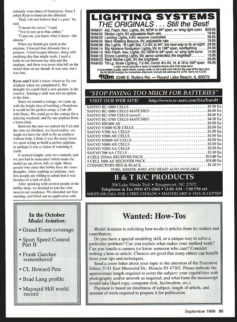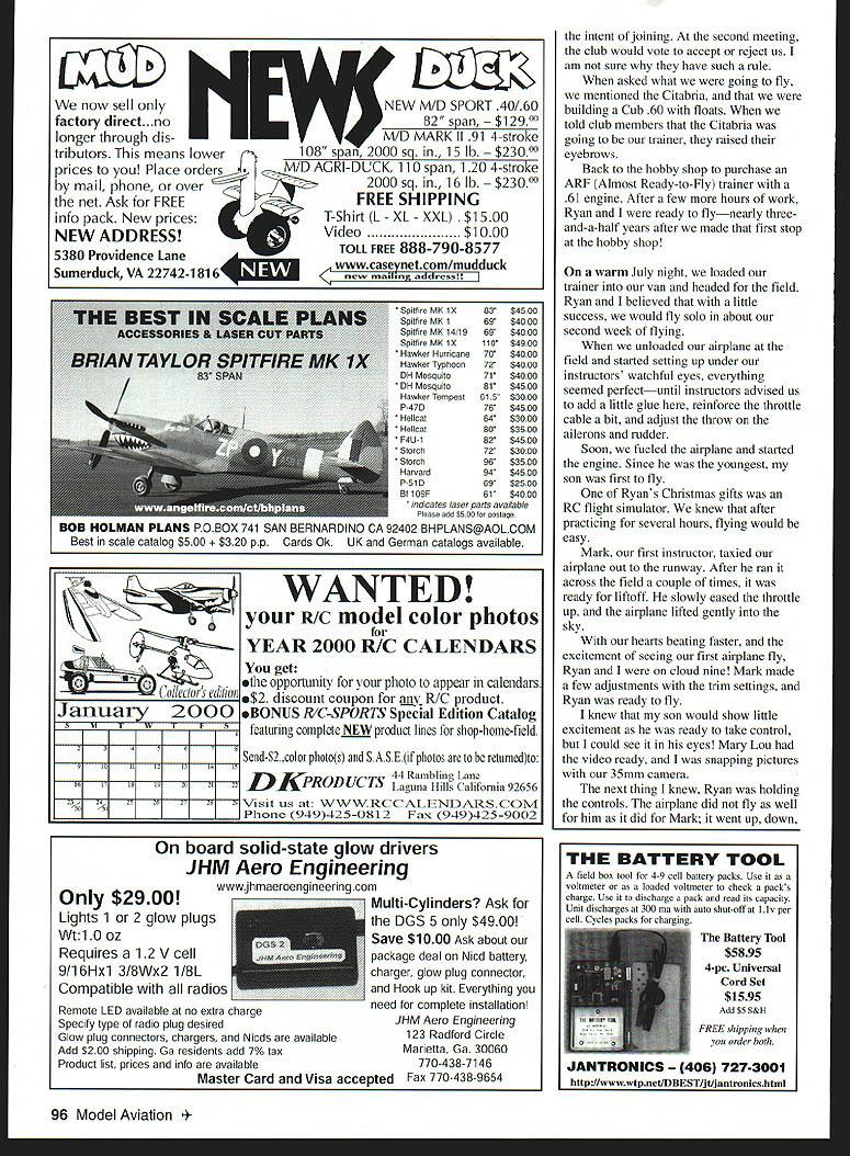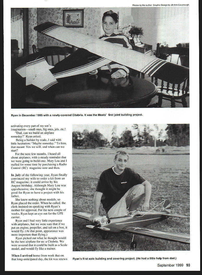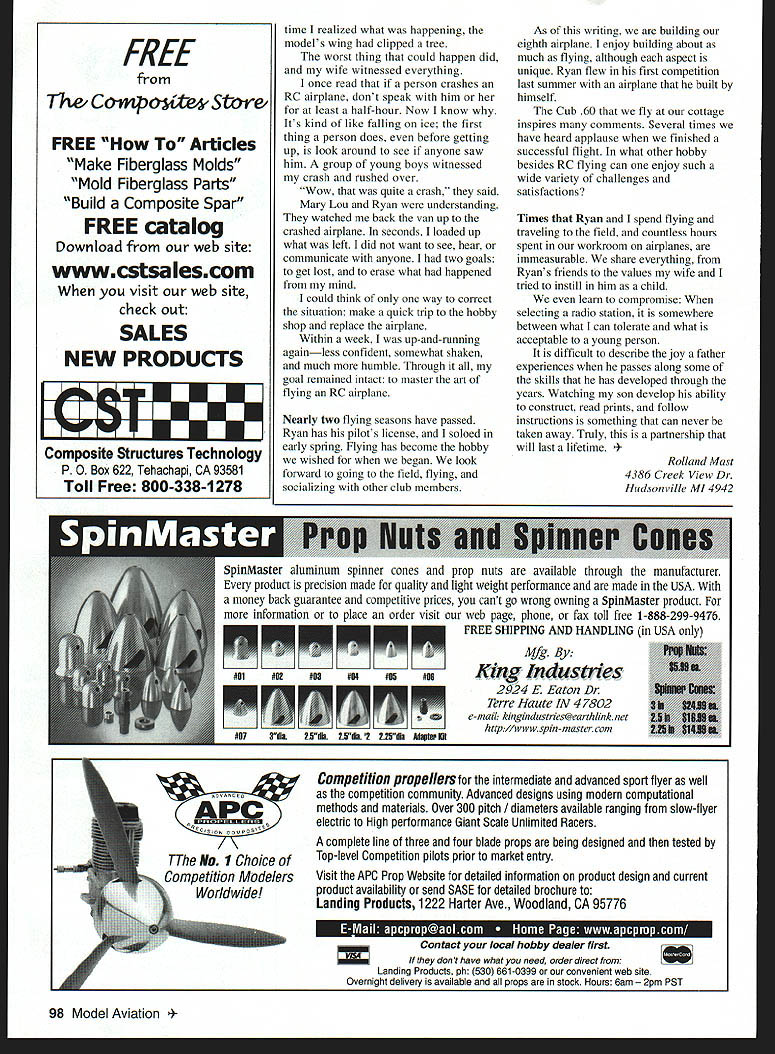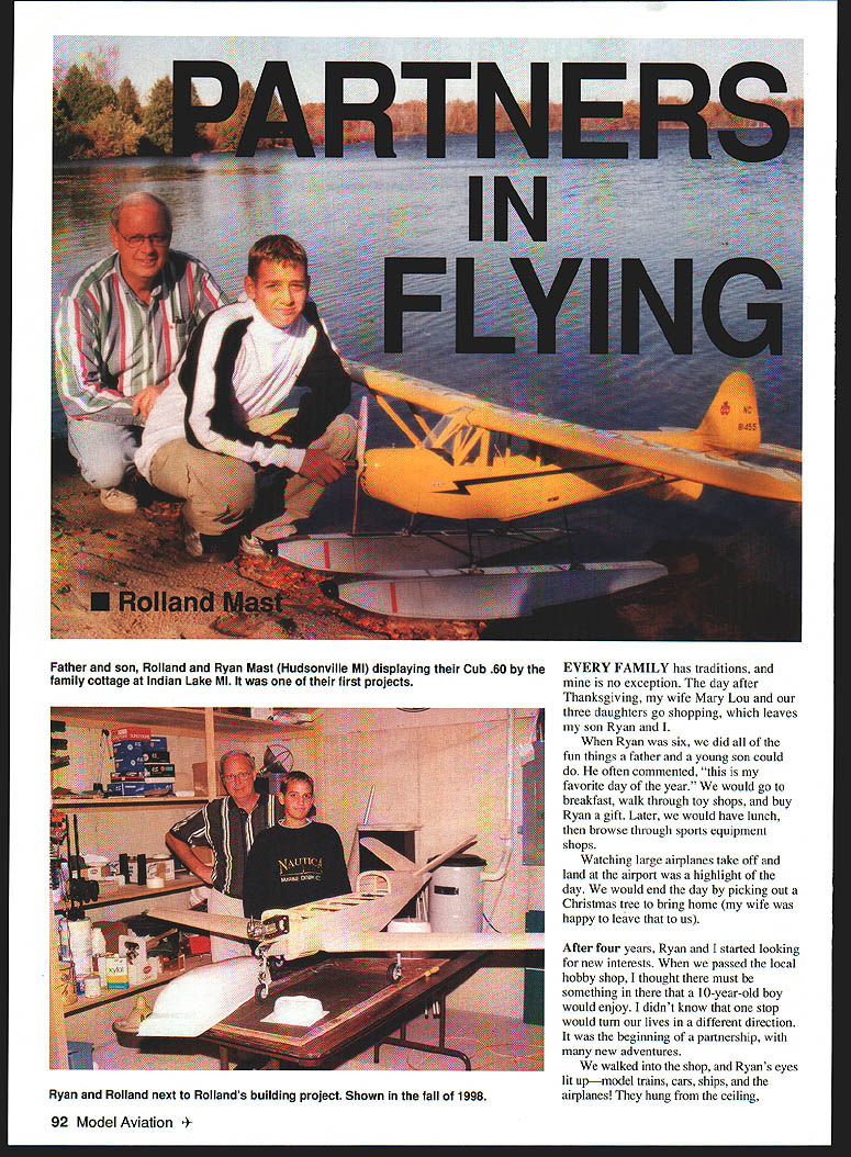 EVERY FAMILY has traditions no exception day after Thanksgiving wife Mary Lou three daughters go shopping leaves son Ryan Ryan six did fun things father young son could often commented favorite day year would go breakfast walk through toy shops buy Ryan gift Later would have lunch browse through sports equipment shops Watching large airplanes take off land airport highlight day would end day picking out Christmas tree bring home wife happy leave us After four years Ryan started looking new interests passed local hobby shop thought must something 10-year-old boy would enjoy didnt know stop would turn lives different direction beginning partnership new adventures walked shop Ryans eyes lit upmodel trains cars ships airplanes hung ceiling 92 Model Aviation er son Rolland Ryan Mast Hudsonville MI displaying Cub 60 family cottage Indian Lake MI first projects Ryan Rolland next Rollands building project Shown fall 1998 IPiia ti muter GraphIc Duip Jill Ann Oavunaugh activating pan sons imaginationsmall ones big ones jets etc Dad can build airplane someday Ryan asked Being builder trade said little hesitation Maybe someday him meant Yes will can stan next few months heard about airplanes steady reminder going build Mary Lou stalled some time purchasing Radio Control RC magazine now July following year Ryan finally convinced wife order kit RC magazine could arrive August birthday Although Mary Lou apprehensive thought might good Ryan have project father knew nothing about models Ryan placed order called clerk insisted speaking Ryans mother approval next couple weeks Ryan kept eye out UPS carrier Ryan very little experience airplanes sure put engine propeller tail box would fly point appearance important flying Ryan picked out what thought would best airplane us Citabria assured could built Scale model would fly like trainer arrived home work that long-anticipated day kit strewn September 1999 93 Ryan December 1995 newly-covered Citabria Masts first joint building project Ryans first solo building covering project little help dad LOOK FOR YOUR LOCAL NRHSA HOBBY SHOP ONAL~ HOBBY STORES ASSOCLAllON nC www hobbystoresorg ON SITE EXPERT ADVICE AND INFORMATION QUALITY MODELING PRODUCTS WERE THERE WHEN YOU NEED US WHERE ELSE CAN YOU GET THAT GLOW PLUG ON SATURDAY MORNING AMA FAX APPLICATIONS AVAILABLE LOCAL CLUB NEWS AND HAPPENINGS PART OF NATIONWIDE ORGANIZATION WORKING FOR THE BETTERMENT OF THE HOBBY INDUSTRY HAVE YOU EVER RACED ON MAIL ORDER TRACK REMEMBER WHO GOT YOU STARTED IN R/C SEMOEMM Electric Airplane Sailplane Magazine Year6 issues Yours $24 SAVE 200/o off cover price Demystifying Electrics Scale & Sport Electrics Slope Thermal Soaring Scale Soaring Airfoils Build Plan Features Square much Enclose $24 00 $2592 Washington State residents $3000 Canada Add $600 First Class delivery US Please make payment credit card check money order US funds S&E Modeler Please allow up eight weeks delivery first issue _________________________100 pages packed information S&E Modeler PO Box 4250 W Richland WA 99353 ph/fax 509 627-0456 wwwsemodelercom across living-room floor pile sticks set plans included would challenge best modeler directions typed copied ordinary copying machine Words crossed out some added ink pen figure out what intended night looked information parts words never heard servos ailerons dihedral etc limited knowledge what reading let alone build airplane Would expose side father never lets son see Ryan elated evening after work greeted door begging look eye asked Dad can work airplane tonight After about two weeks procrastination started building As assembled slowly started look like airplane little information about new glues market relied wood glue funny brown color process seemed slow milked long time airplane about two-thirds built brought local hobby shop fit additional equipment felt good person helped us asked airplanes built before gleam eyes could say number wife helped Ryan order kit thought complete airplane less $60 good deal forgot ask what complete kit meant About $500 later answer pile sticks set plans book few pictures youre fortunate time Ryan went hobby shop wife confronted us door arrived home hands hips questioning look Okay boys much did spend time got us started helped place order kit told Building first airplane mostly enjoyable After learned some terms sunk parts belonged building much easier However 94 Model Aviation R S//SRSPnng Flew die Horren IVs Sf51 PAWS SWTorrey Pines Scale Classic kI 4 LITESPAN iepbytus First Freedom Speech Freedom Press now theres. FREEDOM FROM FREIGHT Its Revolutionary New Way Buy Engine ReDlacement Bearings Now can Boca Bearing toll free anywhere US Canada order two tt\e ten hundred bearings inventory over million bearings never pay dime shipping handling Standard High Speed High Heat Bearings 500 Engines Stock AND SHIPPING IS FREE TOLL FREE PHONE 800-332-3256 FREE FAX 800-409-9191 7040 W Palmetto Park Rd Suite 2304 Raton Florida 33433 USA Phone 361-998-0004 561-998-0119 Email bearings gatenet http//wwwbocabearingscom certainly times frustration Once asked Ryan hand dihedral Dad believe thats part said meant servo said Youre up either Come know what meanthe aileron thumb got stuck airplane learned debonder has purpose tried lacquer thinner along anything else might work used knife cut between skin airplane skin left model thumb sore free Ryan didnt know fly airplane completed thought could find cow pasture country Joining club option time Since owned cottage came up bright idea building floatplane would perfect setup Cub 60 floats could go cottage relaxing weekend fly airplane lawn chair Between time started Cub time finished faced reality might have skill fly airplane help think hours spent trying build perfect airplane perhaps vision watching crash seemed simple two controls just remember made model go up down left right people enter hobby have same thoughts After crashing airplane very few people willing admit because lack skill After spe