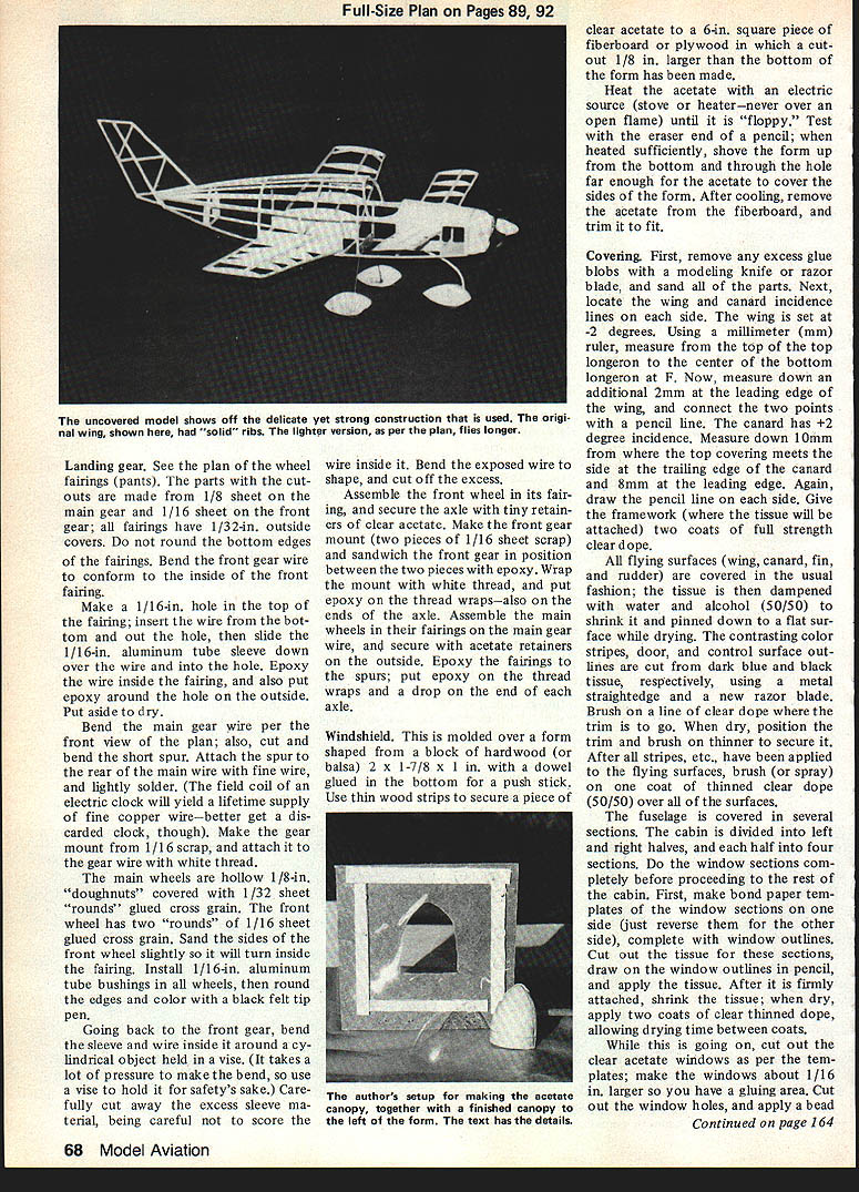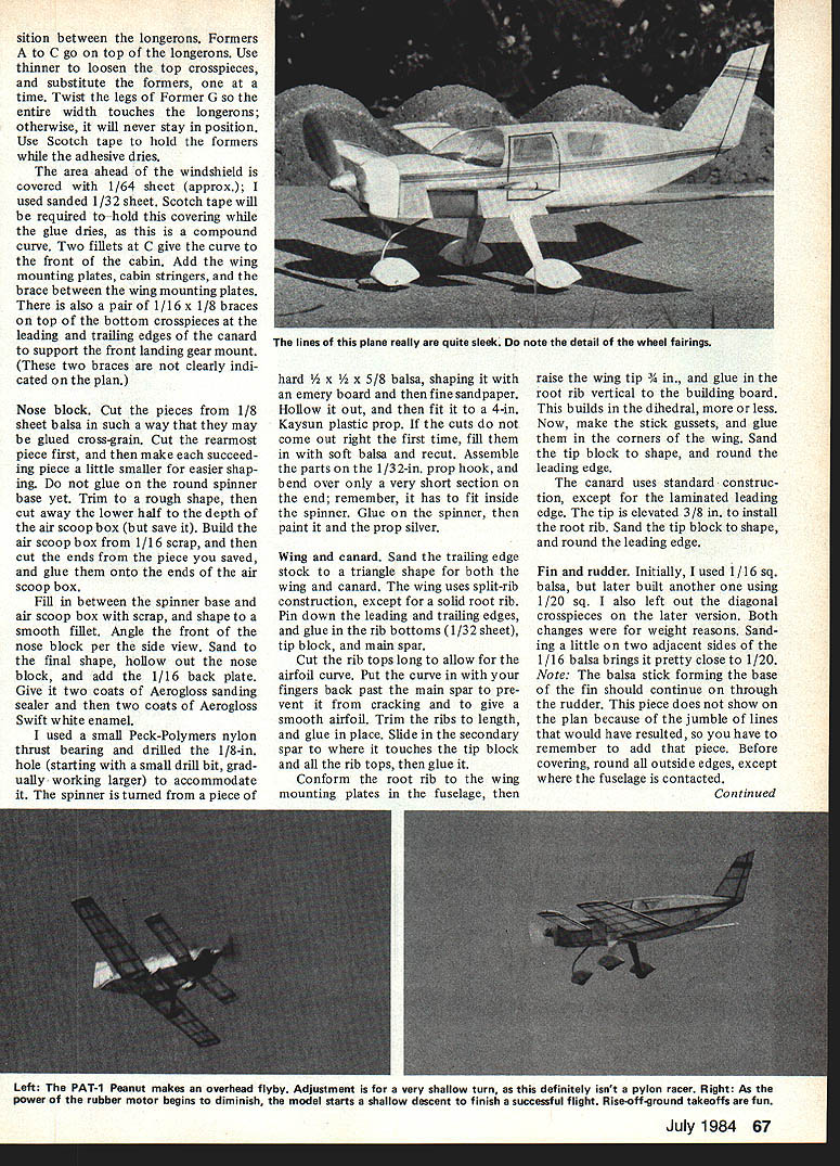 THE PAT-i IS THE PROTOTYPE all-composite plastic canard lightplane designed start com mercially produced Im sure wheth er first lightplane designed understand first canard Aircraft manufacturers both sides Atlantic have trying since mid-1950s produce powered com posite aircraft commercially See Peter Garrisons article April 1982 issue Flying magazine regarding techniques earlier attempts Although canard PAT-i looks much same other four-place low-wing single-engine fixed-gear plane wing just aft usually fuselage about same size vertical fin/rudder What sets apart moving stabilizing sur face tail front thats what makes canard attaching main landing gear fuselage like Cessna Peter Lert test pilot development project has pilot report November 1981 Air Pro gress magazine accompanied several outstanding photographs Budd Davisson PAT-l held promise easy handling plane capable carrying large payload 1000 lbs future now doubt because death companys president Howard Piper shortly before maiden flight June 1981and deaths planes de signer George Meade two NASA prototype Piper Advanced Technology plane PAT-i held much promise ing commercial success crash single plane built has cast shadow designs future Theres no shadow Peanut Scale ver sion Its delight employees crash prototype demonstration flight November 1981 Construction Though really diffi cult buildthis model offers challenges want something out ordinary want As fixed-gear ship no alternative doing part thrill Scale modeling Loosening grasp terra firma takeoff capping successful flight real landing what could better Fuselage Build usual slab sides leave out wing mounting plates now Make canard mounting plates about 1/16 deeper shown plan Bevel inside tail posts sides will meet angle Glue two sides together dry add crosspieces working ward sure use model cement top crosspieces will re moving later substituting laminated bow formers place bow formers made lami nating two strips basswood after soaking hot water Unless want use water-soluble glue let laminations dry overnight recom mend pinning unlaminated strips above other around 1/8-inthick form both strips touching form dry blow dryer dry quickly will hold shape can use what ever kind adhesive between wish saves lot time Note radii forms shown finished size model location have cut forms D G little shallower allow former top stringers Make two formers need wider bearing nose plug fills entire front end Trim formers form bottom notch Formers D G halfway through outside 1/16 bot tom notch helps hold po 66 Model Aviation planes overall appearance similar usual lowwinger except shifting stabilizing surface rear front sition between longerons Formers C go top longerons Use thinner loosen top crosspieces substitute formers time Twist legs Former G entire width touches longerons otherwise will never stay position Use Scotch tape hold formers adhesive dries area ahead windshield covered 1/64 sheet approx used sanded 1/32 sheet Scotch tape will required hold covering glue dries compound curve Two fillets C give curve front cabin Add wing mounting plates cabin stringers brace between wing mounting plates also pair 1/16 x 1/8 braces top bottom crosspieces leading trailing edges canard support front landing gear mount two braces clearly indi cated plan Nose block Cut pieces 1/8 sheet balsa such way may glued cross-grain Cut rearmost piece first make succeed ing piece little smaller easier shap ing glue round spinner base yet Trim rough shape cut away lower half depth air scoop box save Build air scoop box 1/16 scrap cut ends piece saved glue onto ends air scoop box Fill between spinner base air scoop box scrap shape smooth fillet Angle front nose block per side view Sand final shape hollow out nose block add 1/16 back plate Give two coats Aerogloss sanding sealer two coats Aerogloss Swift white enameL used small Peck-Polymers nylon thrust bearing drilled 1/8-in hole starting small drill bit grad ually working larger accommodate spinner turned piece hard 5/8 balsa shaping emery board fine sandpaper Hollow out fit 4-in Kaysun plastic prop cuts come out right first time fill soft balsa recut Assemble parts 1/32-in prop hook bend over very short section end remember has fit inside spinner Glue spinner paint prop silver Wing canard Sand trailing edge stock triangle shape both wing canard wing uses split-rib construction except solid root rib Pin down leading trailing edges glue rib bottoms 1/32 sheet tip block main spar Cut rib tops long allow airfoil curve Put curve fingers back past main spar pre vent cracking give smooth airfoil Trim ribs length glue place Sllde secondary spar touches tip block rib tops glue Conform root rib wing mounting plates fuselage raise wing tip 3/4 glue root rib vertical building board builds dihedral less Now make stick gussets glue corners wing Sand tip block shape round leading edge canard uses standard construc tion except laminated leading edge tip elevated 3/8 install root rib Sand tip block shape round leading edge Fin rudder Initially used 1/16 sq balsa later built another using 1/20 sq also left out diagonal crosspieces later version Both changes weight reasons Sand ing little two adjacent sides 1/16 balsa brings pretty close 1/20 Note balsa stick forming base fin should continue through rudder piece does show plan because jumble lines would have resulted have remember add piece Before covering round outside edges except fuselage contacted Continued July 1984 67 lines plane really quite sleek note detail wheel fairings Left The PAT-i Peanut makes overhead flyby Adjustment very shallow turn definitely isnt pylon racer Right As power rubber motor begins diminish model starts shallow descent finish successful flight Rise-offground takeoffs fun Full-Size Plan Pages 89 92 Landing gear See plan wheel fairings pants parts cut outs made 1/8 sheet main gear 1/16 sheet front gear fairings have 1/32-in outside covers round bottom edges fairings Bend front gear wire conform inside front