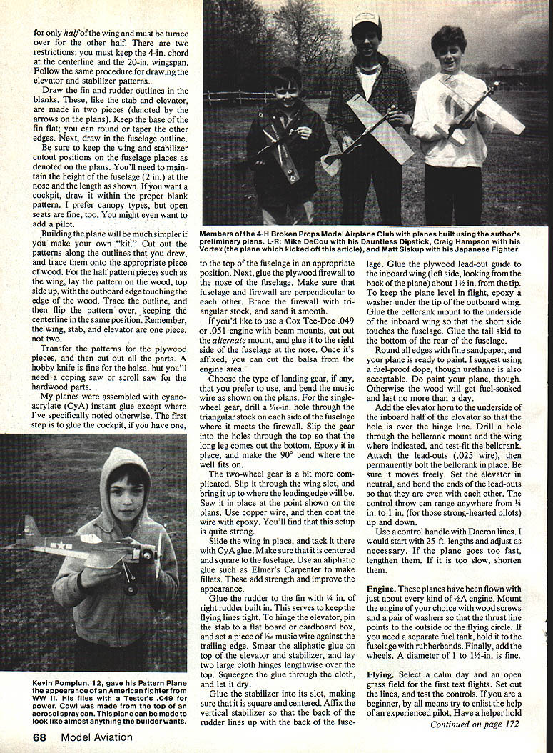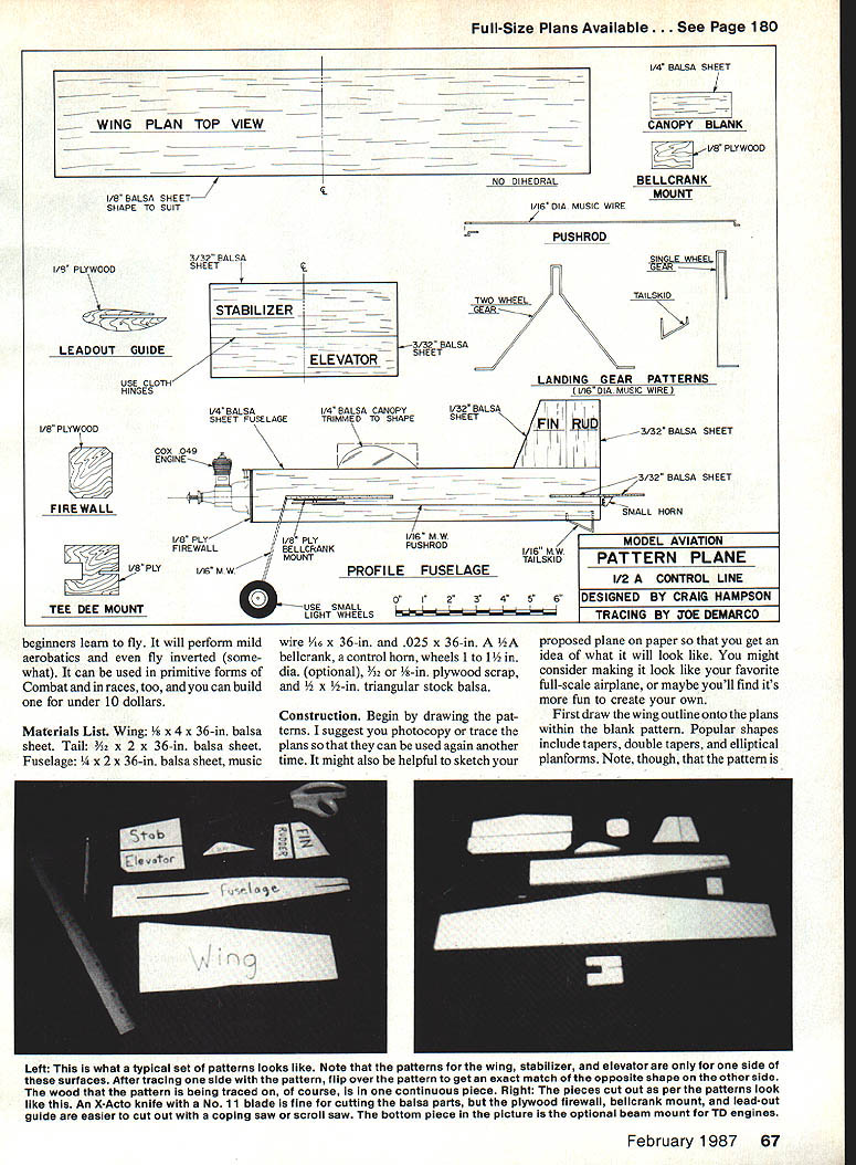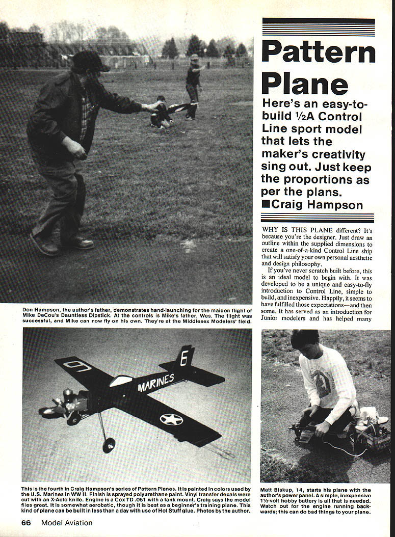 Pattern Plane Heres easy-tobuild 1/2A Control Line sport model lets makers creativity sing out Just keep proportions per plans ECraig Hampson Don Hampson authors father demonstrates hand-launching maiden flight Mike DeCous Dauntless Dipstick controls Mikes father Wes flight successful Mike can now fly own Theyre Middlesex Modelers field fourth Craig Hampsons series Pattern Planes painted colors used US Marines WW ii Finish sprayed polyurethane paint Vinyl transferdecals cut X-Acto knife Engine Cox TD 051 tank mount Craig says model flies great somewhat aerobatic though best beginners training plane kind plane can built less day use Hot Stuff glue Photos bythe author WHY IS THIS PLANE different Its because youre designer Just draw outline within supplied dimensions create one-of-a-kind Control Line ship will satisfy own personal aesthetic design philosophy youve never scratch built before ideal model begin developed unique easy-to-fly introduction Control Line simple build inexpensive Happily seems have fulfilled expectationsand some has served introduction Junior modelers has helped Matt Biskup 14 starts plane authors power panel simple inexpensive 11/2VOlt hobby battery needed Watch out engine running back wards can bad things plane 66 Model Aviation Full-Size Plans Available . See Page 180 WING PLAN TOP VIEW NO DIHEDRAL 1/8 BALSA SHEET SHAPE TO SUIT 1/16 DIA MUSIC WIRE / 1/4 BALSA SHEET CANOPY BLANK {r VB PLYWOOD BELLCRANK MOUNT I/S PLYWOOD LEADOUT GUIDE USE CLOTH HINGES I/B PLYWOOD FIREWALL PLY TEE DEE MOUNT 3/32 BALSA SHEET 1/4 BALSA SHEET FUSELAGE .3/32 BALSA SHEET 1/4 BALSA CANOPY TRIMMED TO SHAPE COX 049 ENGINE 7/ / 1/8 PLY II 1/8 PLY FIREWALLJI BELLCRANI MOUNT 1/16 USE SMALL LIGHT WHEELS PUSNROD TWO WHEELTAILSKID GEAR LANDING GEAR PATTERNS I/16DIA MUSIC WIRE 1/32 BALSA SHEET II / 1/16 MW PUS HROD PROFILE FUSELAGE 0I234 1/16 MW TAILSKID 56 3/32 BALSA SHEET BALSA SHEET SMALL HORN MODEL AVIATION PATTERN PLANE 1/2 CONTROL LINE DESIGNED BY CRAIG HAMPSON TRACING BY IOE DEMARCO SINGLE WH EL beginners learn fly will perform mild aerobatics fly inverted some what can used primitive forms Combat races too can build under 10 dollars Materials List Wing x 36-in balsa sheet Tail %2 x 2 x 36-in balsa sheet Fuselage /4 x 2 x 36-in balsa sheet music wire /16 x 36-in 025 x 36-in A bellcrank control horn wheels ito 1 dia optional %2 -in plywood scrap n triangular stock balsa Construction Begin drawing pat terns suggest photocopy trace plans can used again another time might also helpful sketch proposed plane paper get idea what will look like might consider making look like favorite full-scale airplane maybe youll find its fun create own First draw wing outline onto plans within blank pattern Popular shapes include tapers double tapers elliptical planforms Note though pattern Left what typical set patterns looks like Note patterns wing stabilizer elevator side surfaces After tracing side pattern flip over pattern get exact match opposite shape other side wood pattern being traced course continuous piece Right pieces cut out per patterns look like An XActo knife No 11 blade fine cutting balsa parts plywood firewall belicrank mount lead-out guide easier cut out coping saw scroll saw bottom piece picture optional beam mount TD engines February 1987 67 STABILIZER 117 ELEVATOR 1 half wing must turned over other half two restrictions must keep 4-in chord centerline 20-in wingspan Follow same procedure drawing elevator stabilizer patterns Draw fin rudder outlines blanks like stab elevator made two pieces denoted arrows plans Keep base fin flat can round taper other edges Next draw fuselage outline sure keep wing stabilizer cutout positions fuselage places denoted plans Youll need main tain height fuselage 2 nose length shown want cockpit draw within proper blank pattern prefer canopy types open seats fine too might want add pilot Building plane will much simpler make own kit Cut out patterns along outlines drew trace onto appropriate piece wood half pattern pieces such wing lay pattern wood top side up outboard edge touching edge wood Trace outline flip pattern over keeping centerline same position Remember wing stab elevator piece two Transfer patterns plywood pieces cut out parts hobby knife fine balsa youll need coping saw scroll saw hardwood parts planes assembled cyano acrylate CyA instant glue except Ive specifically noted otherwise first step glue cockpit have top fuselage appropriate position Next glue plywood firewall nose fuselage Make sure fuselage firewall perpendicular other Brace firewall tri angular stock sand smooth youd like use Cox Tee-Dee 049 051 engine beam mounts cut out alternate mount glue right side fuselage nose Once its affixed can cut balsa engine area Choose type landing gear prefer use bend music wire shown plans singlewheel gear drill /16-in hole through triangular stock side fuselage meets firewall Slip gear holes through top long leg comes out bottom Epoxy place make 900 bend well fits two-wheel gear bit com plicated Slip through wing slot bring up leading edge will Sew place point shown plans Use copper wire coat wire epoxy Youll find setup quite strong Slide wing place tack CyA glue Make sure centered square fuselage Use aliphatic glue such Elmers Carpenter make fillets add strength improve appearance Glue rudder fin t rudder built serves keep flying lines tight hinge elevator pin stab flat board cardboard box set piece /16 music wire against trailing edge Smear aliphatic glue top elevator stabilizer lay two large cloth hinges lengthwise over top Squeegee glue through cloth let dry Glue stabilizer its slot making sure square centered Affix vertical stabilizer back rudder lines up back fuselage Glue plywood lead-out guide inboard wing left side looking back plane about 1 tip keep plane level flight epoxy washer under tip outboard wing Glue bellcrank mount underside inboard wing short side touches fuselage Glue tail skid bottom rear fuselage Round edges fine sandpaper plan