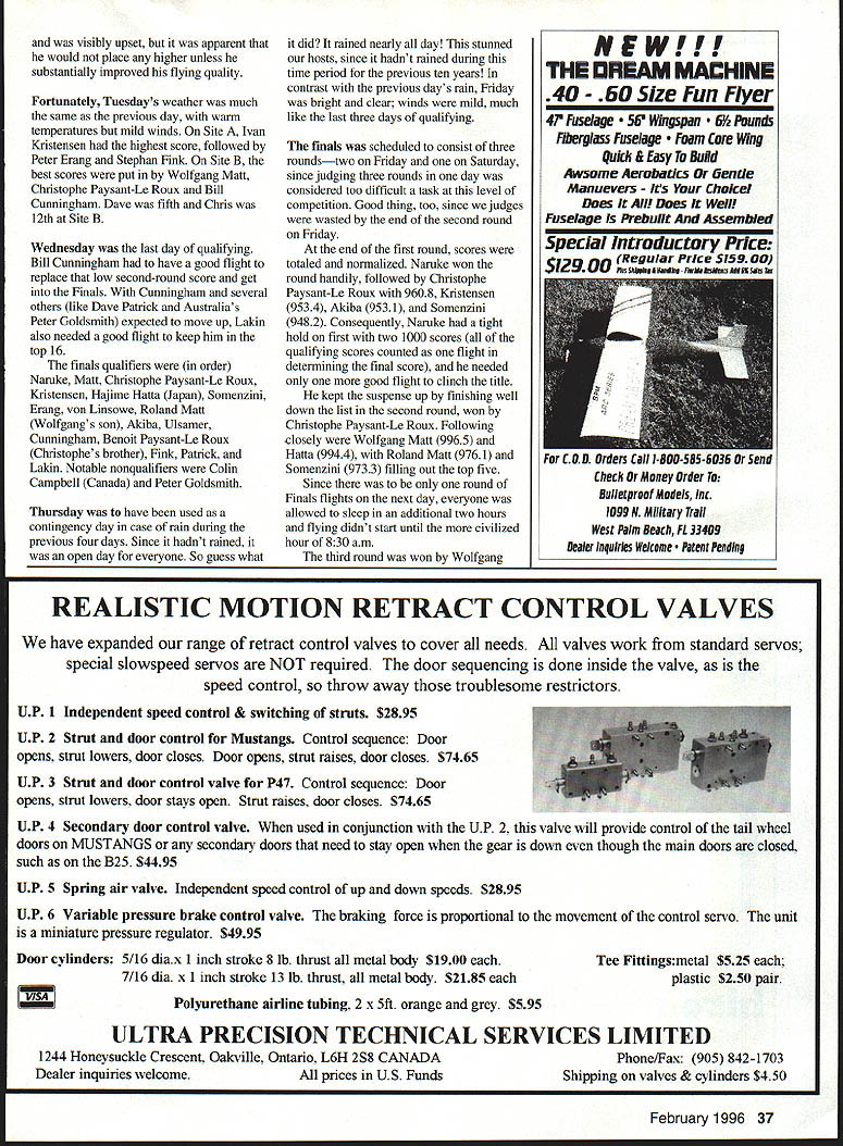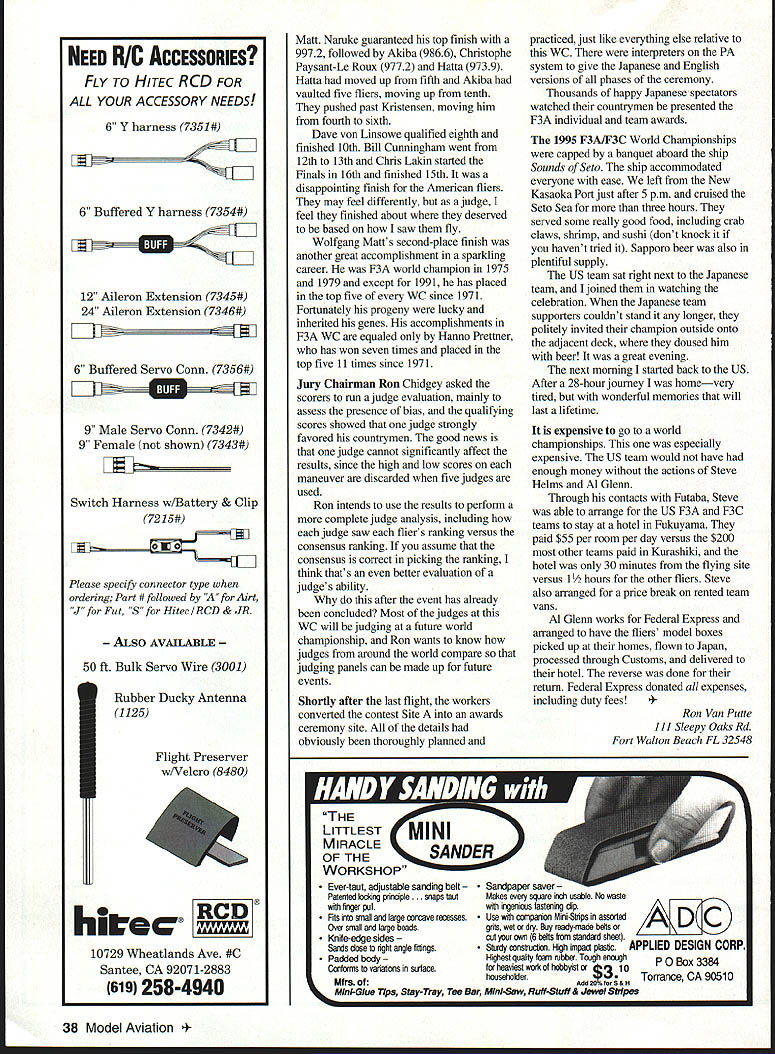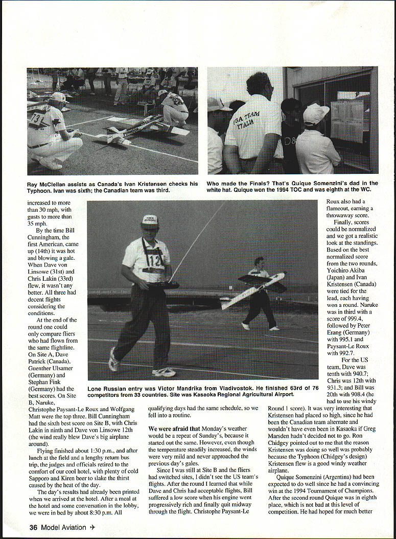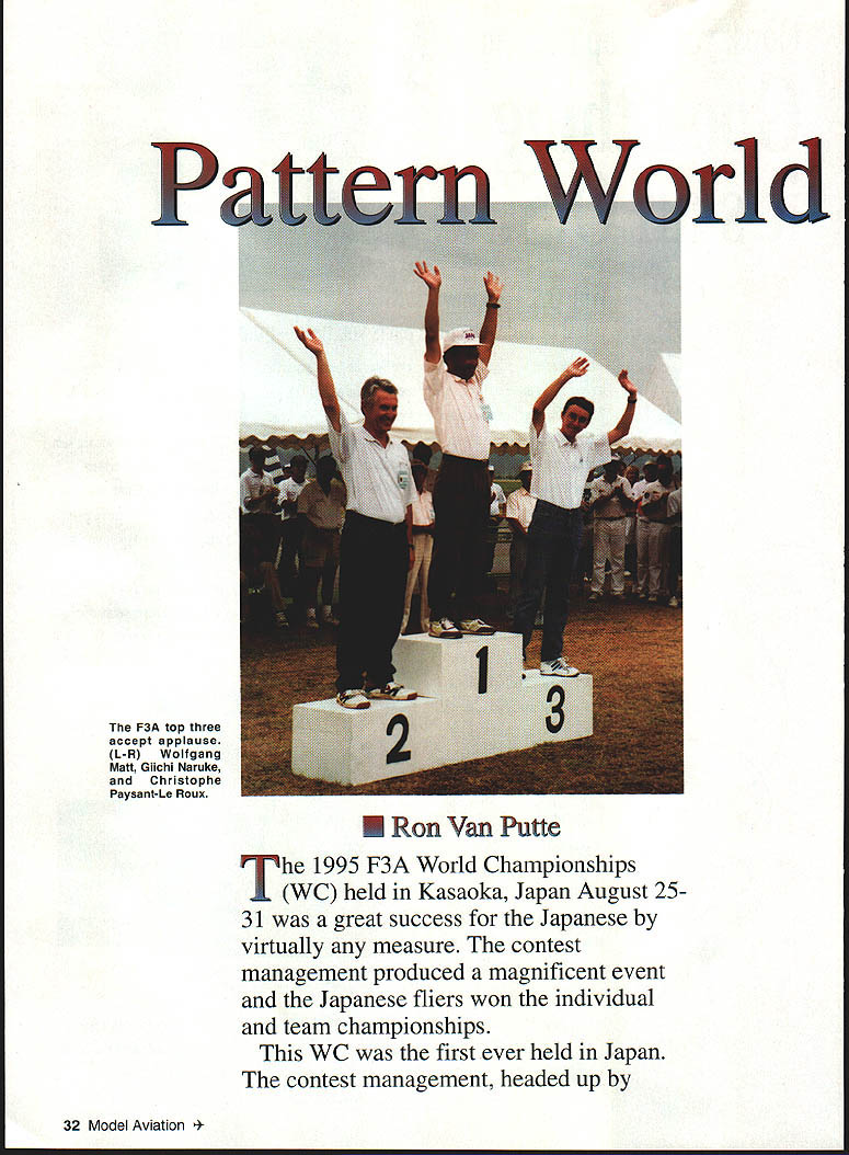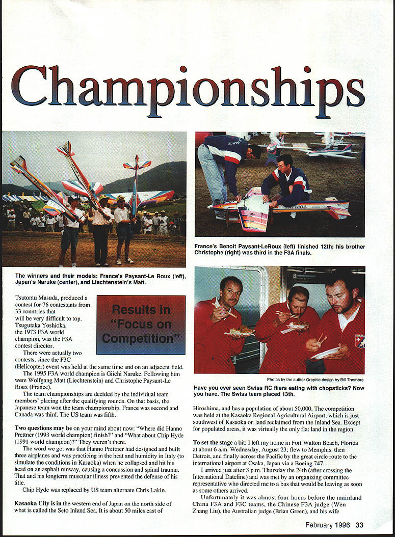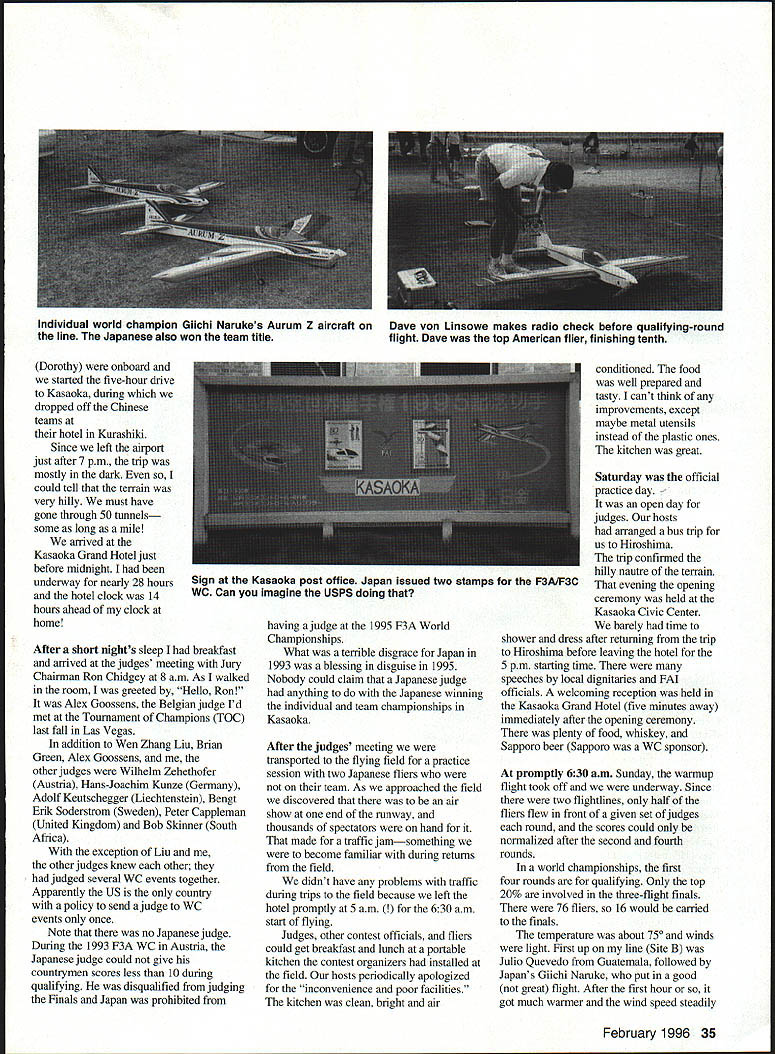 P F3A top three accept applause L-R Wolfgang Mall Glichi Naruke Christophe Paysant-Le Roux rid U Ron Van Putte 1995 F3A World Championships WC held Kasaoka Japan August 2531 great success Japanese virtually measure contest management produced magnificent event Japanese fliers won individual team championships WC first ever held Japan contest management headed up 32 Model Aviation pionships Tsutomu Masuda produced contest 76 contestants 33 countries will very difficult top Tsugutaka Yoshioka 1973 F3A world champion F3A contest director actually two contests since F3C Helicopter event held same time adjacent field 1995 F3A world champion Giichi Naruke Following him Wolfgang Matt Liechtenstein Christophe Paysant-Le Roux France team championships decided individual team members placing after qualifying rounds basis Japanese team won team championship France second Canada third US team fifth Two questions may mind about now did Hanno Prettner 1993 world champion finish What about Chip Hyde 1991 world champion werent word got Hanno Prettner designed built three airplanes practicing heat humidity Italy simulate conditions Kasaoka collapsed hit head asphalt runway causing concussion spinal trauma longterm muscular illness prevented defense title Chip Hyde replaced US team alternate Chris Lakin Kasaoka City western end Japan north side what called Seto Inland Sea about 50 miles east Hiroshima has population about 50000 competition held Kasaoka Regional Agricultural Airport just southwest Kasaoka land reclaimed Inland Sea Except populated areas virtually flat land region set stage bit left home Fort Walton Beach Florida about 6 am Wednesday August 23 flew Memphis Detroit finally across Pacific great circle route international airport Osaka Japan via Boeing 747 arrived just after 3 pm Thursday 24th after crossing International Dateline met organizing conmiittee representative directed bus would leaving soon some others arrived Unfortunately almost four hours before mainland China F3A F3C teams Chinese F3A judge Wen Zhang Liu Australian judge Brian Green wife February 1996 33 winners models Frances Paysant-Le Roux left Japans Naruke center Liechtensteins Maft Frances Benoit Paysant-LeRoux left finished 12th brother Christophe right third F3A finals Photos author Graphic design Bill Thorebro Have ever seen Swiss RC fliers eating chopsticks Now have Swiss team placed 13th Dorothy onboard started five-hour drive Kasaoka during dropped off Chinese teams hotel Kurashiki Since left airport just after 7 pm trip mostly dark could tell terrain very hilly must have gone through 50 tunnels some long mile arrived Kasaoka Grand Hotel just before midnight underway nearly 28 hours hotel clock 14 hours ahead clock home After short nights sleep breakfast arrived judges meeting Jury Chairman Ron Chidgey 8 am As walked room greeted Hello Ron Alex Goossens Belgian judge Id met Tournament Champions TOC last fall Las Vegas addition Wen Zhang Liu Brian Green Alex Goossens other judges Wilhelm Zehethofer Austria Hans-Joachim Kunze Germany Adolf Keutschegger Liechtenstein Bengt Erik Soderstrom Sweden Peter Cappleman United Kingdom Bob Skinner South Africa exception Liu other judges knew other judged several WC events together Apparently US country policy send judge WC events once Note no Japanese judge During 1993 F3A WC Austria Japanese judge could give countrymen scores less 10 during qualifying disqualified judging Finals Japan prohibited having ajudge 1995 F3A World Championships What terrible disgrace Japan 1993 blessing disguise 1995 Nobody could claim Japanese judge anything Japanese winning individual team championships Kasaoka After judges meeting transported flying field practice session two Japanese fliers team As approached field discovered air show end runway thousands spectators hand made traffic jamsomething become familiar during returns field didnt have problems traffic during trips field because left hotel promptly 5 am am start flying Judges other contest officials fliers could get breakfast lunch portable kitchen contest organizers installed field hosts periodically apologized inconvenience poor facilities kitchen clean bright air conditioned food well prepared tasty cant think improvements except maybe metal utensils instead plastic ones kitchen great Saturday official practice day open day judges hosts arranged bus trip us Hiroshima trip confirmed hilly nautre terrain evening opening ceremony held Kasaoka Civic Center barely time shower dress after returning trip Hiroshima before leaving hotel 5 pm starting time speeches local dignitaries FAI officials welcoming reception held Kasaoka Grand Hotel five minutes away immediately after opening ceremony plenty food whiskey Sapporo beer Sapporo WC sponsor promptly 630 am Sunday warmup flight took off underway Since two flightlines half fliers flew front given set judges round scores could normalized after second fourth rounds world championships first four rounds qualifying Only top 20% involved three-flight finals 76 fliers 16 would carried finals temperature about 750 winds light First up line Site B Julio Quevedo Guatemala followed Japans Giichi Naruke put good great flight After first hour got much warmer wind speed steadily February 1996 35 Individual world champion Glichi Narukes Aurum Z aircraft Dave von Linsowe makes radio check before qualifying-round line Japanese also won team title flight Dave top American flier finishing tenth Sign Kasaoka post office Japan issued two stamps F3A/F3C WC Can imagine USPS doing increased 30 mph gusts 35 mph time Bill Cunningham first American came up 14th hot blowing gale Dave von Linsowe 31st Chris Lakin 33rd flew wasnt better three decent flights considering conditions end round could compare fliers flown same flightline Site Dave Patrick Canada Guenther Ulsamer Germany Stephan Fink Germany best scores Site B Naruke Christophe Paysant-Le Roux Wolfgang Matt top three Bill Cunningham sixth best score Site B Chris L