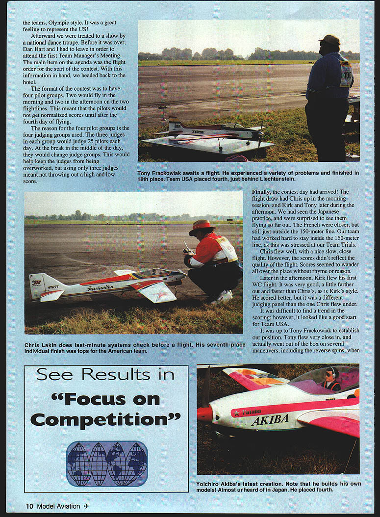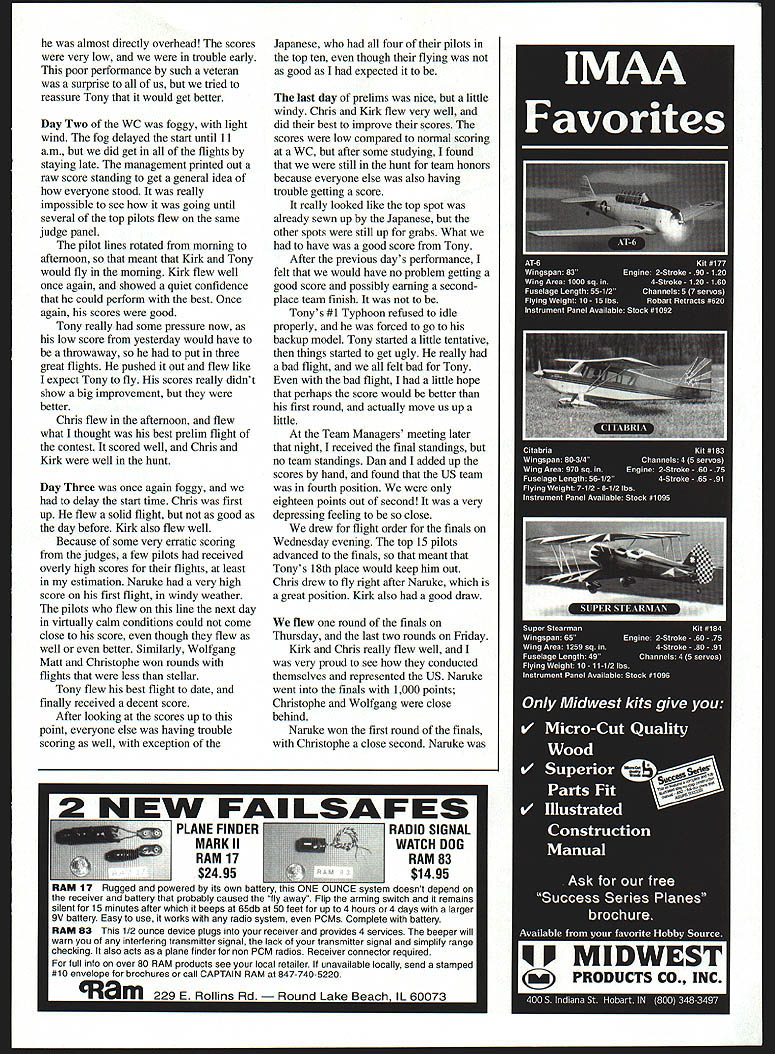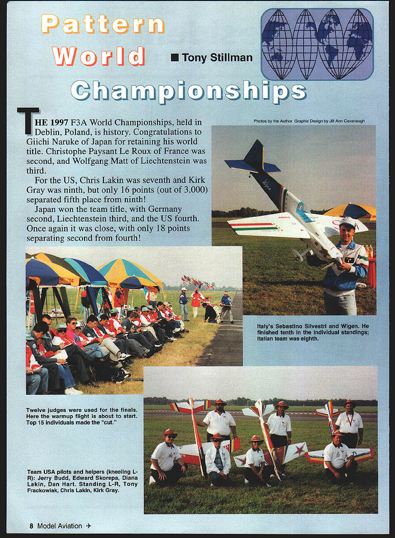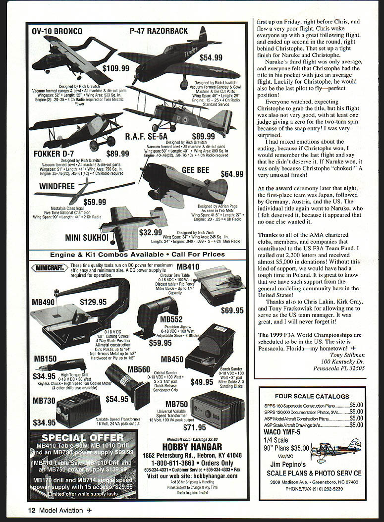 HE 1997 F3A Deblin Poland Giichi Naruke title Christonhe second third US C Gray ninth separated fifth pla Japan won second Liec Once again separating sec F Twelve Judges used warmup flight Top 15 indIviduals made Team USA pilots helpers kn R Jerry Budd Edward Skorep& Lakin Dan Hart Standing L-R Tor Frackowiak Chris Lakin Kirk Gray 8 Model Aviation Nc Dua assembled models went out very nice long hard-surface able get some goodNinthplace finisher Kirk Gray flew well first WC Warsaw pick up thereadies flight assisted Dan Hart February 1998 9 teams Olympic style great feeling represent US Afterward treated a national dance troupe Before Dan Hart leave attend first Team main item agena order start coni information hand heade hotel format contest four pilot groups Two wou morning two afte flightlines meant ti get normalized scores u fourth day flying reason four four judging groups used group would ju day break tlu would change help keep judges no overworked using c meant throwing out score opu i pmblems est day arr Thris up Tony lat nad seen vere surprs t Fr 150 stay well rer scores 4114 flight Scores se je afternoon very OO4 r etter el aifficult fino tr owever looked liltt JSA ipto Tony Fracli ii Tony flew nt out b including ri ee Resu Its Focus Corn petition eation Note builds own Japan placed fourth 10 Model Aviation st directly overhead scores very low trouble early poor performance such veteran surpi-ise us tried reassure Tony would get better Day Two WC foggy light wind fog delayed start until 11 am did get flights staying late management printed out raw score standing get general idea everyone stood really impossible see going until several top pilots flew same judge panel pilot lines rotated morning afternoon meant Kirk Tony would fly morning Kirk flew well once again showed quiet confidence could perform best Once again scores good Tony really some pressure now low score yesterday would have throwaway put three great flights pushed out flew like expect Tony fly scores really didnt show big improvement better Chris flew afternoon flew what thought best prelim flight contest scored well Chris Kirk well hunt Day Three once again foggy delay start time Chris first up flew solid flight good day before Kirk also flew well Because some very erratic scoring judges few pilots received overly high scores flights least estimation Naruke very high score first flight windy weather pilots flew line next day virtually calm conditions could come close score though flew well better Similarly Wolfgang Matt Christophe won rounds flights less stellar Tony flew best flight date finally received decent score After looking scores up point everyone else having trouble scoring well exception Japanese four pilots top ten though flying good expected last day prelims nice little windy Chris Kirk flew very well did best improve scores scores low compared normal scoring WC after some studying found still hunt team honors because everyone else also having trouble getting score really looked like top spot already sewn up Japanese other spots still up grabs What have good score Tony After previous days performance felt would have no problem getting good score possibly earning secondplace team finish Tonys #1 Typhoon refused idle properly forced go backup model Tony started little tentative things started get ugly really had flight felt bad Tony bad flight little hope perhaps score would better first round actually move us up little Team Managers meeting later night received final standings no team standings Dan added up scores hand found US team fourth position eighteen points out second very depressing feeling close drew flight order finals Wednesday evening top 15 pilots advanced finals meant Tonys 18th place would keep him out Chris drew fly right after Naruke great position Kirk also good draw flew round finals Thursday last two rounds Friday Kirk Chris really flew well very proud see conducted themselves represented US Naruke went finals 1000 points Christophe Wolfgang close behind Naruke won first round finals Christophe close second Naruke MIDWEST I UCTS CO INC g.3602 R F i999 FOKKER Designed Rich Uravitch Vacuum formed cowl ine & die-cat parts Wiogopan 51- Length 41 Area 756 Sq Engine 35- 452C 45 61 4C 4 Ch Radio required WINDFR Nostalgia Class legal Five Time National Champion Wing Span 99 Length 44 Radio MINI SVKHuI Engine & Kit Comb Torque nh t-18VDC30 Watt Keyless Chock High Speed Fan Cooled Mote 4 other drills also available 15 MiniCraft Color Catalogs $2 Ott HOBBY HANGAR 1862 Petersburg Rd Hebron KY 41048 1-800-611-3860 Orders Only 606-334-4331 Customer Service 334-4333 Visit web site hobbyhangarcom Add $6 lur Shipping & handling Fniceu Suoject tu Change Any Time Dealer Inquirien Inn led first up Friday right before Chris flew very poor flight Chris woke everyone up great following flight ended up second round right behind Christophe set up tight finish Naruke Christophe Narukes third flight average everyone felt Christophe title pocket just average flight Luckily Christophe would also last pilot flyperfect position Everyone watched expecting Christophe grab title flight also very good least judge giving zero two-turn spun because snap entry very surprised mixed emotions about ending because Christophe won would remember last flight say didnt deserve Naruke won because Christophe choked very unusual finish award ceremony later night first-place team Japan followed Germany Austria US individual title again went Naruke felt deserved because appeared no else wanted Thanks AMA chartered clubs members companies contributed US F3A Team Fund mailed out 2200 letters received almost $5000 donations Without kind support would have tough time Poland great know have such support general modeling community United States Thanks also Chris Lakin Kirk Gray Tony Frackowiak allowing serve US team manager great will never forget 1999 F3A World Championships scheduled US site Pensacola Floridamy hometown Stiliman 100 Kent