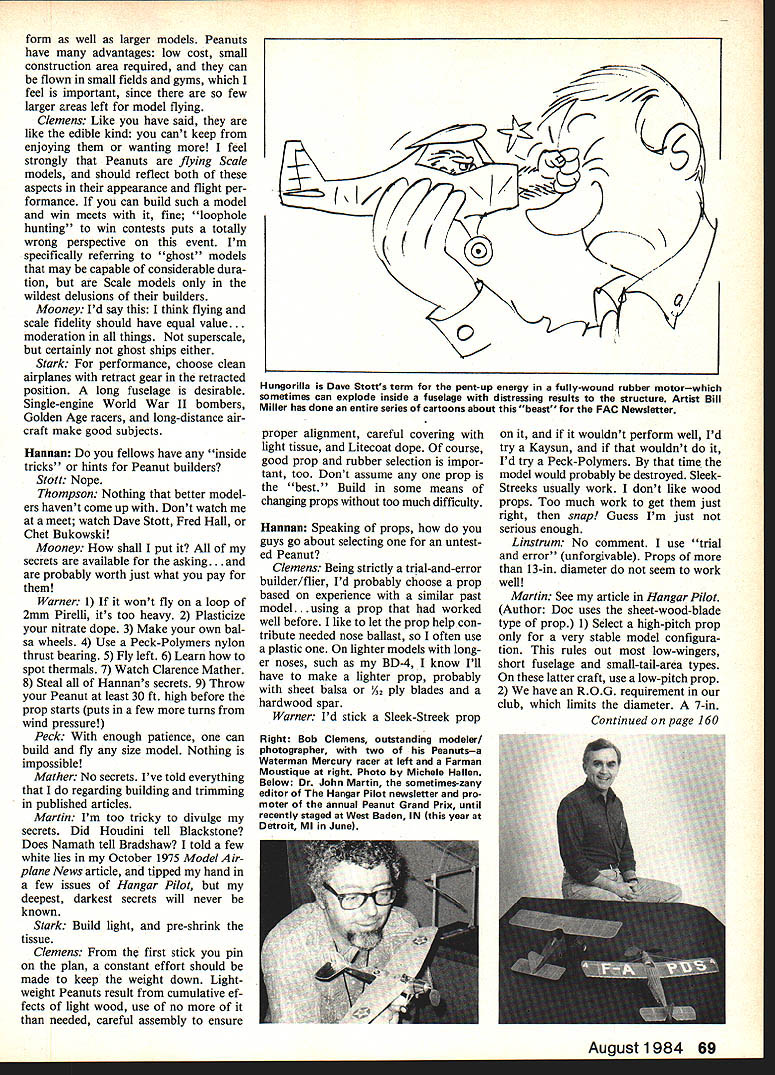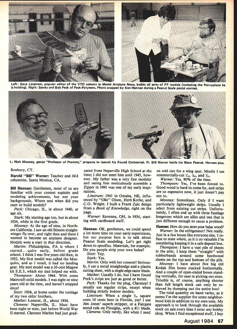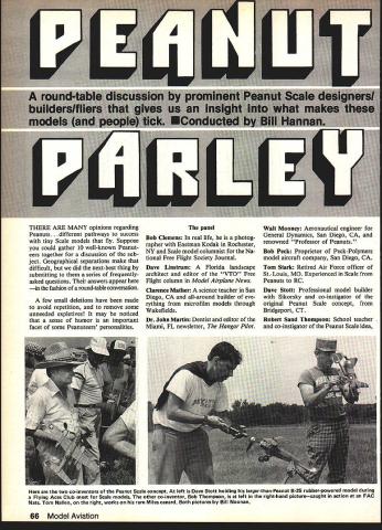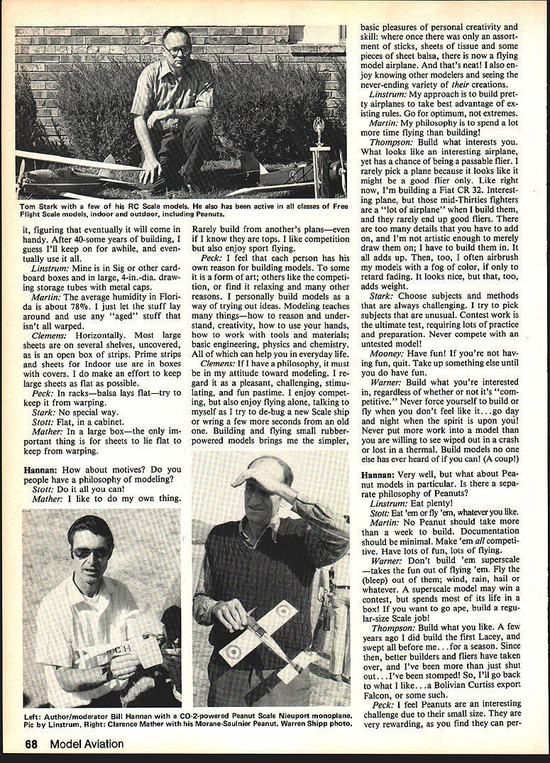 THERE ARE MANY opinions regarding Peanuts ferent pathways success tiny Scale models fly Suppose could gather 10 well-known Peanut eers together discussion sub ject Geographical separations make difficult did next-best thing submitting series frequentlyasked questions answers appear fashion round-table conversation few small deletions have made avoid repetition remove some unneeded expletives may noticed sense humor important facet some Peanuteers personalities panel Bob Clemens real life photog rapher Eastman Kodak Rochester NY Scale model columnist Na tional Free Flight Society Journal Dave Linstrum Florida landscape architect editor VTO Free Flight column Model Airplane News Clarence Mather science teacher San Diego CA all-around builder eve rything microfilm models through Wakefields Dr John Martin Dentist editor Miami FL newsletter Hangar Pilot Walt Mooney Aeronautical engineer General Dynamics San Diego CA renowned Professor Peanuts Bob Peck Proprietor Peck-Polymers model aircraft company San Diego CA Tom Stark Retired Air Force officer St. Louis MO Experienced Scale Peanuts RC Dave Stott Professional model builder Sikorsky co-instigator original Peanut Scale concept Bridgeport CT Robert Sand Thompson School teacher co-instigator Peanut Scale idea two co-inventors Peanut Scale concept left Dave Stott holding larger-than-Peanut B-25 rubber-powered model during Flying Aces Club meet Scale models other co-inventor Bob Thompson left right-hand picturecaught action FAC Nats Tom Nallen right works rare Miles canard Both pictures Bill Noonan 66 Model Aviation Len uave Linstrum popuiar eaitor 0 tne VTU column Model Airplane News all sorts FF models including Pennyplane holding Right Sandy Bob Peck Peck-Polymers Photo snapped Ken Hannan during Peanut Scale postal contest L Walt Mooney genial Professor Peanuts prepares launch Found Centennial R Bill Warner holds Waco Peanut Hannan pics Roxbury CT Harold Bill Warner Teacher MA columnist Santa Monica CA Bill Hannan Gentlemen us familiar contest exploits modeling achievements backgrounds did start build models Peck Chicago IL about 1940 age six Stark My starting age too about 1934 first grade Mooney At age nine North ern California saw old Stinson straight winger fly over right wanted become airplane designer Models start direction Martin Philadelphia PA started. quite early before grade school think five years old 1932 first model called Mos quito recall no landing gear next model 10-cent Megow kit SE5 dad helped Thompson About 1944 some Maircraft solid models eight nine years old time havent stopped since Stott 1934 home under tutelage two older brothers Mather Lemont IL about 1934 Clemens Naperville IL Must have eight nine just before World War II started Clarence Mather just graduated Naperville High School time did meet him until 1945 ever father very fine modeler seeing him meticulously assemble Zipper 1941 early inspi rations Linstrum 1941 Omaha NE influ enced Olie Olson Herb Kothe CO Wright built Frank Zaic design Book Knowledge right page Warner Ravenna OH 1934 start ing cardboard stuff Hannan OK gentlemen could spend lot time early experiences purpose talk about Peanut Scale modeling Lets get right down specifics Materials example people strip own balsa Stott Yep Stark Yes Martin Only consent Serious ly use metal straightedge plastic cutting sheet single-edge razor blade Mather Usually I have found Pecks strips just good better Peck Thanks plug Clarence usually use regular strips except building strictly Indoor models Linstrum When single /46 square costs 10 cents Florida yes use Jim Jones superb stripper Fairgate metal rule Plexiglas #11 blade Clemens Only rarely like need odd size wing spar Mostly use commercially-cut Ao /42 Warner Yes 90% time Thompson Yes Ive forced Good wood hard come strips expensive now just doesnt pay Mooney Sometimes Only want particularly lightweight strips Usually select existing cut strips Unfortu nately often end up three fuselage longerons alike just different enough cause problem Hannan store balsa wood Warner In refrigerator really Just few boxes like everyone else re fuse state valuable Im considering keeping safe deposit box Thompson I have vast pile sheets attic keep straight rubberbands around some hardwood sheets top bottom pile Mooney I have about five big old Kodak film boxes stacked horizontally couple open-ended boxes stand ing vertically ease picking out sizes Trouble course anything shorter full length stock can re trieved dumping out entire box total quantity hand varies seems Im supplier some neighbor hood kids addition own sons approach look through available stock sale time enter hobby shop find exceptional stuff buy August 1984 67 figuring eventually will come handy After 40-some years building guess Ill keep awhile tually use Linstrum Mine Sig other card board boxes large 4-in -dia draw ing storage tubes metal caps Martin The average humidity Flori da about 78o just let stuff lay around use aged stuff isnt warped Clemens Horizontally Most large sheets several shelves uncovered open box strips Prime strips sheets Indoor use boxes covers make effort keep large sheets flat possible Peck In racksbalsa lays flattry keep warping Stark No special way Stott Flat cabinet Mather In large boxthe im portant thing sheets lie flat keep warping Hanuan How about motives people have philosophy modeling Stott Do can Mather I like own thing Rarely build anothers planseven know tops like competition also enjoy sport flying Peck I feel person has own reason building models some form art others like competi tion find relaxing other reasons personally build models way trying out ideas Modeling teaches thingshow reason under stand creativity use hands work tools materials basic engineering physics chemistry can help everyday life Clemens have philosophy must attitude toward modeling re gard pleasant challenging stimu lating fun pastime enjoy compet ing also enjoy flying alone talking myself try de-bug new Scal
