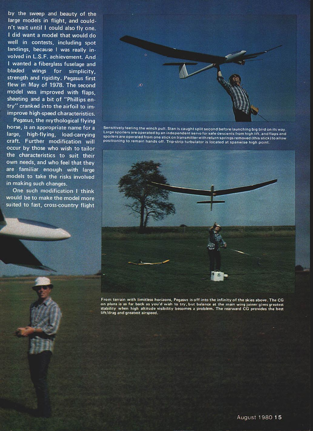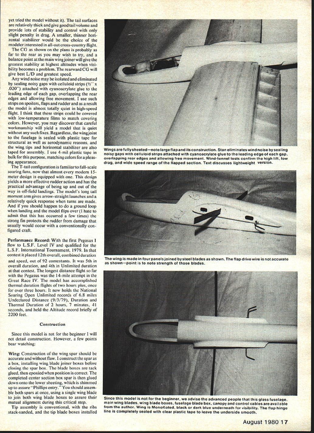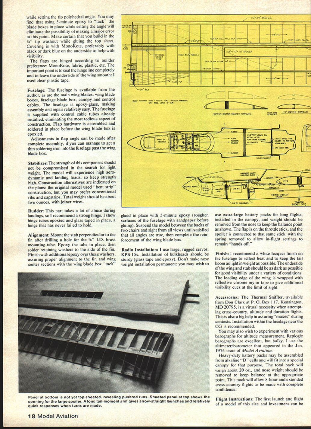 NO OCR TEXT NO OCR TEXT less altitude flight would General Description Pegasus 166 span thin wings toward tips two 67 long 1675 sq wing area Ipercent polyhedral break another tail design wings four separate panels percent two tip Stretching tip joined together spring steel blades panels would enhance scale-like flight fully sheeted except small portion appearance penalty difficult underside tips center sections spot landings model shown rock equipped generous flaps may steady modifications carefully thought reflexed raised up negative angle give out should too risky greater speeds Large spoilers operated Wed smile too bird likethis created furtherStans questforhigher 1SF requirements aircraft capable setting altitude distance duration records Forthe experiencedhe discusses possible variations separate servo give safe descents high lift flaps spoilers operated inde pendently control stick transmitter return springs removed stick allow positioning remain hands off built medium-weight balsa gener ous amounts epoxy alaphatic resin glues original model came out fully-assembled weight 160 ounces believe lighter model would need Phillips penetrate well weights 145 ounce range lighter model wouldnt quite rugged Dont skimp main wing spar decide try lightweight Actually model will thermal Wearing woolly hat scarf chilly day Stan poses Pegasus give vivid impression its configuration well light lift FAI limit 176 ounces 11 pounds flown accurately smoothly Aerodynamics design approach con servative relatively thick wing section chosen strength stability hands off leading edge relatively sharp stalls arent abrupt Camber about 4% tip washout help avoid tip stalling trip strip turbulator located span-wise high-point about 38% strip simply automotive tape Wind tunnel tests airfoil Emil Martinek SOAR member confirms high lift low drag wide speed range flapped section turbulator strip appeared help have Editors Note grateful have opportunity publish excellent design truly outstanding article Anyone interested RCflying willfind absorbing readingeven sailplanes dish thats case skip construction sure read phenomenal conclusion flying techniquesfor rare insight world super soaring 16 Model Aviation have anysense oneness air feeling fortligflt toritsoWrl sake sailplane supreme RC craft Wheeling silent wings white speck against blue touches soul Forthe realistic sharp-eyed pilotsamong wed guessyou reallyare looking attheangleof towline yet tried model tail surfaces relatively thick give good tail volume provide lots stability control slight penalty drag smaller thinner hori zontal stabilizer would choice modeler interested all-out cross-country flight CG shown plans probably far rear may wish try balance point main wingjoiner will give greatest stability highest altitudes visi bility becomes problem rearward CG will give best L/D greatest speed Any wind noise may isolated eliminated sealing noisy gaps celluloid strips x 020 attached cyanoacrylate glue leading edge gap overlapping rear edges allowing free movement use such strips spoilers flaps rudder result model almost totally quiet high-speed flight think strips could covered low-temperature films match covering colors However may discover careful workmanship will yield model quiet such fixes Regardless wingjoint fuselage sealed plastic tape structural well aerodynamic reasons wing tips horizontal stabilizer also taped assembly use 4-mil plastic tape bulk purpose matching colors pleas ing appearance T-tail configuration familiar full-scale soaring fans now almost modem 15meter design equipped design yields effective rudder action has practical advantage being up out way off-field landings models long tail moment arm gives arrow-straight launches relatively quick response turns made should happen ground loop landing model flips over hate admit has occurred few times strong fin protects rudder damage usually would occur conventionally con figured craft Performance Record first Pegasus flew LSF Level IV qualified LSF Intemational Tournament 1979 contest placed 12th overall combined duration speed out 92 contestants 5th overall duration 4th Unlimited duration contest longest distance flight far Pegasus 14-mile attempt Great Race IV model has accomplished thermal duration flights two hours plus once over three hours now holds National Soaring Open Unlimited records 68 miles Undeclared Distance 9/3/79 Duration Thermal Duration 2 hours 7 minutes 41 seconds held Altitude record briefly 2200 feet Construction Since model beginner will detail construction However few points bear watching Wing Construction wing spar should accurate flaw construct spar box installing wing blade joiner boxes before closing spar box blade boxes tack glued epoxied position correct completed center section box spar glued down Onto lower sheeting shimmed up assure ~Phillips entry should assem ble both spars once using single wing blade join both wing blade boxes assure mutual alignment during critical step Tip assembly conventional ribs stack-sanded tip blade boxes installed August 198017 Wings fullysheetednote largeflapand itsconstruction Stan eliminates wind noise seaiing noisy gaps celluloid strips attached cyanoacrylate glue leading edge gap overlapping rear edges allowing free movement Wind-tunnel tests confirm high lift low drag wide speed range flapped section Text discusses lightweight version wing made four panelsjoined steel blades shown flap drive wire accurate shownpoint note strength blades Since model beginner advise advanced people glass fuselage main wing blades wing blade boxes fuselage blade box canopy control cables available author Wing MonoKoted black dark blue underneath visibility flap hinge line completely sealed clear plastic tape leave underside smooth setting tip polyhedral angle may find using 5-minute epoxy tack blade boxes place setting angle will eliminate possibility making major error point Make Certain build 4 tip washout gluing top sheet Covering MonoKote pre