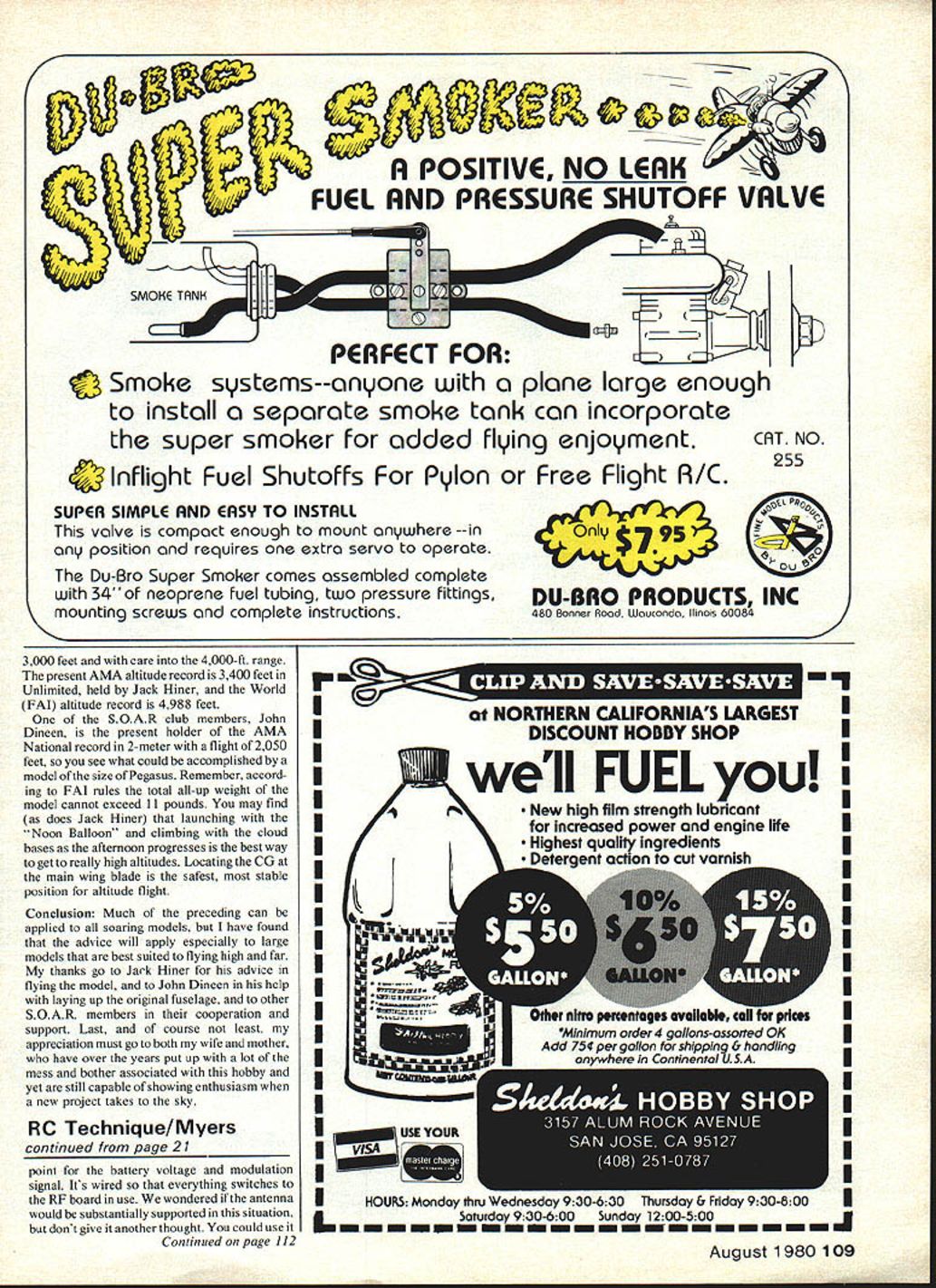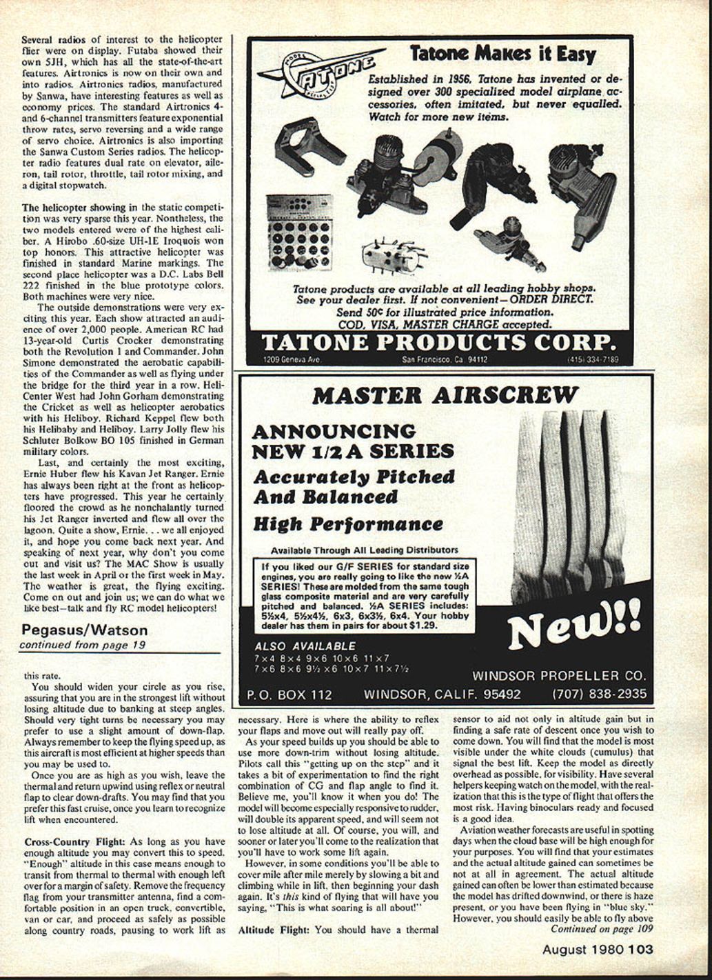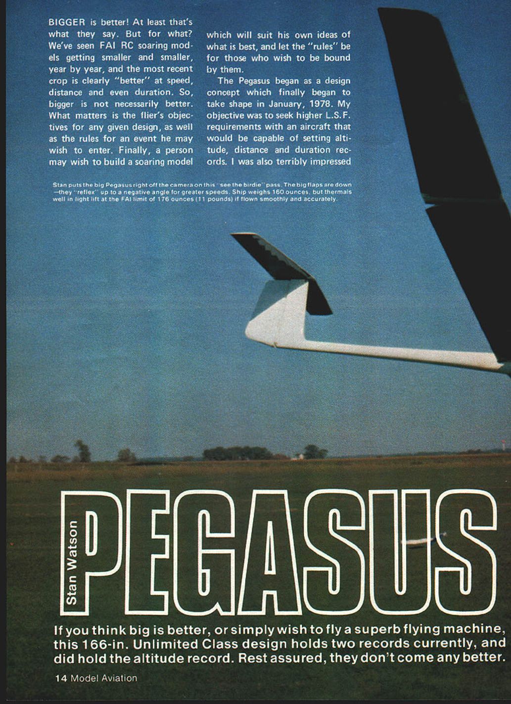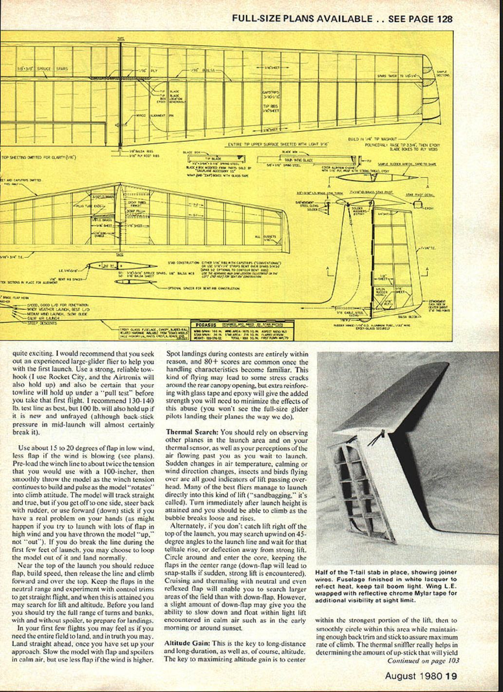 NO OCR TEXT NO OCR TEXT less altitude flight would General Description Pegasus 166 span thin wings toward tips two 67 long 1675 sq wing area Ipercent polyhedral break another tail design wings four separate panels percent two tip Stretching tip joined together spring steel blades panels would enhance scale-like flight fully sheeted except small portion appearance penalty difficult underside tips center sections spot landings model shown rock equipped generous flaps may steady modifications carefully thought reflexed raised up negative angle give out should too risky greater speeds Large spoilers operated Wed smile too bird likethis created furtherStans questforhigher 1SF requirements aircraft capable setting altitude distance duration records Forthe experiencedhe discusses possible variations separate servo give safe descents high lift flaps spoilers operated inde pendently control stick transmitter return springs removed stick allow positioning remain hands off built medium-weight balsa gener ous amounts epoxy alaphatic resin glues original model came out fully-assembled weight 160 ounces believe lighter model would need Phillips penetrate well weights 145 ounce range lighter model wouldnt quite rugged Dont skimp main wing spar decide try lightweight Actually model will thermal Wearing woolly hat scarf chilly day Stan poses Pegasus give vivid impression its configuration well light lift FAI limit 176 ounces 11 pounds flown accurately smoothly Aerodynamics design approach con servative relatively thick wing section chosen strength stability hands off leading edge relatively sharp stalls arent abrupt Camber about 4% tip washout help avoid tip stalling trip strip turbulator located span-wise high-point about 38% strip simply automotive tape Wind tunnel tests airfoil Emil Martinek SOAR member confirms high lift low drag wide speed range flapped section turbulator strip appeared help have Editors Note grateful have opportunity publish excellent design truly outstanding article Anyone interested RCflying willfind absorbing readingeven sailplanes dish thats case skip construction sure read phenomenal conclusion flying techniquesfor rare insight world super soaring 16 Model Aviation have anysense oneness air feeling fortligflt toritsoWrl sake sailplane supreme RC craft Wheeling silent wings white speck against blue touches soul Forthe realistic sharp-eyed pilotsamong wed guessyou reallyare looking attheangleof towline yet tried model tail surfaces relatively thick give good tail volume provide lots stability control slight penalty drag smaller thinner hori zontal stabilizer would choice modeler interested all-out cross-country flight CG shown plans probably far rear may wish try balance point main wingjoiner will give greatest stability highest altitudes visi bility becomes problem rearward CG will give best L/D greatest speed Any wind noise may isolated eliminated sealing noisy gaps celluloid strips x 020 attached cyanoacrylate glue leading edge gap overlapping rear edges allowing free movement use such strips spoilers flaps rudder result model almost totally quiet high-speed flight think strips could covered low-temperature films match covering colors However may discover careful workmanship will yield model quiet such fixes Regardless wingjoint fuselage sealed plastic tape structural well aerodynamic reasons wing tips horizontal stabilizer also taped assembly use 4-mil plastic tape bulk purpose matching colors pleas ing appearance T-tail configuration familiar full-scale soaring fans now almost modem 15meter design equipped design yields effective rudder action has practical advantage being up out way off-field landings models long tail moment arm gives arrow-straight launches relatively quick response turns made should happen ground loop landing model flips over hate admit has occurred few times strong fin protects rudder damage usually would occur conventionally con figured craft Performance Record first Pegasus flew LSF Level IV qualified LSF Intemational Tournament 1979 contest placed 12th overall combined duration speed out 92 contestants 5th overall duration 4th Unlimited duration contest longest distance flight far Pegasus 14-mile attempt Great Race IV model has accomplished thermal duration flights two hours plus once over three hours now holds National Soaring Open Unlimited records 68 miles Undeclared Distance 9/3/79 Duration Thermal Duration 2 hours 7 minutes 41 seconds held Altitude record briefly 2200 feet Construction Since model beginner will detail construction However few points bear watching Wing Construction wing spar should accurate flaw construct spar box installing wing blade joiner boxes before closing spar box blade boxes tack glued epoxied position correct completed center section box spar glued down Onto lower sheeting shimmed up assure ~Phillips entry should assem ble both spars once using single wing blade join both wing blade boxes assure mutual alignment during critical step Tip assembly conventional ribs stack-sanded tip blade boxes installed August 198017 Wings fullysheetednote largeflapand itsconstruction Stan eliminates wind noise seaiing noisy gaps celluloid strips attached cyanoacrylate glue leading edge gap overlapping rear edges allowing free movement Wind-tunnel tests confirm high lift low drag wide speed range flapped section Text discusses lightweight version wing made four panelsjoined steel blades shown flap drive wire accurate shownpoint note strength blades Since model beginner advise advanced people glass fuselage main wing blades wing blade boxes fuselage blade box canopy control cables available author Wing MonoKoted black dark blue underneath visibility flap hinge line completely sealed clear plastic tape leave underside smooth setting tip polyhedral angle may find using 5-minute epoxy tack blade boxes place setting angle will eliminate possibility making major error point Make Certain build 4 tip washout gluing top sheet Covering MonoKote pre