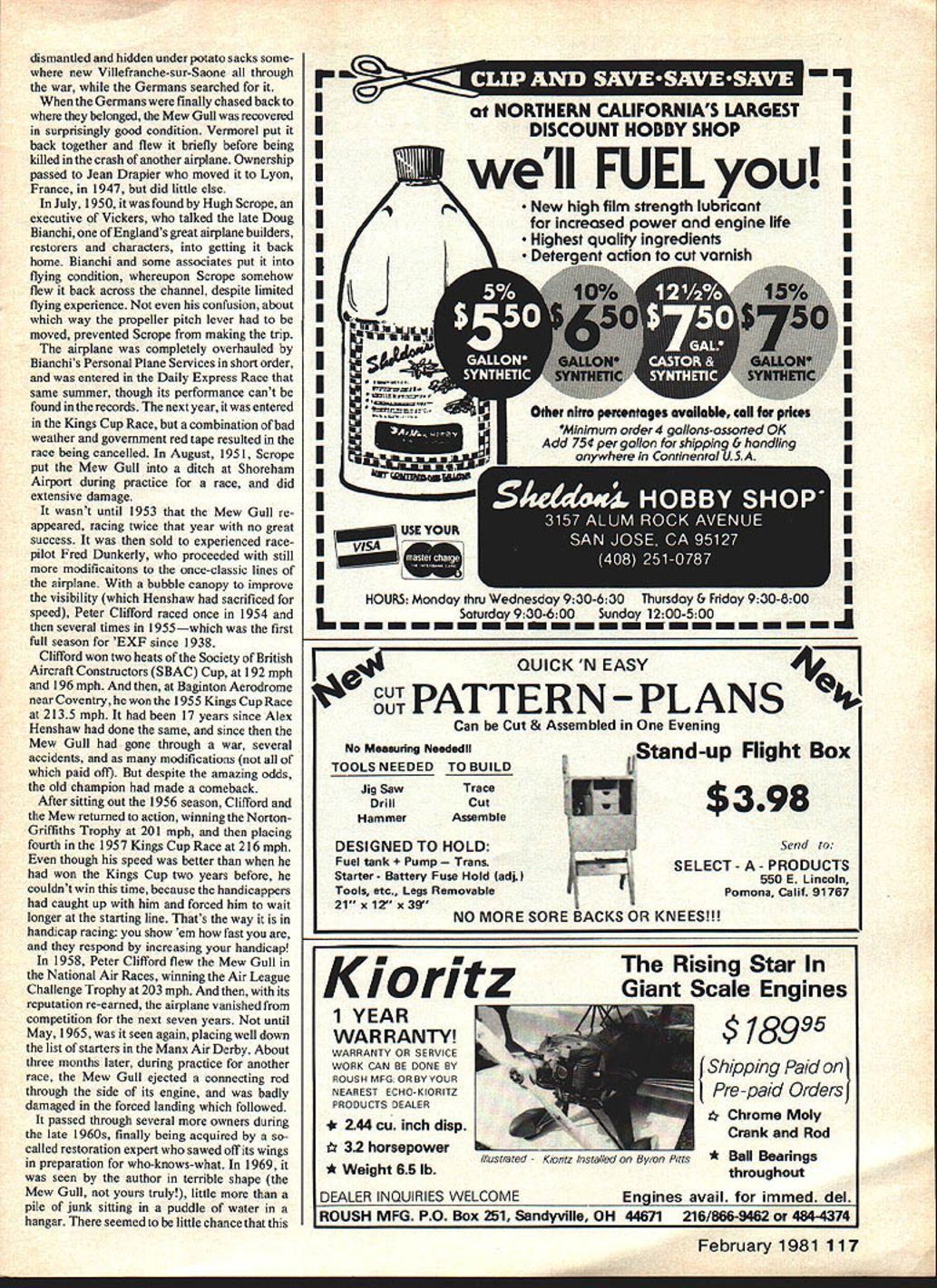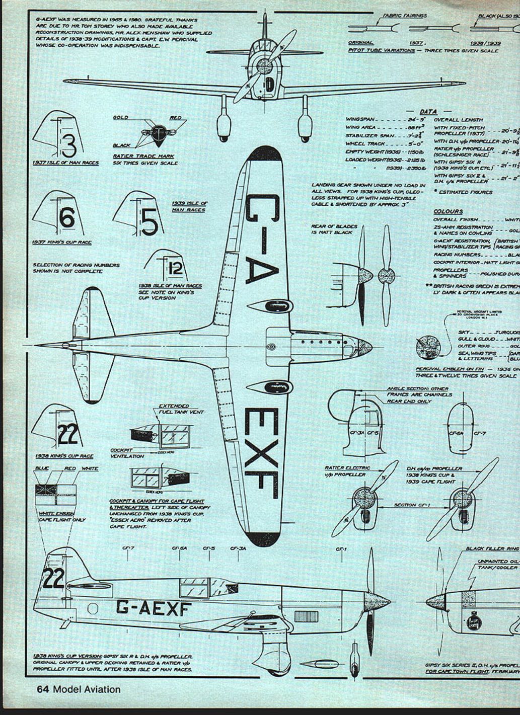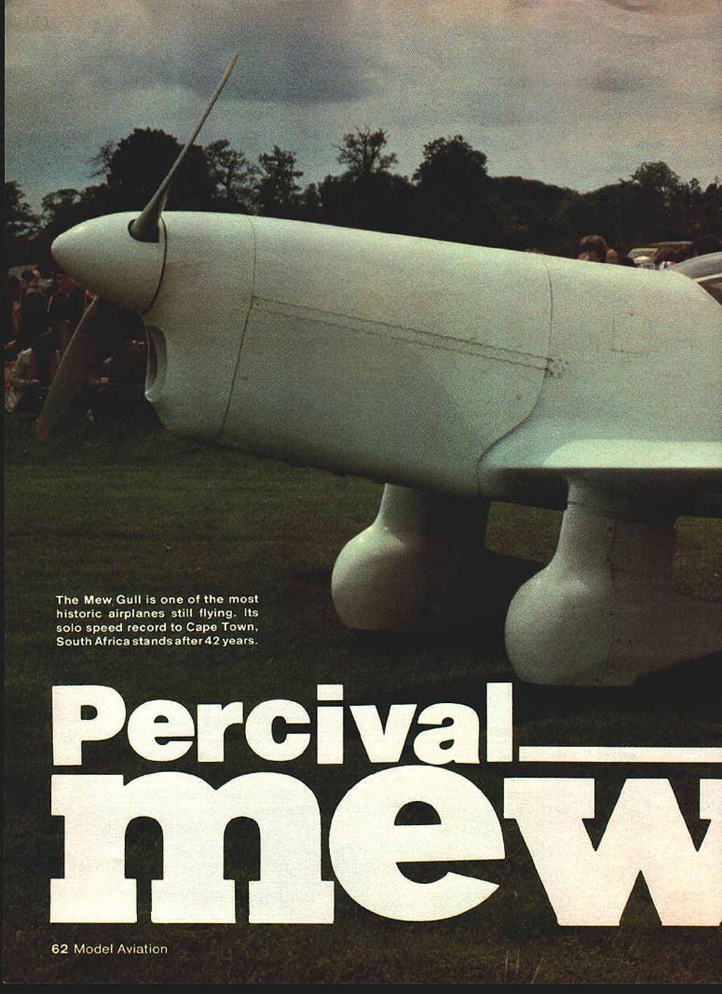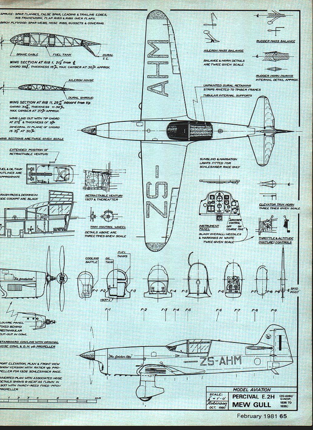 NO OCR TEXT NO OCR TEXT -AEiT WAS NEASUD hV FS GRATEfUL 7AASS ARE OLE TO MR Tf STORE WNO ALSO MADE AIdAILABLE RECONSTRUCTION DRAMNGS MR ALEX NENSMAW I0 SCPFLIED DETAILS V8 7CA77ONS LW PERCIVAL SE O-OPERA71ON WAS INDISPENSABLE BLAO PITOT TUBE VARIATIONS E TiNES GIVEN SCALE RATIER TRADE MARK S TINE S GIVEN SCALE 6AN RACES 1937 KINGS WPREE SELECTION RACING M9mDqs SIS NOT COMPLETE APEFL 193 R71GI CIJP RACE VEN77LAT7ON EAG0 LEFT SIDE CAIV LVRANGED IRDII 1935 A7FAVS CLP ESSEX AERD REMOVED AFTER CAPE fLIGHT CI6ACf-SCf-I IT 1/ 7/ BLLE RED WHITE \CAPE ILIGMT OALV / \ I o_L-AEXF Ij YSIXR ROPELLER OMSSNAL CAIV DECKING RETAINED RAI7ER ELLER fITTED UNTIL AFTER MAN RACES WINGSRAN94 3OVERALL LENGTH WING AREASB ft2 STABILIZER -- --74 V WHEEL TiACK5- oWITH Dh LLER-*OU EPATV hC 0936 - fl5Q RA77ERy* PROPELLER SENLESINGER -LOADED 4CDNT3E- S1Ib WITH GIPSYSIX ft- 0939- -9h t93Owl WITH GiPS sIXS DR ELLER LANDING AR SNEWH UNDER NO LOAD IN ALL WEWS FOR 1935 KiNGS OL OLED LEGS STRAPPED UP WIIH MIGN-TENSILE CABLE SITENEO BYAPPROI 3 REAR BLADES IS MATT BLACK ESTIMATED FIGURES QQ81 OVERALL fINISMWHITI ZSAMN REGISTRATION NAMES ON COWIJNG GAOcT REGaTRATIce IBRITISM WI14STAB1LIZER TiPS WNG NUNBER___ WCKPITINTERIOR4M77 LIGHTS PROPELLERS SPIIINER -- ISHEDOUP 5BR1775M RACING WDIe LV DARK OfTEN APPEARS BLAt OCOOVAt ASVA*AT UfT ROOVENOP PlACE SKYJURO IVAL EMBLEM DII FIN 01 THREETWELVE TIMES GIVEN SCALE FRAMES ARE CR4 NNELS REAR CLV CF3A Cf Si1 RATlER ELECTRICDR*p PROPELLER ELLER1935 ATNGS CUP 1939 CAPE IL IGMT -SECTION Cf-I- BLACKRRI TANK/COOLER CGAAINTEO OIL 4 r GIPSY 501 SERIES 2V AL 64 Model Aviation 1937 ISLE MAN RACES SPAR PLAM 144SE %6 JAB EDGES RIB P4P1 ItAP RIBS BRIGS OER flAPS ma pgyioo SPAR WEBS NOSE RIBS GUSSETS RING c~F RUDDER MASS BAL.,4 BRAKE CABLEFLEL TANK WING SECT/ONATAIBt 211 frau D 4 THICKNESS vs. MAX CAMBER AT o7 APPRO AILERON HINGE 7ZZZ7 DURAL SHROUD WING SECtION ATRIB II 29kdowV frsi tip aKIRD 34 THICANESS P1367. NAC CAMBER AT 377 LAID OUT WITH TIP CHORD ATa 77lICKPS OI 57 DHEORAL IN PLANE 0 CHORD IS 3j AT 307. 11MB SEC77OIG ARE TWICE GIVEN SCALE EATENDED 05177ON ACTABLE VENTURI A t41l~ VTLINES ARE ~iflAfr RASH-PADS& aVG IN-RETRACTABLE VENTUI DE COCA WITARE BLACK1937 & THEREAFTER WE TRIM CONTROL WI-PEEL DETALS ABOVE ARE THREE TINES GIVEN SCALE OU 7XED BEHIND ICCTANWR XJT OUT IN COWL F- TTT AILERON MASS BALANCE BALA1CE DETALS ARE TWICE GIVEN SCALE STRIPS RIVETED TO 77NBER IWANES 7WILAR INTFRN4L SUPPOA7S SUPIBLIAC NAWGA77ON LIGH7S I7TTED FOR SCHLESINGER RACE ONLV / QELEVATOR TRIM HORN .77E lINES GIVEN SC4LE IIIB7NLIMENTOR PANELCOA9SE TWICE GIVEN SCALE21 BLACK OVERAW NEEDLE MARKINGS IN WIWTTHROTTLE LALTITUDE K SKID PIIIDT POSE COWL ELLER 7 ELEVATIOM PLANS FRONT VIEW Fl-POW VERSION WITH RA77ER ELLER IOR l9 SChLESINGER RACE NVER7rD PLAN WITH ASSCCM7rD HOSE E7ILS SHOwS G-AEXFAS FLOWN WITH FAIRE V-REED flXED -MTEH ROPEL LEA I* 3 4 a*lOft MODEL AVIATION SCALE LLLi PERCIVAL E211 / I~I MEW GULL uary 1981 65 RUDDER HORN flIRING INTERNAL DETAIL APROPG D FUEL TANKS COOLING OIL BAtTLE ii3F-S - -6F-F-BF-p / III THE Mew Gull waits its stark white wings fuselage gleaming clear English sun Minutes go minutes still other airplanes flagged off Around long pylon-marked course rush piling up laps Mew Gull waits Finally after impossibly long time starter faces Mew Gulls pilot raises little green flag snaps smartly down Mew Gull accelerates briskly along neatly clipped grass runway skips couple times eases air begin its chase slower airplanes typical English handicap race latest long wait has ended its throttle familiar position allthe-way-forward sleek wooden airplane its 210-hp deHavilland Gipsy Queen straightsix charges over gentle countryside low air traffic rules common sense will allow time passes Austers Chip munks Cessnas Tiger Moths taken off minutes before Little little makes up time lost slower airplanes got carefully calculated starting advantages As last few laps long American standards pylon course pass beneath its slim tapered wings Mew Gull steadily moves up leader no few hundred yards race left passes alongside storms first place finish line comes view Now down hedge-hopping height Mew Gull its element streaking better 200 mph across aerodrome leaving ordinary airplanes its slipstream Its yet another win Percival Mew Gull G-AEXF Yet another chapter story began 1936 interrupted war some crashes just seems keep going story worlds senior racing airplanes quite possibly senior worlds engine-driven racing machinery what race car boat motorcycle has action 43 years still can win As race-planes go hardly famous Granville brothers GeeBees two famous heaps rubble barely year after first flew Mew Gull same sort screaming speed demon GeeBee its famous rivals yet some 200 hp could manage 250 mph straight level Mew Gull sure meant different kind racing short-course pylon events GeeBees excelled during brief lives Racing Europe 1 930s two kinds long-distance handicap though often combined first events like 1934 Robertson Race England Australia latter form pylon race over long courses great variety types airplanes once continues today differences speed balanced out handicapped starts races 30s ranged several laps 20-mile course round Britain races 1000 miles both types races Mew Gull all-time best British avia tion enthusiast remains airplanes brings forth great waves emotion like Spitfire Mosquito like two classic flying machines outstand ing its special line work among beautiful airplanes air Moreover first appeared Mew Gull faster active RAF fighter close prototype monoplanes would soon make news like Hawker Hurricane six Percival P6 Mew Gulls built firstG-ACNDflew March 22 1934 average 191 mph 800-mi Kings Cup Race less four months later piloted designer Edgar W Percival other race before being written off wrecked October much improved proto type followed also called G-ACND July 1935 won 1000-mi race Deauville France Cannes back average speed 188 mph 180-hp Regnier engine Edgar Percival flew 1935 Kings Cup Race won race