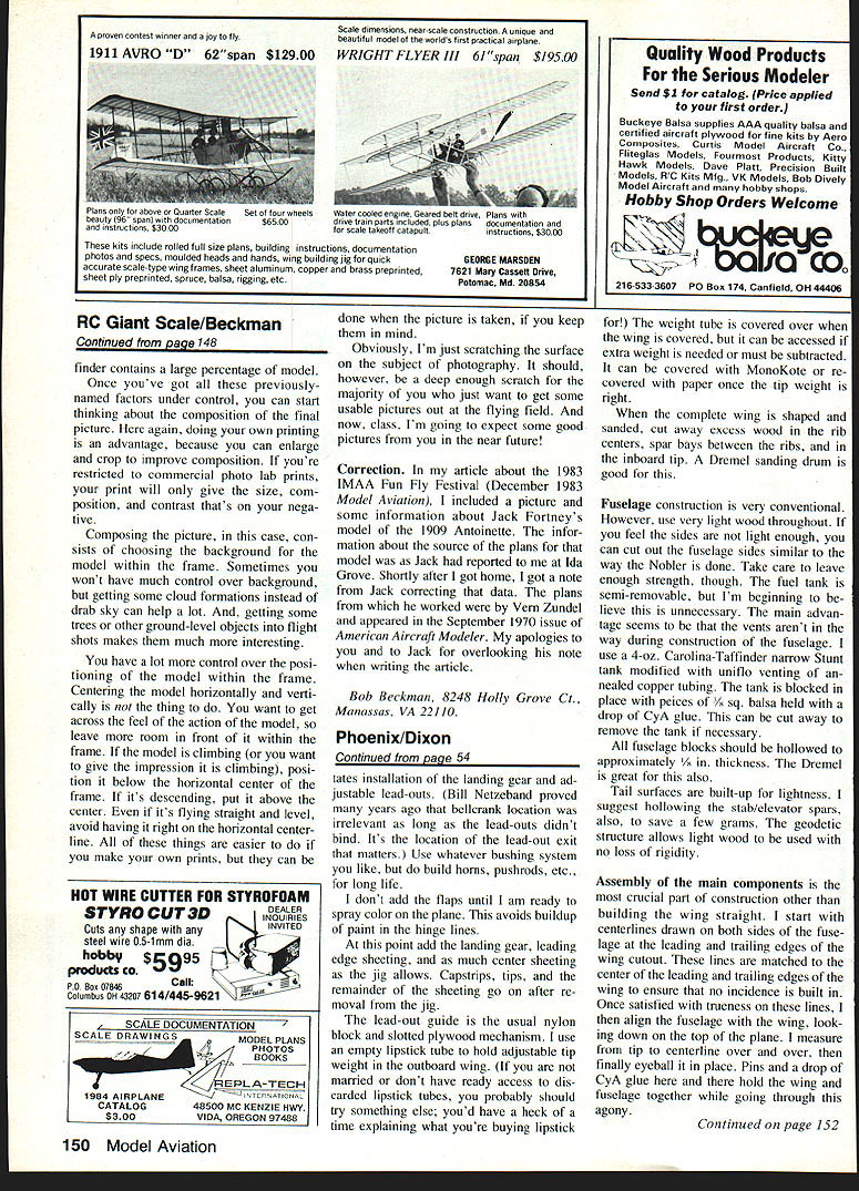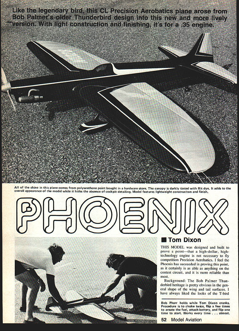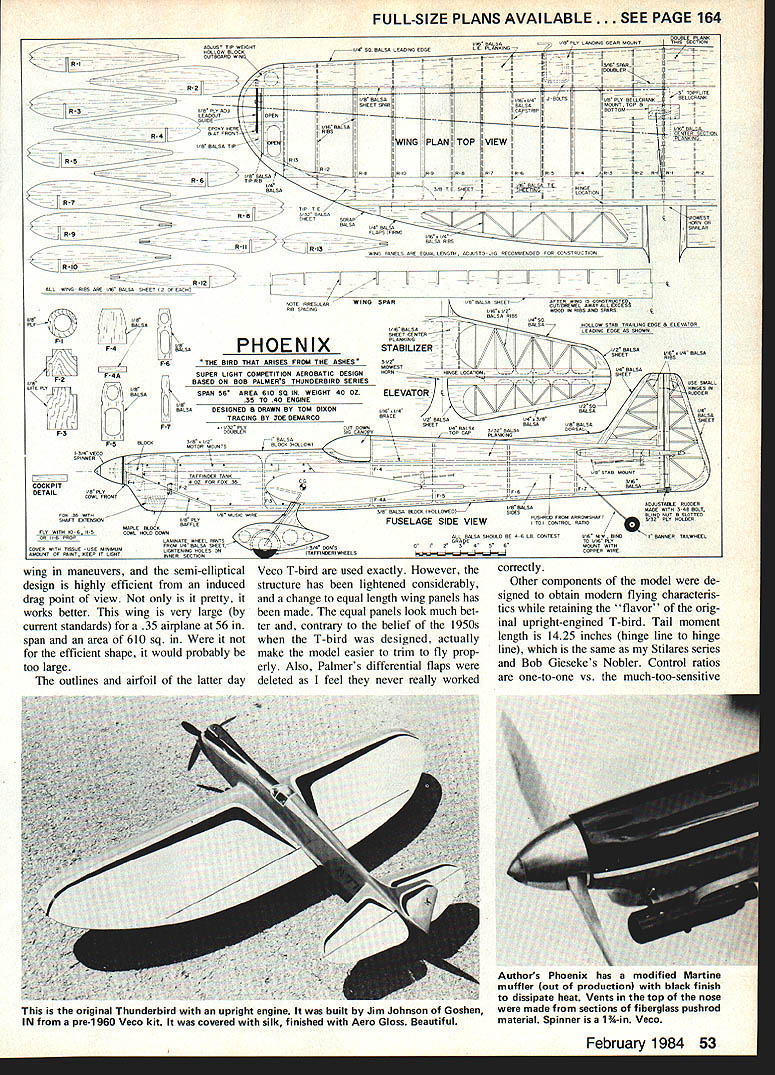 All shine plane comes polyurethane paint bought hardware store canopy darkly tinted Rit dye adds overall appearance model hides absence cockpit detailing Model features lightweight construciton finish ETom Dixon THIS MODEL designed built prove pointthat high-dollar hightechnology engine necessary fly competition Precision Aerobatics feel Phoenix has succeeded proving point certainly able anything contest circuit reliable Background The Bob Palmer Thun derbird heritage pretty obvious gen eral shape wing tail surfaces have always liked looks T-bird Bob Pharr holds Tom Dixon cranks Procedure choke twice flip few times areate fuel attach battery flip time start Works time ost FULL-SIZE PLANS AVAILABLE . SEE PAGE 164 RI R41L R-6 R-T R-IO ABJUST T P WEISOT00 BALSATh IRBPLT LANOtUS SEAR MOUNT HIS SECTION BOCLUB RCOCO1R4 SO BALSU COUSINS 0000C E PCUNBINS OUTBOABO WINF71---~llII ~-----------ThIIiIRW0SPABjH-71 R-ZiRIV _ _ - _S o RAJOOCTSIHPCY BECCEBOSO,S TYPEUCE ISUSOI IIROBCoP NRI LEABOCOOPEN--II CAPSORIPBOTBBR- EPOXY BOSEIRIERACSAIIIt SOB TOONO[RIBSIII I~jzjosoo VIPLUNEISS IRS BALSA TIPUGENrES SECTION IRS BALSANRIRIO40-SPBU0BSJo-sOSlB-A BY IRIHA TRO TO 00000 ~WRAT BALSAIF--01500II N-ASAT BULSA 000000 FOPS PIBUI-SIRIAR ~-I 0 IRA R-II1 JIR-13 WISE PANELS USE EQUAL CESUTO AU JYBO JIS BE ORRESOC FOR CUESTOL COlON R-I2 ALL WINS RIBS USE 00 BALSA SHEET OF FURY0 IRATE IBBEAULABWINS SPARRB BALSA 00000AFTER WINO IS CONSTROCEEB RB 5500190CUTROBEMOC 0000 ALL EXCESO IS IRAROAB IN RIBS ANO SPARS0 p BALSABOLLAW SPA B BRAILINO 0000 R ECRUABOR 7CEAAISO 00SF AS 500MW F4H PHOENIXSTABILIZER [v32][b-2-10-1-10]]BAEOTAM IAA BALSA F6THEBIRD THAT ARISES FROM THE ASHESN-IRA SPINNEBN —TAFFINSEB PARRI~ ~IIRB STAB MOJOR COCKPITA OS FAR FOB DETAILRB PLY COWL FRONT RIO MW I BOMNER TAILWBEOC ABOANT OF PAINT KEEP IT COOR LAMINATE RBEE PANOSI HONING BOLES ONIII RR4 SANS INNER SF00105TAFFINOORWSEELS ALL BALSA SHBA0 BE B B OPAPESO 0 0940S wing maneuvers semi-elliptical design highly efficient induced drag point view pretty works better wing very large current standards 35 airplane 56 span area 610 sq efficient shape would probably too large outlines airfoil latter day Veco T-bird used exactly However structure has lightened considerably change equal length wing panels has made equal panels look much bet ter contrary belief 1950s T-bird designed actually make model easier trim fly prop erly Also Palmers differential flaps deleted feel never really worked correctly Other components model de signed obtain modem flying characteris tics retaining flavor orig inal upright-engined T-bird Tail moment length 1425 inches hinge line hinge line same Stilares series Bob Giesekes Nobler Control ratios one-to-one vs much-too-sensitive Authors Phoenix has modified Martine muffler out production black finish dissipate heat Vents top nose original Thunderbird upright engine built Jim Johnson Goshen made sections fiberglass pushrod IN pre-1960 Veco kit covered silk finished Aero Gloss Beautiful material Spinner 1%-in Veco February 1984 53 /3l setups used Bob Palmer planes Bill Werwage Les Mc Donald have moved away 2/31 set ups engine inverted proper thrust line vertical CG relationship version turtledeck fuselage original T-bird maintained Actually credit general look plane goes Jerry Ross Florida used fly inverted-engine old-style T bird wheel pants similar Jerrys plane smaller wing first T-bird flew magnificently Un fortunately Jerry lost plane shed prop blade literally shook itself apart never built another subsequently droping out Stunt flying great loss An additional trimming feature have added adjustable rudder held place screw-in-slot arrangement bottom fuselage dont remember first saw method adjustment its light clean easy model rudder aft elevator adjustment allows optimum trimming maximum line tension minimum drag Construction begin wing heart design mess up either quit have just enough concentration left over try again Its discouraging build other components build warped wing strongly suggest using A-justo-jig similar system maintain alignment really cant imagine building wing jig Cut two ribs tem plates shown plans Match rib its counterpart opposite half Also generally eyeball ribs sure maintain proper taper step-down rib rib half spar should also matched pattern plans curves top bottom ends Join both halves spar before beginning wing construction Once satisfied ribs spar align ribs jig add spar yet gluing completely place Add 3/ sheet trailing edge cap use wide piece 3/ having drawn centerline length trailing edge rib pinned cap centering line perpendicular cap viewed above Once ribs lined up cement trailing edge cap CyA glue glue spar ribs sheet trailing edge extensions now added As-in trailing edge planking /4 sq leading edge jig check time time alignment being main tained Controls go next use 3-in Top Flite nylon bellcrank having never seen ad vantage esoteric systems being proposed lately bellcrank seems pretty far aft poses no problem located avoid cutting spar would weaken placement also facili Continued page 150 54 Model Aviation rudder adjustable via locking screw Wheel pants laminated /4 3/8 balsa ply slot Tail wheel combo Perfect Author used Dons Racing Wheels tire Banner hub Note stooge hook new ones Carolina-Taffinder work fineflying helper isnt around Dixon Stage Ill Fox 35 note different cylinder head Fuel tank 4A-oz Taffinder narrow uniflow venting Author replaced original brass tubing annealed copper improved vibration resistance e Pylon Brand C-D size eyelets Author feels eyelets can trap sold ering flux leading eventual corrosion breakage Adjustment details plan Above hoenIx nas classic lines low angle ot attack ground modern technique author placed 13th 1983 Nats Phoenix Right Its cleanup time Being used Fantastik 10% ammonia added Try keep excess fuel residue off polyurethane paints Repeated exposure will soften proven contest winner joy fly 1911 AVRO D 62snan 12QOfl Scale dimensions near-scale construction unique