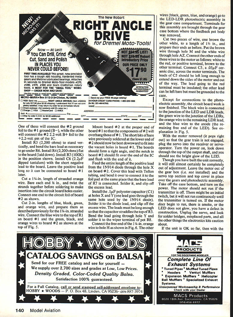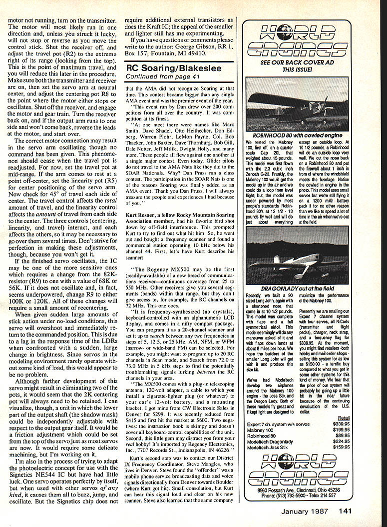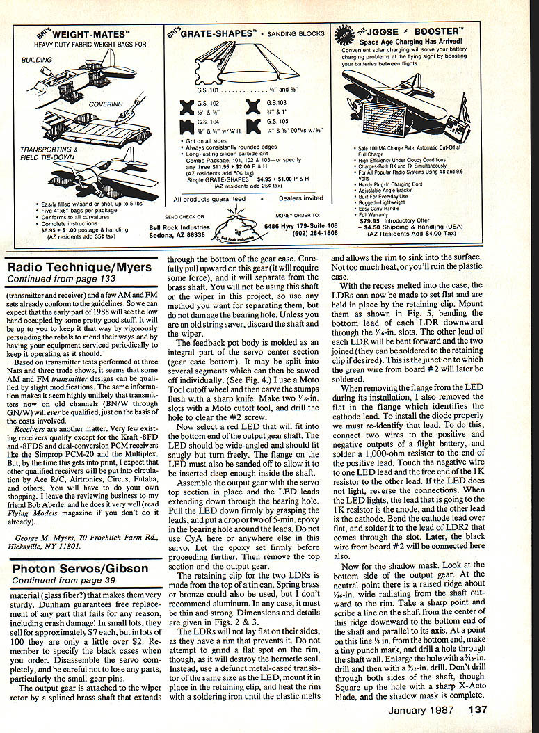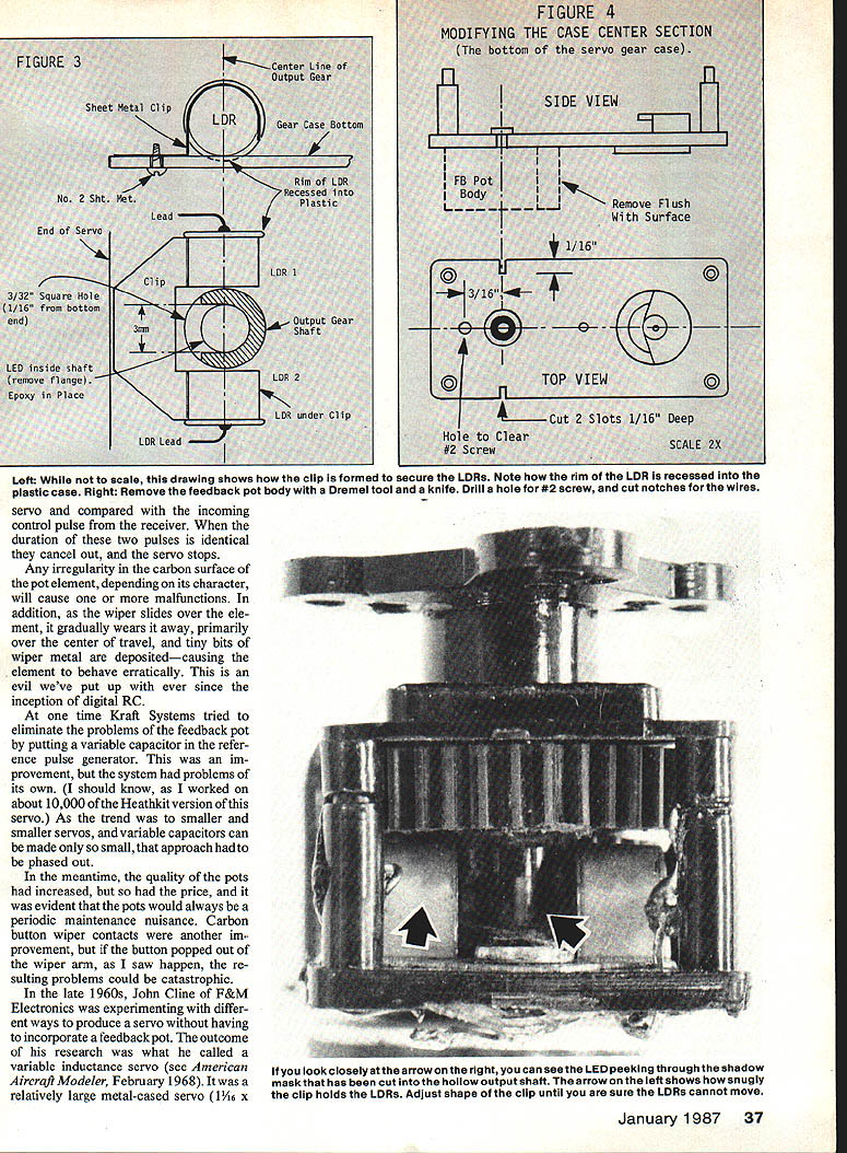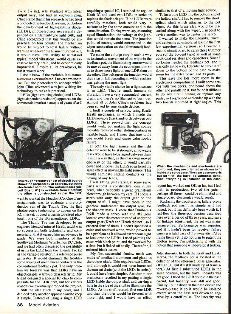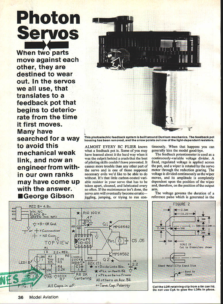 Photon Servos two parts move against other destined wear out servos use translates feedback pot begins deterio rate time first moves have searched way avoid mechanical weak link now engineer own ranks may have come up photoelectric feedback system built around Dunham mechanics feedback pot housing has removed arrow points out light-dependent resistors ALMOST EVERY RC FLIER knows what feedback pot Some may have learned about hard way culprit behind crash best piloting skills couldnt have prevented causes trouble other part servo supposed necessary evils wed like able Its little carbon-coated vari able resistor servo has taken apart cleaned lubricated often maintenance isnt done servo arm will eventually become erratic jiggling jumping trying run continuously happens can generally kiss model good-bye feedback potentiometer used continuously-variable voltage divider fixed regulated voltage applied across pot wiper rotated servo motor through reduction gearing voltage divided continuously wiper moves its amplitude completely dependent upon position wiper therefore position output arm voltage governs duration reference pulse generated 36 Model Aviation 1 p-- answer EGeorge Gibson CuttheLDR retaining clipfromatin can lid use CyA glue LDRs place servo compared incoming control pulse receiver duration two pulses identical cancel out servo stops Any irregularity carbon surface pot element depending its character will cause malfunctions addition wiper slides over ele ment gradually wears away primarily over center travel tiny bits wiper metal depositedcausing element behave erratically evil weve put up ever since inception digital RC time Kraft Systems tried eliminate problems feedback pot putting variable capacitor refer ence pulse generator un provement system problems its own should know worked about 10000 Heathkit version servo As trend smaller smaller servos variable capacitors can made small approach phased out meantime quality pots increased price evident pots would always periodic maintenance nuisance Carbon button wiper contacts another im provement button popped out wiper arm saw happen re sulting problems could catastrophic late 1 960s John Cline F&M Electronics experimenting differ ent ways produce servo having incorporate feedback pot outcome research what called variable inductance servo see American Aircraft Modeler February 1968 relatively large metal-cased servo 1 1/16 x January 1987 37 Li Left scale drawing shows clip formed secure LDRs Note rim LDR recessed plastic case Right Remove feedback pot body Dremel tool knife Drill hole #2 screw cut notches wires look closely atthe arrow right can seethe LED peeking through shadow mask has cut hollow output shaft arrow left shows snugly clip holds LDRs Adjust shape clip until sure LDRs cannot move 1 x 3 available linear output eight-pin plug Chine stated research tried photoelectric feedback system before development light-emitting diodes LEDs photoelectrics necessarily de pended filament-type light bulb Cline recognized would im practical four counts mechanism would subject total failure warning whenever filament burned out would have little ability withstand typical model vibrations would cause ex cessive battery drain economically impractical Despite its drawbacks felt would work dont know variable inductance servo ever marketed never saw use photoelectric concept John Cline advanced just waiting technology make practical LEDs light-emitting diodes LDRs light-dependent resistors appeared commercial market couple years after went work Heathkit Co assignments evaluate pre-pro duction run Thumb Tac first photoelectric tachometer appear RC market used transistor-sized pho tocell aforementioned LDRs Thumb Tac developed engineer friend Heath successful both technically com mercially earned him advance grade both members Southwest Michigan Whirlwinds RC Club often discussed possibility using LDR Thumb Tac kit variable resistor reference pulse generator would eliminate trouble some wiping mechanical contacts conventional feedback pot prob lem foresaw LDRs have objectionable warm-up characteristic friend designed special IC chip com pensate LDR drift various reasons eventually dropped project Still idea stuck head decided try another approach keep simple Instead using single LDR requiring special IC retained regnlar Kraft IC used two LDRs series replace feedback pot LDRS carefully matched both would vary resistance same amount same direction During warm-up assuming equal illumination voltage junc tion would remain same junction point course would correspond wiper connection eliminated feed back pot make voltage vary such way simulate movement wiper feedback pot illuminating source would moved away neutral position throw light LDR other voltage junction would rise fall according resistor getting light viable choice light source LED Theyre small immune vibration have very economical current drain theres no filament burn out Almost John Clines problems solved simple device built couple servos using Kraft/ Heath mechanics made LED movable back forth between two LDRs proved concept would work making light source movable required either sliding contacts flexible leads knew inevitably would break cause catastrophic failure both light source light detector stationary moveable mask would have rigged between such way mask moved way other would partially cover uncover LDRs get same effect moving light source would eliminate sliding contacts flexing leads sitting just staring some servo parts constructive idea head suddenly great brainstorm blew through between ears chose servo output gear output shaft might have room gearbox underneath output gear shadow mask knew Dunhams R&R made servo #2 gear located over motor instead under output gear Kraft Heath did ordered four hadnt specified color received white proved problem allowed extraneous light leak onto LDRs tried painting cases black paint worked time flaked off easily Thereafter ordered black cases fir