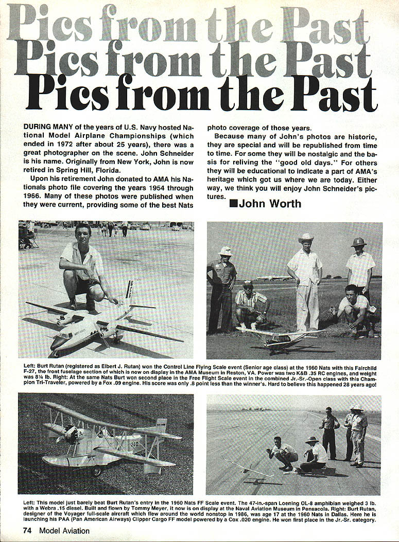tie SL romtflelyast DURING MANY years US Navy hosted Na tional Model Airplane Championships ended 1972 after about 25 years great photographer scene John Schneider name Originally New York John now retired Spring Hill Florida Upon retirement John donated AMA Na tionals photo file covering years 1954 through 1966 photos published current providing some best Nats photo coverage years Because Johns photos historic special will republished time time some will nostalgic ba sis reliving good old days others will educational indicate part AMAs heritage got us today Either way think will enloy John Schneiders pic tures John Worth Left Burt Rutan registered Elbert J Rutan won Control Line Flying Scale event Senior age class 1960 Nats Fairchild F-27 front fuselage section now display AMA Museum Reston VA Power two K&B 35 RC engines weight 8 lb Right same Nats Burt won second place Free Flight Scale event combined Jr-Sr-Open class Cham pion Tn-Traveler powered Fox 09 engine score 8 point less winners Hard believe happened 28 years ago Left This model just barely beat Burt Rutans entry 1960 Nats FF Scale event 47-in-span Loaning OL-8 amphibian weighed 3 lb Webra 15 diesel Built flown Tommy Meyer now display Naval Aviation Museum Pensacola Right Burt Rutan designer Voyager full-scale aircraft flew around world nonstop 1986 age 17 1960 Nats Dallas launching PAA Pan American Airways Clipper Cargo FF model powered Cox 020 engine won first place Jr-Sr category 74 Model Aviation PS CS