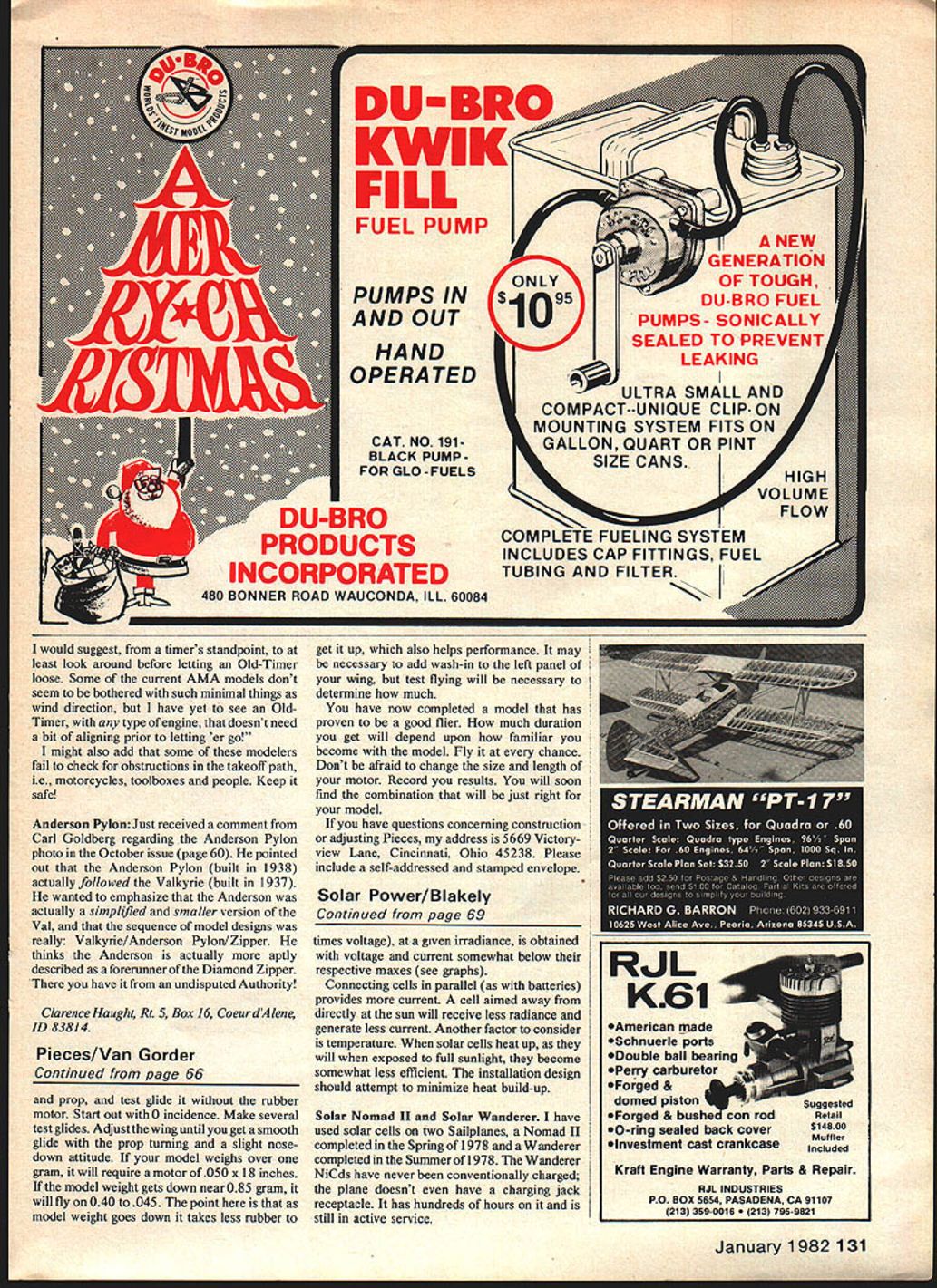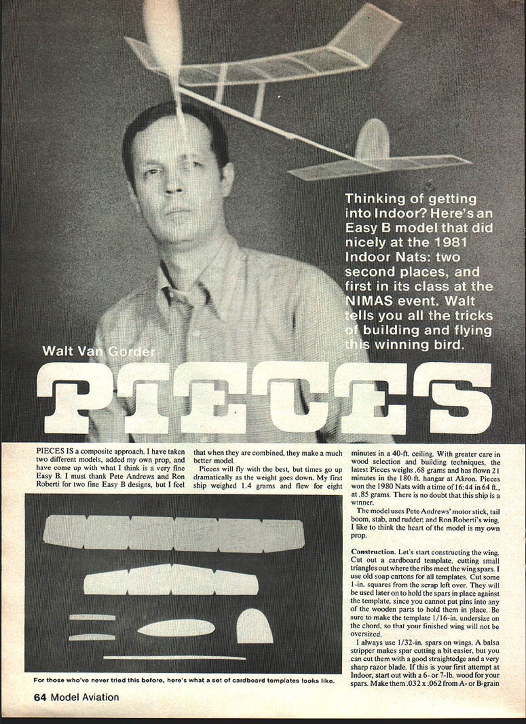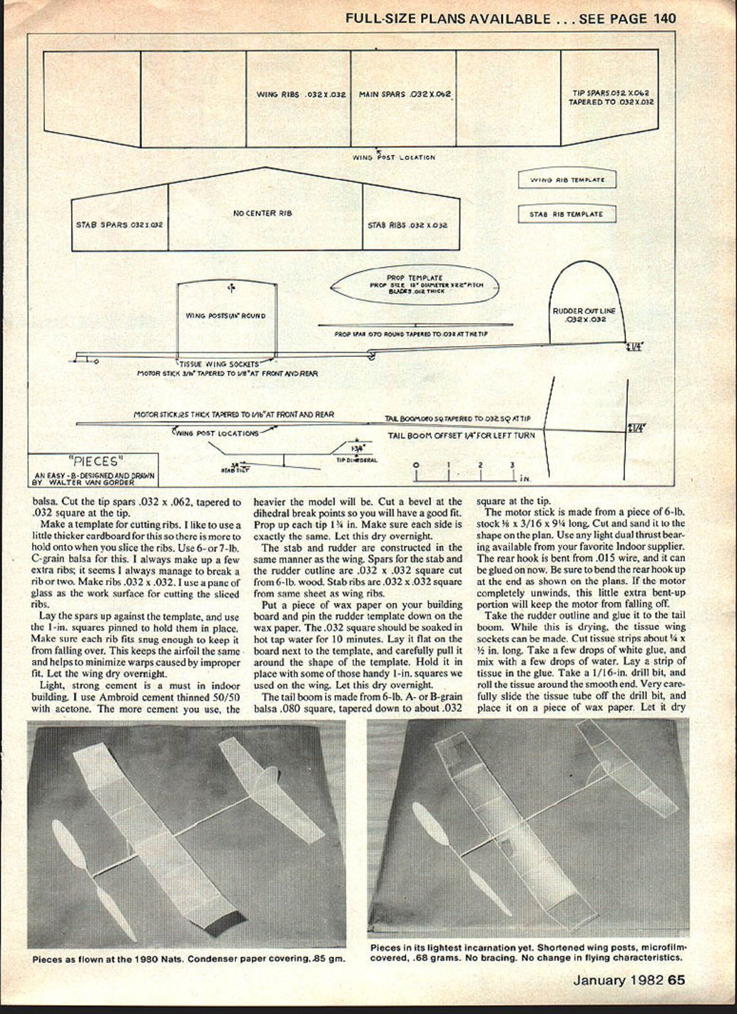 PIECES IS composite approach have taken combined make much two different models added own prop better model have come up what think very fine Pieces will fly best times go up Easy B must thank Pete Andrews Ron dramatically weight goes down first Roberti two fine Easy B designs feel ship weighed 14 grams flew eight minutes 40-ft ceiling greater care wood selection building techniques latest Pieces weighs 68 grams has flown 21 minutes 180-ft hangar Akron Pieces won 1980 Nats time 1644 64 ft 85 grams no doubt ship winner model uses Pete Andrews motor stick tail boom stab rudder Ron Robertis wing like think heart model own prop Construction Lets start constructing wing Cut out cardboard template cutting small triangles out ribs meet wing spars use old soap cartons templates Cut some 1-in squares scrap left over will used later hold spars place against template since cannot put pins wooden parts hold place sure make template 1/16-in undersize chord finished wing will oversized always use 1/32-in spars wings balsa stripper makes spar cutting bit easier can cut good straightedge very sharp razor blade first attempt Indoor start out 6- 7-lb wood spars Make 032 x 062 A- B-grain 64 Model Aviation whove never tried before heres what set cardboard templates looks like FULL-SIZE PLANS AVAILABLE . SEE PAGE 140 WING RIBS 0325032 MAIN SPARS 032 ItObS TIP SPARS052 X062 TAPERED TO 0322032 WING POST LOCATION NO CENTER RIB STAB SPARS 0323032STAB RIBS 032 3032 4 WING P0STSIhb ROUND tTISSUE WING SOCKETS~ MOTOR STEK 3/BTAPERED TO I/SAT FRONTANDREAR MOTOR STICKJ2E THOK TAPERED I/IbAT FRONT AND REAR GOING POST L0CATIONS~ PIECES EASY-B-DESIGNEOAND DRAWN BY WALTER I/AN GORDER SlAB TILT WING RIB TEMPLATE STAR RIB TEMPLATE PROP TEMPLATE PROP SIZE 2 OBMETER S2ZPITCR BLADES ea RUDDER OUTLINE 032v 032 PROP SPAR 070 ROUND TAPEREE TO 032 ATTRETIP TAIL BOOM OFFSET I/4FOR LEFT TURN TiP SI IDERAL 0123 II IN ThILROOMOBOSJAPERED TO 032S9 AITIP balsa Cut tip spars 032 x 062 tapered 032 square tip Make template cutting ribs like use little thicker cardboard hold Onto slice ribs Use 6-or 7-lb C-grain balsa always make up few extra ribs seems always manage break rib two Make ribs 032 x 03 2 use pane glass work surface cutting sliced ribs Lay spars up against template use 1-in squares pinned hold place Make sure rib fits snug enough keep falling over keeps airfoil same helps minimize warps caused improper fit Let wing dry overnight Light strong cement must indoor building use Ambroid cement thinned 50/50 acetone cement use heavier model will Cut bevel dihedral break points will have good fit Prop up tip 1 Make sure eBch side exactly same Let dry overnight stab rudder constructed same manner wing Spars stab rudder outline 032 x 032 square cut 6-lb wood Stab ribs 032 x 032 square same sheet wing ribs Put piece wax paper building board pin rudder template down wax paper 032 square should soaked hot tap water 10 minutes Lay flat board next template carefully pull around shape template Hold place some handy 1-in squares used wing Let dry overnight tail boom made 6-lb A- B-grain balsa 080 square tapered down about 032 square tip motor stick made piece 6-lb stock 16 x 9 long Cut sand shape plan Use light dual thrust bear ing available favorite Indoor supplier rear hook bent 015 wire can glued now sure bend rear hook up end shown plans motor completely unwinds little extra bent-up portion will keep motor falling off Take rudder outline glue tail boom drying tissue wing sockets can made Cut tissue strips about ng Take few drops white glue mix few drops water Lay strip tissue glue Take 1/16-in drill bit roll tissue around smooth end Very care fully slide tissue tube off drill bit place piece wax paoer Let dry January 198265 Pieces flown 1980 Nats Condenser paper covering 85 gin Pieces its lightest incarnation yet Shortened wing posts microfilmcovered 68 grams No bracing No change flying characteristics completely Care must taken covering such light models condenser paper covering material shrinks rather dramatically ex posed heat counter model should covered high temperature possible low-humidity box have built has cured problems encountered first model Heres build Buy cardboard box size can get about $150 local department store size use measures about 24 x 11 x 12 Lay box its side top opening facing Install two 150-watt light bulbs top box Attach piece clear plastic opening front box use four five large thumbtacks hold place Editors note sure bulbs dont touch box could have afire hands DRP use humidity gauge inside box can buy $200 local hardware store Turn lights drop plastic over front half hour humidity will down around 20 30 percent Put part covered box along piece condenser paper half hour remove excess moisture ready cover raise plastic about halfway up can get inside cover part working remove part have covered low-humidity box condenser paper will get limp Since will seldom fly humidity less 20 30 percent model will never warped because Closeup rear hook see text condenser paper Carving prop prop model 12in diameter 22-in pitch Take time because good prop crucial part models performance Make cardboard template blade cut two blades 6-lb 012in C-grain balsa Lightly sand blades No 600 sandpaper very careful sand blades direction prop spar made 6- 7-lb Vs sq x 6 sanded round 070 center tapering 032 tip done taping full sheet 80-grit sandpaper work board another toalarge sandingblock Sand off corners spar Without holding spar sand between two sheets sandpaper using diagonal circular motion spar will come out perfectly round after few strokes same method used making wing posts round Tapering ends prop spar 032 done after getting round tilting sanding block Bob Meuser article Model viation June 1977 prop shaft made 015 wire bent shape plan After shaft put center spar bend end 90-degree angle cut off excess Use drop Hot Stuff secure Soak blades hot tap water 15 minutes Lay prop form can use can bottle jar jug 5- 6-in diameter has smooth sid