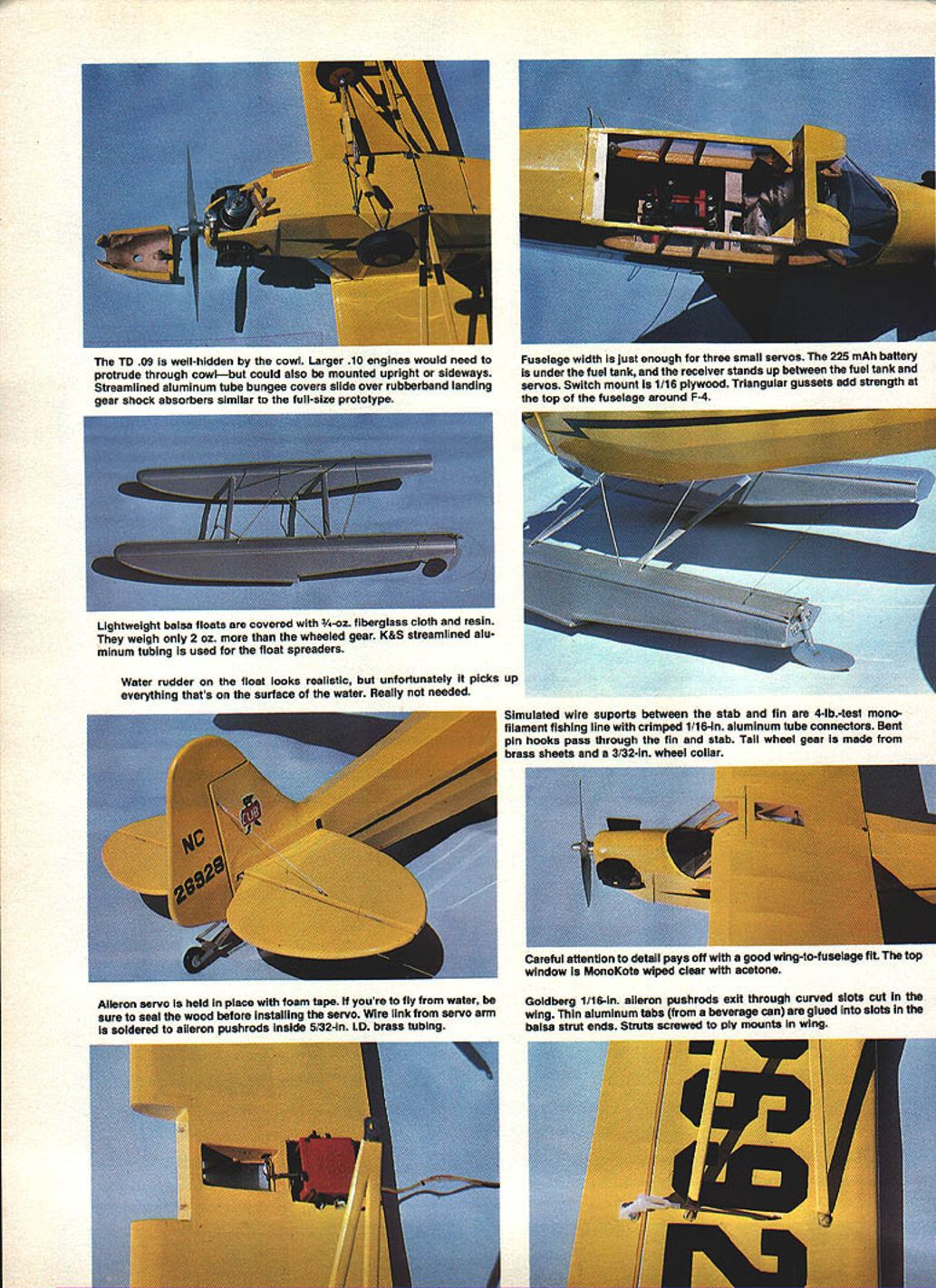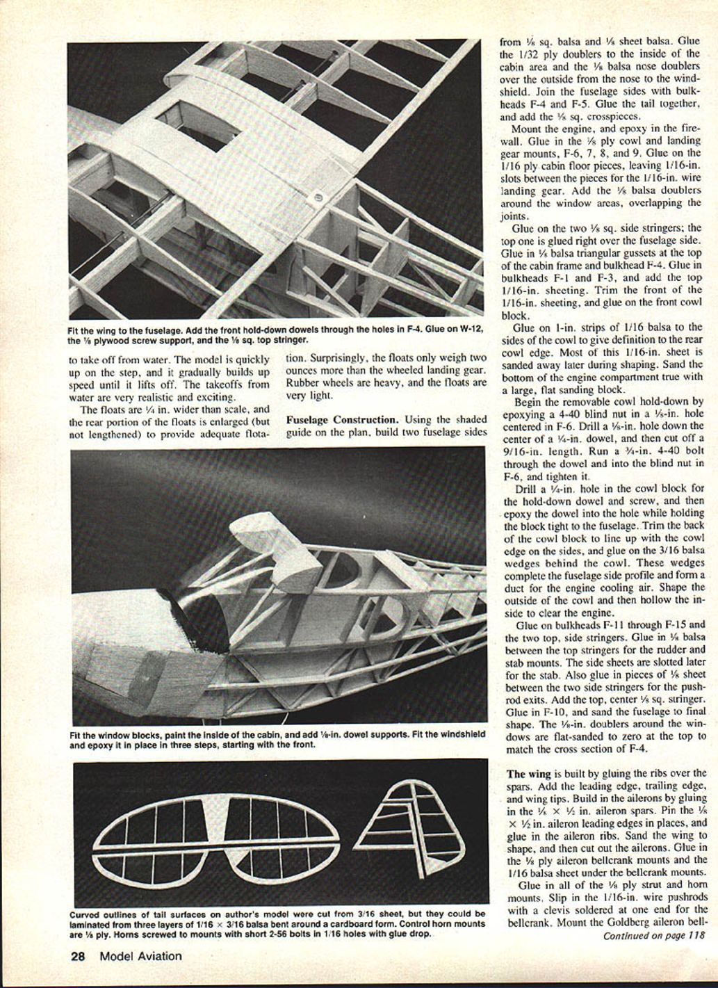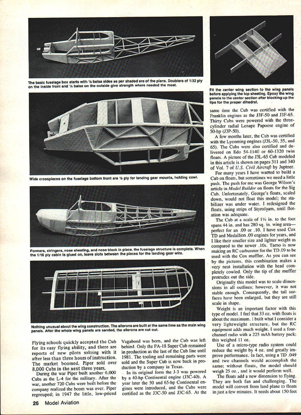 NO OCR TEXT NO OCR TEXT TD 09 well-hidden cowl Larger 10 engines would need protrude through cowlbut could also mounted upright sideways Streamlined aluminum tube bungee covers slide over rubberband landing gear shock absorbers similar full-size prototype Lightweight balsa floats covered 3A-oz fiberglass cloth resin weigh 2 oz wheeled gear K&S streamlined alu minum tubing used float spreaders Water rudder float looks realistic unfortunately picks up everything thats surface water Really needed Fuselage width just enough three small servos 225 mAh battery under fuel tank receiver stands up between fuel tank servos Switch mount 1/16 plywood Triangular gussets add strength top fuseiaae around F-4 Simulated wire suports between stab fin 4-lb-test monofilament fishing line crimped 1/16-in aluminum tube connectors Bent pin hooks pass through fin stab Tail wheel gear made brass sheets 3/32-in wheel collar Careful attention detail pays off good wing-to-fuselage fit top window MonoKote wiped clear acetone Aileron servo held place foam tape youre fly water Goldberg 1/16-in aileron puahrods exit through curved slots cut sure seal wood before installing servo Wire link servo arm wing Thin aluminum tabs beverage can glued slots soldered aileron puahrods inside 5/32-in lD brass tubing balsa strut ends Struts screwed ply mounts wing HANI 8UILT FRED REESES J-5 CUBU f DEAD RNGER MAIE O MINE -ALL IT ITI5WHILEk~ NEEDS ISART IIWASIN71JYONITP - 3/16 HOLD DOWN DOWELS BUILD ThiS ANDGOES INTHd yOU GO UP INTNE LY IT OFF LAKE WHILE SIT I4 CUB-WHEN rrs DONE EOGE NEXT BOAT - FLY ALONG SIDE IT YEAR -~JOY WIRE S PUSH PULL AlL 1/8 X 3/4 SPAR JOINER FRct4T 5/32ID BRASS TUBE SOLDEREDTO LINKAGE / / 1/16 FORMERS K 1/8 SHEET "n ALL RUDDER OUTUNE 1/16 X 3/16 RIBS 3/16 SQ POSTS 1/16 X 3/16 LAMINATiONS F 4 1/8 PLY BLKHEAD ROOT BLOCK FAIRING 2 I/B BALSA DOUBLERS Fl TO F3ONLY"N 1/32 PlY DOUBLERI/16SHEET FIREWALITO F 5 F2 VBPLY FIREWALL WITH I/B PLY AT BASEF / NOSE BLOCK II D09 ON TATONE MOUNT 1/4 DOWEL FOR 440 BOLT BALSA BLOCKS BALSA BLOCKS /LOCK BLOC1 3/8K 8 5ON 1A6 STREAMUNEPLYALUMTUBE 2 COWL C I/B PLY BRACE 3 PLACES -x 7 1/4 BALSATOP 1/32 PLY BOTTOM FY10 5 I/850 SPRAY RAILS 1/16 BOTrOMS AND SIDES I/B SQ BOTTOM KEEL I/BX 3/8 FRONT STRUT I/8X 1/4 REAR STRUT K STEERABLE WATER RUDDER NOT RETRACTABLE I/16WIRE STUTS THRU BLOCKS METAL HORN TO WATER RUDDER I/B SHEET FILLERS I/BSO ALL LONGERONSGOLDBERG BELLCRANK T EDGEAILTE SPARS LE STOCK I/BX 3A4FRONT SIR TO C 1/8 PLY STRUT MOUNT Hying schools quickly accepted Cub its easy flying ability reports new pilots soloing after less three hours instruction market boomed Piper sold over 8000 Cubs next three years During war Piper built another6OOO Cubs L-4 military After war another 720 Cubs built before company realized boom over Piper regrouped 1947 little low-priced Vagabond born Cub left behind Only PA-18 Super Cub remained production last Cub line until 1981 tooling remaining parts sold Super Cub now back pro duction company Texas its original form J-3 powered 40-hp Continental engine J3C-40 year later 50 65-hp Continental en gines introduced Cubs certified J3C-50 J3C-65 same time Cub certified Franklin engines 13F-50 13F-65 Thirty Cubs powered threecylinder radial Lenape Papoose engine 50-hp J3P-50 few months later Cub certified Lycoming engines J3L-50 55 65 Cubs also certified de livered Edo 54-1140 60-1320 twin floats picture J3L-65 Cub modeled article shown pages 311 340 Vol 7 US Civil Aircraft Juptner years have wanted build Cub floats sometimes need little push push George Wilsons article Model Builder floats Sig Cub Unfortunately Georges floats scaled down would float model sta bilizer under water redesigned floats using strips Styrof9am until flot ation adequate Cub scale 1 foot spans 44 has 280 sq wing area perfect 09 10 have used Cox TD Medallion 09 engines years like smaller size lighter weight compared newer Tamo now making RC carburetor TD09 used Cox muffler As can see pictures combination makes very neat installation head com pletely cowled Only tip muffler protrudes out side Originally model scale dimen sions outlines however stable enough Consequently tail sur faces have enlarged still scale shape Weight important factor type model feel 33 oz floats about maximum built what consider very lightweight structure RC equipment adds much weight used fourchannel radio 225 mAh battery pack weighed 11 oz Use micro-type radio system could reduce weight 4 oz greatly im prove performance fact using TD 049 two channels would accomplish same floats model should weigh 25 oz would perform well floats add new dimension flying both fun challenging model will convert land plane floats just few minutes needs about 150 feet 26 Model Aviation basic fuselage box stans i/s balsa sides per shaded plans Doublers 1/32 ply inside front 1/a balsa outside give strength needed Fit center wing section wing panels before applyIng top sheetIng Epoxy wing panels center section after blocking up tips proper dihedral Wide crosapleces tuselage Dottom front 1/s ply landing gear mounts holding cowl Formers stringers nose sheeting nose block place fuselage structure compiete wnen 1/16 ply cabin glued leave slots between pieces landing gear wire Nothing unusual about wing construction ailerons buIlt tne same time main wing panels After whole wing panels sanded aiierons cut out I I FThI FLOAT PARTS 1 SS 515 SPAR o p 2 USX I/S LIAESWI q i YMT Rue TIPS PROD I4 SlEET BALSA GB LANNATE 4 LAYERS HE L/RUI/S /605/4 JVSS WGIEIFRGWAROi/B PLYRHON AWSWAR-4RR-SWIWi -sR-S6-3SELLcBANSCA ALuo R~13WWSRIWAWAWARBWA n C0wA wa1 /IBS p FOPRE lAYTON A-SI RWItB I/BO 172 HEAR JODER I/BO I/S 9h WAR I/SU I/A i/B PLY UT MT y RWIASjIIWT____,n-S--a ________________________ ___ ICMYll I7 MTfl A-B SO I/A TRAILER ESGEROEDWAI SCULEI 1/5 EACH TIP 111114 NOBEAGE SHEDRAL 10 r ID FL-AFUR .FLA,FL-FL-BFLWPGP YOU USE RoOHER COSTROS INSTEAD OF AILEROSS EWAN PUSIWIOCWING TIP WAiin I/2 FL-IFL-SP13FL-AFL4FL4 FL-aFL____ F1\ /1/14 BALSA \1/S PLYLMEVIS HEAR FL