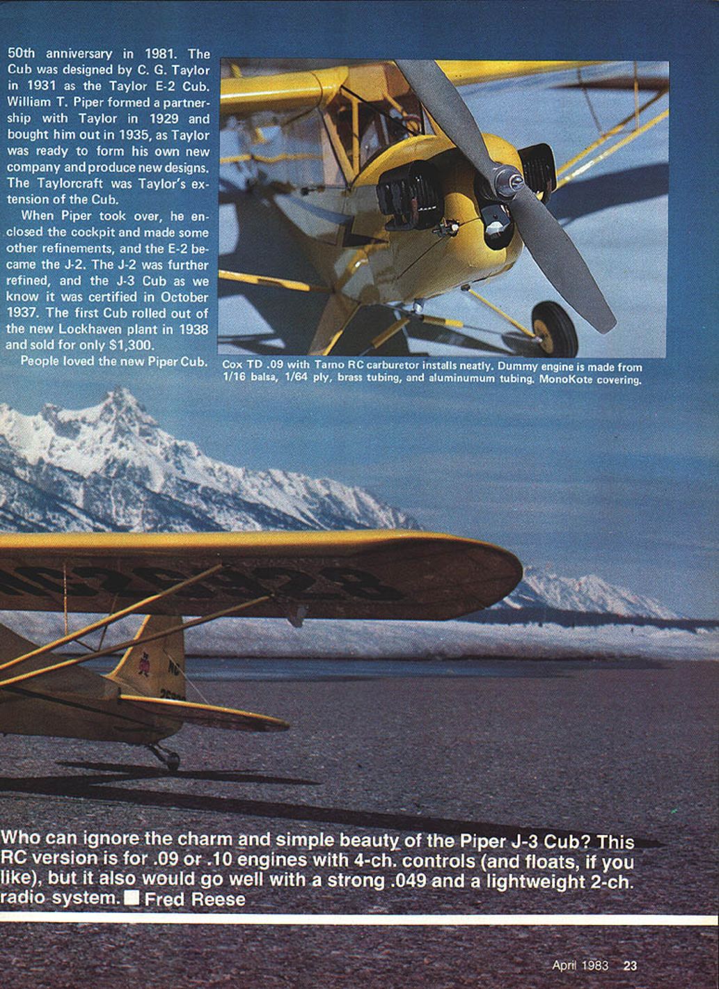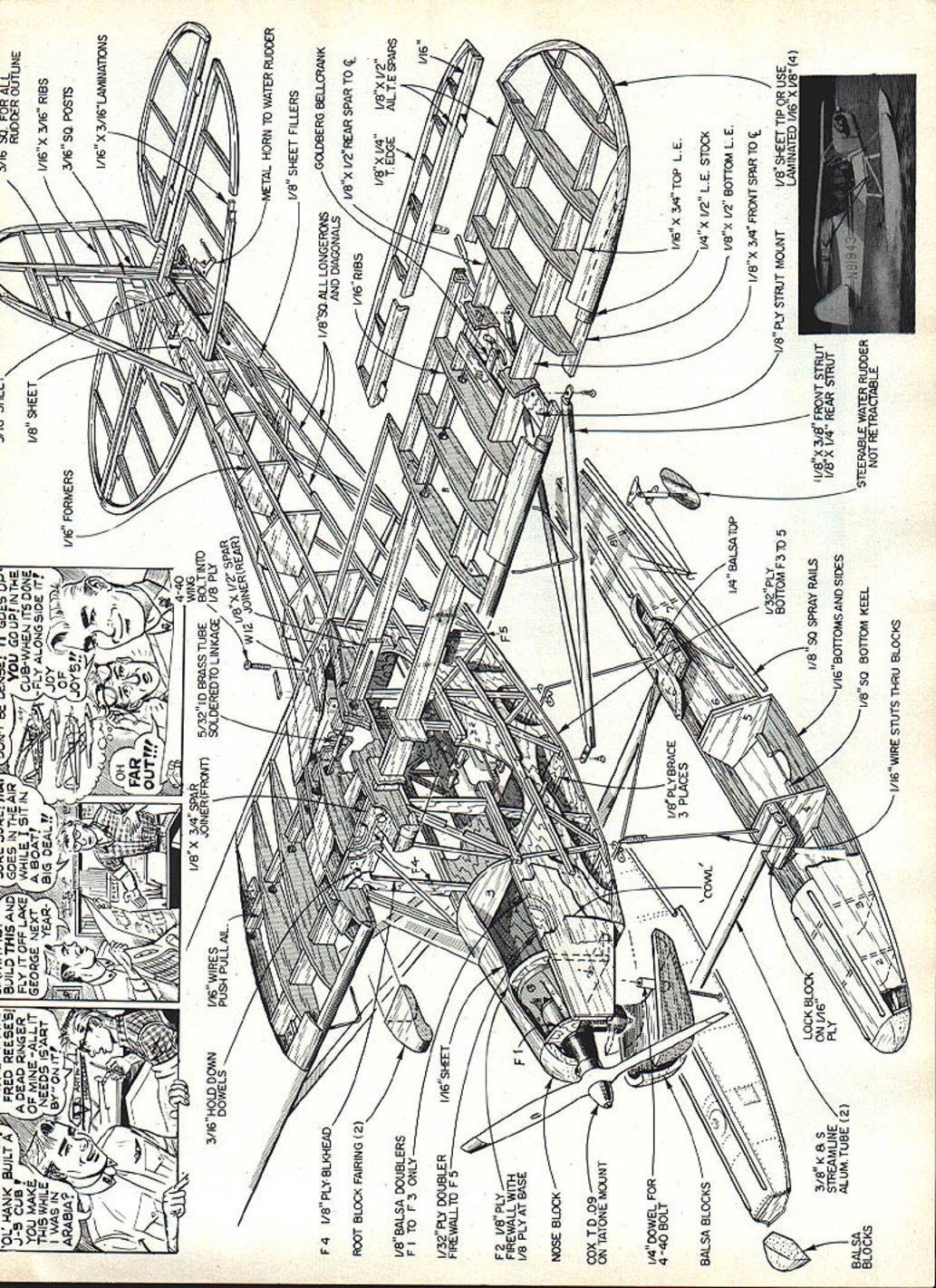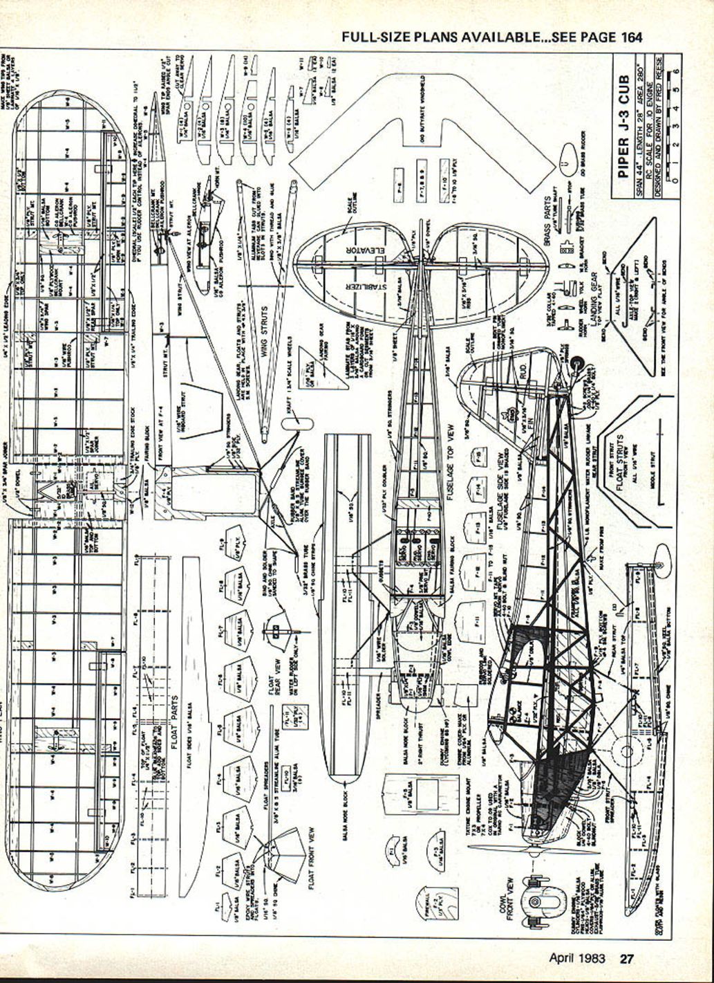 NO OCR TEXT NO OCR TEXT TD 09 well-hidden cowl Larger 10 engines would need protrude through cowlbut could also mounted upright sideways Streamlined aluminum tube bungee covers slide over rubberband landing gear shock absorbers similar full-size prototype Lightweight balsa floats covered 3A-oz fiberglass cloth resin weigh 2 oz wheeled gear K&S streamlined alu minum tubing used float spreaders Water rudder float looks realistic unfortunately picks up everything thats surface water Really needed Fuselage width just enough three small servos 225 mAh battery under fuel tank receiver stands up between fuel tank servos Switch mount 1/16 plywood Triangular gussets add strength top fuseiaae around F-4 Simulated wire suports between stab fin 4-lb-test monofilament fishing line crimped 1/16-in aluminum tube connectors Bent pin hooks pass through fin stab Tail wheel gear made brass sheets 3/32-in wheel collar Careful attention detail pays off good wing-to-fuselage fit top window MonoKote wiped clear acetone Aileron servo held place foam tape youre fly water Goldberg 1/16-in aileron puahrods exit through curved slots cut sure seal wood before installing servo Wire link servo arm wing Thin aluminum tabs beverage can glued slots soldered aileron puahrods inside 5/32-in lD brass tubing balsa strut ends Struts screwed ply mounts wing HANI 8UILT FRED REESES J-5 CUBU f DEAD RNGER MAIE O MINE -ALL IT ITI5WHILEk~ NEEDS ISART IIWASIN71JYONITP - 3/16 HOLD DOWN DOWELS BUILD ThiS ANDGOES INTHd yOU GO UP INTNE LY IT OFF LAKE WHILE SIT I4 CUB-WHEN rrs DONE EOGE NEXT BOAT - FLY ALONG SIDE IT YEAR -~JOY WIRE S PUSH PULL AlL 1/8 X 3/4 SPAR JOINER FRct4T 5/32ID BRASS TUBE SOLDEREDTO LINKAGE / / 1/16 FORMERS K 1/8 SHEET "n ALL RUDDER OUTUNE 1/16 X 3/16 RIBS 3/16 SQ POSTS 1/16 X 3/16 LAMINATiONS F 4 1/8 PLY BLKHEAD ROOT BLOCK FAIRING 2 I/B BALSA DOUBLERS Fl TO F3ONLY"N 1/32 PlY DOUBLERI/16SHEET FIREWALITO F 5 F2 VBPLY FIREWALL WITH I/B PLY AT BASEF / NOSE BLOCK II D09 ON TATONE MOUNT 1/4 DOWEL FOR 440 BOLT BALSA BLOCKS BALSA BLOCKS /LOCK BLOC1 3/8K 8 5ON 1A6 STREAMUNEPLYALUMTUBE 2 COWL C I/B PLY BRACE 3 PLACES -x 7 1/4 BALSATOP 1/32 PLY BOTTOM FY10 5 I/850 SPRAY RAILS 1/16 BOTrOMS AND SIDES I/B SQ BOTTOM KEEL I/BX 3/8 FRONT STRUT I/8X 1/4 REAR STRUT K STEERABLE WATER RUDDER NOT RETRACTABLE I/16WIRE STUTS THRU BLOCKS METAL HORN TO WATER RUDDER I/B SHEET FILLERS I/BSO ALL LONGERONSGOLDBERG BELLCRANK T EDGEAILTE SPARS LE STOCK I/BX 3A4FRONT SIR TO C 1/8 PLY STRUT MOUNT Hying schools quickly accepted Cub its easy flying ability reports new pilots soloing after less three hours instruction market boomed Piper sold over 8000 Cubs next three years During war Piper built another6OOO Cubs L-4 military After war another 720 Cubs built before company realized boom over Piper regrouped 1947 little low-priced Vagabond born Cub left behind Only PA-18 Super Cub remained production last Cub line until 1981 tooling remaining parts sold Super Cub now back pro duction company Texas its original form J-3 powered 40-hp Continental engine J3C-40 year later 50 65-hp Continental en gines introduced Cubs certified J3C-50 J3C-65 same time Cub certified Franklin engines 13F-50 13F-65 Thirty Cubs powered threecylinder radial Lenape Papoose engine 50-hp J3P-50 few months later Cub certified Lycoming engines J3L-50 55 65 Cubs also certified de livered Edo 54-1140 60-1320 twin floats picture J3L-65 Cub modeled article shown pages 311 340 Vol 7 US Civil Aircraft Juptner years have wanted build Cub floats sometimes need little push push George Wilsons article Model Builder floats Sig Cub Unfortunately Georges floats scaled down would float model sta bilizer under water redesigned floats using strips Styrof9am until flot ation adequate Cub scale 1 foot spans 44 has 280 sq wing area perfect 09 10 have used Cox TD Medallion 09 engines years like smaller size lighter weight compared newer Tamo now making RC carburetor TD09 used Cox muffler As can see pictures combination makes very neat installation head com pletely cowled Only tip muffler protrudes out side Originally model scale dimen sions outlines however stable enough Consequently tail sur faces have enlarged still scale shape Weight important factor type model feel 33 oz floats about maximum built what consider very lightweight structure RC equipment adds much weight used fourchannel radio 225 mAh battery pack weighed 11 oz Use micro-type radio system could reduce weight 4 oz greatly im prove performance fact using TD 049 two channels would accomplish same floats model should weigh 25 oz would perform well floats add new dimension flying both fun challenging model will convert land plane floats just few minutes needs about 150 feet 26 Model Aviation basic fuselage box stans i/s balsa sides per shaded plans Doublers 1/32 ply inside front 1/a balsa outside give strength needed Fit center wing section wing panels before applyIng top sheetIng Epoxy wing panels center section after blocking up tips proper dihedral Wide crosapleces tuselage Dottom front 1/s ply landing gear mounts holding cowl Formers stringers nose sheeting nose block place fuselage structure compiete wnen 1/16 ply cabin glued leave slots between pieces landing gear wire Nothing unusual about wing construction ailerons buIlt tne same time main wing panels After whole wing panels sanded aiierons cut out I I FThI FLOAT PARTS 1 SS 515 SPAR o p 2 USX I/S LIAESWI q i YMT Rue TIPS PROD I4 SlEET BALSA GB LANNATE 4 LAYERS HE L/RUI/S /605/4 JVSS WGIEIFRGWAROi/B PLYRHON AWSWAR-4RR-SWIWi -sR-S6-3SELLcBANSCA ALuo R~13WWSRIWAWAWARBWA n C0wA wa1 /IBS p FOPRE lAYTON A-SI RWItB I/BO 172 HEAR JODER I/BO I/S 9h WAR I/SU I/A i/B PLY UT MT y RWIASjIIWT____,n-S--a ________________________ ___ ICMYll I7 MTfl A-B SO I/A TRAILER ESGEROEDWAI SCULEI 1/5 EACH TIP 111114 NOBEAGE SHEDRAL 10 r ID FL-AFUR .FLA,FL-FL-BFLWPGP YOU USE RoOHER COSTROS INSTEAD OF AILEROSS EWAN PUSIWIOCWING TIP WAiin I/2 FL-IFL-SP13FL-AFL4FL4 FL-aFL____ F1\ /1/14 BALSA \1/S PLYLMEVIS HEAR FL