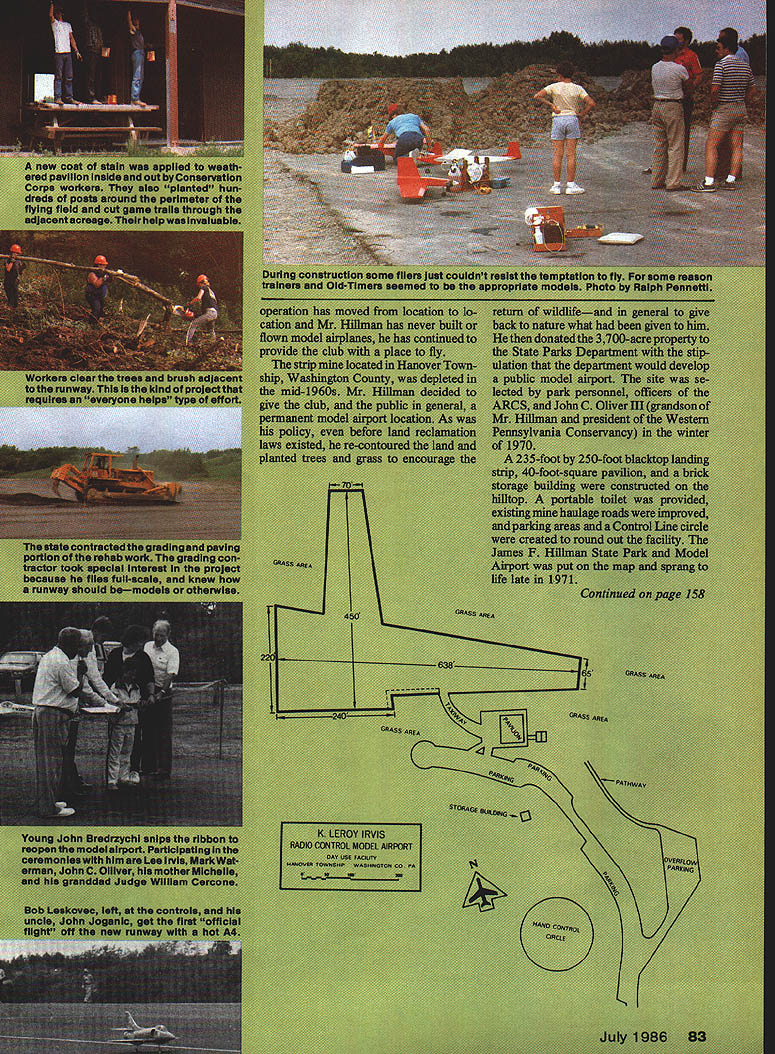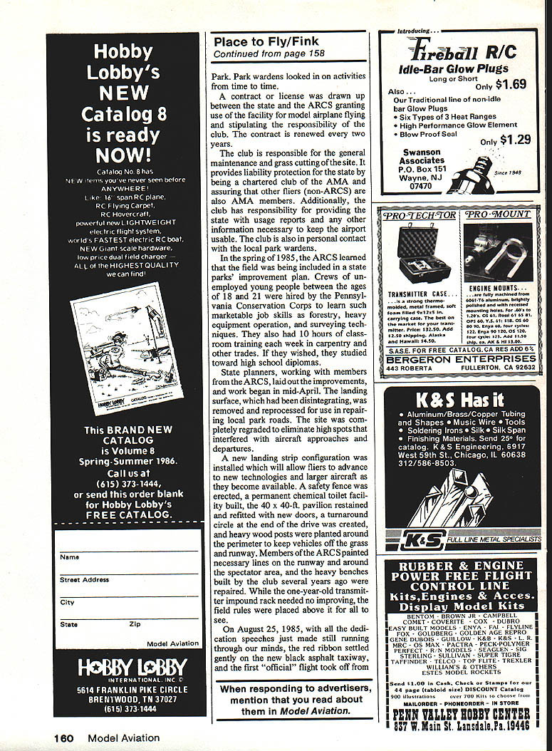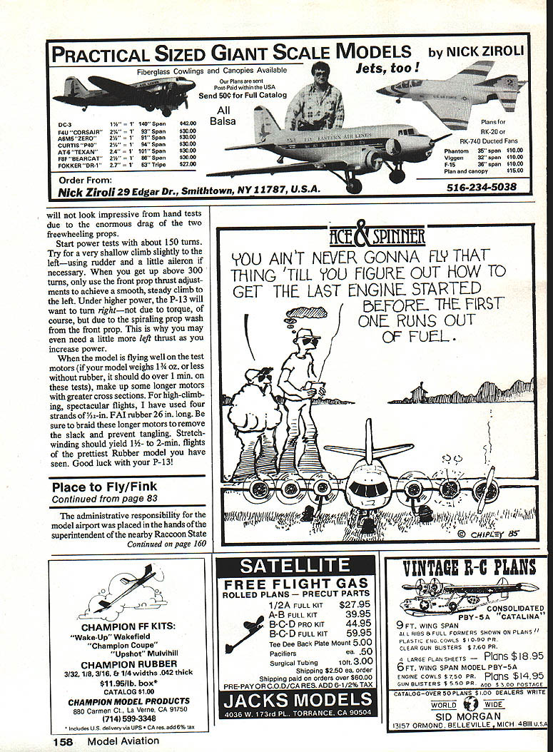 NO OCR TEXT NO OCR TEXT PRACTICAL SIZED GIANT —1140 Span 2 —193 Span 191 Span 194 Span 24 1101 Span 2W 186 Span 27 163 Tripe Igs Canopies Available Plans sent Post-Paid within USA Send 50 Full Catalog Balsa Nick Ziroli 29 Edgar Dr Smithtown NY 11787 USA MODELS byNICKZIROLI 516-234-5038 will look impressive hand tests due enormous drag two freewheeling props Start power tests about 150 turns Try very shallow climb slightly leftusing rudder little aileron necessary get up above 300 turns use front prop thrust adjust ments achieve smooth steady climb left Under higher power p-i 3 will want turn rightnot due torque course due spiraling prop wash front prop may need little left thrust increase power model flying well test motors model weighs 1 3/4 oz less rubber should over 1 mm tests make up some longer motors greater cross sections high-climb ing spectacular flights have used four strands of%2-in FAI rubber 26 long sure braid longer motors remove slack prevent tangling Stretchwinding should yield 1- 2-mm flights prettiest Rubber model have seen Good luck p-i 3 Place Fly/Fink Continued page 83 administrative responsibility model airport placed inthe hands superintendent nearby Raccoon State Continued page 160 1 0a CHAMPION FF KITS Wake-Up Wakefield Champion Coupe Upshot Mulvihill CHAMPION RUBBER 3/32 1/83/16 & 114 widths 042 thick $1195/lb box* CATALOG $100 CHAMPION MODEL PRODUCTS 880 Carmen Ct La Verne CA 91750 714 599-3348 Includes U 5 delivery va UPS s add 6% tax 158 Model Aviation YOU AINT N[VLR GONNA ThING TILL YOU GET THE LAST rE-EE ROLLED PLANST PARi 1/2A FULL KIT$2795 / A-B FULL KIT 3995 B-C-D PRO KIT4495 B-C-D FULL KIT5995 Tee Dee Back Plate Mount 500 Pacifiersea 50 Surgical Tubing1 Ott 300 Shipping $250 ea order Shipping paid orders over $6000 PRE-PAY OR COD/CA RES ADD 8-1/2% TAX C~'S THAT FIGURE OUT HOW TO WGME STARTED FORF- ThE FISY OM RUMS OUT OF FUEL 15$ / V - cHAoIny 5VINTAOE R-C FL1 CONSOLIDATED ~PBY-5A~CATALINA 9FT WING SPAN ALL RIBS 6 FULL rORMERS SHOWN ON PLANS11 PLASEIC ENOCOWLE $1090 PR CLEAR GUN BLISTERS $ 760 PR 4 LARGE PLAN SHEETS s $ 895 6FT WING SPAN MODEL PBY-5A ENGINE COWLS $750 PR Plans $1495 GUN BLISTERS $ 550 PR ADO $300 P0OT5F CATALOGOVER SOPLANS $100 DEALERS WRITE WE @WE SID MORGAN 13157 ORMONO BELLE VILLE MICH 48111 051 DC-3$4200 F4U CORSAIR$3000 ASMS ZERO$3000 CURTIS P40$3000 AT-S TEXAN$3000 F8F BEARCAT$3000 FOKKERDR-1$2700 Order Plans RK-20 RK-740 Oucted Fans Phantom35 span$1000 Viggen32 apan$1000 F-lB36 apan$1000 Plan canopy$1500 - n Place Fly/Fink Continued page 158 Park Park wardens looked activities time time contract license drawn up between state ARCS granting use facility model airplane flying stipulating responsibility club contract renewed two years club responsible general maintenance grass cutting site provides liability protection state being chartered club AMA assuring other fliers non-ARCS also AMA members Additionally club has responsibility providing state usage reports other information necessary keep airport usable club also personal contact local park wardens spring 1985 ARCS learned field being included state parks improvement plan Crews un employed young people between ages 18 21 hired Pennsyl vania Conservation Corps learn such marketable job skills forestry heavy equipment operation surveying tech niques also 10 hours class room training week carpentry other trades wished studied toward high school diplomas State planners working members ARCS laid out improvements work began mid-April landing surface disintegrating removed reprocessed use repair ing local park roads site com pletely regraded eliminate high spots interfered aircraft approaches departures new landing strip configuration installed will allow fliers advance new technologies larger aircraft become available safety fence erected permanent chemical toilet facil ity built 40 x 40-ft pavilion restained refitted new doors turnaround circle end drive created heavy wood posts planted around perimeter keep vehicles off grass runway Members ARCS painted necessary lines runway around spectator area heavy benches built club several years ago repaired one-year-old transmit ter impound rack needed no improving field rules placed above see August 25 1985 dedi cation speeches just made still running through minds red ribbon settled gently new black asphalt taxiway first official flight took off responding advertisers mention read about Model Aviation 160 Model Aviation Introducing. ErebcIII RIC Idle-Bar Glow Plugs Long Short Only $169 Also. Traditional line non-idle bar Glow Plugs Six Types 3 Heat Ranges High Performance Glow Element Blow Proof Seal Only $129 Swanson Associates PO Box 151 ne NJ 07470 CPROTECHTOR TRANSMITTER CASE. strong thermo molded metal franted soft foam filled qoIZst carrying cats bett market trans miSter price S3250 Add S250 shipping Alaska Hawaii 54tO SASE FOR FREE cATALOGcA RESADD6 BERGERON ENTERPRISES 443 ROBERTAFuLLERTON CA 92632 LUblilL mUUilil y machined 606116 aisminum brightiy pouched recetend mounting hems 605 120s 0561 COtti 61 6581 OPt 60 YS 61 518 05 60 80 90 Enya 60 four cycles 522 cnya 90 120 OS 120 four cysie 525 Add titO ship Ca AK & Hi 5300 Name Street Address City StateZip ESTES MODEL Seed $100 Cash Check Stamps 44 page tabloid sloe DISCOUNT Catalog 900 illustrations over 700 Kits choose MAiLORDER PHONEORDER IN STORE PENN VALLEY HONEY CENTER 937 1 Kai St Lansdale1Fa 10449