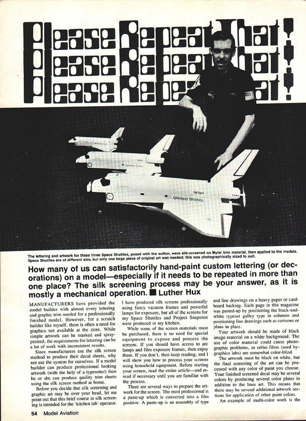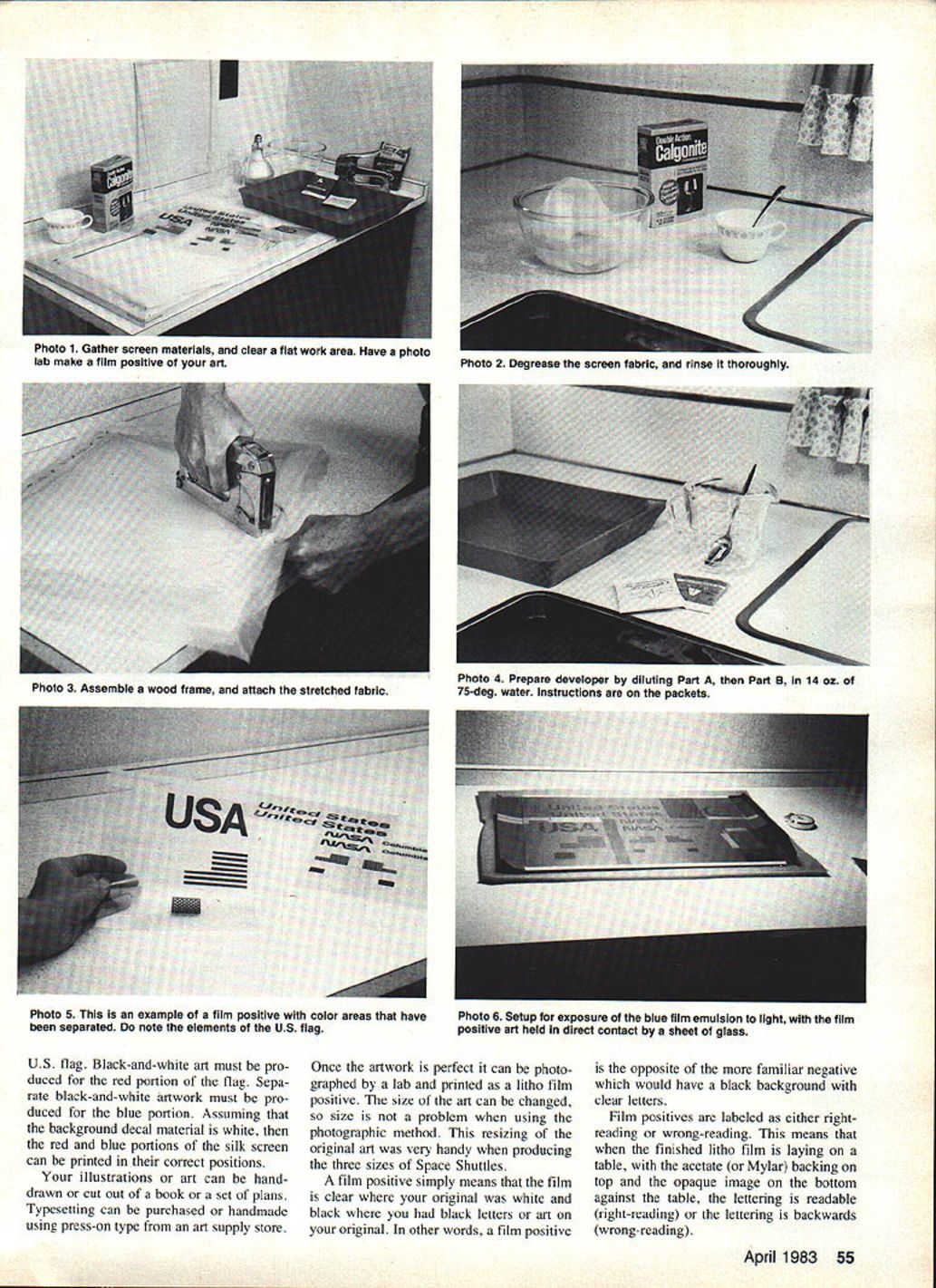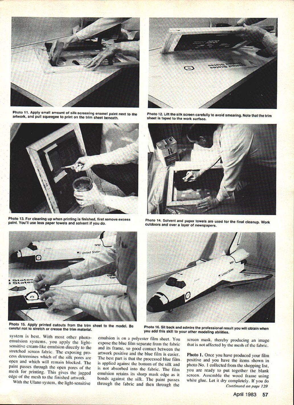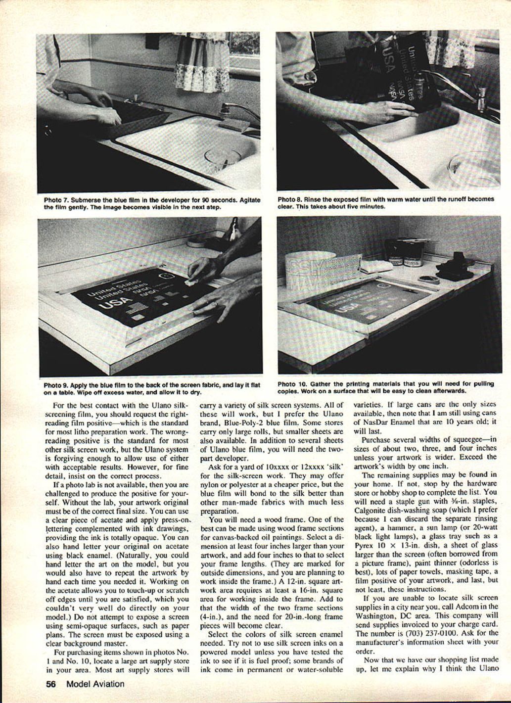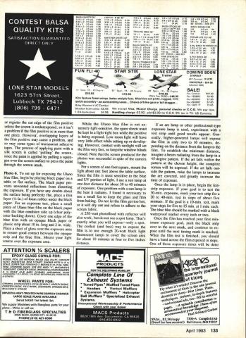 EUWI EIWI EIWI lettering artwork three Space Shuttles posed author silk-screened Mylar trim material applied models Space Shuttles ae different size large piece original art needed photographically sized suit us can satisfactorily hand-paint custom lettering dec orations modelespecially needs repeated place silk screening process may answer mostly mechanical operation U Luther Hux MANUFACTURERS have provided model builder almost lettering graphic trim needed professionally finished model However scratch builder like myself often need graphics available store simple artwork can masked spraypainted requirements lettering can lot work inconsistent results Since manufacturers use silk screen method produce decal sheets use system ourselves model builder can produce professional looking artwork help typesetter can produce quality trim sheets using silk screen method home Before decide silk screening graphic art may over head let point out brief course silk screen ing intended kitchen lab operator have produced silk screens professionally using fancy vacuum frames powerful lamps exposure screens Space Shuttles Project Snapshot produced kitchen some screen materials must purchased no need special equipment expose process screens should have access arc lamps film exposure frames enjoy dont keep reading will show process screens using household equipment Before starting screen read entire articleand re read necessary until familiar process several ways prepare art work screen professional paste-up converted film positive paste-up assembly type line drawings heavy paper card board backing page magazine pasted-up positioning black-andwhite typeset galley type columns positioning line drawings such cartoons plans place artwork should made black image material white background use color material could cause photo graphic problems ortho films used bygraphics labs somewhat color-blind artwork must black white final screening art can pro cessed color paint choose finished screened decal may several colors producing several color plates addition base art means may several additional artwork sec tions fur application other paint colors An example multi-color work 54 Model Aviation US flag Black-and-white art must pro duced red portion flag Sepa rate black-and-white artwork must pro duced blue portion Assuming background decal material white red blue portions silk screen can printed correct positions illustrations art can handdrawn cut out book set plans Typesetting can purchased handmade using press-on type art supply store Once artwork perfect can photo graphed lab printed litho film positive size art can changed size problem using photographic method resizing original art very handy producing three sizes Space Shuttles film positive simply means film clear original white black black letters art original other words film positive opposite familiar negative would have black background clear letters Film positives labeled either rightreading wrong-reading means finished litho film laying table acetate Mylar backing top opaque image bottom against table lettering readable right-reading lettering backwards wrong-reading April 1983 55 Photo 1 Gather screen materials clear flat work area Have photo lab make film positive Photo 2 Degrease screen fabric rinse tnoroughly Photo 3 Assemble wood frame attach stretched fabric Photo 4 Prepare developer diluting Part Part B 14 oz 75-deg water Instructions packets Photo 5 example film positive color areas have separated note elements US flag Photo 6 Setup exposure blue film emulsion light film positive art held direct contact sheet glass best contact Ulano silkscreening film should request rightreading film positivewhich standard litho preparation work wrongreading positive standard other silk screen work Ulano system forgiving enough allow use either acceptable results However fine detail insist correct process photo lab available challenged produce positive self Without lab artwork original must correct final size can use clear piece acetate apply press-on. lettering complemented ink drawings providing ink totally opaque can also hand letter original acetate using black enamel Naturally could hand letter art model would also have repeat artwork hand time needed Working acetate allows touch-up scratch off edges until satisfied couldnt very well directly model attempt expose screen using semi-opaque surfaces such paper plans screen must exposed using clear background master purchasing items shown photos No 1 No 10 locate large art supply store area Most art supply stores will carry variety silk screen systems will work prefer Ulano brand Blue-Poly-2 blue film Some stores carry large rolls smaller sheets also available addition several sheets Ulano blue film will need twopart developer Ask yard t0xxxx l2xxxx silk silk-screen work may offer nylon polyester cheaper price blue film will bond silk better other man-made fabrics much less preparation will need wood frame best can made using wood frame sections canvas-backed oil paintings Select di mension least four inches larger artwork add four inches to select frame lengths marked outside dimensions planning work inside frame 12-in square art work area requires least 16-in square area working inside frame Add width two frame sections 4-in need 20-in-long frame pieces will become clear Select colors silk screen enamel needed Try use silk screen inks powered model unless have tested ink see fuel proof some brands ink come permanent water-soluble varieties large cans sizes available note am still using cans NasDar Enamel 10 years old will last Purchase several widths squeegeein sizes about two three four inches unless artwork wider Exceed artworks width inch remaining supplies may found home stop hardware store hobby shop complete list will need staple gun 3/8-in staples Calgonite dish-washing soap prefer because can discard separate rinsing agent hammer sun lamp 20-watt black light lamps glass tray such Pyrex 10 x 13-in dish 