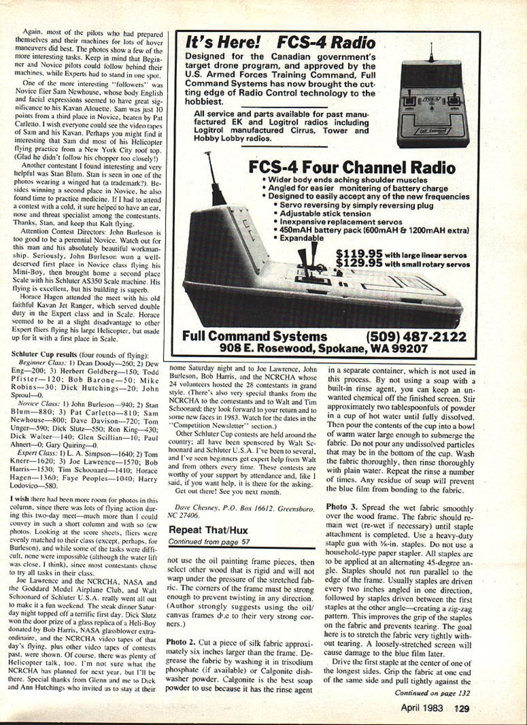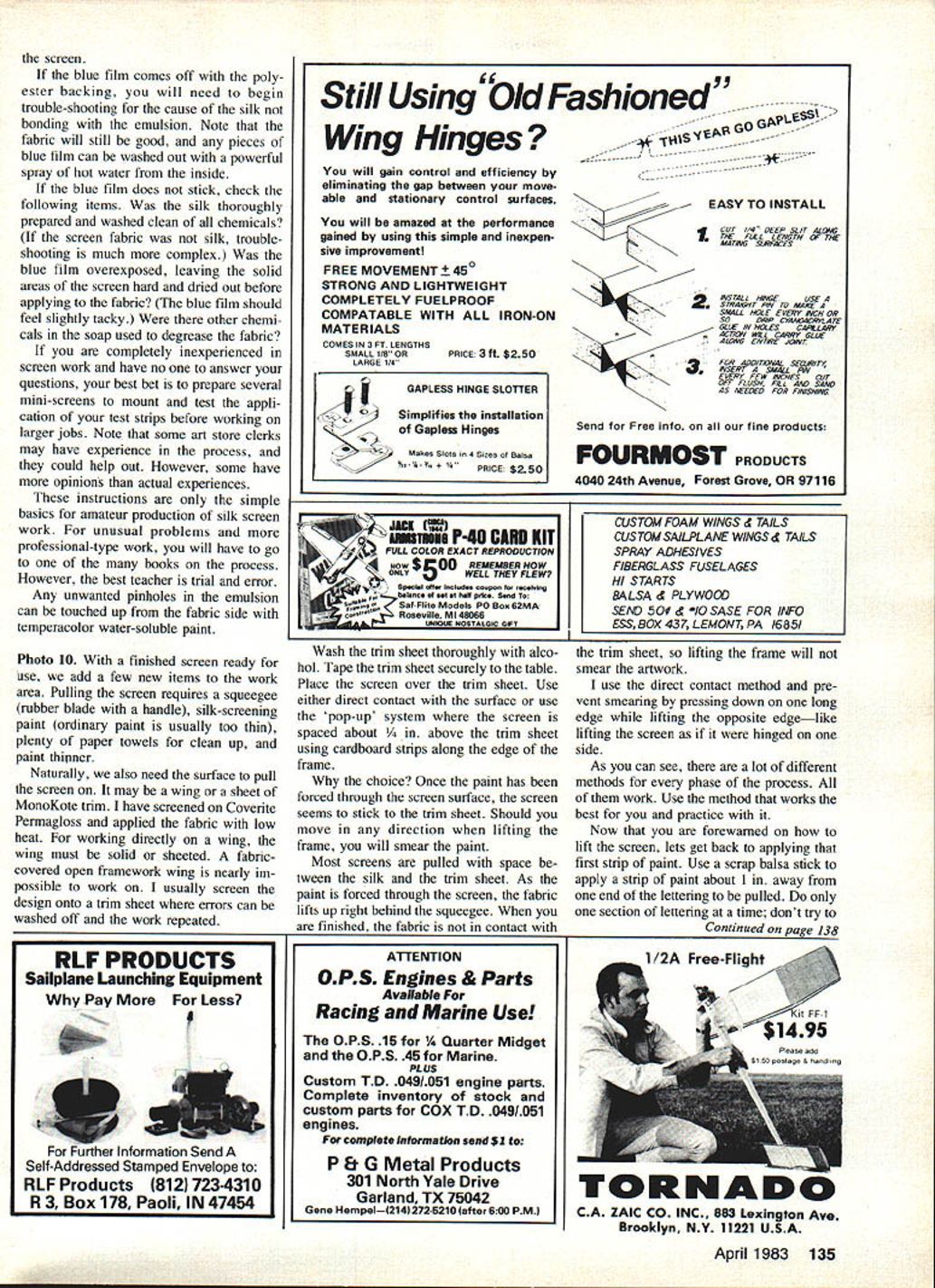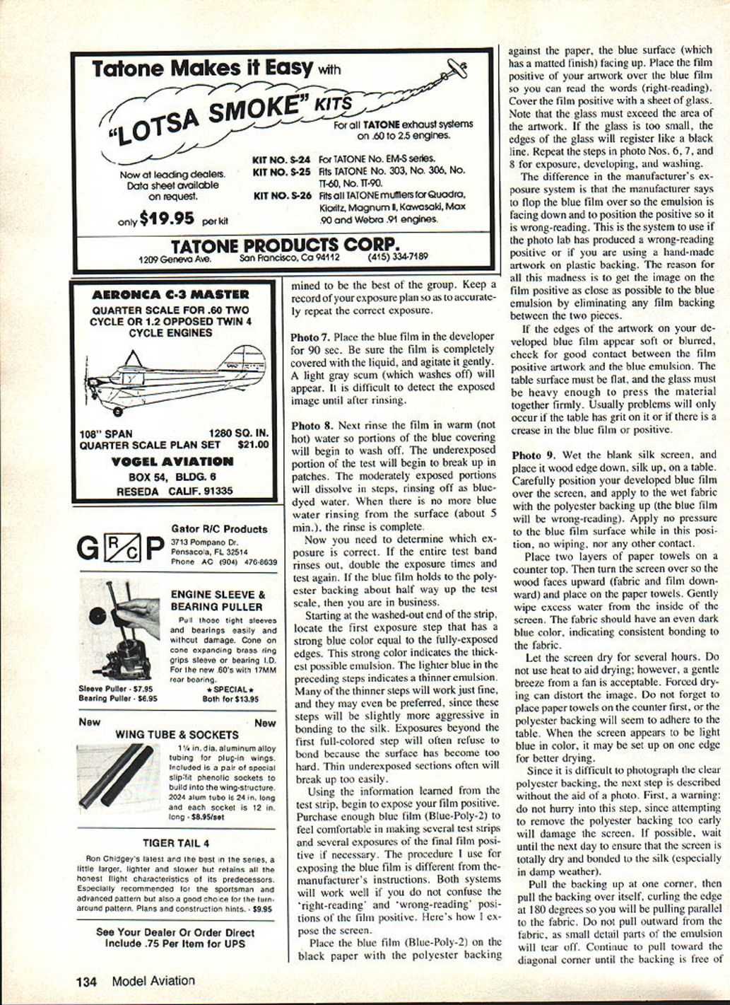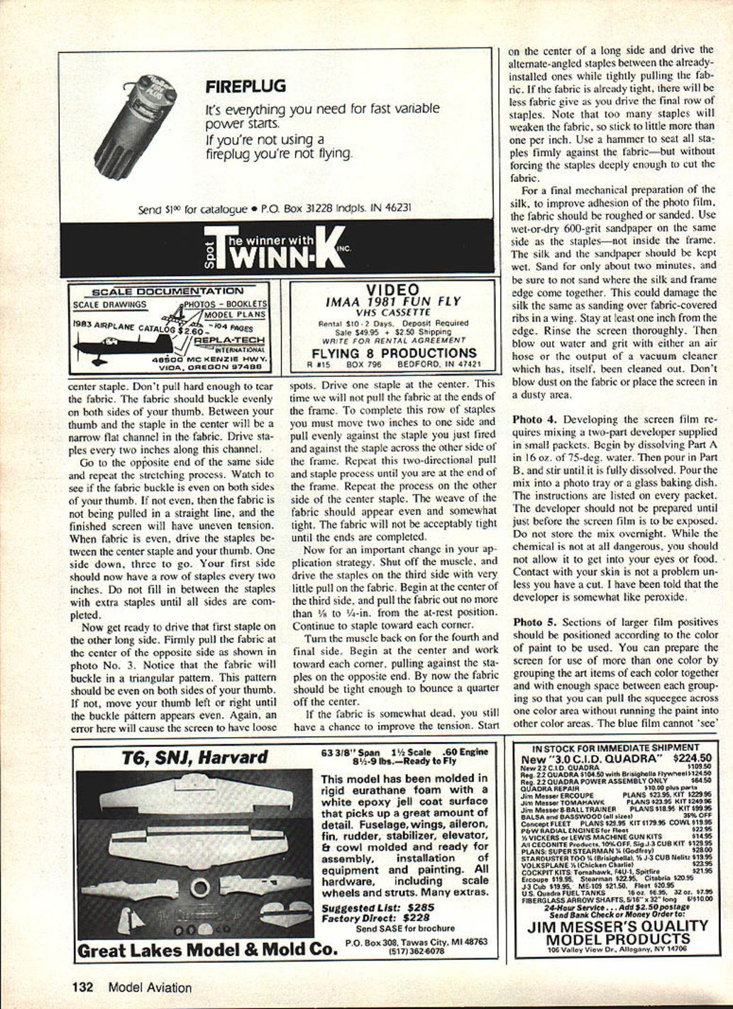 EUWI EIWI EIWI lettering artwork three Space Shuttles posed author silk-screened Mylar trim material applied models Space Shuttles ae different size large piece original art needed photographically sized suit us can satisfactorily hand-paint custom lettering dec orations modelespecially needs repeated place silk screening process may answer mostly mechanical operation U Luther Hux MANUFACTURERS have provided model builder almost lettering graphic trim needed professionally finished model However scratch builder like myself often need graphics available store simple artwork can masked spraypainted requirements lettering can lot work inconsistent results Since manufacturers use silk screen method produce decal sheets use system ourselves model builder can produce professional looking artwork help typesetter can produce quality trim sheets using silk screen method home Before decide silk screening graphic art may over head let point out brief course silk screen ing intended kitchen lab operator have produced silk screens professionally using fancy vacuum frames powerful lamps exposure screens Space Shuttles Project Snapshot produced kitchen some screen materials must purchased no need special equipment expose process screens should have access arc lamps film exposure frames enjoy dont keep reading will show process screens using household equipment Before starting screen read entire articleand re read necessary until familiar process several ways prepare art work screen professional paste-up converted film positive paste-up assembly type line drawings heavy paper card board backing page magazine pasted-up positioning black-andwhite typeset galley type columns positioning line drawings such cartoons plans place artwork should made black image material white background use color material could cause photo graphic problems ortho films used bygraphics labs somewhat color-blind artwork must black white final screening art can pro cessed color paint choose finished screened decal may several colors producing several color plates addition base art means may several additional artwork sec tions fur application other paint colors An example multi-color work 54 Model Aviation US flag Black-and-white art must pro duced red portion flag Sepa rate black-and-white artwork must pro duced blue portion Assuming background decal material white red blue portions silk screen can printed correct positions illustrations art can handdrawn cut out book set plans Typesetting can purchased handmade using press-on type art supply store Once artwork perfect can photo graphed lab printed litho film positive size art can changed size problem using photographic method resizing original art very handy producing three sizes Space Shuttles film positive simply means film clear original white black black letters art original other words film positive opposite familiar negative would have black background clear letters Film positives labeled either rightreading wrong-reading means finished litho film laying table acetate Mylar backing top opaque image bottom against table lettering readable right-reading lettering backwards wrong-reading April 1983 55 Photo 1 Gather screen materials clear flat work area Have photo lab make film positive Photo 2 Degrease screen fabric rinse tnoroughly Photo 3 Assemble wood frame attach stretched fabric Photo 4 Prepare developer diluting Part Part B 14 oz 75-deg water Instructions packets Photo 5 example film positive color areas have separated note elements US flag Photo 6 Setup exposure blue film emulsion light film positive art held direct contact sheet glass best contact Ulano silkscreening film should request rightreading film positivewhich standard litho preparation work wrongreading positive standard other silk screen work Ulano system forgiving enough allow use either acceptable results However fine detail insist correct process photo lab available challenged produce positive self Without lab artwork original must correct final size can use clear piece acetate apply press-on. lettering complemented ink drawings providing ink totally opaque can also hand letter original acetate using black enamel Naturally could hand letter art model would also have repeat artwork hand time needed Working acetate allows touch-up scratch off edges until satisfied couldnt very well directly model attempt expose screen using semi-opaque surfaces such paper plans screen must exposed using clear background master purchasing items shown photos No 1 No 10 locate large art supply store area Most art supply stores will carry variety silk screen systems will work prefer Ulano brand Blue-Poly-2 blue film Some stores carry large rolls smaller sheets also available addition several sheets Ulano blue film will need twopart developer Ask yard t0xxxx l2xxxx silk silk-screen work may offer nylon polyester cheaper price blue film will bond silk better other man-made fabrics much less preparation will need wood frame best can made using wood frame sections canvas-backed oil paintings Select di mension least four inches larger artwork add four inches to select frame lengths marked outside dimensions planning work inside frame 12-in square art work area requires least 16-in square area working inside frame Add width two frame sections 4-in need 20-in-long frame pieces will become clear Select colors silk screen enamel needed Try use silk screen inks powered model unless have tested ink see fuel proof some brands ink come permanent water-soluble varieties large cans sizes available note am still using cans NasDar Enamel 10 years old will last Purchase several widths squeegeein sizes about two three four inches unless artwork wider Exceed artworks width inch remaining supplies may found home stop hardware store hobby shop complete list will need staple gun 3/8-in staples Calgonite dish-washing soap prefer because can discard separate rinsing agent hammer sun lamp 20-watt black light lamps glass tray such Pyrex 10 x 13-in dish 