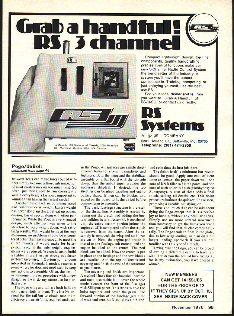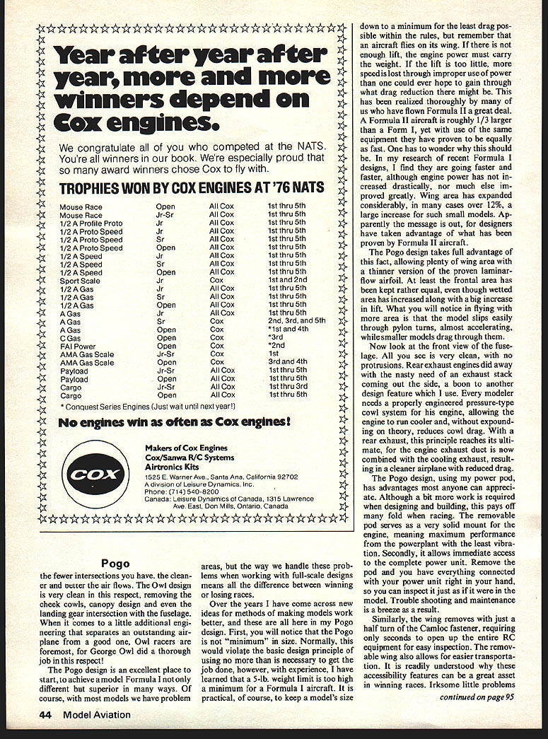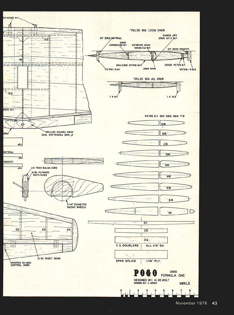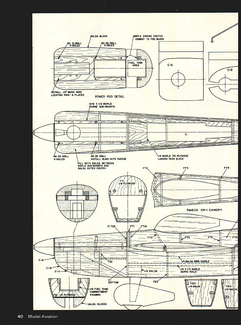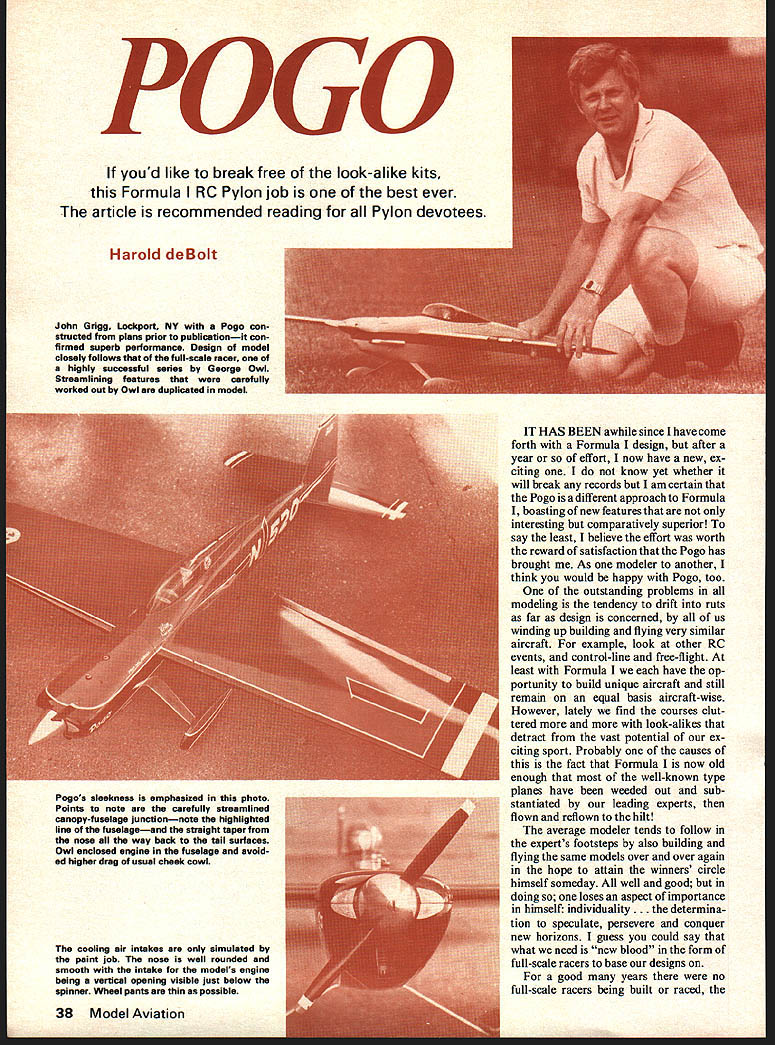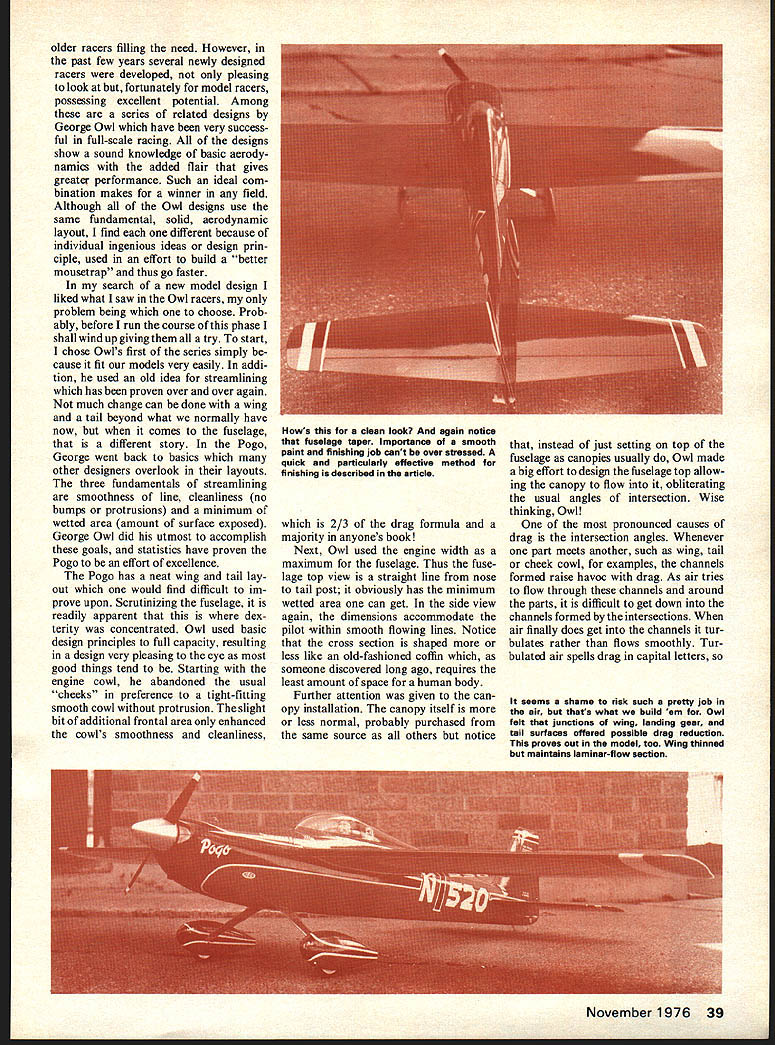 I P000 youd like break free look-alike kits Formula RC Pylon job best ever article recommended reading Pylon devotees Harold deBolt John Grigg Lockport NY Pogo con structed plans prior publicationit con firmed superb performance Design model Closely follows full-scale racer highly successful series George Owl Streamlining features carefully worked Out Owl duplicated model IT HAS BEEN awhile since have come forth Formula design after year effort now have new ex citing know yet whether will break records am certain Pogo different approach Formula boasting new features interesting comparatively superior say least believe effort worth reward satisfaction Pogo has brought As modeler another think would happy Pogo too outstanding problems modeling tendency drift ruts far design concerned us winding up building flying very similar aircraft example look other RC events control-line free-flight least Formula have op portunity build unique aircraft still remain equal basis aircraft-wise However lately find courses clut tered more look-alikes detract vast potential ex citing sport Probably causes fact Formula now old enough well-known type planes have weeded out sub stantiated leading experts flown reflown hilt average modeler tends follow experts footsteps also building flying same models over over again hope attain winners circle himself someday well good doing loses aspect importance himself individuality. rmina tion speculate persevere conquer new horizons guess could say cooling air intakes simulated bywhat need new blood form paint job nose well rounded andfull-scale racers base designs smooth intake models engine being vertical opening visible just below good years no spinner Wheel pants thin possiblefull-scale racers being built raced 38 Model Aviation Pogos sleekness emphasized photo Points note carefully streamlined canopy-fuselage junctionnote highlighted line fuselageand straight taper nose way back tail surfaces Owl enclosed engine fuselage avoid ed higher drag usual cheek cowl older racers filling need However past few years several newly designed racers developed pleasing look fortunately model racers possessing excellent potential Among series related designs George Owl have very success ful full-scale racing designs show sound knowledge basic aerody namics added flair gives greater performance Such ideal com bination makes winner field Although Owl designs use same fundamental solid aerodynamic layout find different because individual ingenious ideas design prin ciple used effort build better mousetrap thus go faster search new model design liked what saw Owl racers problem being choose Prob ably before run course phase shall wind up giving try start chose Owls first series simply cause fit models very easily addi tion used old idea streamlining has proven over over again much change can done wing tail beyond what normally have now comes fuselage different story Pogo George went back basics other designers overlook layouts three fundamentals streamlining smoothness line cleanliness no bumps protrusions minimum wetted area amount surface exposed George Owl did utmost accomplish goals statistics have proven Pogo effort excellence Pogo has neat wing tail lay out would find difficult im prove upon Scrutinizing fuselage readily apparent dex terity concentrated Owl used basic design principles full capacity resulting design very pleasing eye good things tend Starting engine cowl abandoned usual cheeks preference tight-fitting smooth cowl protrusion slight bit additional frontal area enhanced cowls smoothness cleanliness 2/3 drag formula majority anyones book Next Owl used engine width maximum fuselage Thus fuse lage top view straight line nose tail post obviously has minimum wetted area can get side view again dimensions accommodate pilot within smooth flowing lines Notice cross section shaped less like old-fashioned coffin someone discovered long ago requires least amount space human body Further attention given can opy installation canopy itself less normal probably purchased same source others notice instead just setting top fuselage canopies usually Owl made big effort design fuselage top allow ing canopy flow obliterating usual angles intersection Wise thinking Owl pronounced causes drag intersection angles Whenever part meets another such wing tail cheek cowl examples channels formed raise havoc drag As air tries flow through channels around parts difficult get down channels formed intersections air finally does get channels tur bulates rather flows smoothly Tur bulated air spells drag capital letters Hows clean look again notice fuselage taper Importance smooth paint finishing job cant over stressed quick particularly effective method finishing described article seems shame risk such pretty job air thats what build em Owl felt junctions wing landing gear tail surfaces offered possible drag reduction proves out model too Wing thinned maintains laminar-flow section November 1976 391 F ISA BLOCK NO 31 DRILL / 4 HOLES STALL L/8 MUSIC WIRE LOCATING PINS-4 PLACES NO38 DRILL / 2HOLES - + POWER POD DETAIL MAPLE ENGINE CRUTCH CEMENT TO POD BLOCK FiEGK AREA 5/16 X 1/2 MAPLE ENGINE SUB-MOUNTS NO23 DRILL INSTALL BUND NUTS FARSIDE FILL WITH BALSA BETWEEN MAPLE SUB-MOUNTS AND BALSA OUTER CRUTCH 1 I/B PL WOOD FTI 1/4 MAPLE OR PLYWOOD LANDING GEAR BLOCK FT2FT3FT4 In--II 1i -4 II AlI DMECO CR-I CANOPY _flTOPKTI AlA FTZ7I_[3____ C-A CB CC FUEL TANK COMMRTMENT FlFRAMNG 1ALSA BLOCKS _______1----______ _______________________ ____________ _______NI. FBIIjI/4BALSAWINGSAOOLE . --1 IIIII/4XI/2MAPL II~J1/4 BALSAtVSERVO RAILS -Ak_______ FK BOTTOM FB2 II Lj FB27TT7lF I/B BALSAuiFB311 I/BBAL1SA C-B K-1-I - --- / NO 30 DRILL 4 HOLES II JI ii II ZINU7~F7 Fl TOP-I/a Pt WOOO riLiLit \vIBoTTohiJ FT2I/S BALSA FTIAI/S BALSA FT5 I/S BAjSA FT3Il/S BALSA Li FT6 PLAM HATCH L32 X 5/16 BALSA 1/4 BACKBONE HFTS BALSA tIz AL AI/S B MEDIUM HARD BALSA I/S RUDDER SPAR 1/16 1/4 X /2 BALSA MAIN CRUTCH /_____ 3/32 SHEET1/4 SQUARE