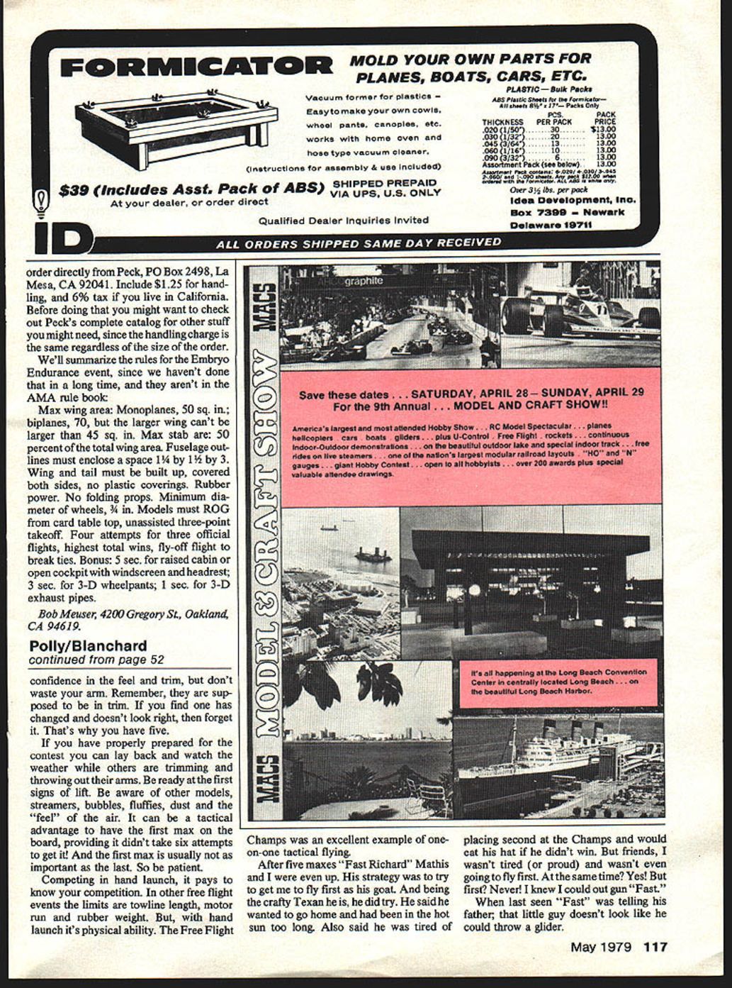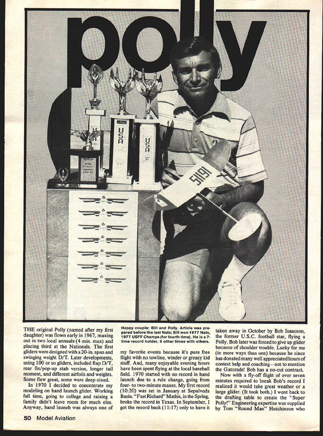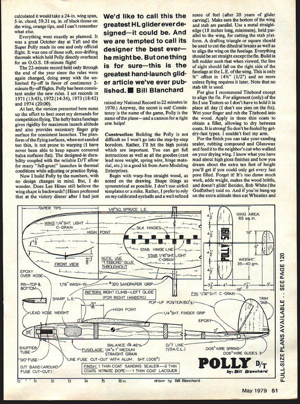 THE original Polly named after first daughter flown early 1967 maxing out two local annuals 4 mm max placing third Nationals first gliders designed 20-in span swinging weight D/T Later developments using 100 gliders included flap D/T rear fin/pop-up stab version longer tail moment different airfoils weights Some flew great some deep-sixed 1970 decided concentrate modeling hand launch glider Working full time going college raising family didnt leave room much else Anyway hand launch always Happy couple Bill Poily Article pre pared before last Nats Bill won 1977 Nats 1977 USFF Champs fourth time 7time record holder 9 other times others favorite events because its pure free flight no towline winder greasy kid stuff enjoyable evening hours have spent flying local baseball field 1970 started no record hand launch due rule change going four- two-minute maxes first record 1020 set January Sepulveda Basin Fast Richard Mathis inthe Spring broke record Texas September got record back 1117 have taken away October Bob Isaacson former USC footbail star flying Polly Bob later forced give up glider because shoulder trouble Lucky ways because since has donated well appreciated hours contest help coachingnot mention Gatorade Bob has no-cut contract Now fly-off flight over seven minutes required break Bobs record realized would take great weather large glider took both went back drafting table create Super Polly Engineering expertise supplied Tom Round Man Hutchinson 50 Model Aviation calculated would take 24-in wing span 5-in chord 5931 sq black tissue wing orange tips cant remember what else Everything went exactly planned great October day Taft Super Polly made its official flight soft non-drifting thermals held Polly directly overhead OOS 1 8-minute flight 22-minute record held through end year since rules again changed doing away un limited fly-off favor continuous 2minute fly-off flights Polly has consis tent under new rules set records 1971 1343 1972 1434 19731842 1974 2000 last version presented sums up effort best meet demands competition flying hefty balsa fuselage gives rigidity maximum launch altitude also provides necessary finger grip surface consistent launches planform flying surfaces sanded too thin prone warping have never able keep square cornered balsa surfaces flat designed-in dura bility coupled reliable D/T allow full-grunt launches thermal conditions adjusting practice flying Now build Polly numbers no design changes mind wonder Does Lee Hines still believe wing shape backwards Hines professed victory dinner after just Wed like call greatest HLglider ever de signedit could tempted call its designer best ever might Butonething surethis greatest hand-launch glid er article weve ever pub lishedE Bill Blanchard raised National Record 22 minutes 1970 Anyway secret out Consis tency name game Polly name planeand cannon right arm helps Construction Building Polly difficult wont go step-by-step boredom Rather Ill hit high points important can get full instructions well goodies cast lead nose weight spring wire hinge mate rial etc good kit Aero Modeling Enterprises Begin warp-free straight wood noted drawing Shape things symmetrical possible dont use airfoil templates mike Rather prefer rely calibrated eyeballs well refined sense feel after 20 years glider carving Make sure bottom wing stab paralleL Use metal straight edge 18 inches long minimum held par allel wing cutting stab plat form drafting triangle square should used cut dihedral breaks well align wing fuselage Everything should set straight except fin Build left rudder such viewed line sight should fall right side fuselage LE wing W offset 14W 1I2 no unless flying requires later Note no stab tilt used glue recommend Titebond except align fin alignment fin use Testors sol dont have hold place day dont use pins fin Wet finger rub Titebond wood Apply three thin coats obtain fillet allowing dry between coats strong So dont fooled getdry-fast types couldnt fool arm finish can take sanding sealer rubbing compound Glasswax feed neighbors cat walked drying wing know what have read about high gloss finishes dream about extra ten feet height youll get could get last pore filled Forget Its too damn much work adds weight makes wood brittle doesnt glide Besides Bob White Godfather said youre hung-up extra altitude eat Wheaties TAPER TIPS1/850 SPRUCE LE_41IWING AREA 266sqin 1I7 _pj i STAB HINGE LINE OTE USE SlAB 1/16SHT LIGHT2 FRONT VIEW 8TITEND GLUE h3540 gin 3124713 PINTOP&1/16 WASH-IN*320 SANDPAPER GRIP218 2 BOT TOMPATTERN RIGHT CLIMBLEFT GLIDEFIN 1/32SHT C-GRAIN SHARP LEFOR RIGHT HANDERS-TRIM ROP-UP POSmON60TAB 16 -/ IHIGH POINT LEAD NOSE WEIGHTO /1/4 SHT FINGER GRIP. EPOXY4 LINE ________1/2A CL008 WIRE SPRING 008WIRE GUIDES drown Bill Blanchard BALANCE SNUFFERFUSELAGE 114x 1 MEDIUM TUBESTRAIGHT GRAIN SIGFUSELINE FUSE CUT-OUT WITH ALUM SHT 006 DIT BAND AROUNDFINISH 1 THIN COAT SANDING SEALER2 THIN FUSE CUT-OUTCOATS NITRATE DOPEi THIN COAT LACQUER 0Ii21314ISI6in POLLY D/T Dill BIessoh aid May1979 51 0 N w 0 w w Cd w -J -J Cd z -J 0 w N -J -J LL 1/8 VENEER PLYWOOD WITH 1/2 SO PINE REINFORCED CORNERS AND HINGE LINE GLUE AND NAIL TOGETHER HINGE EACH SIDE~ NOTCH FOR WIN~S AND LINE NOTCHES dr~n Bill Blanchard BLANCHARDS GLIDER BOX lift weights Flight Adjustincnt Comments trim have right-hander mind Polly set up launch right glide left have built rudder offset wash-in shown plan glider should set up little nose heavy start allows filing off weight later instead having add messy clay get enough weight Also forces start flying too much incidence much better too little Hand glide shim back stab up use sheets drafting vellum get level glide have glide circle fine bend little rudder trim go easy Now give straight-ahead level toss just hard enough see glider will climb up start left Basically want check incidence required rollout some glider turn doesnt go straight backstop Now youre ready heave about 75% dont tweak tendons Launch right sidearm up about 30