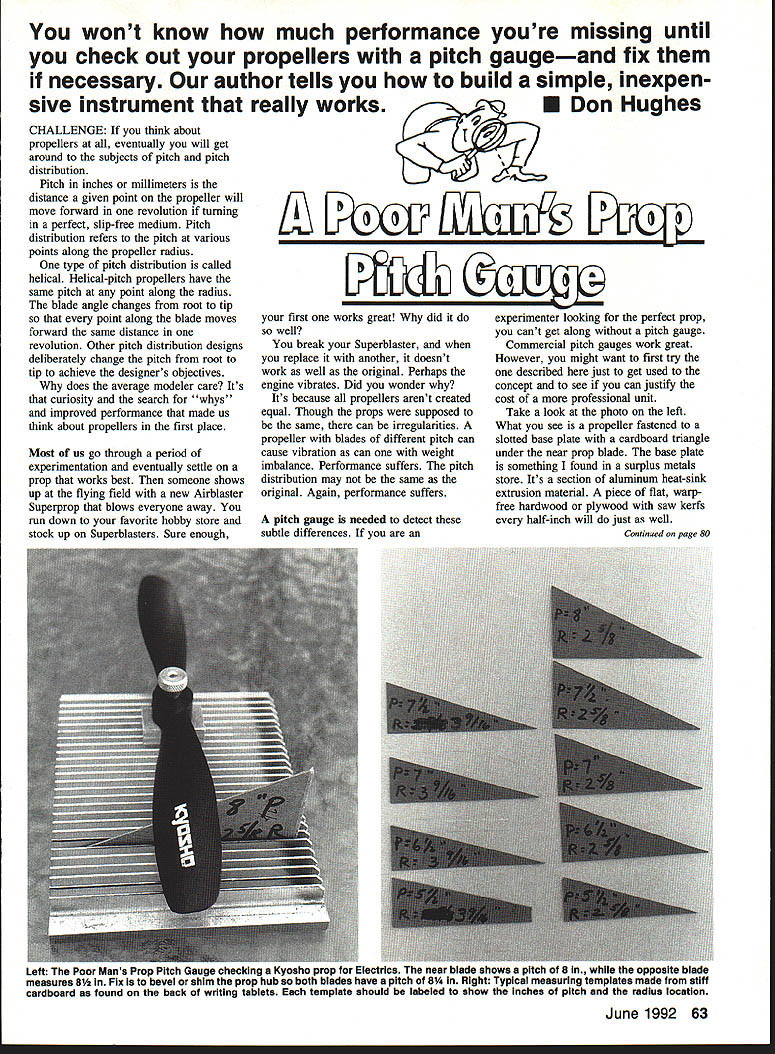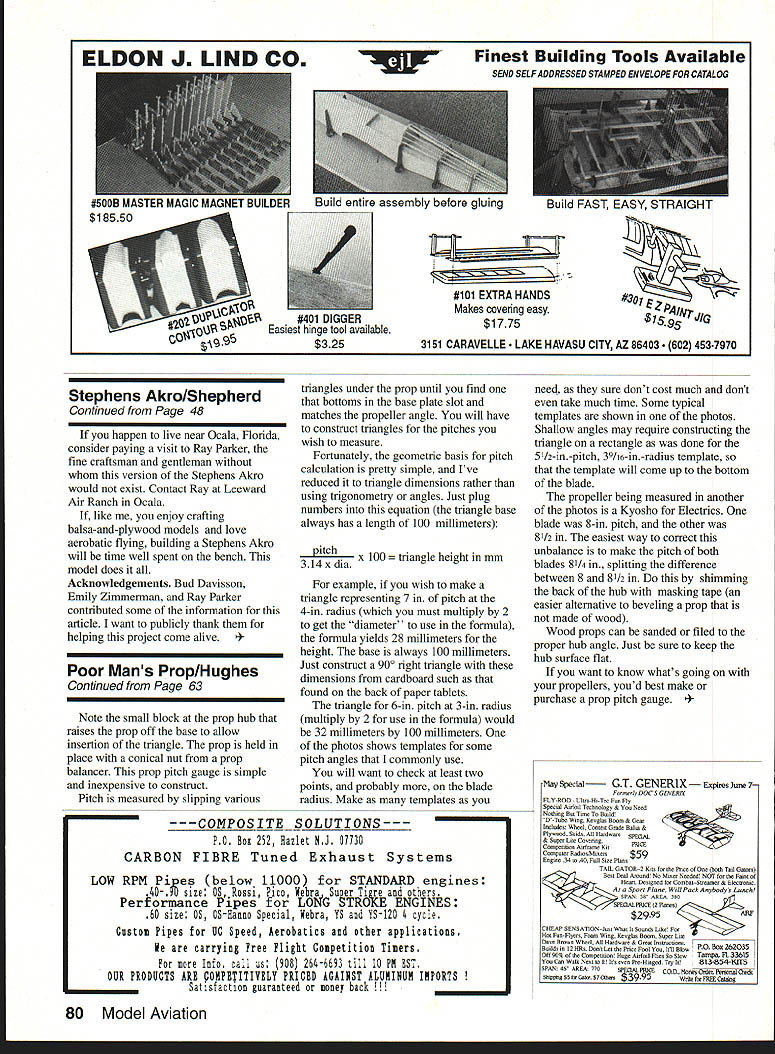 You wont know much performance youre missing until check out propellers pitch gaugeand fix necessary author tells build simple inexpen sive instrument CHALLENGE If think about propellers eventually will get around subjects pitch pitch distribution Pitch inches millimeters distance given point propeller will move forward revolution turning perfect slip-free medium Pitch distribution refers pitch various points along propeller radius type pitch distribution called helical Helical-pitch propellers have same pitch point along radius blade angle changes root tip point along blade moves forward same distance revolution Other pitch distribution designs deliberately change pitch root tip achieve designers objectives does average modeler care Its curiosity search whys improved performance made us think about propellers first place Most us go through period experimentation eventually settle prop works best someone shows up flying field new Airblaster Superprop blows everyone away run down favorite hobby store stock up Superblasters Sure enough really works U Don Hughes £ Fscu LcflxF7 WOrn Ld2 L1G first works great did well break Superblaster replace another doesnt work well original Perhaps engine vibrates Did wonder Its because propellers arent created equal Though props supposed same can irregularities propeller blades different pitch can cause vibration can weight imbalance Performance suffers pitch distribution may same original Again performance suffers pitch gauge needed detect subtle differences experimenter looking perfect prop cant get along pitch gauge Commercial pitch gauges work great However might want first try described just get used concept see can justify cost professional unit Take look photo left What see propeller fastened slotted base plate cardboard triangle under near prop blade base plate something found surplus metals store Its section aluminum heat-sink extrusion material piece flat warpfree hardwood plywood saw kerfs half-inch will just well Continued page 80 June 1992 63 Left The Poor Mans prop itcn uauge CNCCKIfl9 ryosno prop yor Iectrics ins near waae EflUWS piivn UT UIfl wflhle oppuamie 01U05 measures 81/2 Fix bevel shim prop hub both blades have pitch 81/4 RIght Typical measuring templates made stiff cardboard found back writing tablets template should labeled show inches pitch radius location ELDON J LIND CO #401 UIUUH Easiest hinge tool available $325 Finest Building Tools Available w SEND SELFADORESSED STAMPED EN VELOPE FOR CATALOG #101 EXTRA HANDS Makes covering easy $1775 3151 CARAVELLE HAVASU CITY AZ 86403 602 4537970 happen live near Ocala Florida consider paying visit Ray Parker fine craftsman gentleman version Stephens Akro would exist Contact Ray Leeward Air Ranch Ocala like enjoy crafting balsa-and-plywood models love aerobatic flying building Stephens Akro will time well spent bench model does Acknowledgements Bud Davisson Emily Zimmerman Ray Parker contributed some information article want publicly thank helping project come alive * Poor Mans Prop/Hughes Continued Page 63 Note small block prop hub raises prop off base allow insertion triangle prop held place conical nut prop balancer prop pitch gauge simple inexpensive construct Pitch measured slipping various triangles under prop until find bottoms base plate slot matches propeller angle will have construct triangles pitches wish measure Fortunately geometric basis pitch calculation pretty simple Ive reduced triangle dimensions rather using trigonometry angles Just plug numbers equation triangle base always has length 100 millimeters pitch 314 x dia x 100 ngle height mm example wish make triangle representing 7 pitch 4-in radius must multiply 2 get diameter use formula formula yields 28 millimeters height base always 100 millimeters Just construct 900 right triangle dimensions cardboard such found back paper tablets triangle 6-in pitch 3-in radius multiply 2 use formula would 32 millimeters 100 millimeters photos shows templates some pitch angles commonly use will want check least two points probably blade radius Make templates COMPOSITE SOLUTIONS--PO Ito 252 Haclet NJ 07730 CARBON FIBRE Tuned Exhaust Systems LOW RPM Pipes below 11000 STANDARD engines 40 90 size OSRossi Pico Webra Sc per Tigre others Performance Pipes LONG STROKE ENGINES 60 size OS OSHanno Special Webra YS YS-120 4 cycle Custom Pipes UC Speed Aerobatics other applications carrying Free Flight Competition Timers br Info call s 908 264-6693 till 10PM 1ST OUR PRODUCTS ARE OMPETITIVELY PRICED AGAINST ALUMINUM INPORTS Satcsfaction guaranteed money back need sure dont cost much dont take much time Some typical templates shown photos Shallow angles may require constructing triangle rectangle done 5 lh-in-pitch 3Ii 6-in-radius template template will come up bottom blade propeller being measured another photos Kyosho Electrics blade 8-in pitch other 81/2 easiest way correct unbalance make pitch both blades 81/4 splitting difference between 8 81/2 shimming back hub masking tape easier alternative beveling prop made wood Wood props can sanded filed proper hub angle Just sure keep hub surface flat want know whats going propellers youd best make purchase prop pitch gauge odel Aviation WiLire assembly before yuu bUllO rM tAY M Stephens Akro/Shepherd Continued Page 48 $lAiNrJG Nay SpecialGT GENERIXExpiresjune7 Foorrerly DOCS GENERIX FLY-ROD UlIro-Hi-Tec Fon Fly Special Airfoil Technology & Nerd Nodriog Bar Tiere Build 0-Tube Wiog Keeglas Soon & Geon Inclodeus Whnol Conloor Germ Balno &- Plysoood Skid Horderoro & Supor Lire Coveong Conrporirioo Arofrarne Kir ConporerRadionfMionoo$59 Fogine 34040 Full Sire Plan TAn OATOR2 Km rho Prier Ore holh Tnil Galonni Bror Oral Aroundt No Micro Nredndt NOT rho Paid Heaor Ornigord Cornhor-Srraronr & Elecronic Aoo Spor-r Plooo Will Pack Arnybadyr Lonoh SFuN 38 uREA 3ff \ -Z7SFEOAL PRICE 2 Flarernl $2995Z2Z~ABF CI4EAF SENSATIONSul Jr Soredy Likic Per Ho Fun-Flynn, Foon Wing Kovglo Boon Sapro Lilo __________________ 