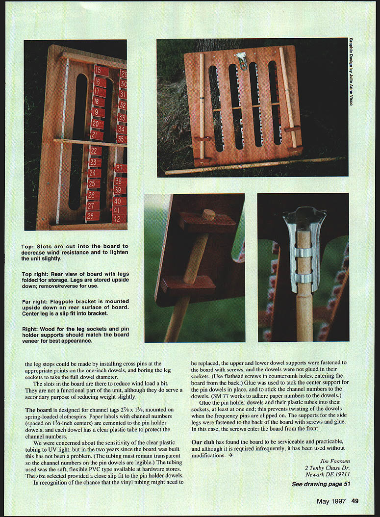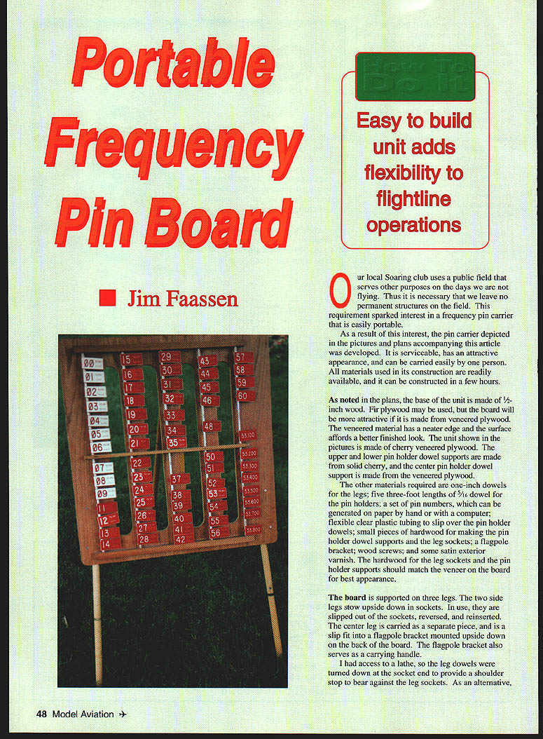 Portable Frequency Pin Board Easy build unit adds flexibility flightline operations K U Jim Faassen local Soaring club uses public field serves other purposes days flying Thus-it necessary leave no permanent structures field requirement sparked interest frequency pin carrier easily portable As result interest pin carrier depicted pictures plans accompanying article developed serviceable has attractive appearance can carried easily person materials used its construction readily available can constructed few hours As noted plans base unit made wood Fir plywood may used board will attractive made veneered plywood veneered material has neater edge surface affords better finished look unit shown pictures made cherry veneered plywood upper lower pm holder dowel supports made solid cherry center pin holder dowel support made veneered plywood other materials required one-inch dowels legs five three-foot lengths 5A6 dowel pin holders set pin numbers can generated paper hand computer flexible clear plastic tubing slip over pin holder dowels small pieces hardwood making pin holder dowel supports leg sockets flagpole bracket wood screws some satin exterior varnish hardwood leg sockets pin holder supports should match veneer board best appearance board supported three legs two side legs stow upside down sockets use slipped out sockets reversed reinserted center leg carried separate piece slip fit flagpole bracket mounted upside down back board flagpole bracket also serves carrying handle access lathe leg dowels turned down socket end provide shoulder stop bear against leg sockets As alternative 48 Model Aviation right Rear view board legs folded storage Legs stored upside down removelreverse use Far right Flagpole bracket mounted upside down rear surface board Center leg slip fit bracket Right Wood leg sockets pin holder supports should match board veneer best appearance leg stops could made installing cross pins appropriate points one-inch dowels boring leg sockets take full dowel diameter slots board reduce wind load bit functional part unit although serve secondary purpose reducing weight slightly board designed channel tags 2/s x 1/s mounted spring-loaded clothespins Paper labels channel numbers spaced 13A-inch centers cemented pin holder dowels dowel has clear plastic tube protect channel numbers concerned about sensitivity clear plastic tubing UV light two years since board built has problem tubing must remain transparent channel numbers pin dowels legible tubing used soft flexible PVC type available hardware stores size selected provided close slip fit pin holder dowels recognition chance vinyl tubing might need replaced upper lower dowel supports fastened board screws dowels glued sockets Use flathead screws countersunk holes entering board back Glue used tack center support pin dowels place stick channel numbers dowels 3M 77 works adhere paper numbers dowels Glue pin holder dowels plastic tubes sockets least end prevents twisting dowels frequency pins clipped supports side legs fastened back board screws glue case screws enter board front club has found board serviceable practicable although required infrequently has used modifications Faassen 2 Tenby Chase Dr NewarkDE 19711 See drawing page 51 May1997 49 Top Slots cut board decrease wind resistance lighten unit slightly