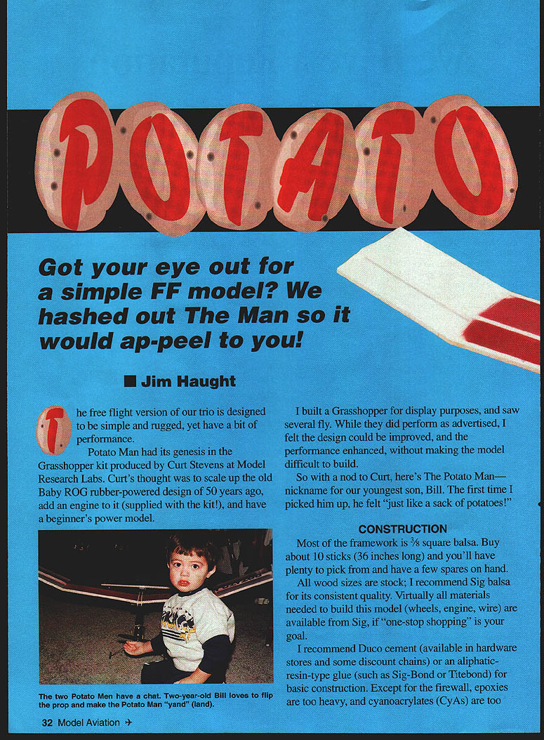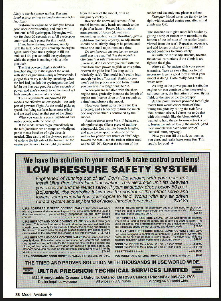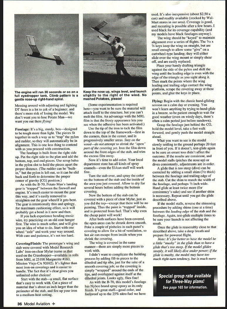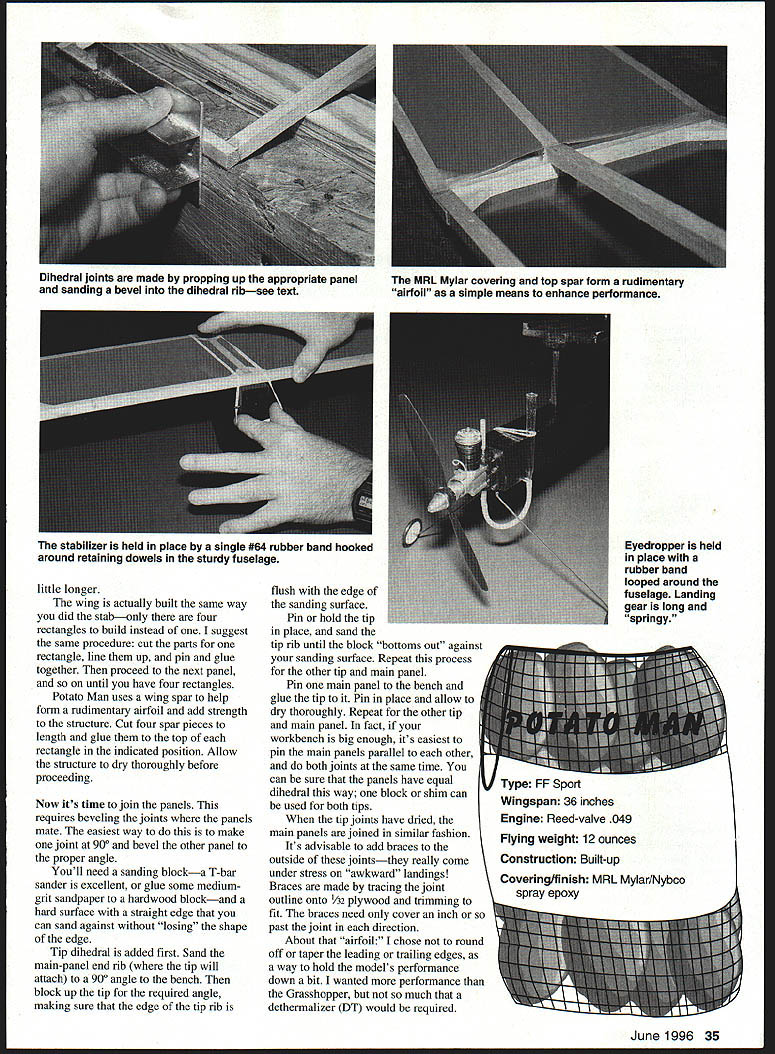 NO OCR TEXT NO OCR TEXT little longer wing actually built same way did stabonly four rectangles build instead suggest same procedure cut parts rectangle line up pin glue together proceed next panel until have four rectangles Potato Man uses wing spar help form rudimentary airfoil add strength structure Cut four spar pieces length glue top rectangle indicated position Allow structure dry thoroughly before proceeding Now its time join panels requires beveling joints panels mate easiest way to make joint 900 bevel other panel proper angle Youll need sanding blocka T-bar sander excellent glue some mediumgrit sandpaper hardwood blockand hard surface straight edge can sand against losing shape edge Tip dihedral added first Sand main-panel end rib tip will attach 900 angle bench block up tip required angle making sure edge tip rib flush edge sanding surface Pin hold tip place sand tip rib until block bottoms out against sanding surface Repeat process other tip main panel Pin main panel bench glue tip Pin place allow dry thoroughly Repeat other tip main panel fact workbench big enough its easiest pin main panels parallel other both joints same time can sure panels have equal dihedral way block shim can used both tips tip joints have dried main panels joined similar fashion Its advisable add braces outside jointsthey really come under stress awkward landings Braces made tracing joint outline onto Y32 plywood trimming fit braces need cover inch past joint direction About airfoil chose round off taper leading trailing edges way hold models performance down bit wanted performance Grasshopper much dethermalizer DT would required Eyedropper held place rubber band looped around fuselage Landing gear long springy Flying weight 12 ounces Construction Built-up June1996 35 Dihedral joints made propping up appropriate panel sanding bevel dihedral ribsee text MRL Mylar covering top spar form rudimentary airfoil simple means enhance performance stabilizer held place single #64 rubber band hooked around retaining dowels sturdy fuselage Type FE Sport Wingspan 36 inches Engine Reed-valve 049 Coveringlfinish MRL Mylar/Nybco spray epoxy Messing around adjusting lighting DT fuses lot ask beginner theres risk losing model dont want lose Potato Manwe want out flying Fuselage Its big sturdy boxdesigned tough light pieces fit together such way trap pylon rudder will automatically alignment less thing contend proceed construction fuselage built right side up Pin right side plan add bottom top end pieces Use scrap balsa pylon slot hold pieces apart proper distance rudder can built pylon left out can slid back forth determine proper center gravity [CC] position As B-70 Potato Mans landing gear trapped between firewall engine Its much easier mount gear way its easily removed straighten out gear when/if gets bent gear intentionally thin springy maximum cushioning effect will probably get bend now lack experience bending music wire try practicing old coat hanger first wire much softer will give idea what Start wheel axle work way around care patience its too hard Covering/Finish The prototypes wing stab covered Model Research Labs iron-on clear Mylar same used Grasshopperavailable rolls MRL 25108 Marguerite #160 Mission Viejo CA 92692 Its lighter iron-on coverings easier handle fact its clear gives unlimited color choices Start staba small flat surface thats easy work Cut piece material thats about inch larger perimeter stab fire up iron medium-heat setting Some experimentation required hereyou want sure material will attach itself structure cant melt film An advantage MRL film frosty appearance lets see adhesive has activated Use tip iron tack film down top frameworkfirst corners center progressively smaller areas Stay wooddo attempt shrink open part covering yet Iron film down around front edges stab trim excess film away Now its time add color local department store has kinds spray enamelseven $ 1/can stuff will work fine Turn stab over spray color bottom stab inside area just covered Allow dry several hours before adding bottom covering Now bottom stab can covered piece clear Mylar just did topexcept will no painting Thus paint trapped inside protected fuel Thats cheap paint will work After both surfaces have covered open areas can shrunk down smooth Poke couple pinholes panels covering allow bit ventilation hot air can escape inside shrink covering wing covered same mannerthere simply pieces work didnt want complicate building process adding fill-in pieces dihedral tip ribs just sake smooth covering job covering simply wrapped around ends tips overlapped against itself dihedral joints Looks ugly flies fine As B-70 models fuselage has Nybco brand spray epoxy its finish Its great stuffgood color fuelproof up 25% nitro fuel have used Its also inexpensive about $250 can readily available stocked Wal Mart stores area Coverage good recoating possible after few hours used black its coverage capability models have black fuselages anyway wing should keyed maintain alignment over series flights 1/16 x 1/i keys keep wing straight small enough allow some give cartwheel-type landing will either slide over wing mount simply shear off easily replaced Place handy drafting triangle against side pylon shift wing until leading edge edge triangle sight along mark points wing leading trailing edge contact wing platform scrape covering away points glue keys place Flying Begin classic hand-gliding session calm day evening wont learn anything trying hand-glide breeze patient enough wait good weather windy days theres often calm period just before sundown Grasp fuselage just behind CG hold model level take fast walk forward gently push model straight ahead What want see model slowly settling ground perhaps 20 feet front doesnt test-glide again sure errant toss didnt affect outcome results consistent model stalls pitches nose up dives consistently adjustments order glide too steep dive can corrected adding small shim A2 thick between fuselage tr