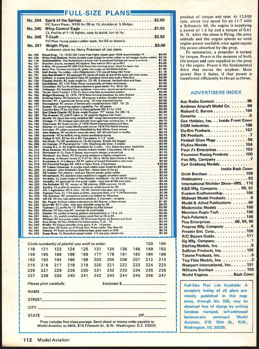 power 0 THERE Richard IS widespread uneasiness among modelers about difference between torque power Most us have come across school definitions torque force applied about lever arm power time rate doing work definitions correct inadequate clarify prac tical meaning terms apply model aircraft propulsion following experience may help clear things up relation between torque power illustrated vividly some time ago driving up hill Blue Ridge Mountains weak clutch began slip ac celerator pressed hard enough maintain speed fourth gear third gear car could maintain speed accelerate slowly Thinking about realized clutch slipped too much twisting force torque applied Yet third gear car could accelerate using less torque engine certain power level needed go uphill given speed Hence evident enough power could delivered wheels Continued page) I. I2 -j w 0 0 0 w 0 8 4 0246810 RPM THOUSANDS 1214 p LL -J w n 0 0 0 w 0 a6 IIII KBiB 35 POWER OS FS-60 - POWER K8iB 35 TORQUE IIII 4 2 6 81012141618 RPM THOUSANDS 64 Model Aviation Torque stand built usan mumn NASA-Goddard MAC uses pendulum measure torque turning prop Twisting air stream directed away motor improve accuracy Power curve prop obtained measuring several combinations torque rpm multiplying III 11-7 PROPELLER q I I 202224 RC gear will determined mainly type power used Since Astro 02 electric-powered version considerably heavier Tee-Dee 020 rearward location radio gear will necessary balance model point shown plan Tee-Deepowered version other hand will require RC gear placed far forward possible perhaps some additional nose ballast may necessary balance ship proper location An excellent set instructions cluded Ace Pulse Commander showing several different types actuator mounting torque rod installations Any could used shown plan has advantage being visible after plane completed feature especially nice scale aircraft Flying Under no circumstances should T-Craft flown until aircraft has balanced location shown plan true model failure could very well spell disaster ship nose-heavy ship could possibly sur vive tail heavy strictly bad news T-Craft models size strictly calm weather airplane authors midwest location means either early morning late evening flying sessions use electric power permits since flying gaspowered aircraft times usually permitted fields Ace Pulse Commander radio supplied very good set instruc tions pulse rudder-only flying tech niques dont see point repeat ing Build model light sturdy follow manufacturers instructions engine RC installation will get hours relaxation enjoy ment T-Craft Power Weber continued page 64 passing less torque rpm through clutch fact torque power related following simple equation Power 000019 x Torque x rpm power horsepower hp torque pound-feet lb ft Look closely equation power product torque rpm fixed engine speed increase torque gives proportional increase power considered other way fixed torque rpm means power comparing two model engines may hear has torque other has power apparent contradiction explained fact rpm considered two engines will different Remem ber specified rpm torque always means power first figure shows power torque curves OS FS-60 4-cycle engine K&B 35cc 21 engine Notice K&B 35 can produce power OS FS-60 both engines operate above 12300 rpm K&B 35 operates above 16000 rpm low speed however OS FS-60 has power torque So read need torque turn large props what writer means need good power low rpm illustrated OS FS-60 Still both engines example run power peaks K&B 35 will fly model faster providing pro peller can matched correctly plane cases such planes large cowls high drag would require gearing down prop Gearing gains torque expense rpm Power delivered prop un changed except small losses gears belt gearing practical OS FS-60 would outperform K&B 35 large props because OS FS-60 has power torque low engine speed second figure shows power torque required turn typical 11-7 propeller different speeds test stand stationary airplane can seen increasing rpm raises power rapidly torque cause prop power again January1979 111 Please send me.......... copies new fourth edition Radio Control Buyers Guide Enclosed $600 copy ordered $525 Guide plus $75 postage & handling Total Enclosed ___________ anada City State ZIP Return Boynton & Assoc Clifton House Clifton VA 22024 FULL-SIZE PLAf __________ No 244Spirit Springs$250 RC Sport Racer REM 09 15 doubles V4 Midget No 245Whip Control Eagle$150 CL Profile F-15 fighter easy build fun fly No 246T-Craft$250 RC Nice flying pulse-rudder scale 02 electric No 247Wright Flyer$300 Authentic plans Harry Robinson real plane No 103Kloud King 15- 19 AC Old-Timer Free Flight based upon 1938 record breaker FFS400 No 104Wiley Post Biplane Petite durable scale design either rubber tail wagger Ipulserudder $225 No118GollyGeeWhiz Dan Rutherfords simple Half-A powered Combat iob turns dimeSiSO No 121Gremlin Sturdy aerobatic RC biplane flies well 35s up 60s $300 No 1234-Bits 40-powered AC 500 Club Aacer has winning ways Good sport too$400 No124Semi-Pro Contest-winning HLglider has pop-up tail dethermalizer No125HaIf-Korda rubber John Oldenkamps 1/2-size all-balsa Old-Timer $175 No 131Gee Bee Model Y 40-powered AC stand-off scale great old-time racers $500 No 134Calliato superb Standard Class AC sailplane also took Hats first -$400 No 136Fieseler Storch AC scale model 23-45 5-channel has both slots flaps $400 No 146QuickSilver AC 1/2A Pylon Racer incorporates latest techniques$200 No 149Comedian AC fun-fly aerobatic biplane good looker 40 60$400 No 155Tellipsoer AC Standard Class sailplane wins stand-out performance -$1000 No159Tercel Keith Trostles 1/2A CL Stunt ship flies excellent pattern -$200 No 165Midget Mustang CL 1975-1976 Nats winning Goodyear John Ballard -$200 No 166Nothing Fancy AC biplane 35 engines pretty handles beautifully$825 No 168Simitar AC spectacular flying wing 15 nose-mounted tractor$300 No169Dennyplane AC version famed cabin model kit 1937 19-25$400 No 177Z