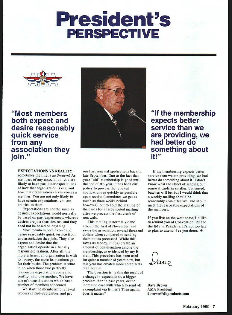 Presidents PERSPECTIVE Most members both expect desire reasonably quick service association join membership expects better service providing better something about EXPECTATIONS VS REALITY sometimes line S-curve As members association likely have particular expectations organization run organization serves member likely have certain expectations entitled Expectations same desires expectations would normally based past experiences whereas desires just desires need based anything Most members both expect desire reasonably quick service association join also expect desire organization operate fiscally responsible fashion After efficient organization its money its members get bucks problem what two perfectly reasonable expectations come conflict another have situations has number members concerned start membership renewal process mid-September get first renewal applications back late September Due fact old membership good until end year has policy process renewal applications quickly possible upon receipt sometimes get much three weeks behind however hold mailing cards large sorted mailing after process first crush renewals mailing normally done around first November saves association several thousand dollars compared sending out processed saves us money does create amount consternation among membership evidenced E mail procedure has used quite number years now year has created complaints normal question is result change expectations bigger problem past years increased ease send off complaint via E-mail again does matter membership expects better service providing better something about dont know what effect sending out renewal cards smaller sorted batches will would think weekly mailing should reasonably cost-effective should meet reasonable expectations members live west coast Id like remind Convention 99 IMS Pasadena Its too late plan attend See Dave Brown AMA President dbrown@dbproductscom February 1999 7