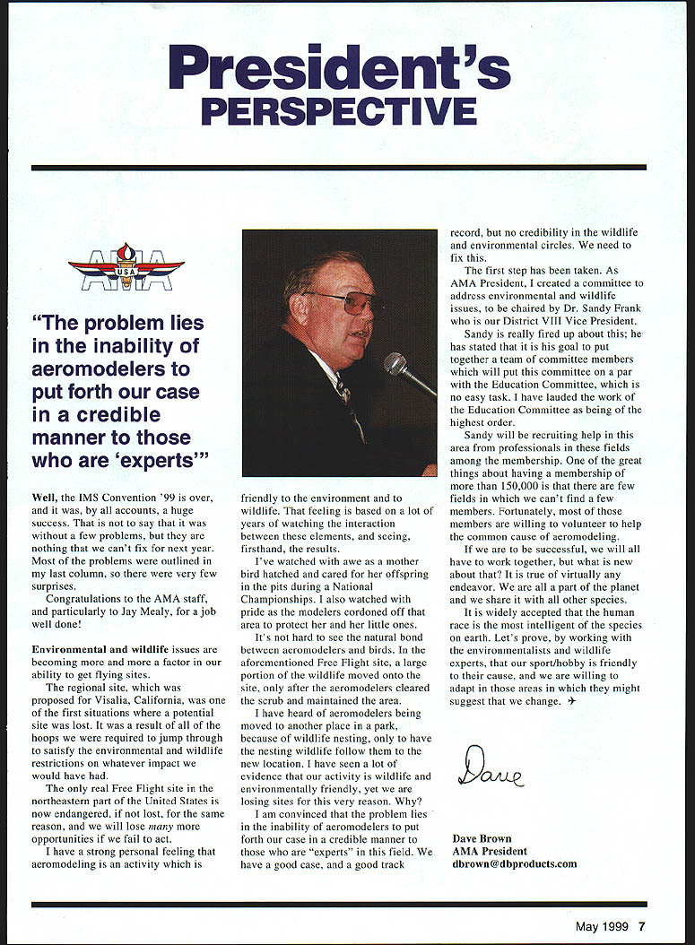 President s PERSPECTIVE problem lies inability aeromodelers put forth case credible manner experts' Well IMS Convention 99 over accounts huge success say few problems nothing cant fix next year Most problems outlined last column very few surprises Congratulations AMA staff particularly Jay Mealy job well done Environmental wildlife issues becoming more factor ability get flying sites regional site proposed Visalia California first situations potential site lost result of hoops required jump through satisfy environmental wildlife restrictions whatever impact would have real Free Flight site northeastern part United States now endangered lost same reason will lose opportunities fail act have strong personal feeling aeromodeling activity friendly environment wildlife feeling based lot years watching interaction between elements seeing firsthand results Ive watched awe mother bird hatched cared offspring pits during National Championships also watched pride modelers cordoned off area protect her little ones Its hard see natural bond between aeromodelers birds aforementioned Free Flight site large portion wildlife moved onto site after aeromodelers cleared scrub maintained area have heard aeromodelers being moved another place park because wildlife nesting have nesting wildlife follow new location have seen lot evidence activity wildlife environmentally friendly yet losing sites very reason am convinced problem lies inability aeromodelers put forth case credible manner experts field have good case good track record no credibility wildlife environmental circles need fix first step has taken As AMA President created committee address environmental wildlife issues chaired Dr Sandy Frank District VIII Vice President Sandy really fired up about has stated goal put together team committee members will put committee par Education Committee no easy task have lauded work Education Committee being highest order Sandy will recruiting help area professionals fields among membership great things about having membership 150000 few fields cant find few members Fortunately members willing volunteer help common cause aeromodeling successful will have work together what new about true virtually endeavor part planet share other species widely accepted human race intelligent species earth Lets prove working environmentalists wildlife experts sport/hobby friendly cause willing adapt areas might suggest change c Dave Brown AMA President dbrown@dbproductscom May1999 7