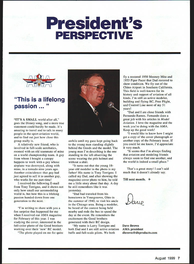 Presidents PERSPECTIVE /F7F\ lifelong passion ITS SMALL world after goes Disney song true statement could hardly made Its amazing travel talk people sport aviation world find out just close group really relatively new friend involved full-scale aerobatics roomed old teammate world championship team guy bought canopy happens work guy airplane destroyed along tornado nine years ago Another coincidence guy just agreed sell another guy works part-time received following E-mail Tony Terrigno shows small aeromodeling world lifelong passion handed down generation next Im writing share fun surprise happened received AMA magazine February year studying cover interested full-color photo Good brothers working over new RC model photo played quite awhile until gaze kept going back young man standing slightly behind Goods model young man Im describing standing left observing scene wearing pith helmet shirt turns out young 18year-old modeler photo father name Tony Terrigno called Dad after showing magazine cover photo him told little story about day day still remembers like yesterday Dad traveled hometown Youngstown Ohio summer 1940 visit uncle Chicago area Being modeler heard contest being held nearby rode bus spend day event remembers excitement Good brothers generated RC design name Larry Terrigno both Dad still active aviation buffs full-scale pilots both fly restored 1950 Mooney Mite 1953 Piper Pacer Dad restored show condition fly out Chino Airport Southern California field well-known its history support aviation kinds Im still active modeler building flying RC Free Flight Control Line 51 years Dad close friends Fernando Ramos Fernando does great job articles Model Aviation love magazine work youre doing AMA Keep up good work would like know might get copy cover photograph another copy February issue could let know Id appreciate very much seems Im always finding aviation modeling friends always seem find another world indeed small place Thats great story cant add much doesnt already say Till next month Brown AMA president dbrown@dbproductscom August 1999 7