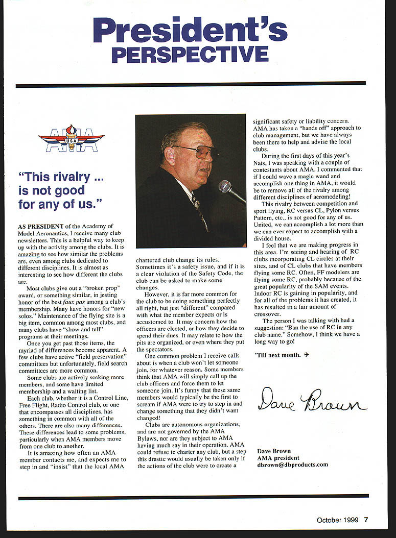 President s PERSPECTIVE F\ F7 /7\ rivalry good us AS PRESIDENT Academy Model Aeronautics receive club newsletters helpful way keep up activity among clubs amazing see similar problems among clubs dedicated different disciplines almost interesting see different clubs Most clubs give out broken prop award something similar jesting honor bestfauxpas among clubs membership have honors new solos Maintenance flying site big item common among clubs clubs have show tell programs meetings Once get past items myriad differences become apparent few clubs have active field preservation committees unfortunately field search committees common Some clubs actively seeking members some have limited membership waiting list club whether Control Line Free Flight Radio Control club encompasses disciplines has something common others also differences differences lead some problems particularly AMA members move club another amazing often AMA member contacts expects step insist local AMA chartered club change its rules Sometimes its safety issue clear violation Safety Code club can asked make some changes However far common club doing something perfectly right just different compared what member expects accustomed may concern officers elected decide spend dues may relate pits organized put spectators common problem receive calls about club wont let someone join whatever reason Some members think AMA will simply call up club officers force let someone join Its funny same members would typically first scream AMA try step change something didnt want changed Clubs autonomous organizations governed AMA Bylaws nor subject AMA having much say operation AMA could refuse charter club step drastic would usually taken actions club create significant safety liability concern AMA has taken hands off approach club management have always help advise local clubs During first days years Nats speaking couple contestants about AMA commented could wave magic wand accomplish thing AMA would remove rivalry among different disciplines aeromodeling rivalry between competition sport flying RC versus CL Pylon versus Pattern etc good us United can accomplish lot can ever expect accomplish divided house feel making progress area Im seeing hearing RC clubs incorporating CL circles sites CL clubs have members flying some RC Often FF modelers flying some RC probably because great popularity SAM events Indoor RC gaining popularity problems has created has resulted fair amount crossover person talking suggestion Ban use RC club name Somehow think have long way go Till next month Dave Brown AMA president dbrown@dbproductscom October 1999 7