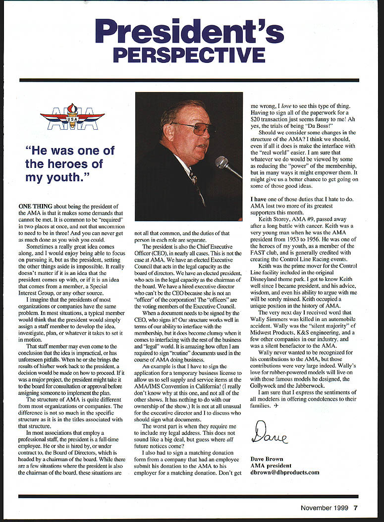 Presidents PERSPECTIVE [IN heroes youth ONE THING about being president AMA makes some demands cannot met common required two places once uncommon need three can never get much done wish could Sometimes really great idea comes along would enjoy being able focus pursuing president setting other things aside impossible really doesnt matter idea president comes up idea comes member Special Interest Group other source imagine presidents organizations companies have same problem situations typical member would think president would simply assign staff member develop idea investigate plan whatever takes set motion staff member may come conclusion idea impractical has unforeseen pitfalls brings results his/her work back president decision would made top major project president might take board consultation approval before assigning someone implement plan structure AMA quite different organizations companies difference much specific structure titles associated structure associations employ professional staff president full-time employee hired under contract Board Directors headed chainnan board few situations president also chairman board situations common duties person role separate president also Chief Executive Officer CEO nearly cases case AIvIA have elected Executive Council acts legal capacity board directors have elected president acts legal capacity chairman board have hired executive director cant CEO because officer corporation officers voting members Executive Council document needs signed CEO signs stnicture works well terms ability interface membership does become clumsy comes interfacing rest business legal world amazing often lam required sign routine documents used course AMA doing business An example have sign application temporary business license allow us sell supply service items AiMA/IMS Convention California really dont know other shows has nothing ownership show unusual executive director Ito discuss should sign what documents worst part require include legal address does sound like big deal guess future notices come also sign matching donation form company employee submit donation AMA employer matching donation Dont get wrong love see type thing Having sign paperwork $20 transaction just seems funny An yes trials being Da Boss Should consider some changes structure AMA think should does make interface real world easier am sure whatever would viewed some reducing power membership ways might empower might give us better chance get going some good ideas have duties hate AMA lost two its greatest supporters month Keith Storey AMA #9 passed away after long battle cancer Keith very young man AMA president 1953 1956 heroes youth member FAST club generally credited creating Control Line Racing events Keith prime mover Control Line facility included original Disneyland theme park got know Keith well since became president advice wisdom ability argne will sorely missed Keith occupied unique position history AMA very next day received word Wally Simmers killed automobile accident Wally silent majority Midwest Products K&S engineering few other companies industry silent benefactor AMA Wally never wanted recognized contributions AIvIA contributions very large indeed Wally s love rubber-powered models will live famous models designed Gollywock Jabberwock am sure express sentiments modelers offering condolences families Brown AMA president dbrown@dbproduetscom November 1999 7